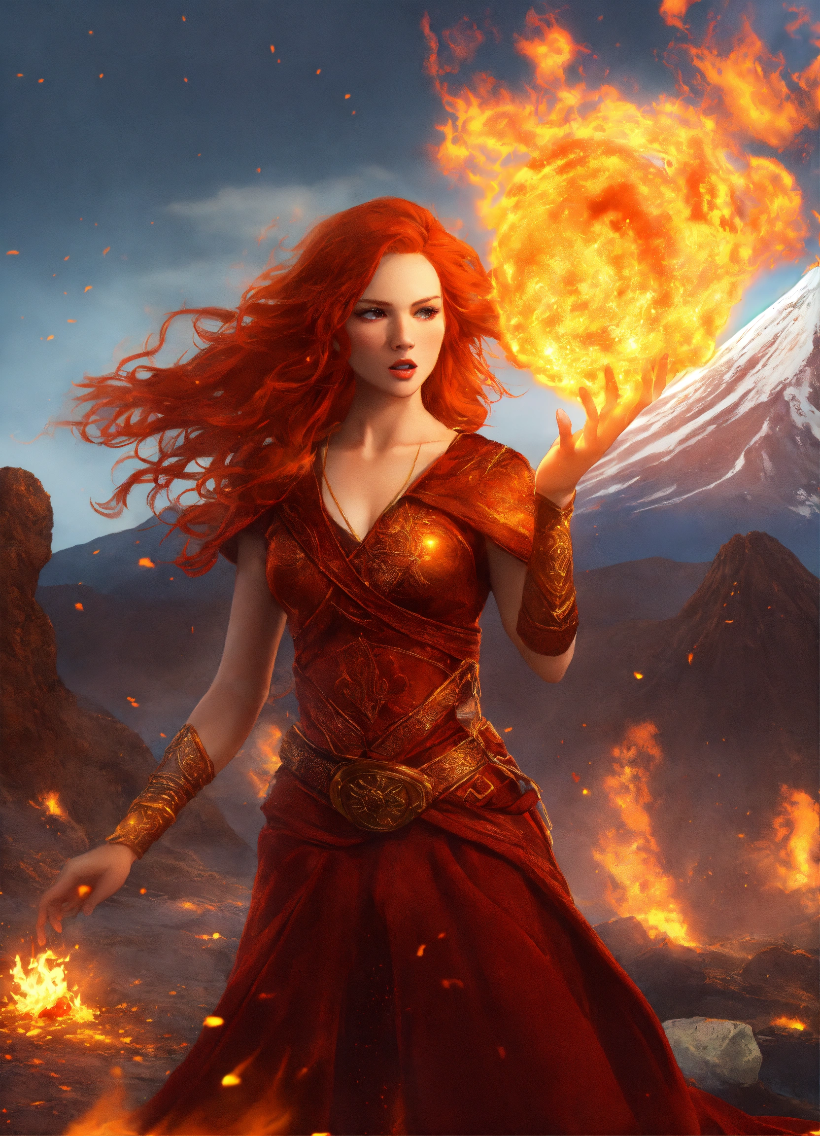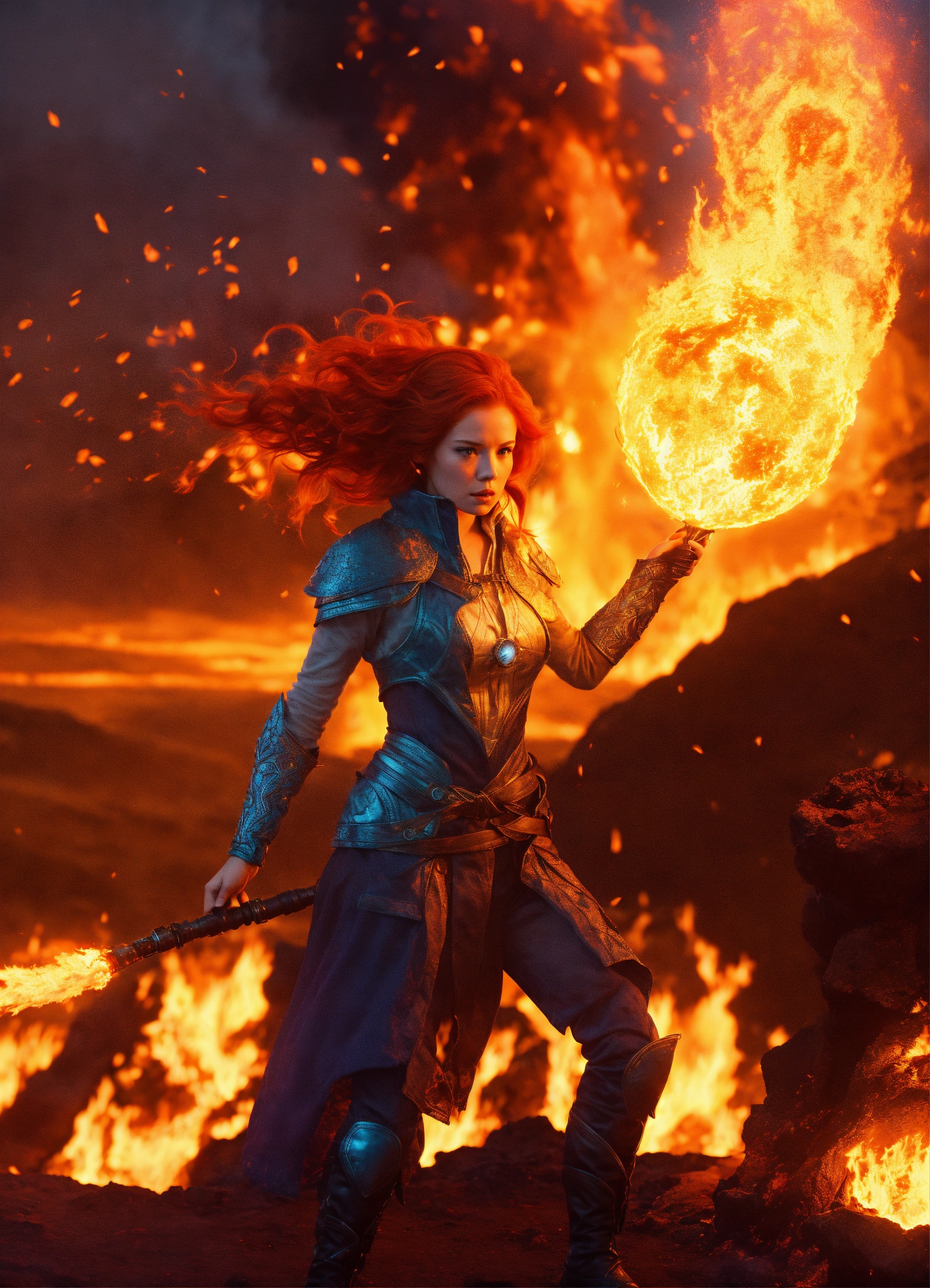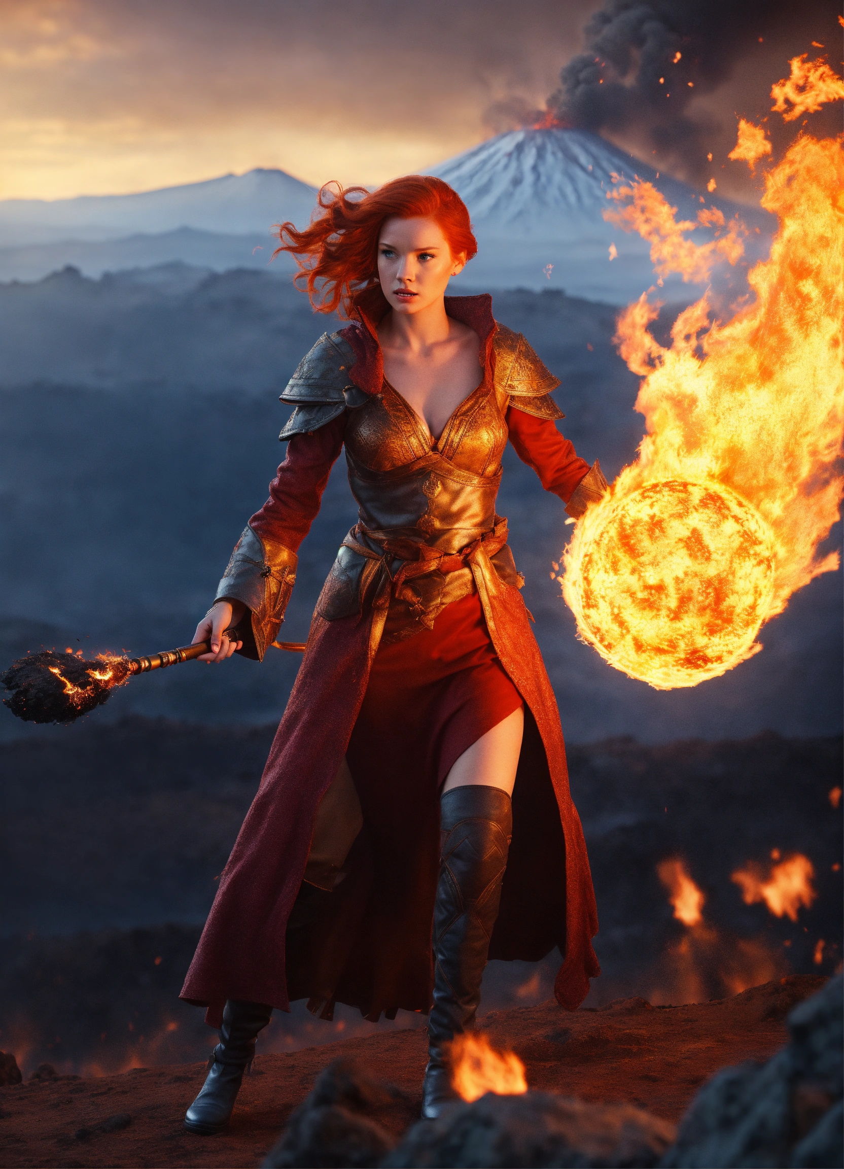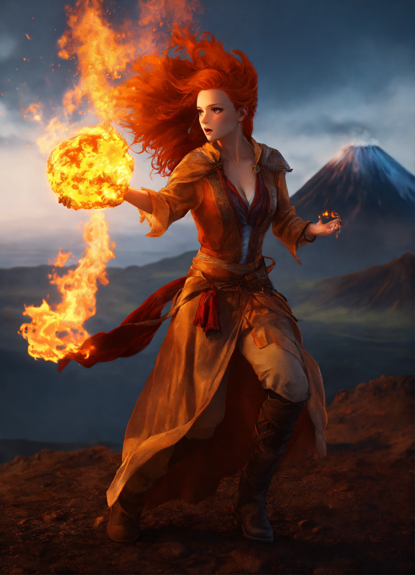 Small female, pale skinned, redhead, fire elemental, sorceress, wearing traveling clothing, throwing a fireball, hair on fire, active volcano in the background, frostbite 3 engine 8k