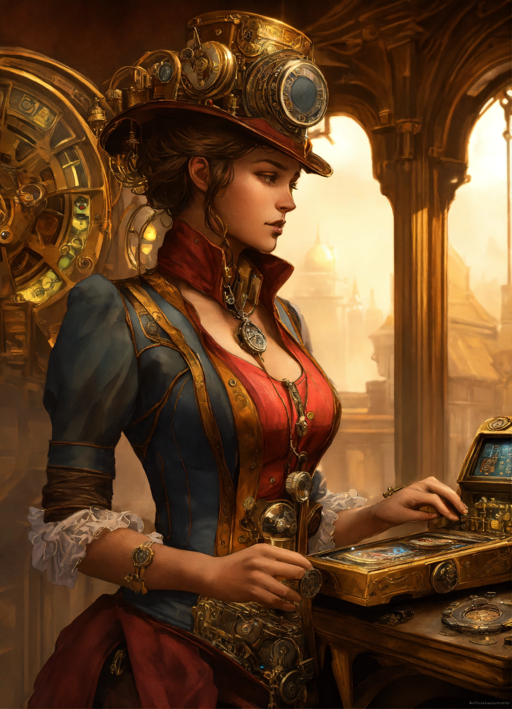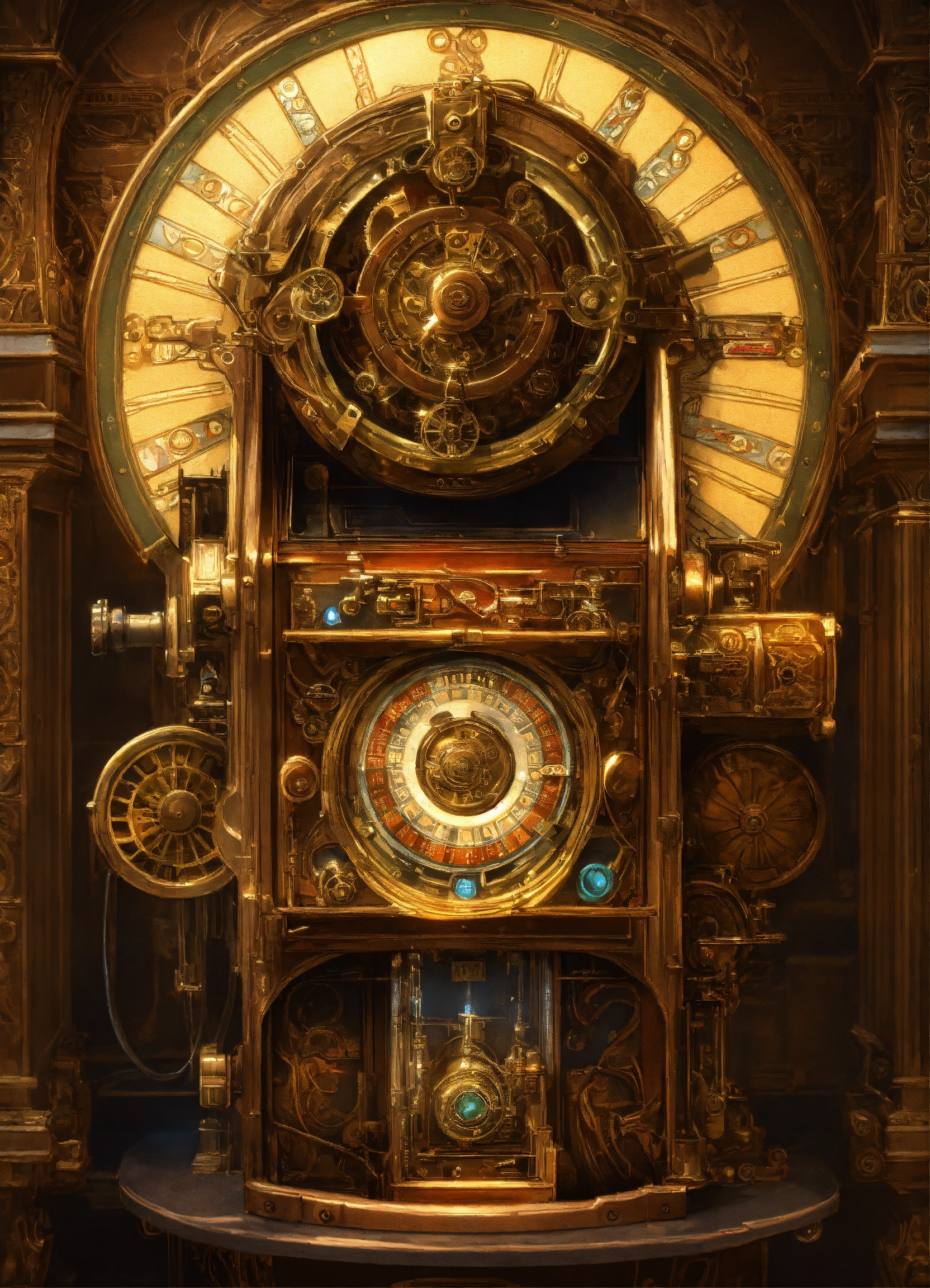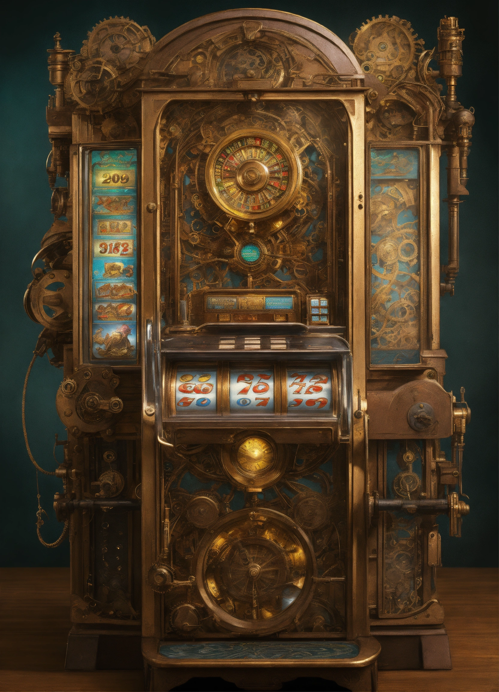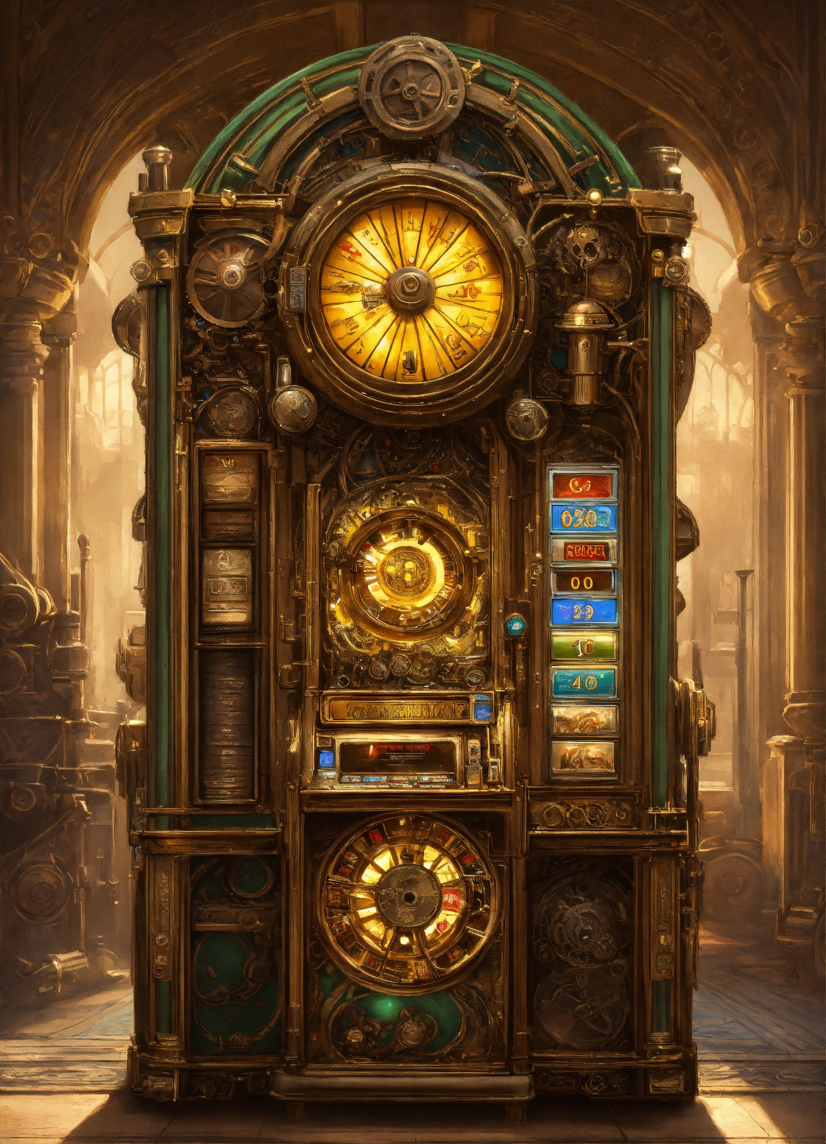 Steampunk slot machine, close view. concept art, intricate details, highly detailed by greg rutkowski, michael whelan, and gustave dore, alphonso mucha . full body, no hat, mystra