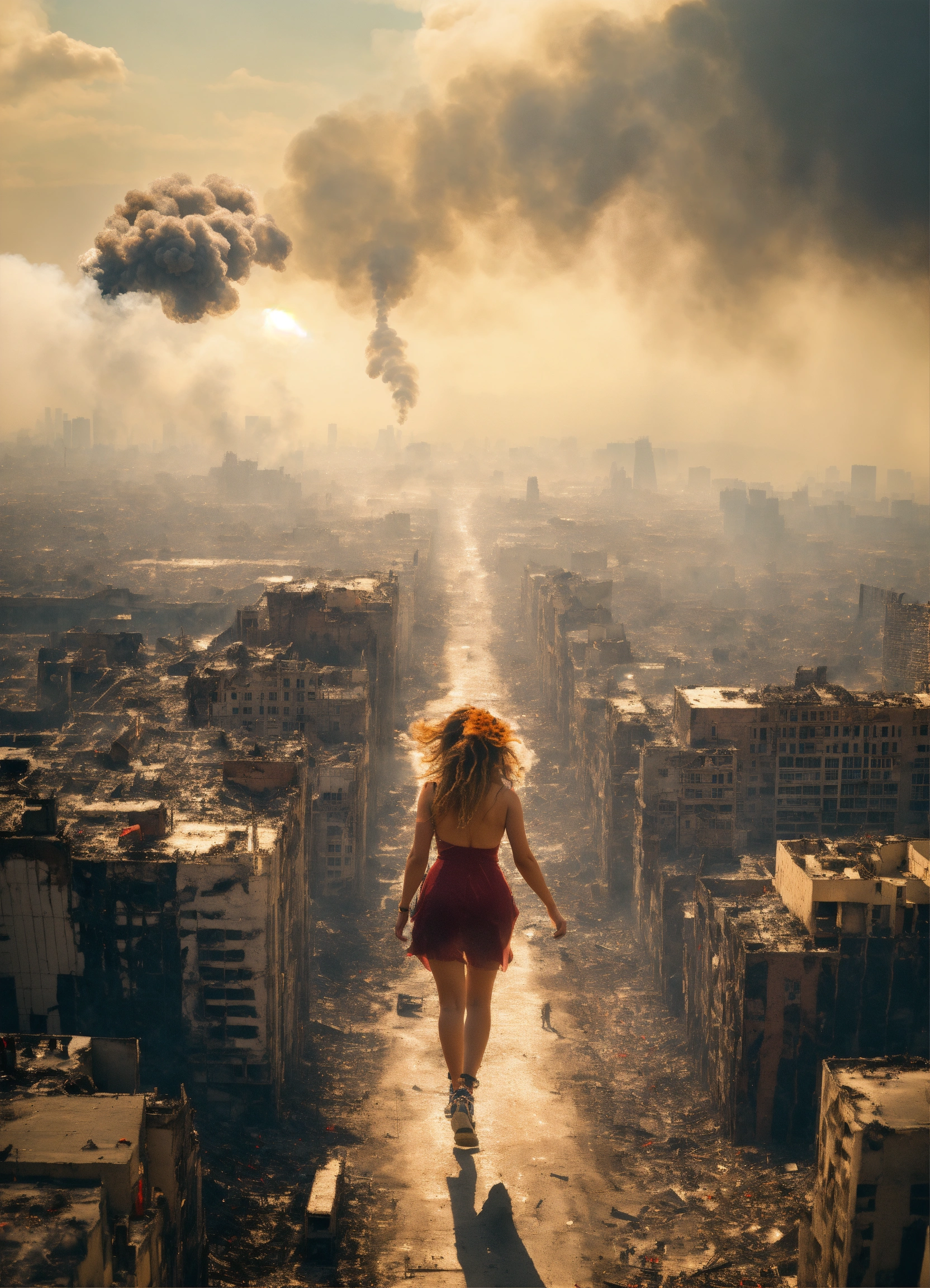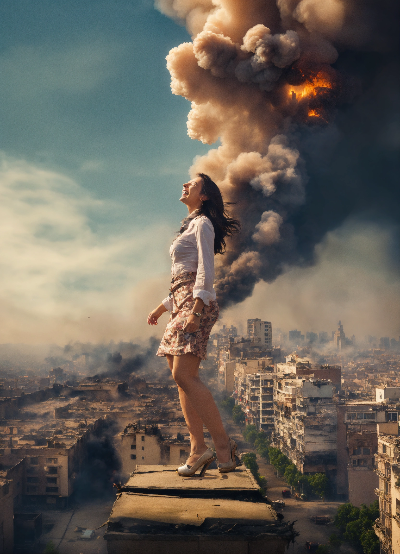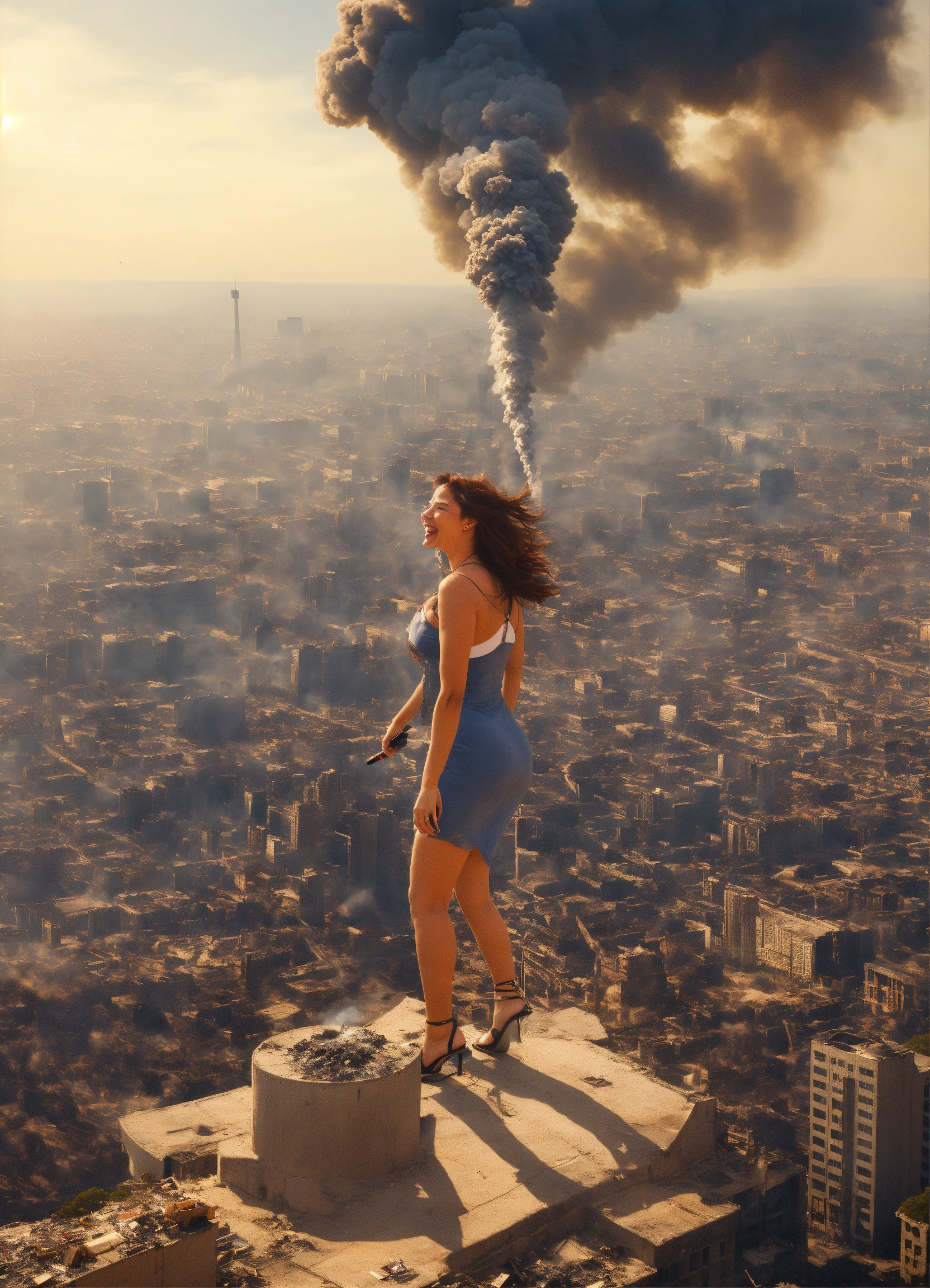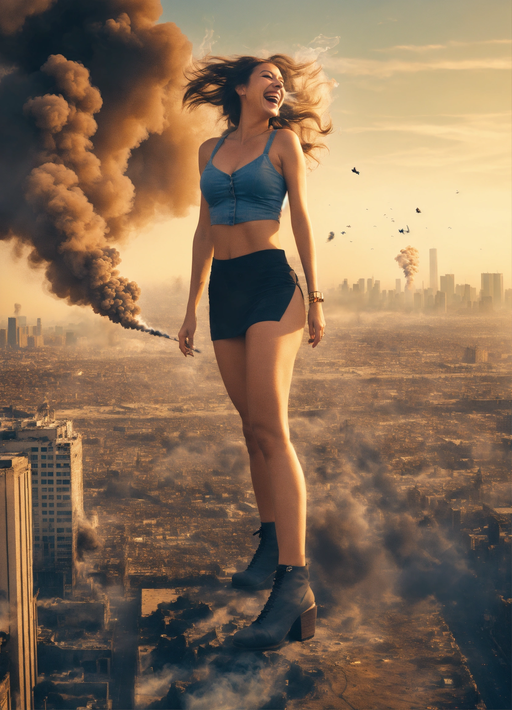 Mega giantess walking over a city (aerial view) destruction (smoke by her feet) face laughing horizon