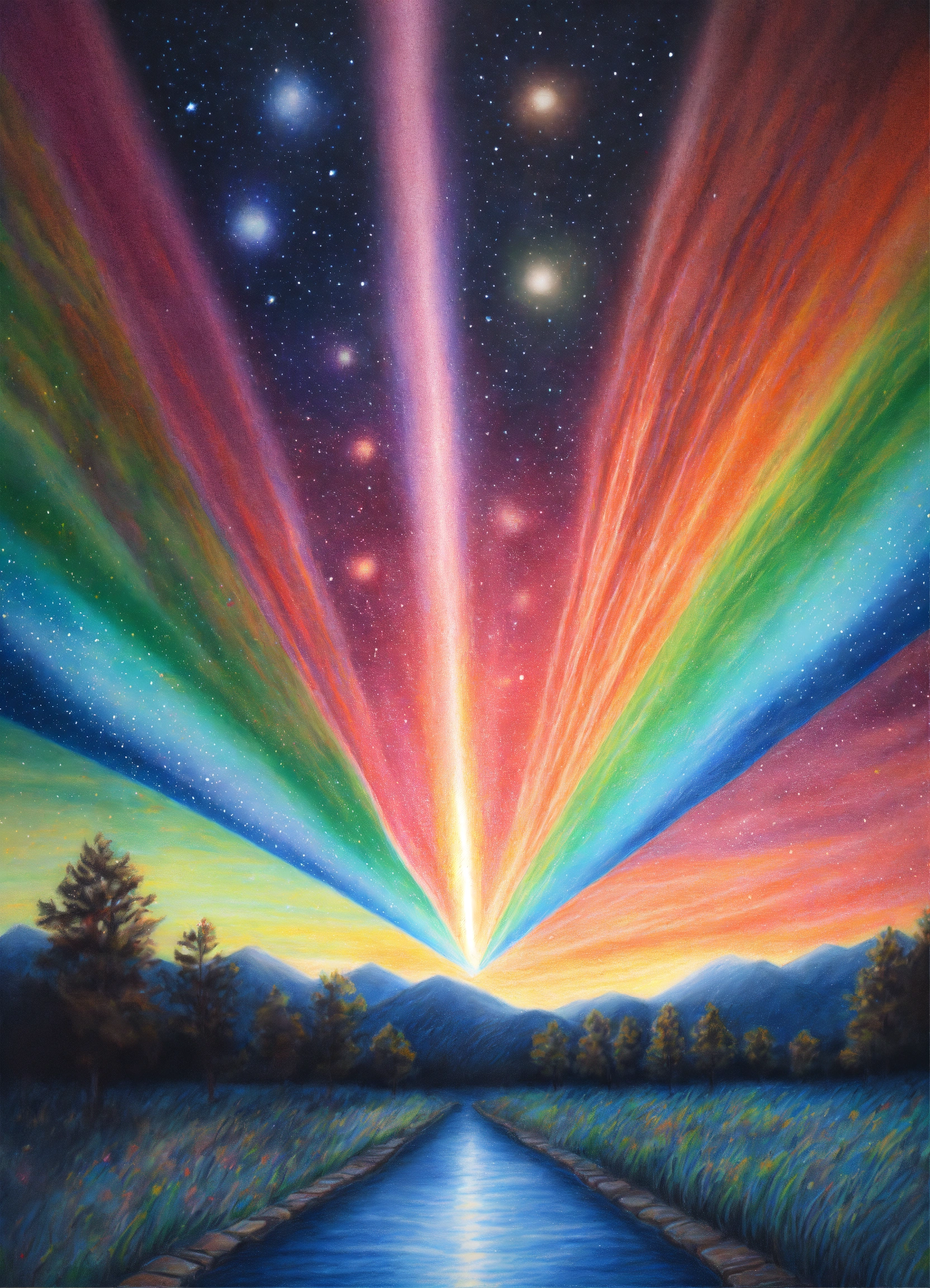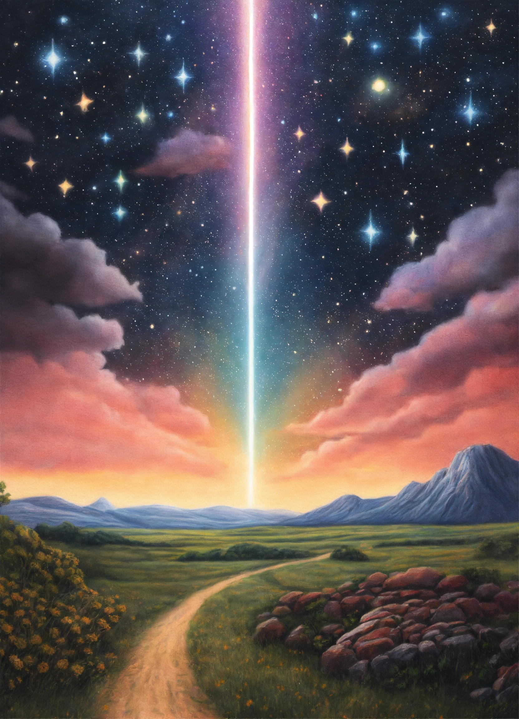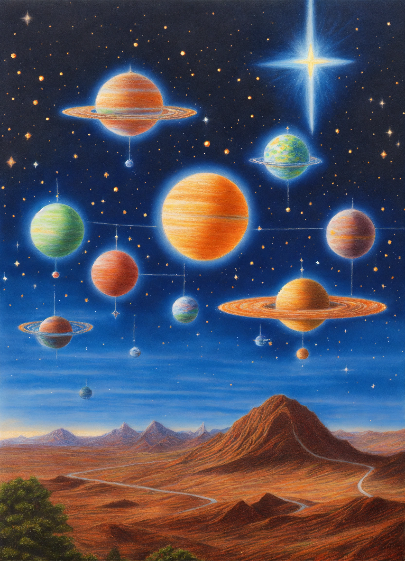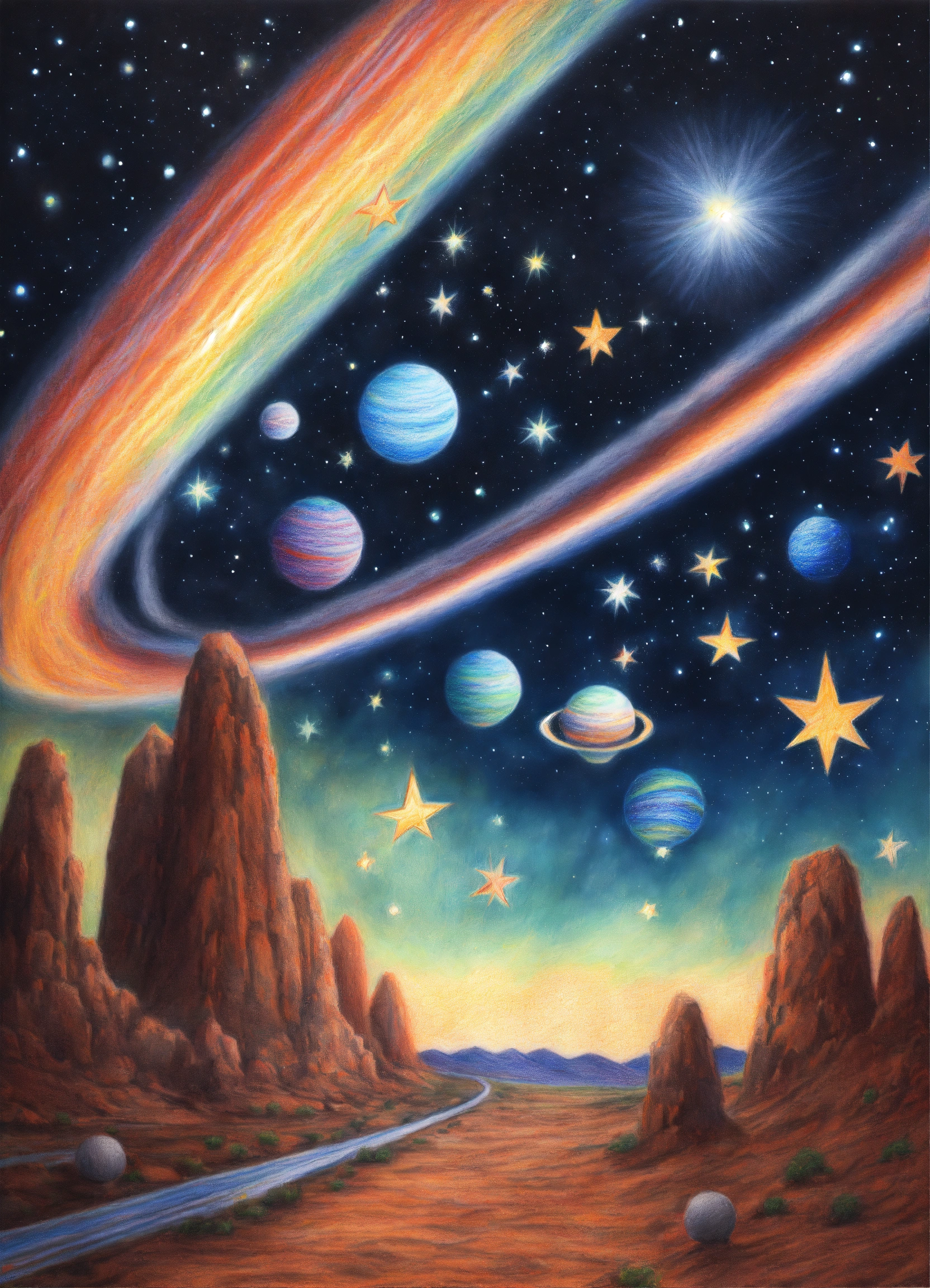 Realistic colored pencil drawing of 5 stars lined up in a beautiful extraterrestrial sky