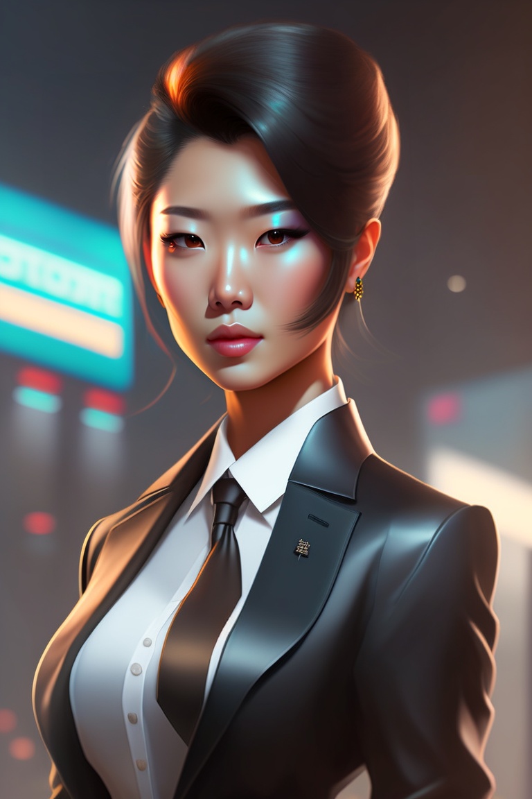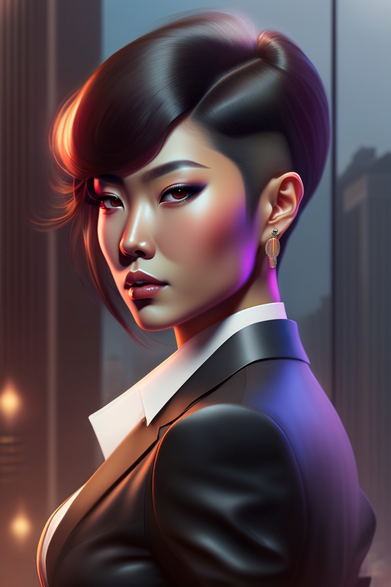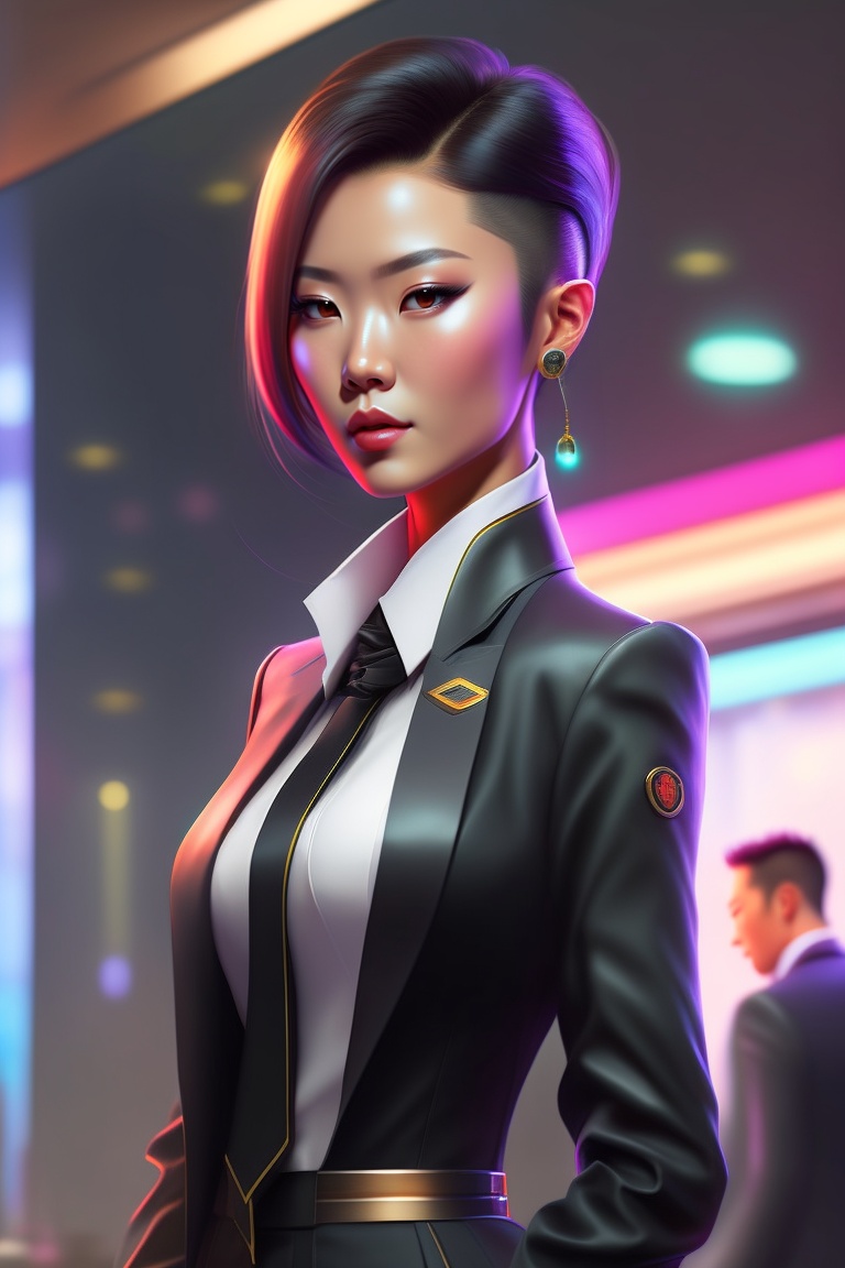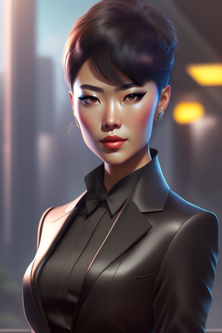 Asian cyberpunk feme fatale smart wearing a black business suit, with white shirt, thin tie, short professional hair, office background