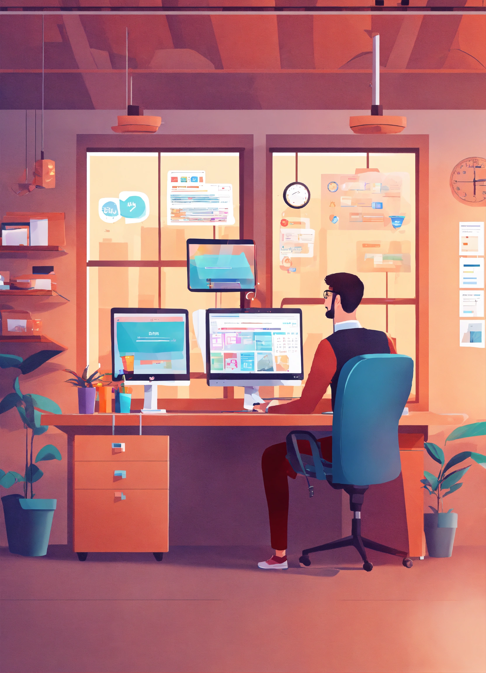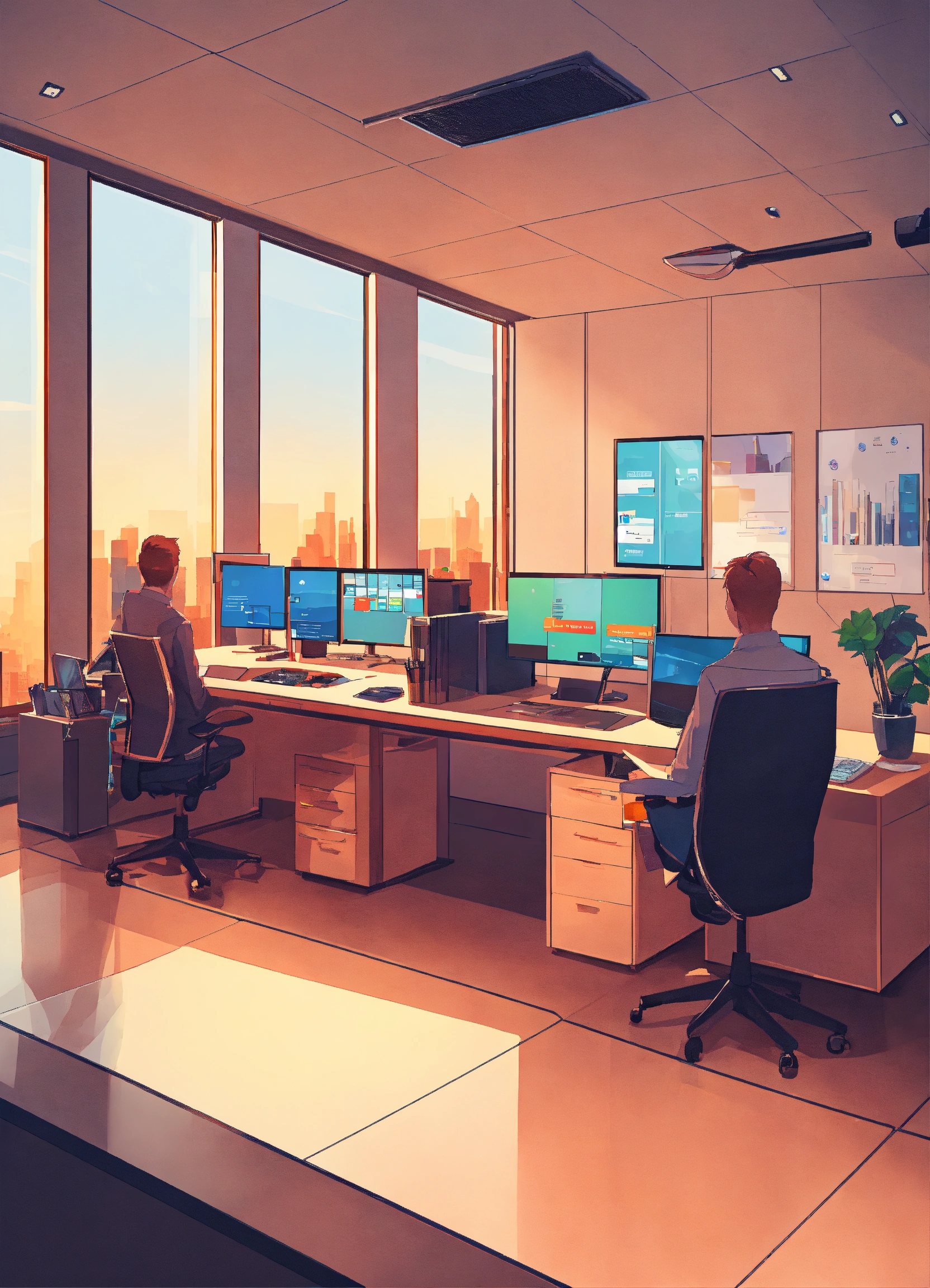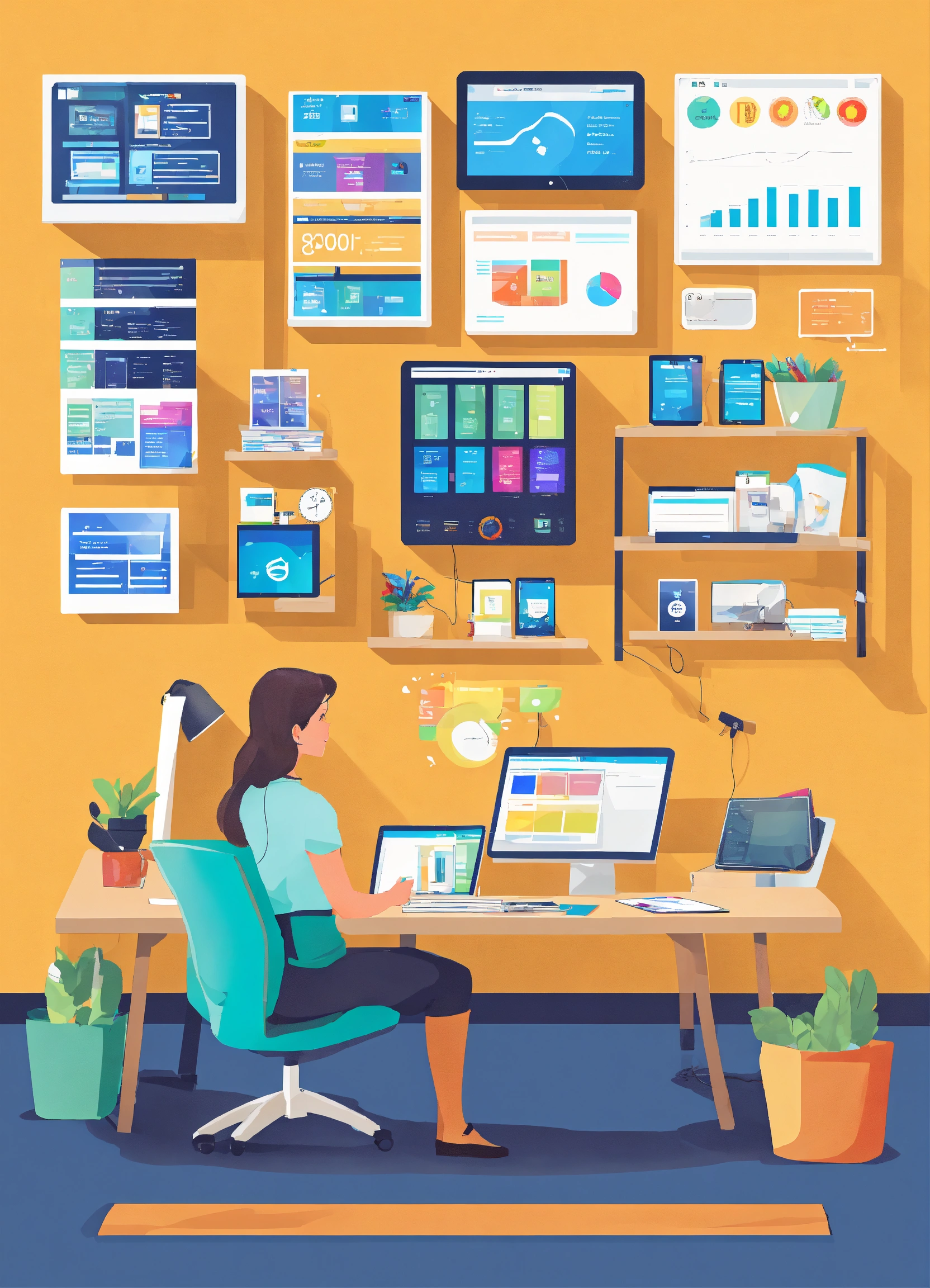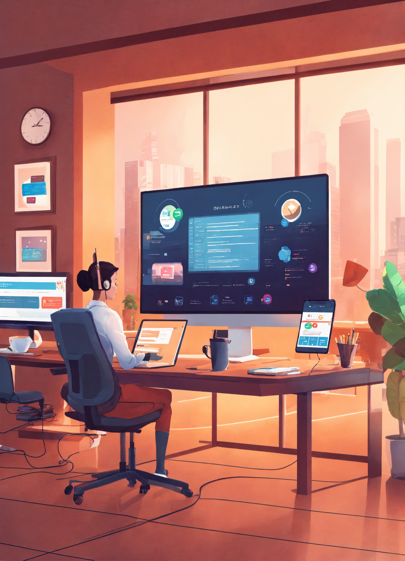 Create a digital customer service office, with support for customers using mobile apps. the office has a long desk, two computers, a tablet, and a cell phone. it also has a giant screen with data.