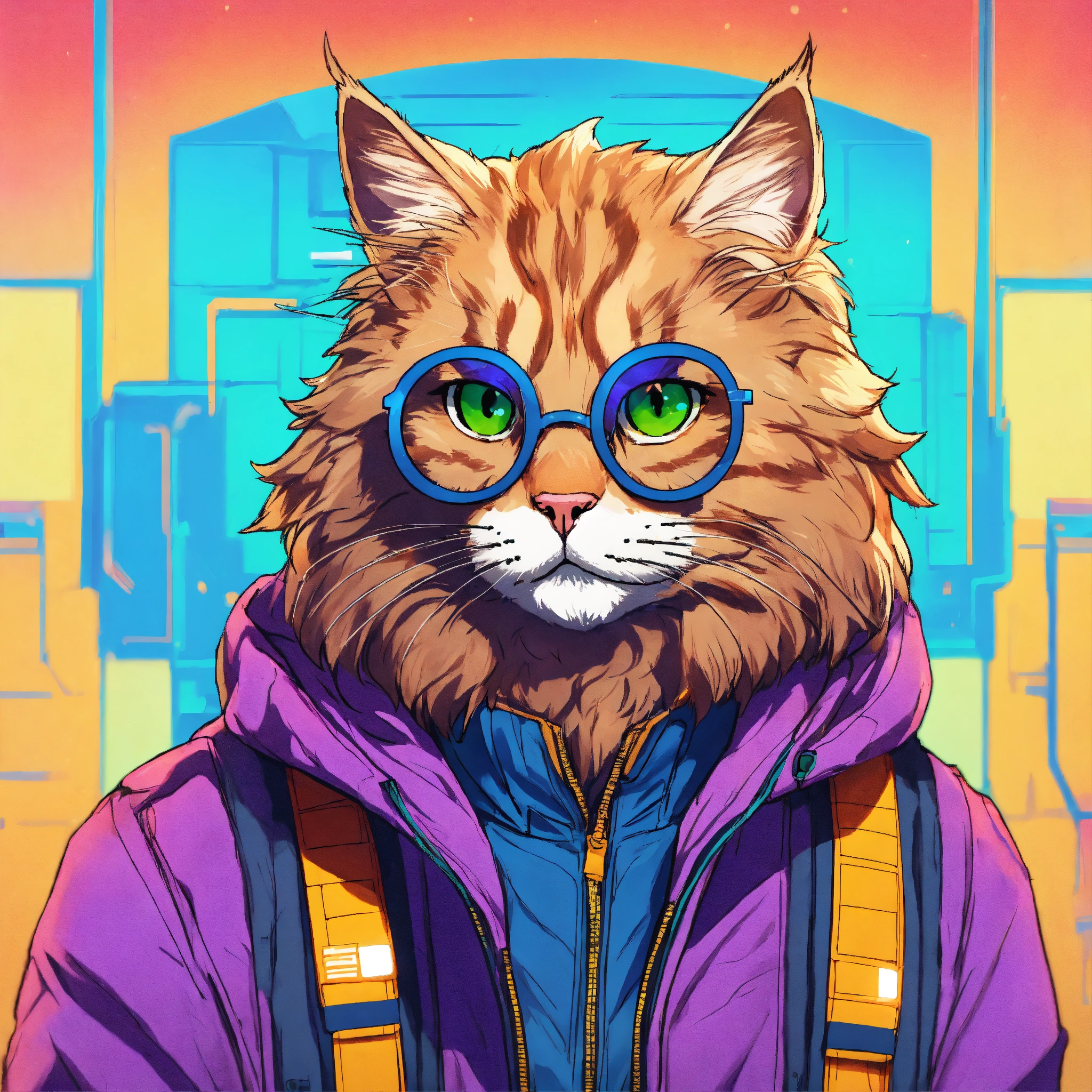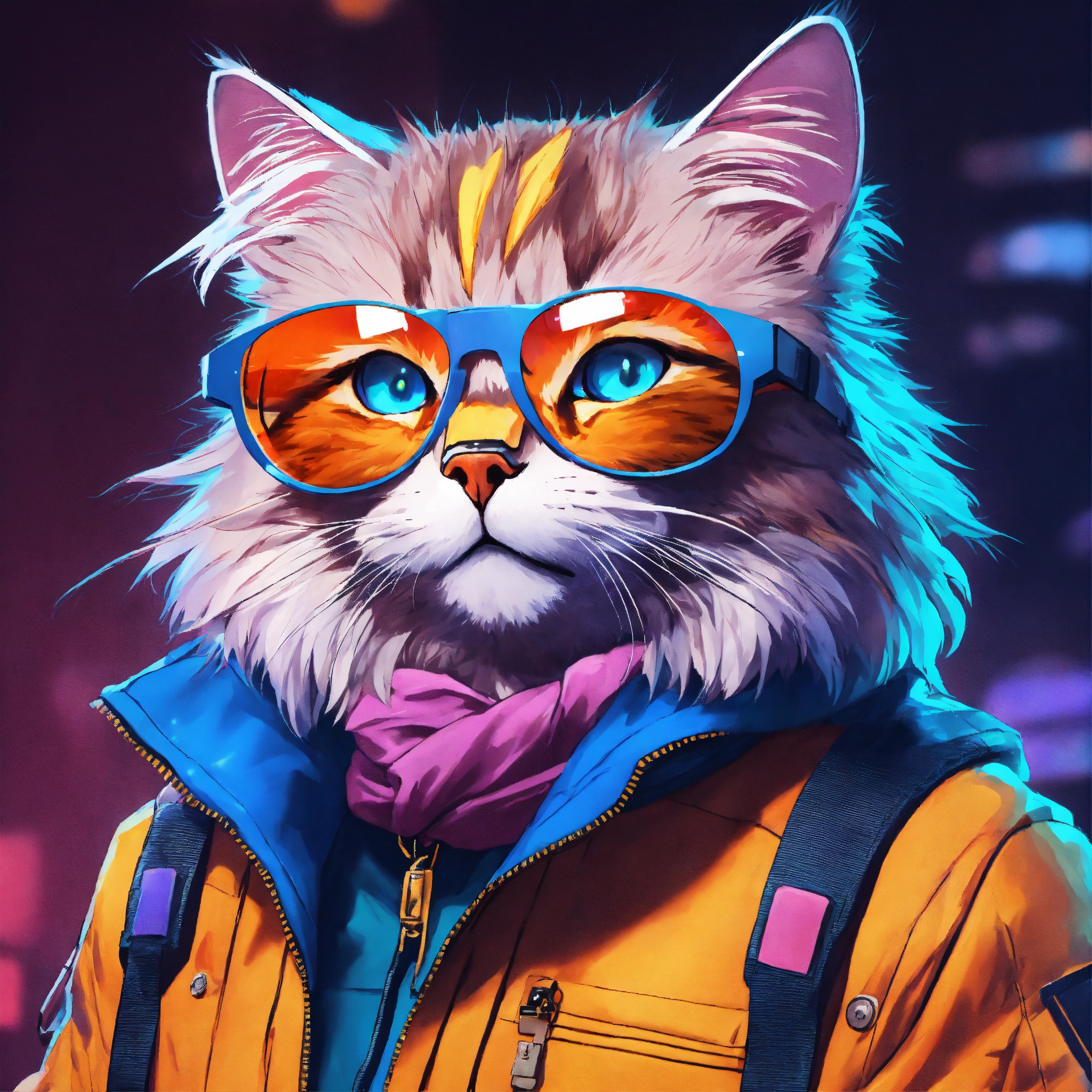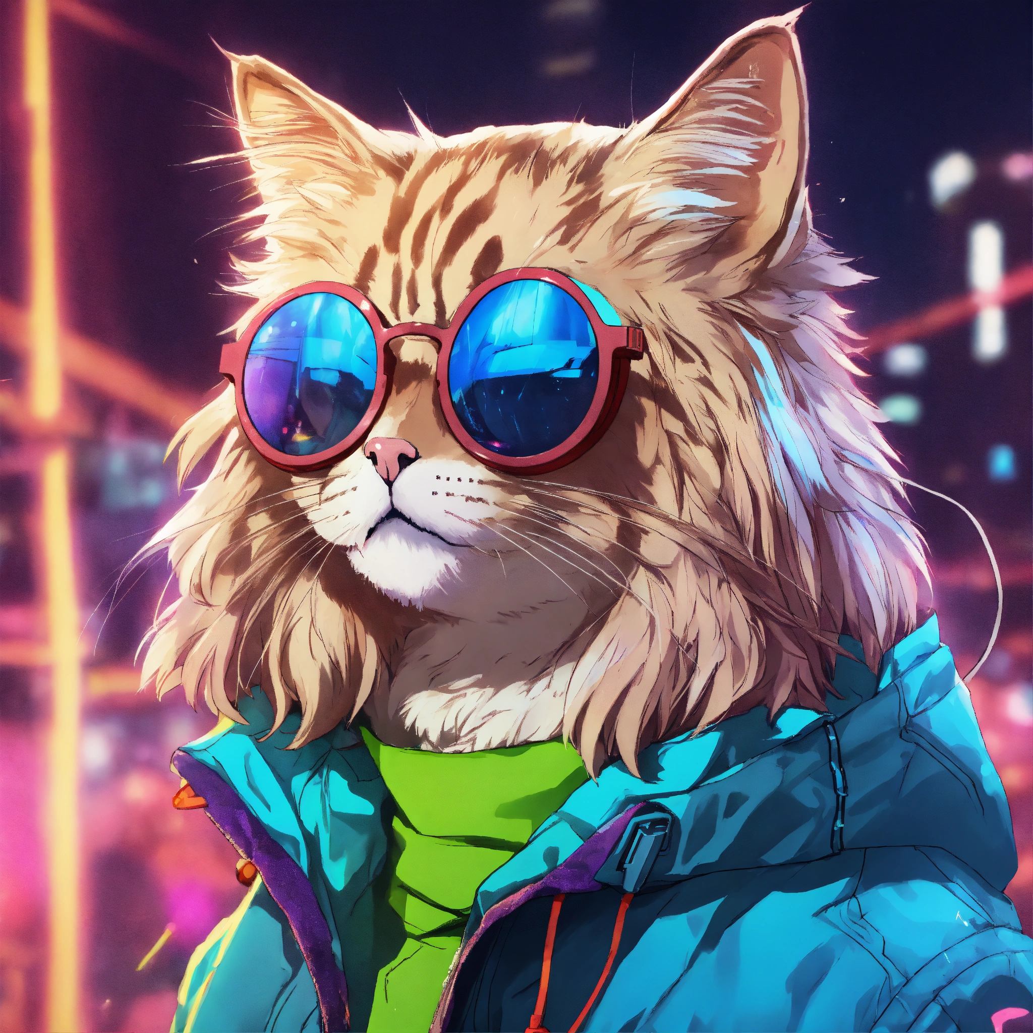A brutal siberian cat wearing cyber jacket and round colour glasses