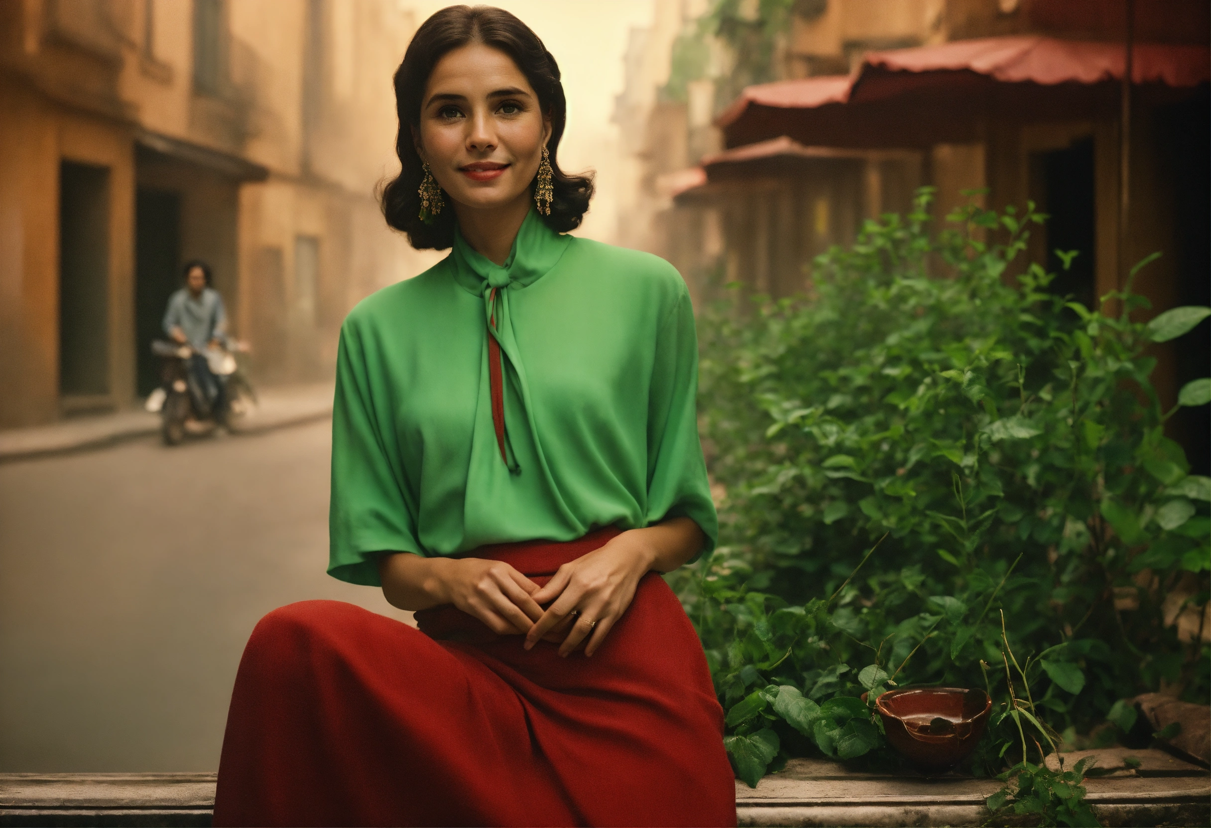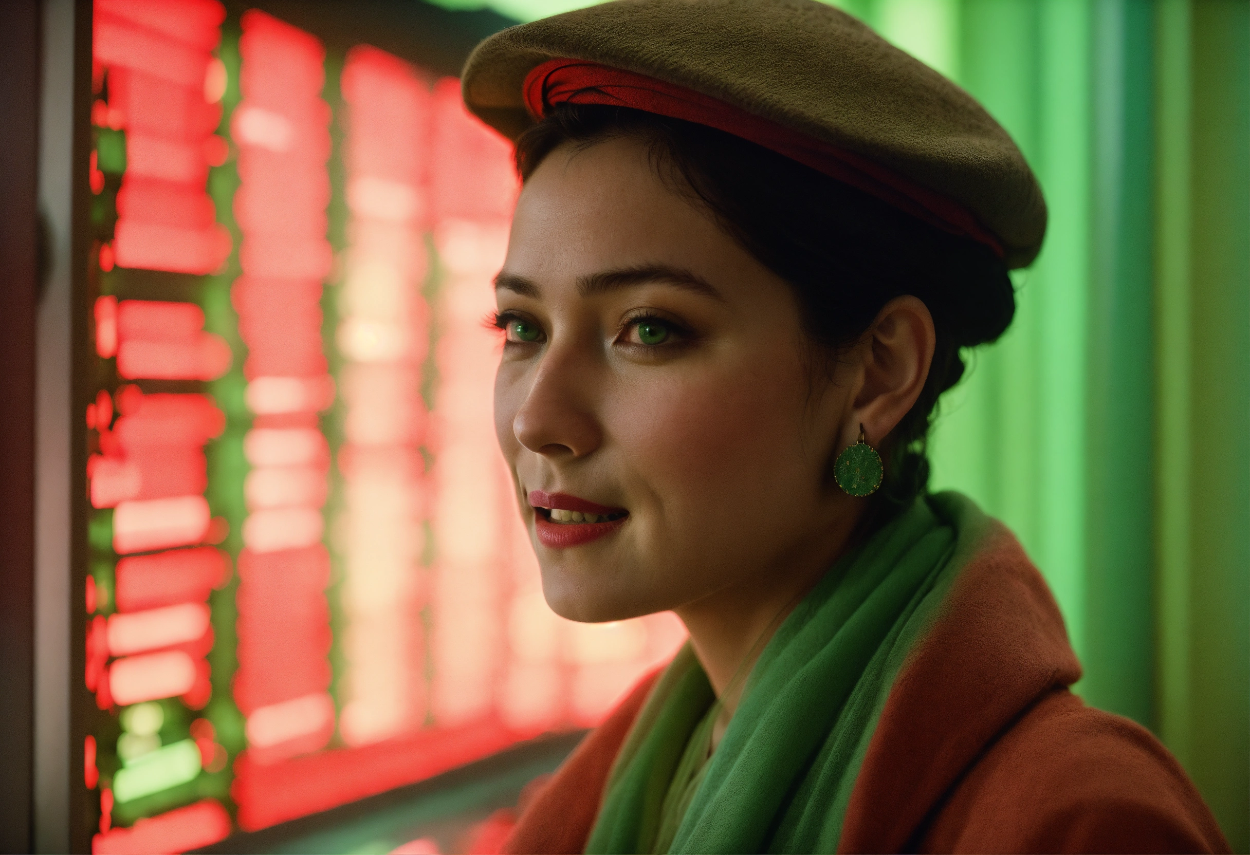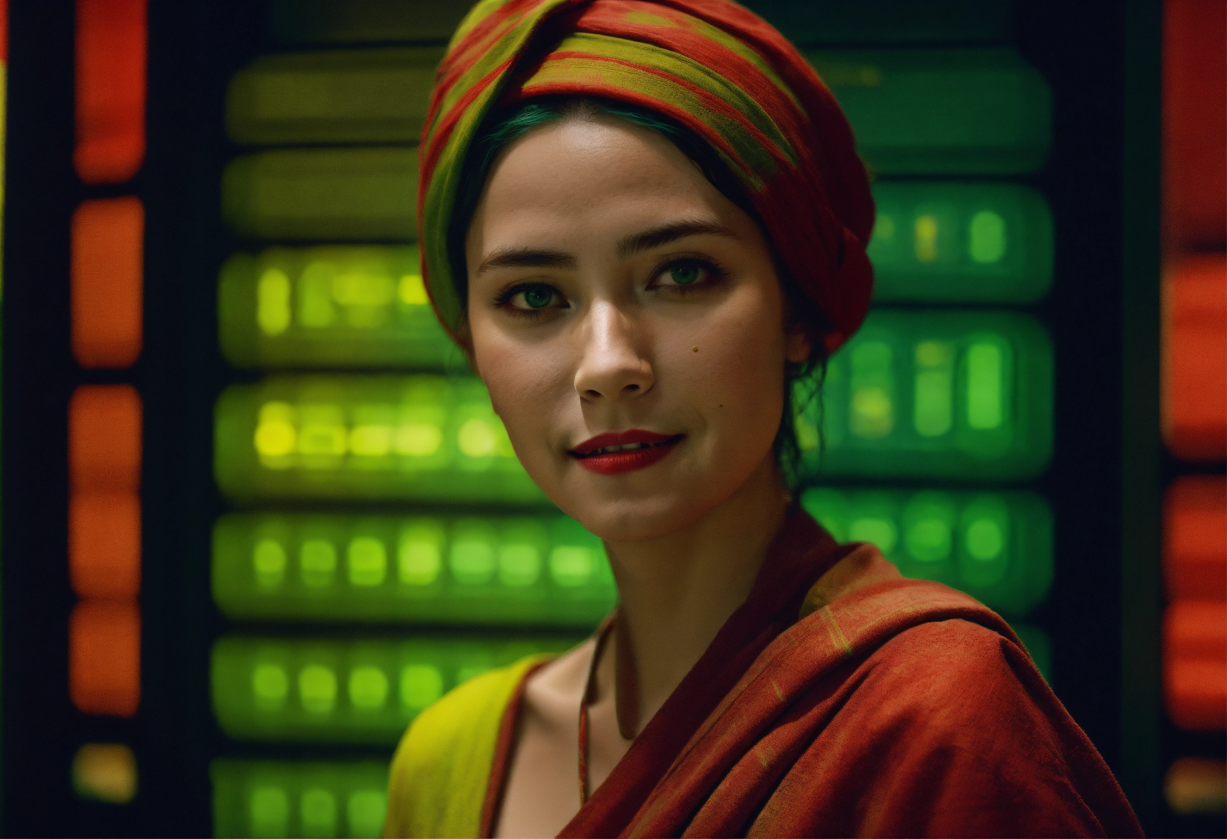 Retro data visualization screens, human portrait, relaxed mood, smiling, photo, pastel colors, green, red, photographed by (steve mccurry), film still from (christopher nolan), medium shot fashion, award winning photography, arty pose, fashion, high definition, high resolution, muted colors, volumetric lighting, 8k, 3d render
