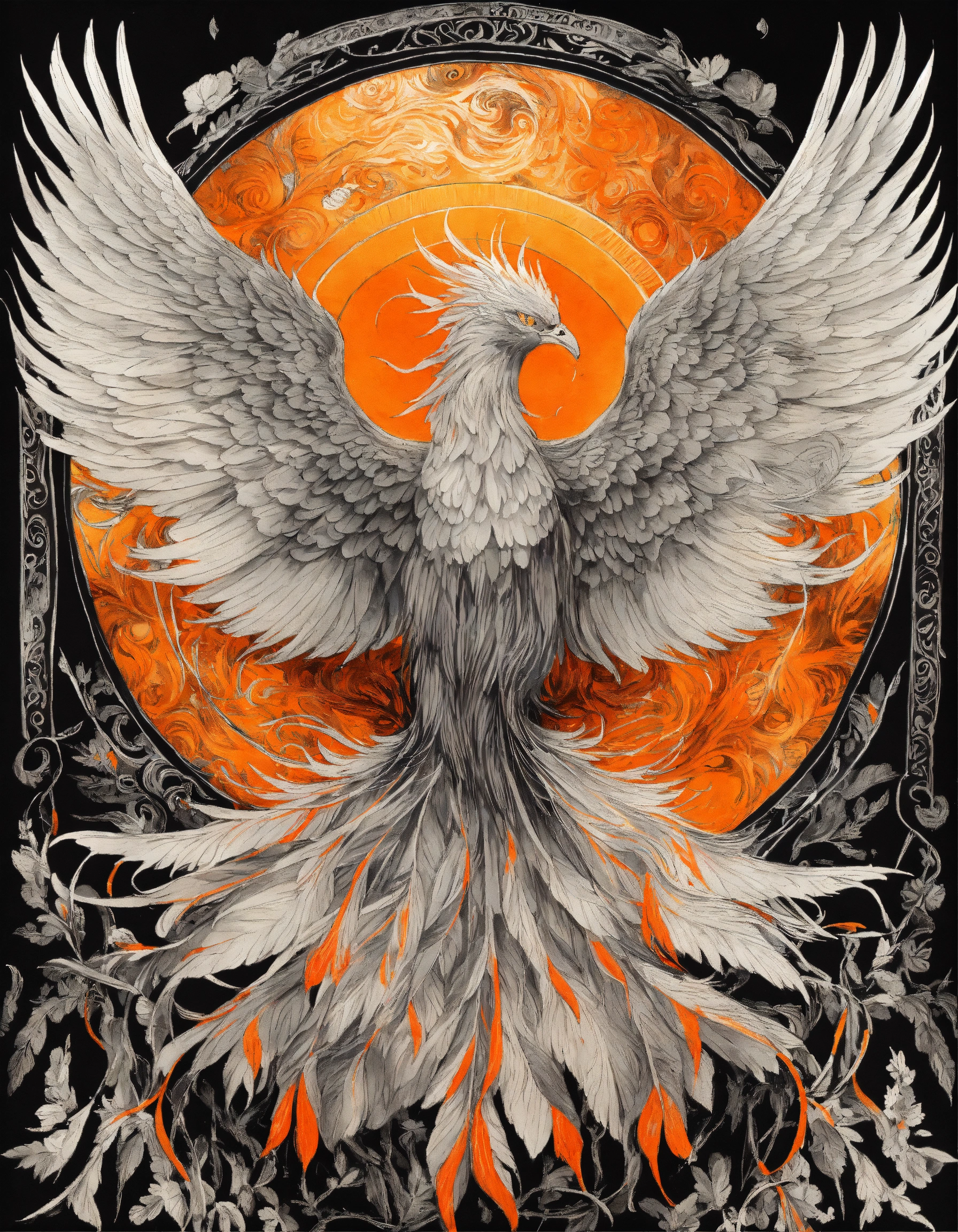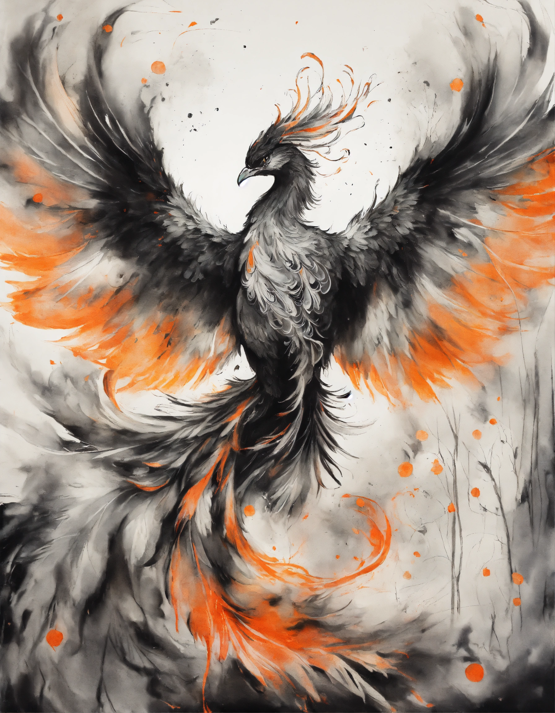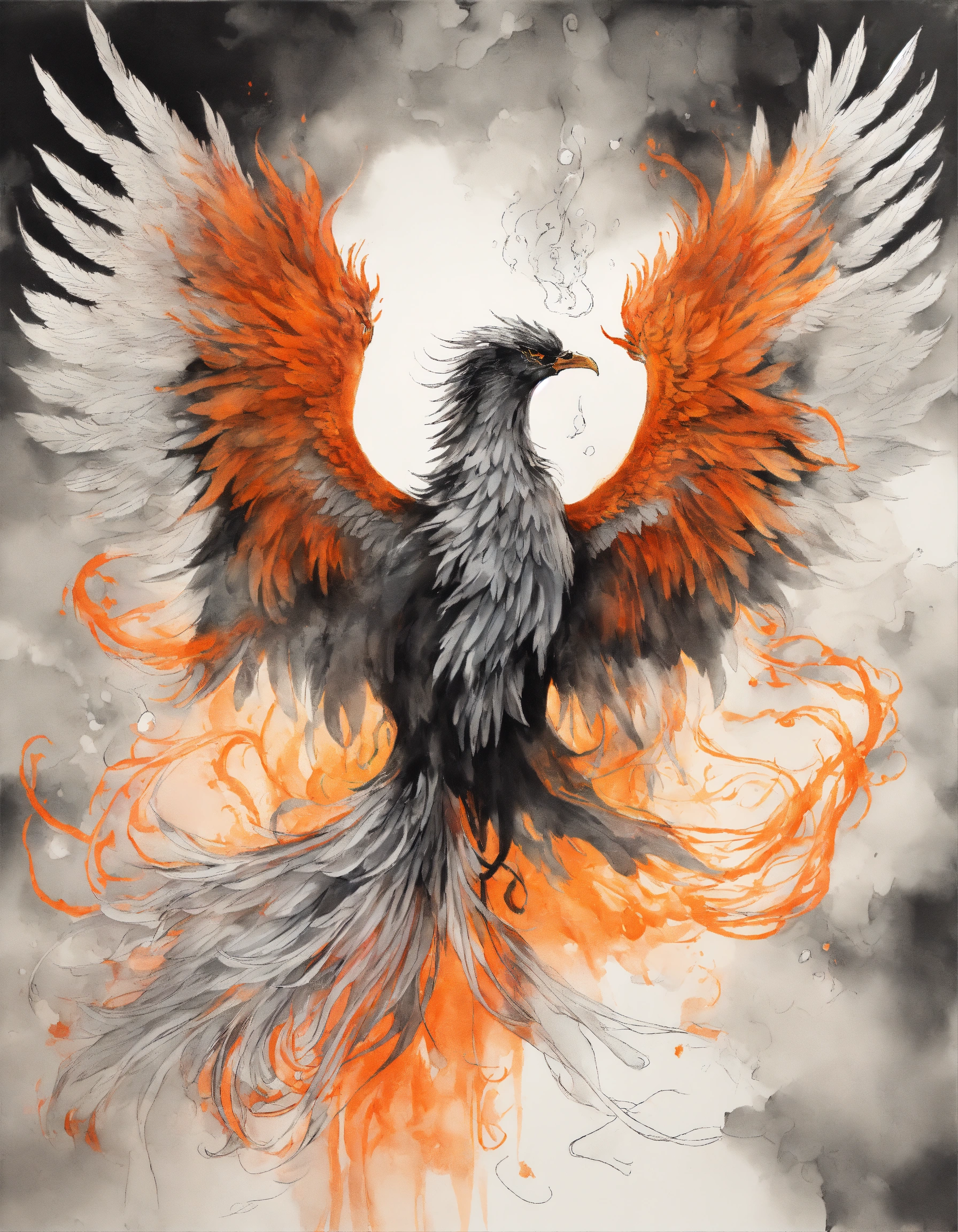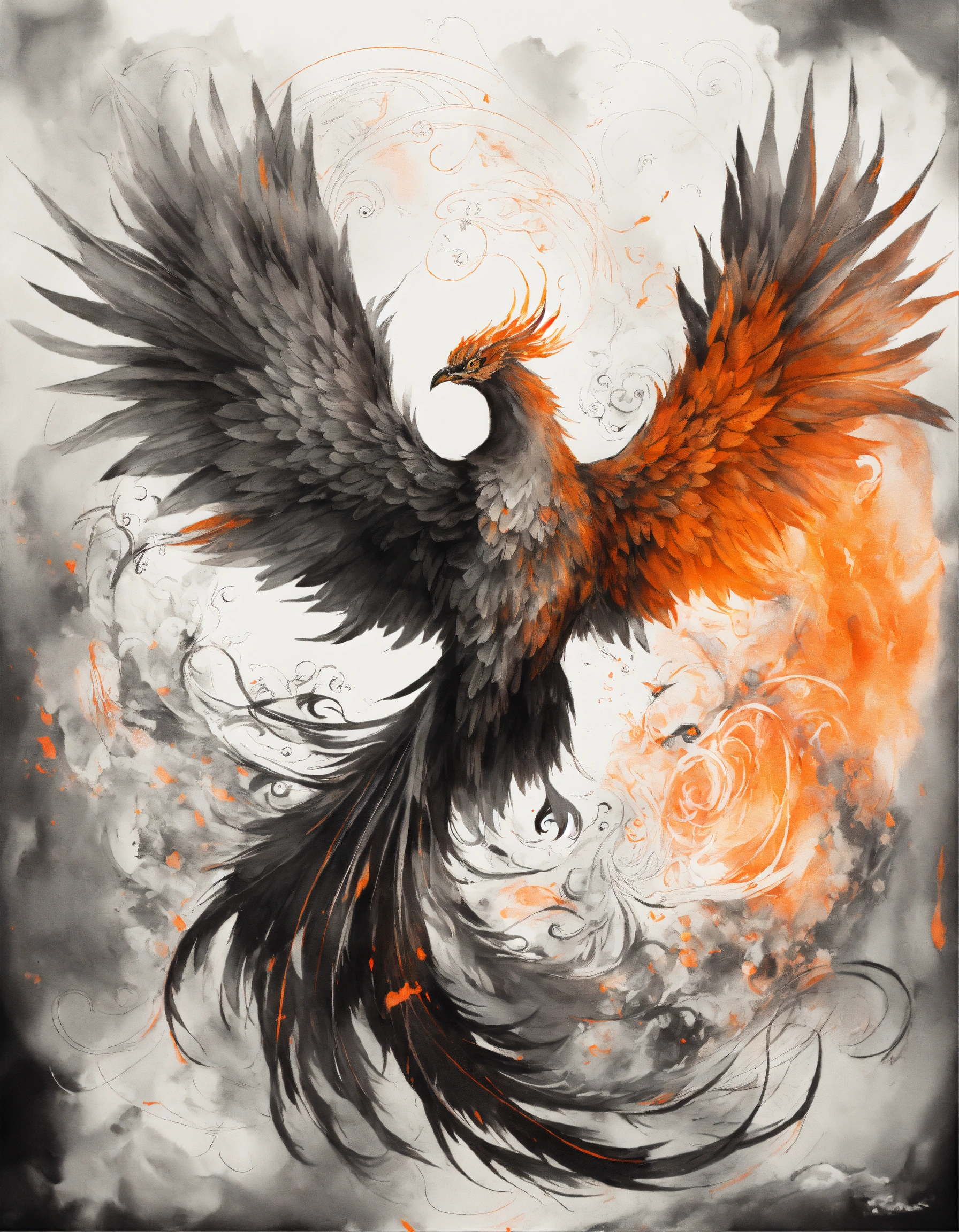 Transparent canvas with an ink drawing mystical and magical phoenix in black and white with hint of bright orange