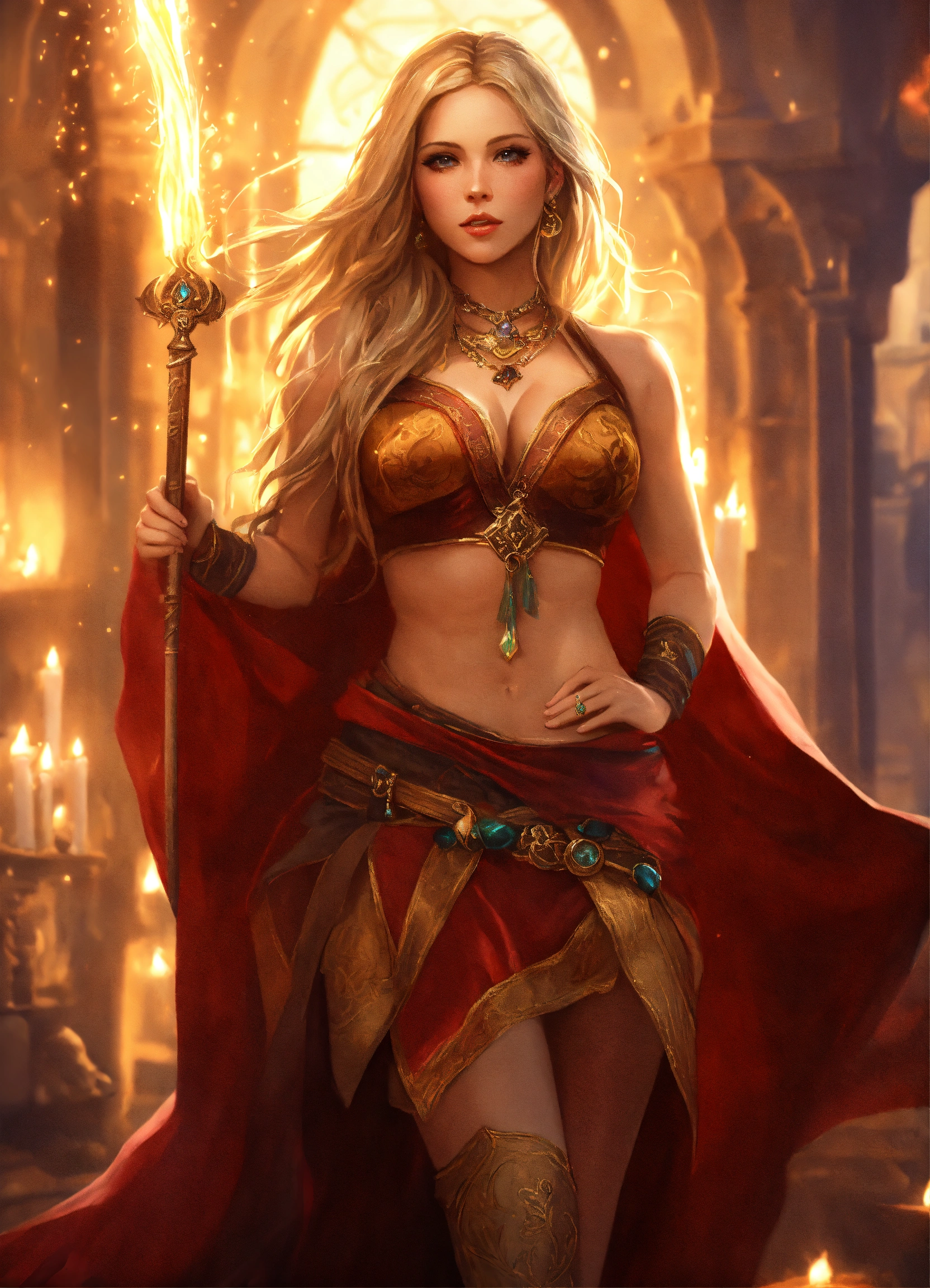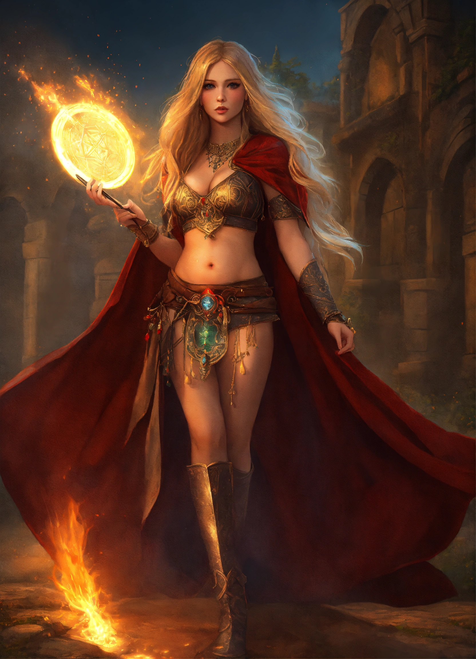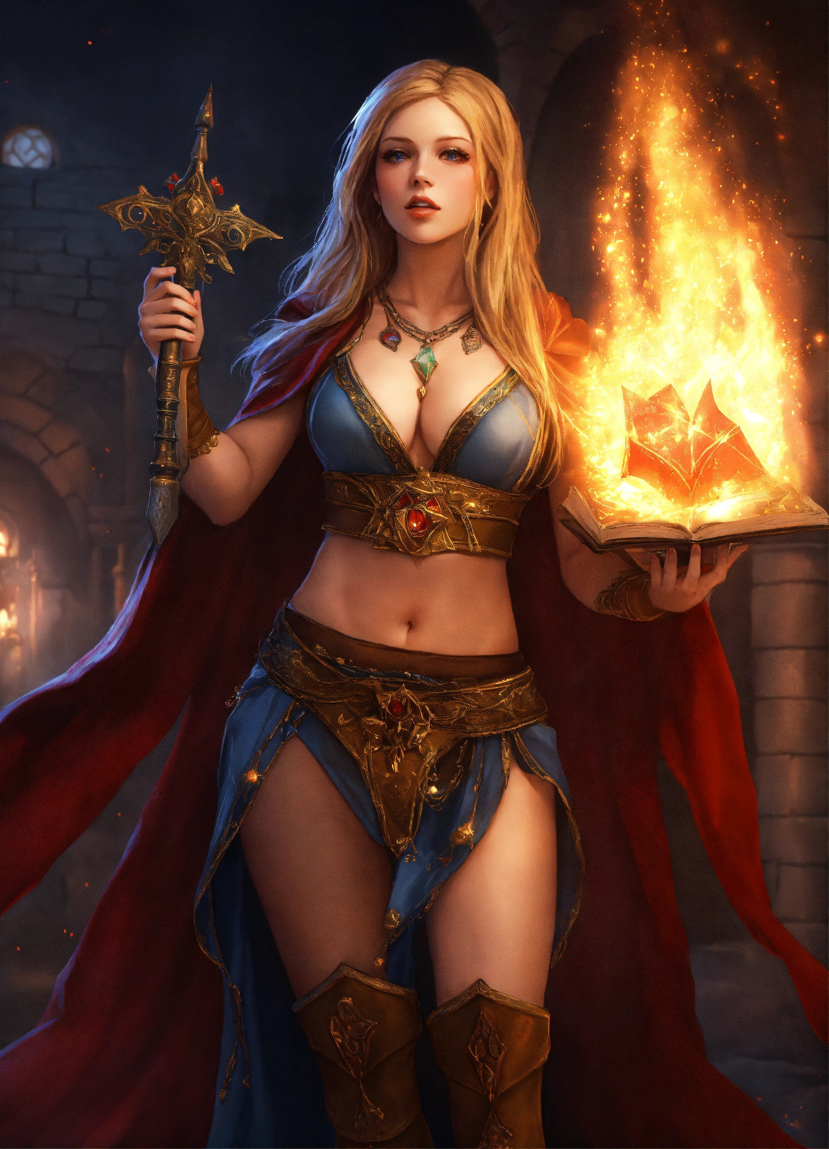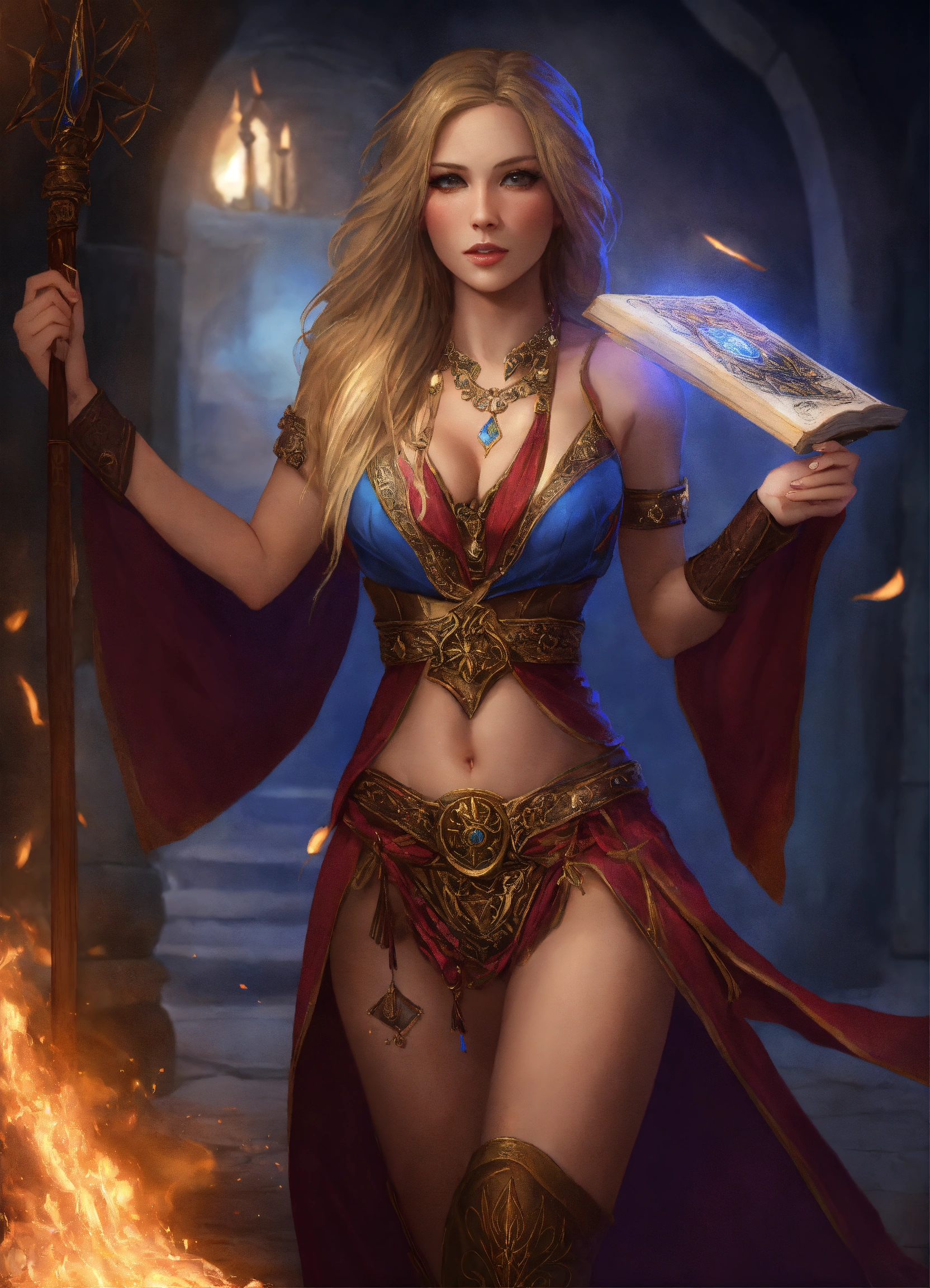 Lexica aperture v2 avril lavigne wizard warrior baldur's gate game portrait semi-realistic medieval beautiful goddess belly dancer bare legs robe cloak wand spell magic spellbook scroll closeup skinny thin