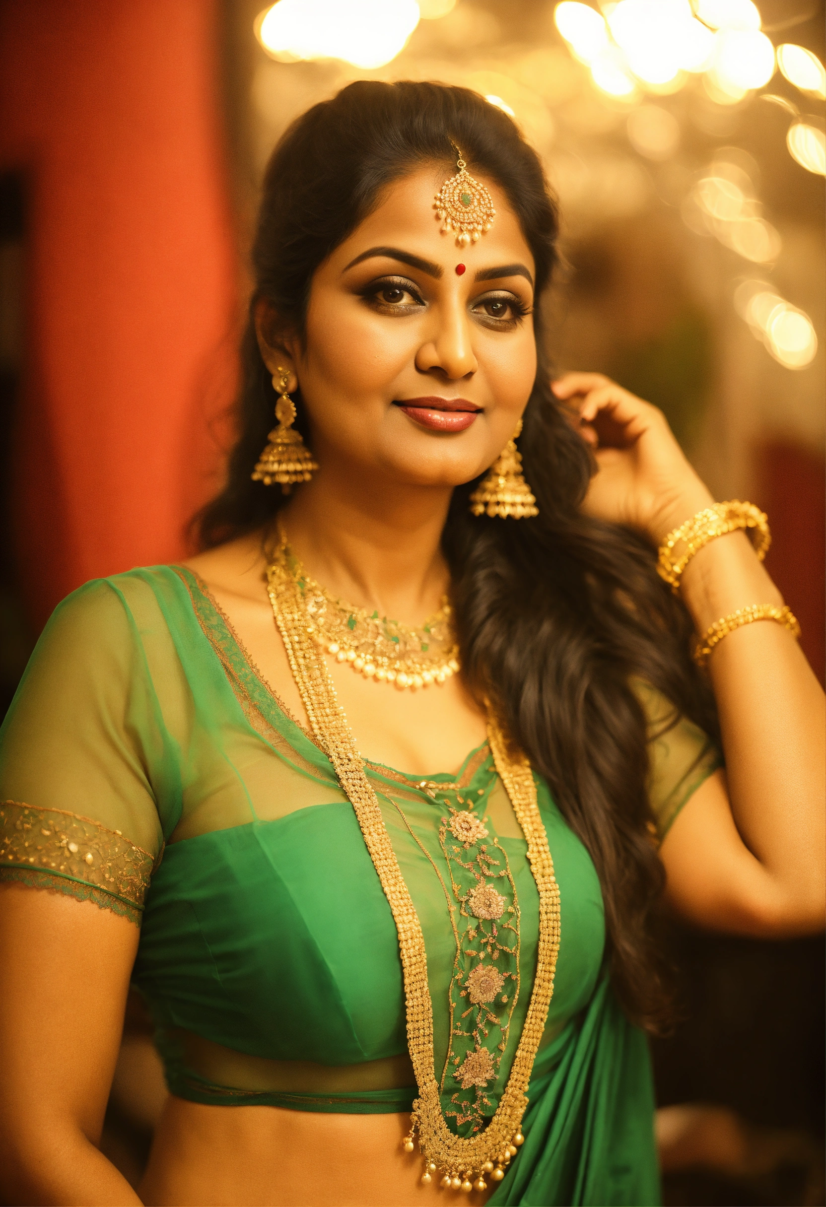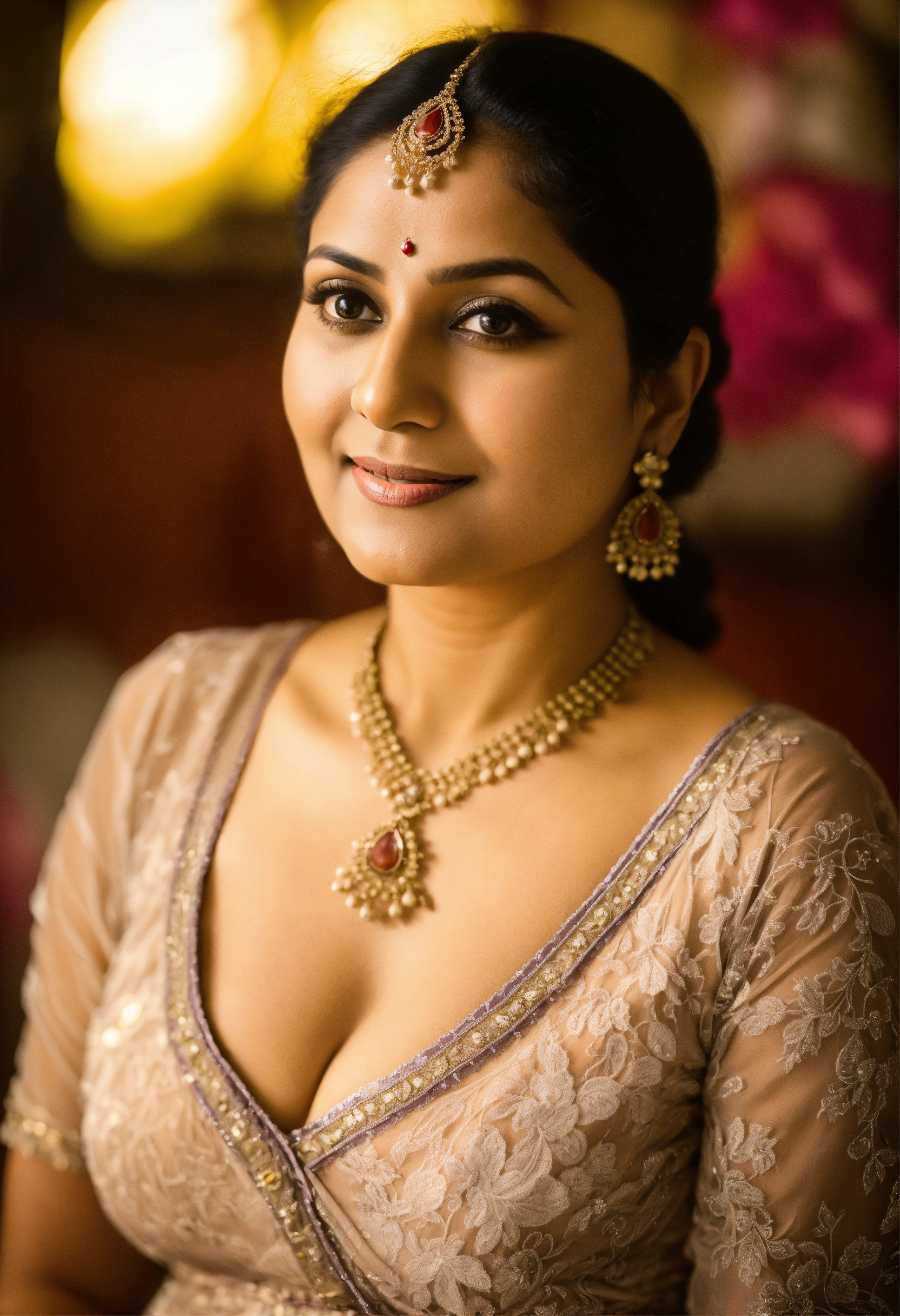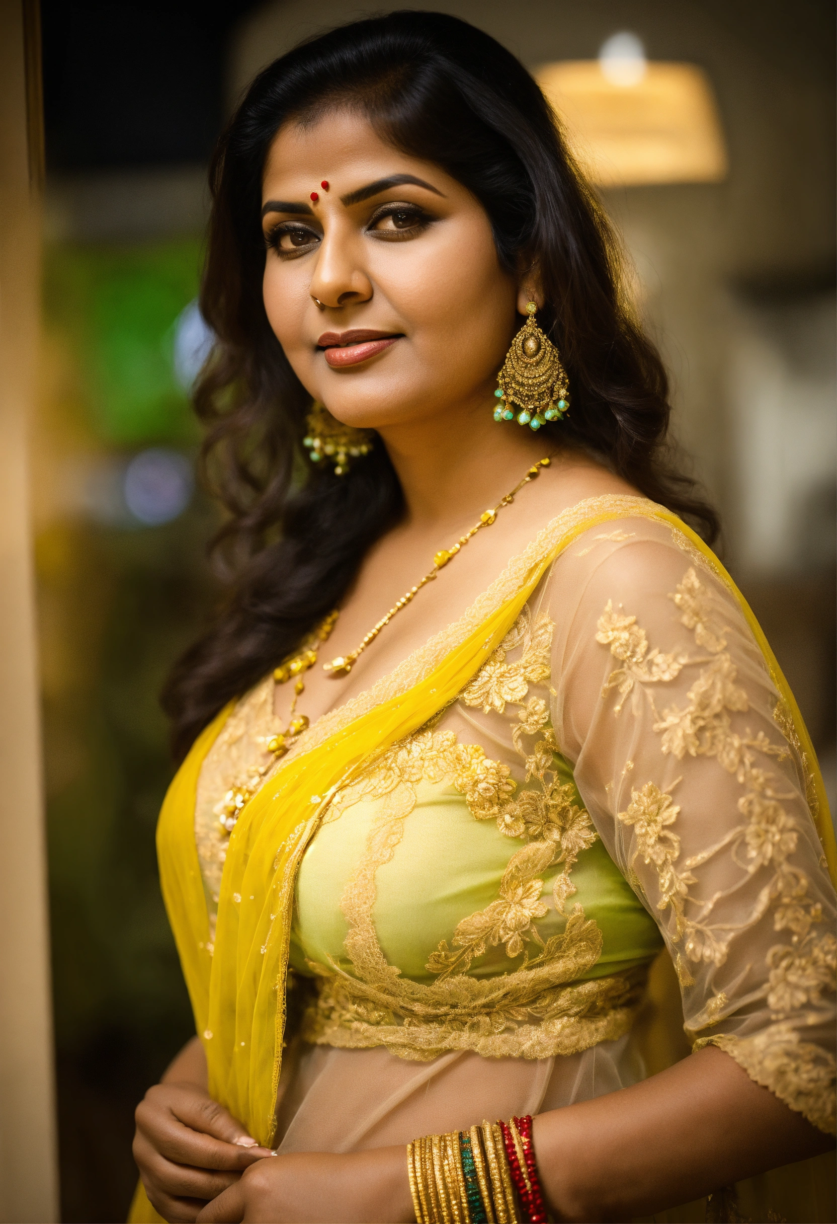 A cute indian aunty without any jewellery, wearing see through lacy dress, without bra, without barely dressed, wide-angle shot