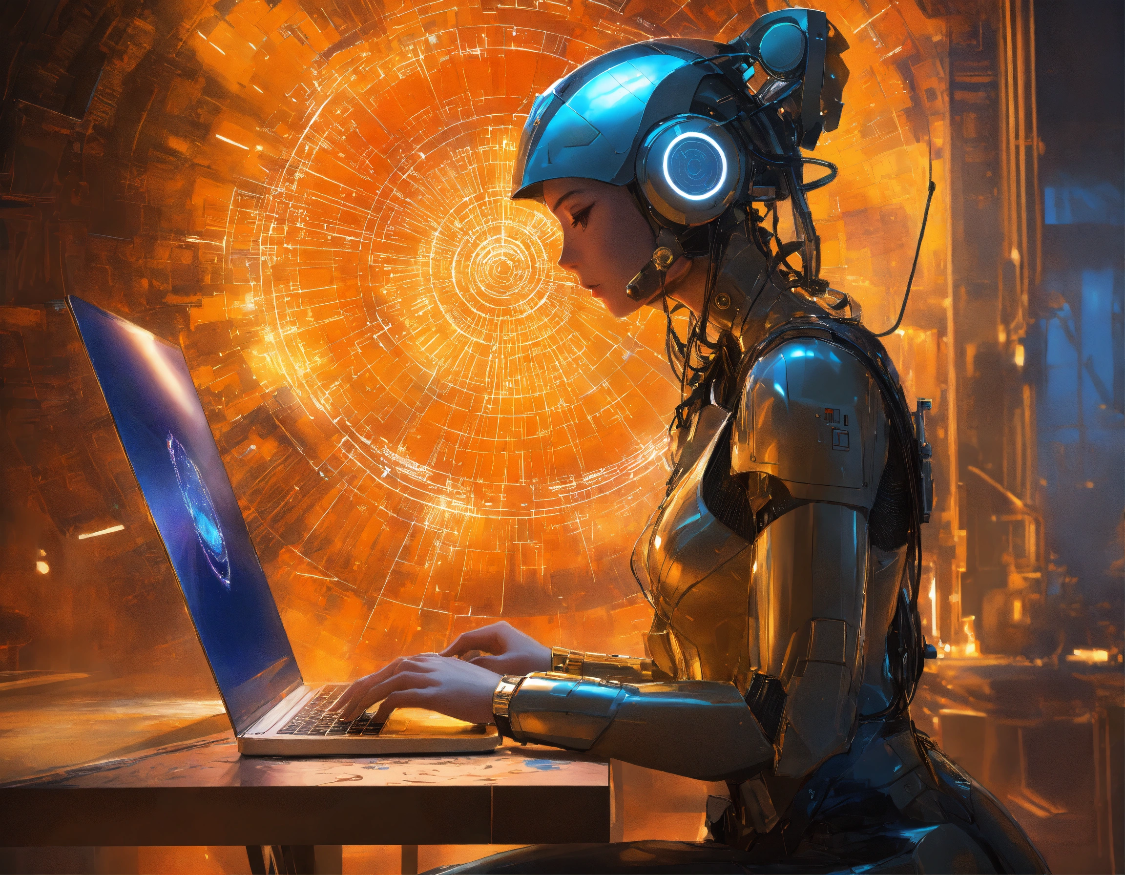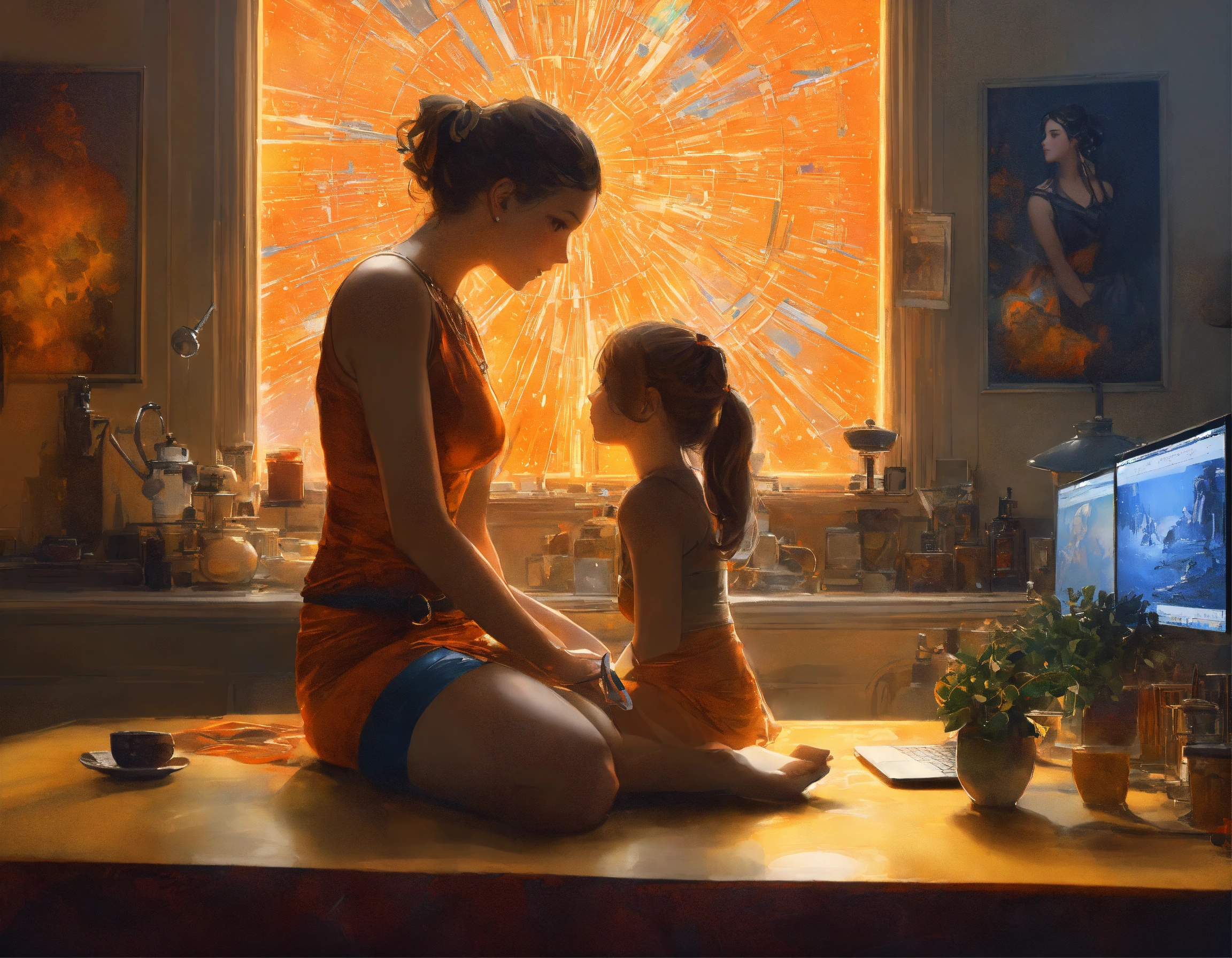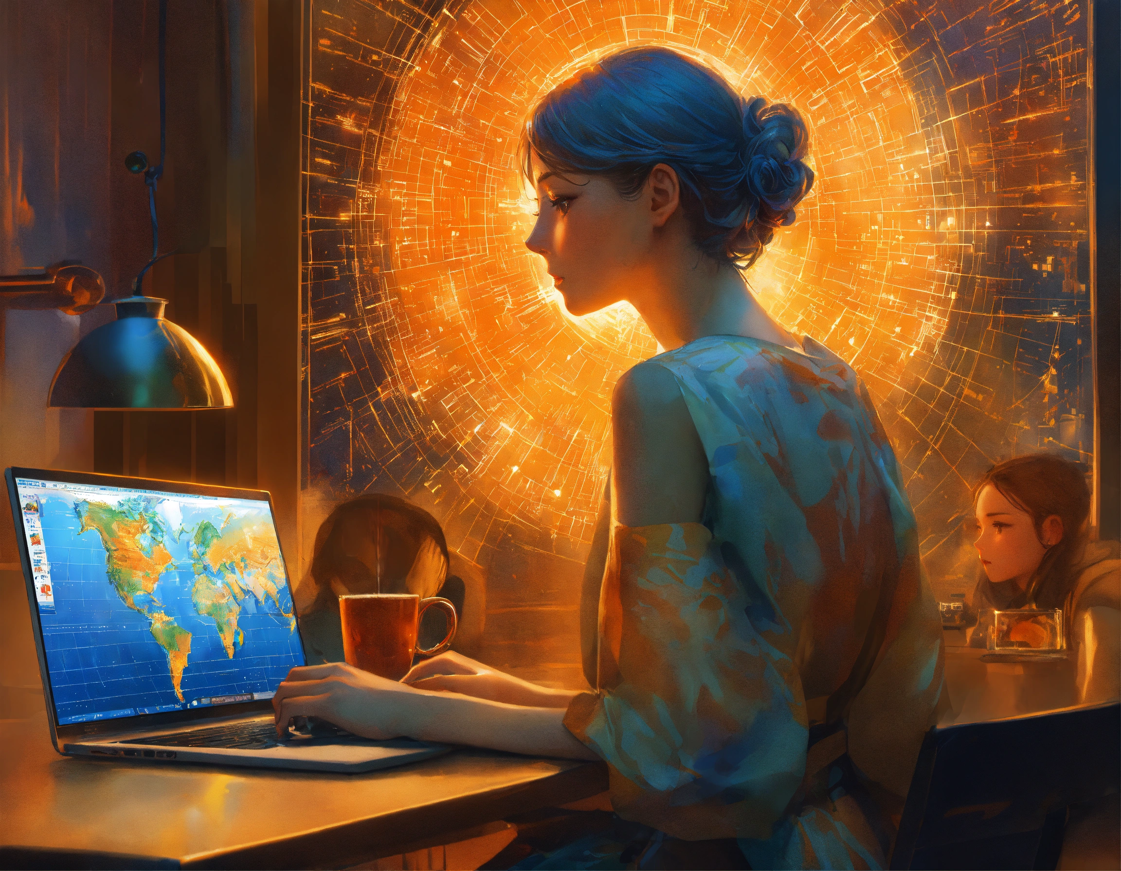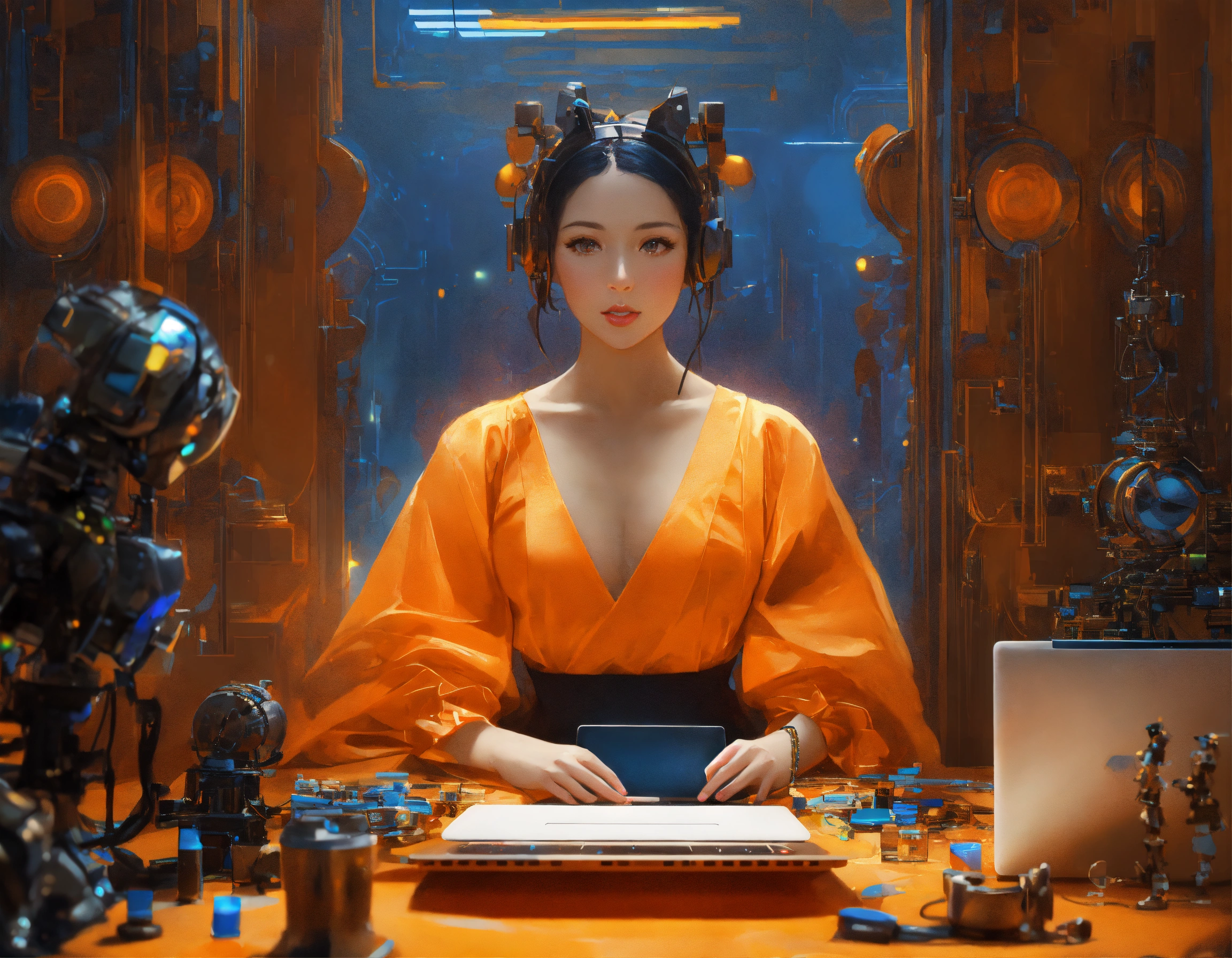The image shows artificial intelligence integrated into a woman sitting at a table with a laptop. the laptop screen displays a chart showing the age distribution of the target audience. the chart has an orange background and blue lines representing different age groups. the background shows people of different ages engaged in different activities. bright explosion of decadent liquid aerosol humanoid art robot, sparkling hyper glossy glow, soft smooth focus, background, soft lighting, high detail, 16k octane rendering, artgerm digital painting masterpiece, by anders zorn, by jean-baptiste monge, perfect composition, centering, symmetry, golden ratio, rule of thirds, bright colors that catch the eye, black, hicolor, hicontrast, extreme brightness