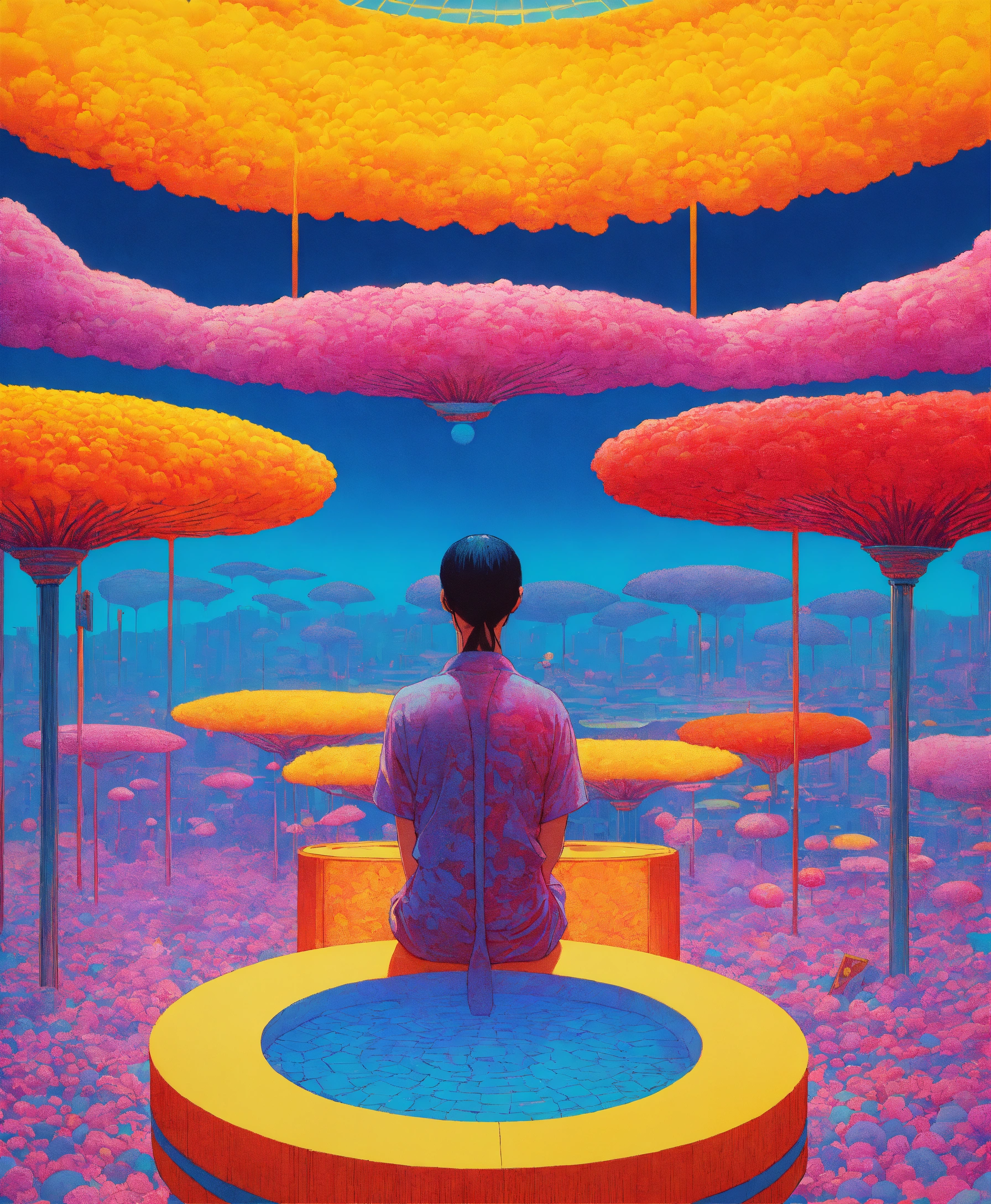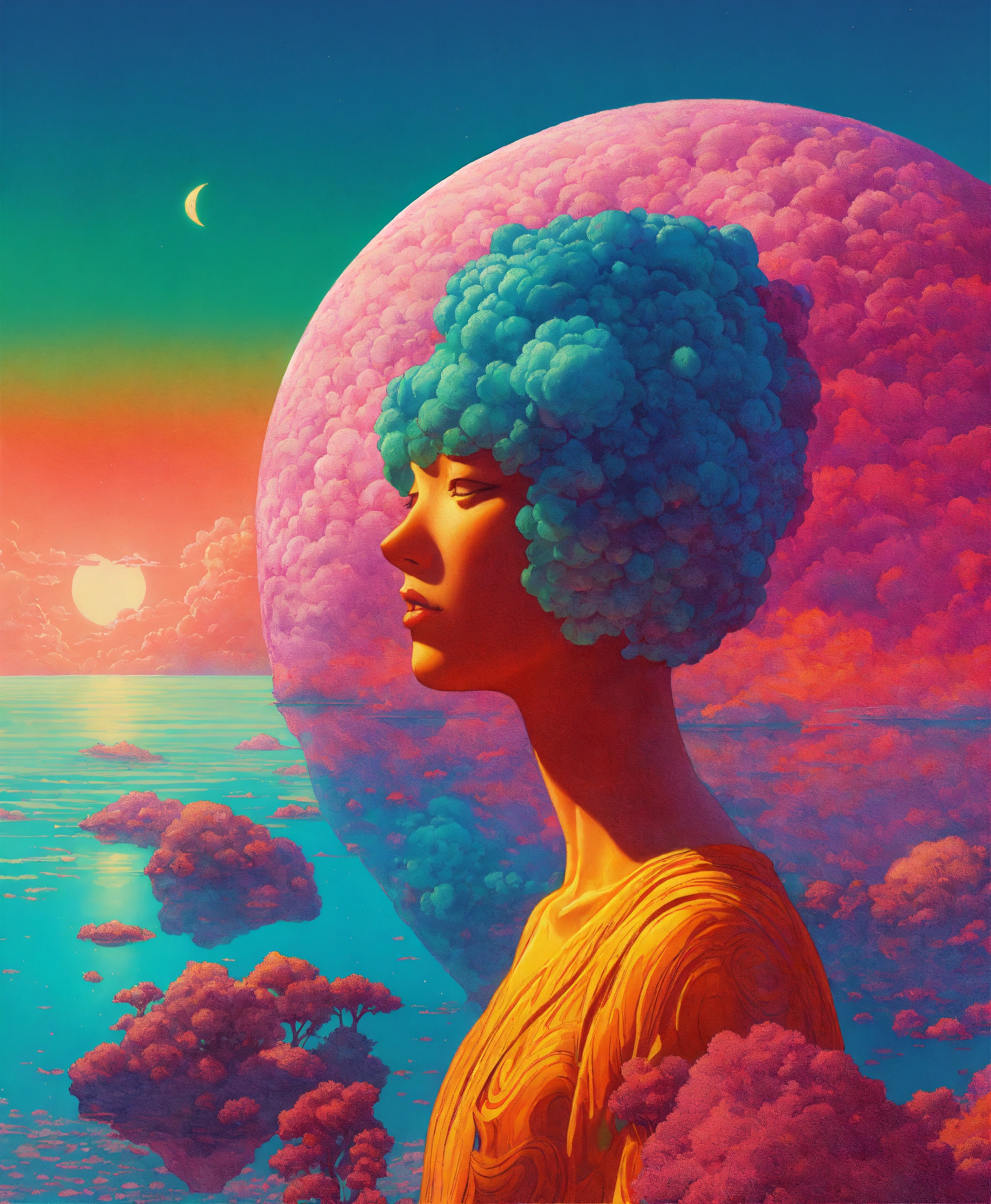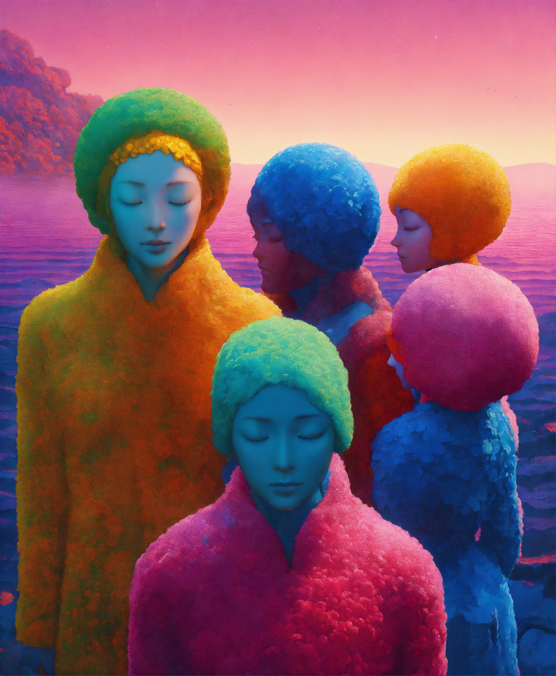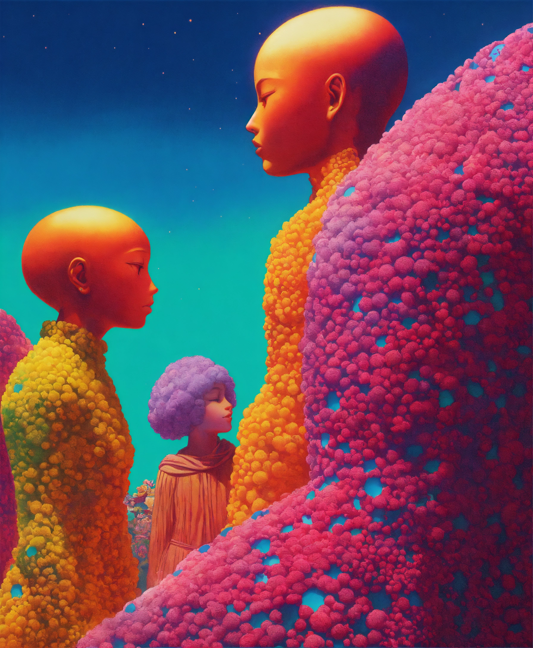 A colorful vibrant closeup portrait of a floating body and dreaming psychedelic hallucinations, a group of figurative sculptures with a hug, by kawase hasui, moebius, edward hopper and james gilleard, zdzislaw beksinski, steven outram colorful flat surreal design, hd, 8k, artstation