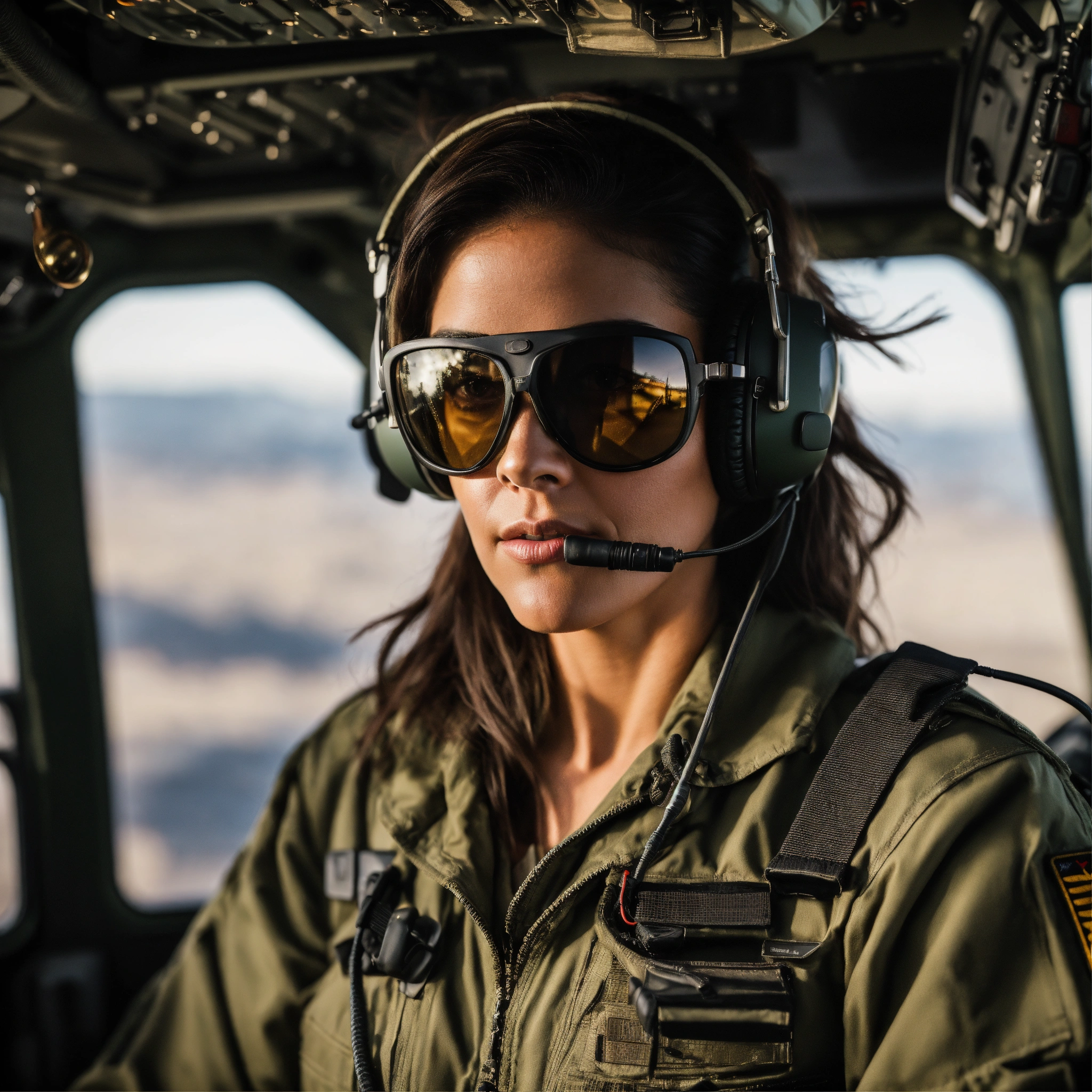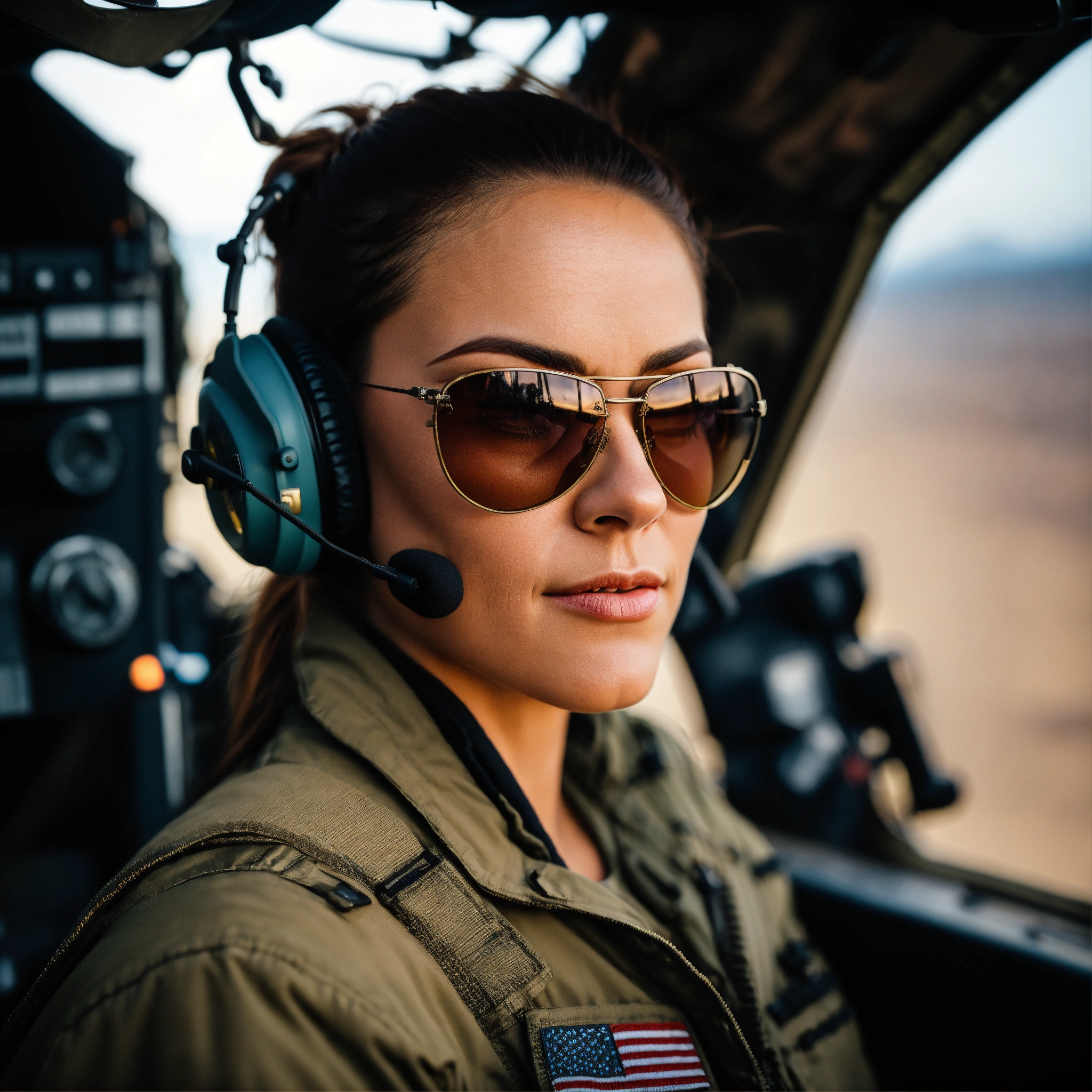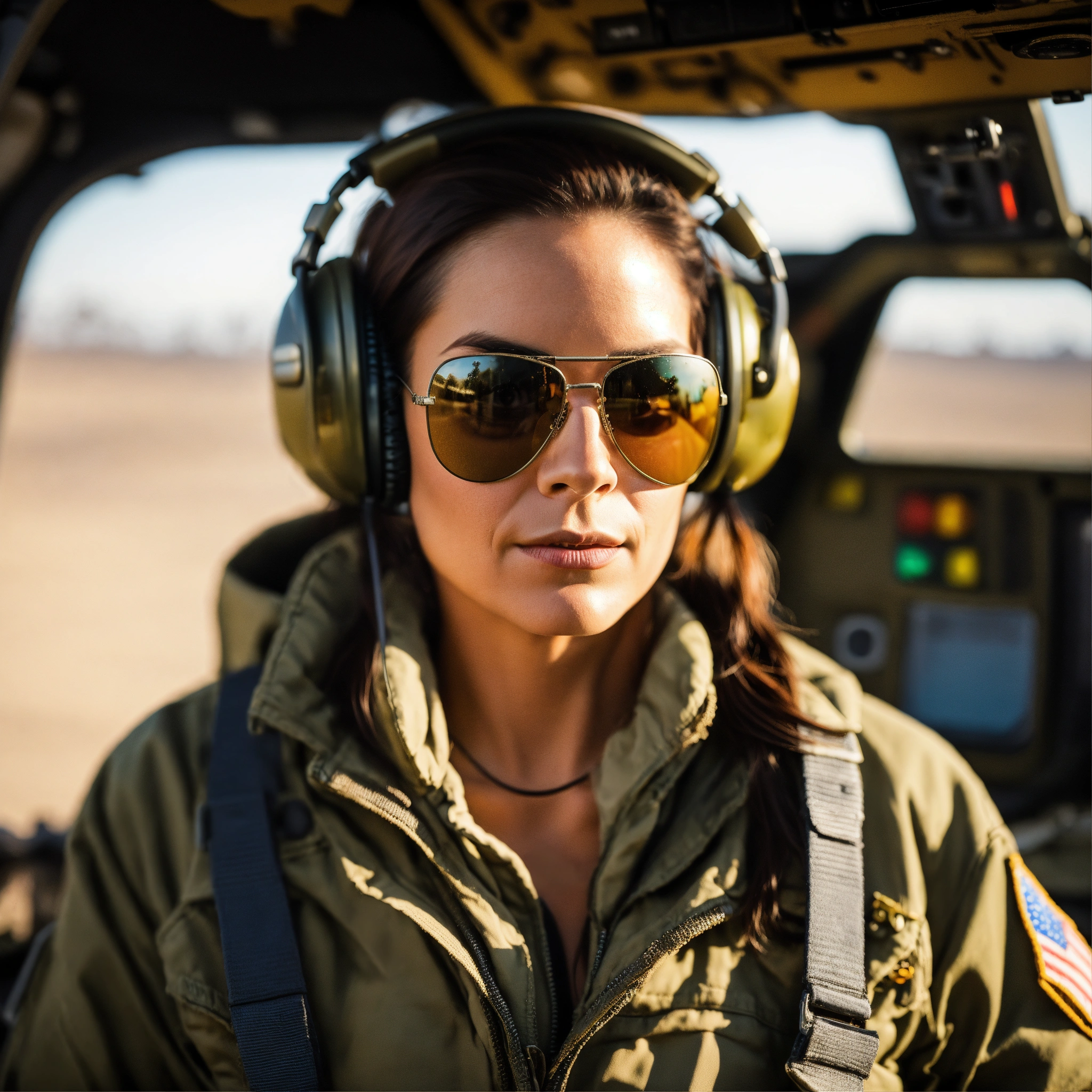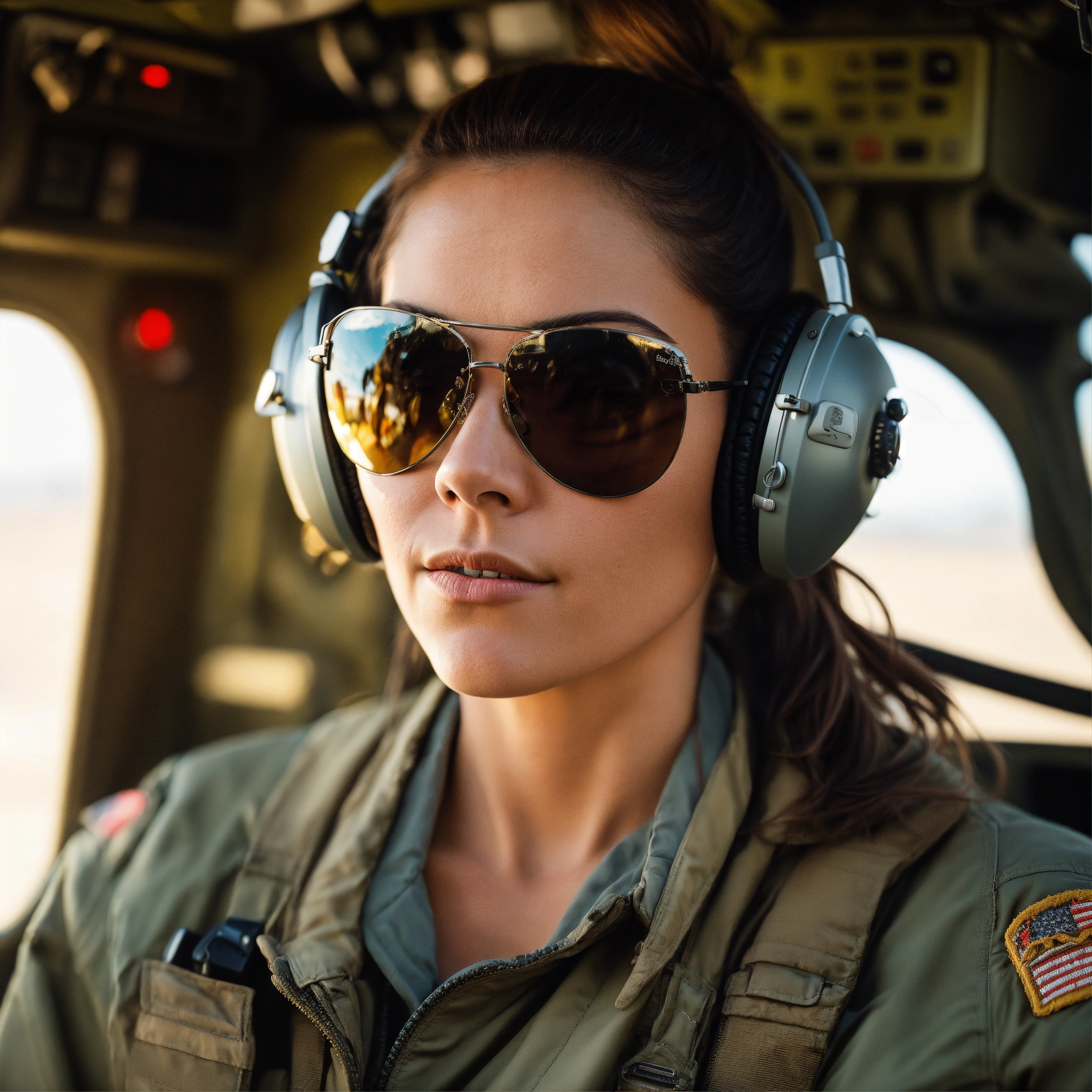 A rugged muscular fit woman in her late thirties with a ponytail and a commanding and focused demeanor, wearing a jacket, a big vintage-inspired boombox headset and classic wayfarer sunglasses. us air force helicopter pilot, portrait inside of an apache gunship with head turned towards the camera.
