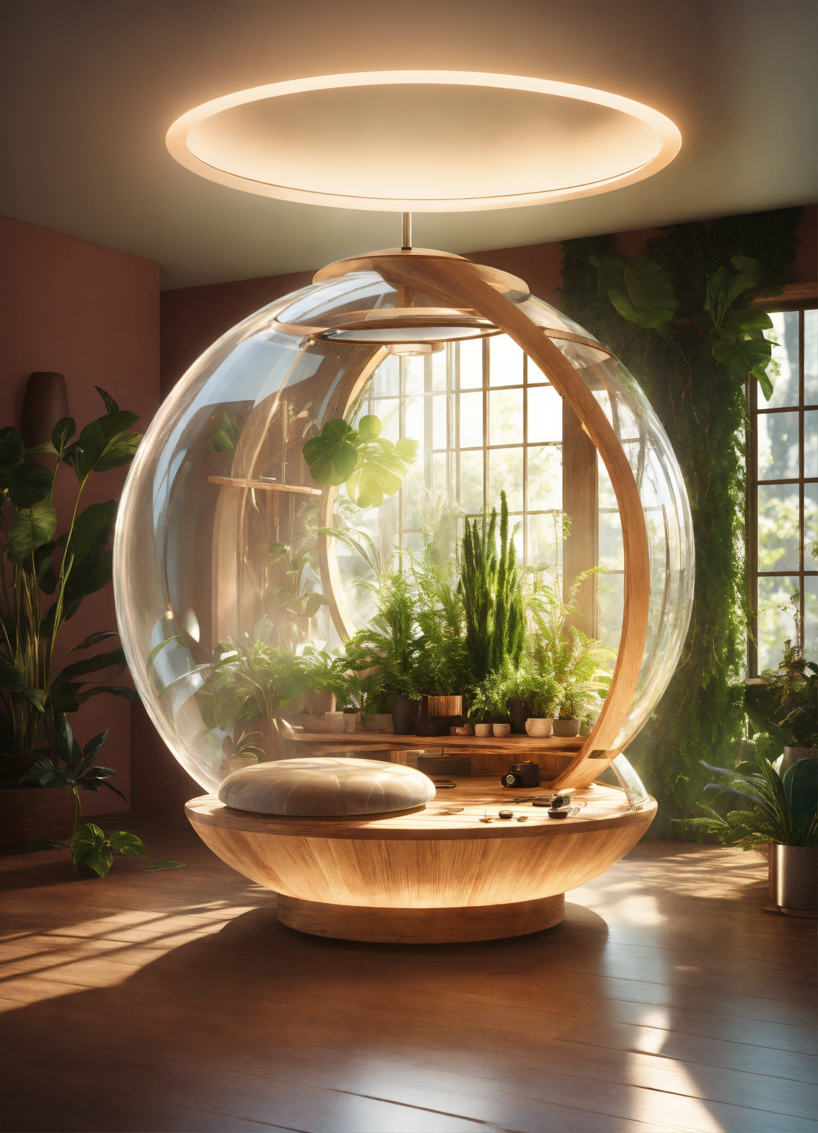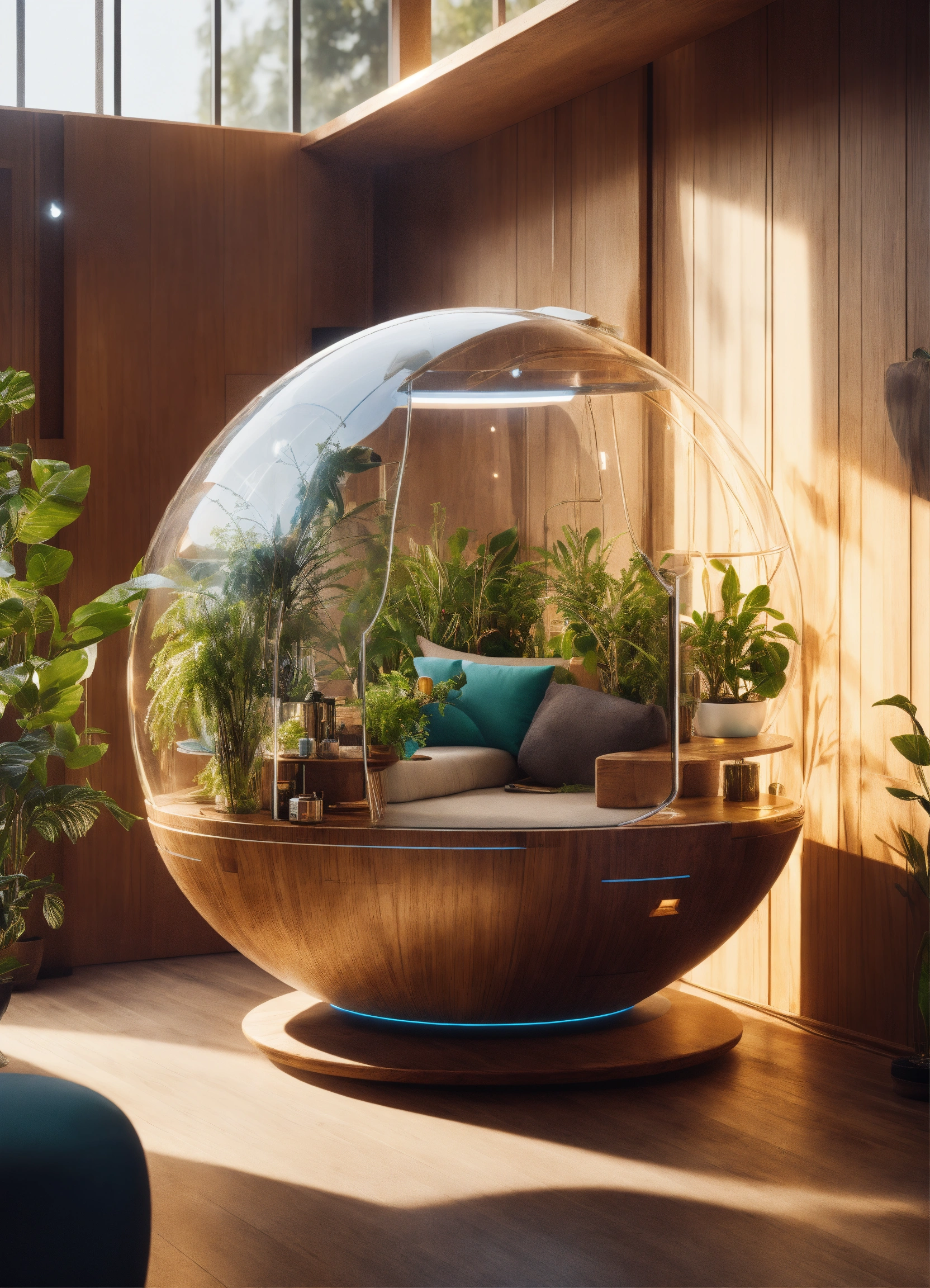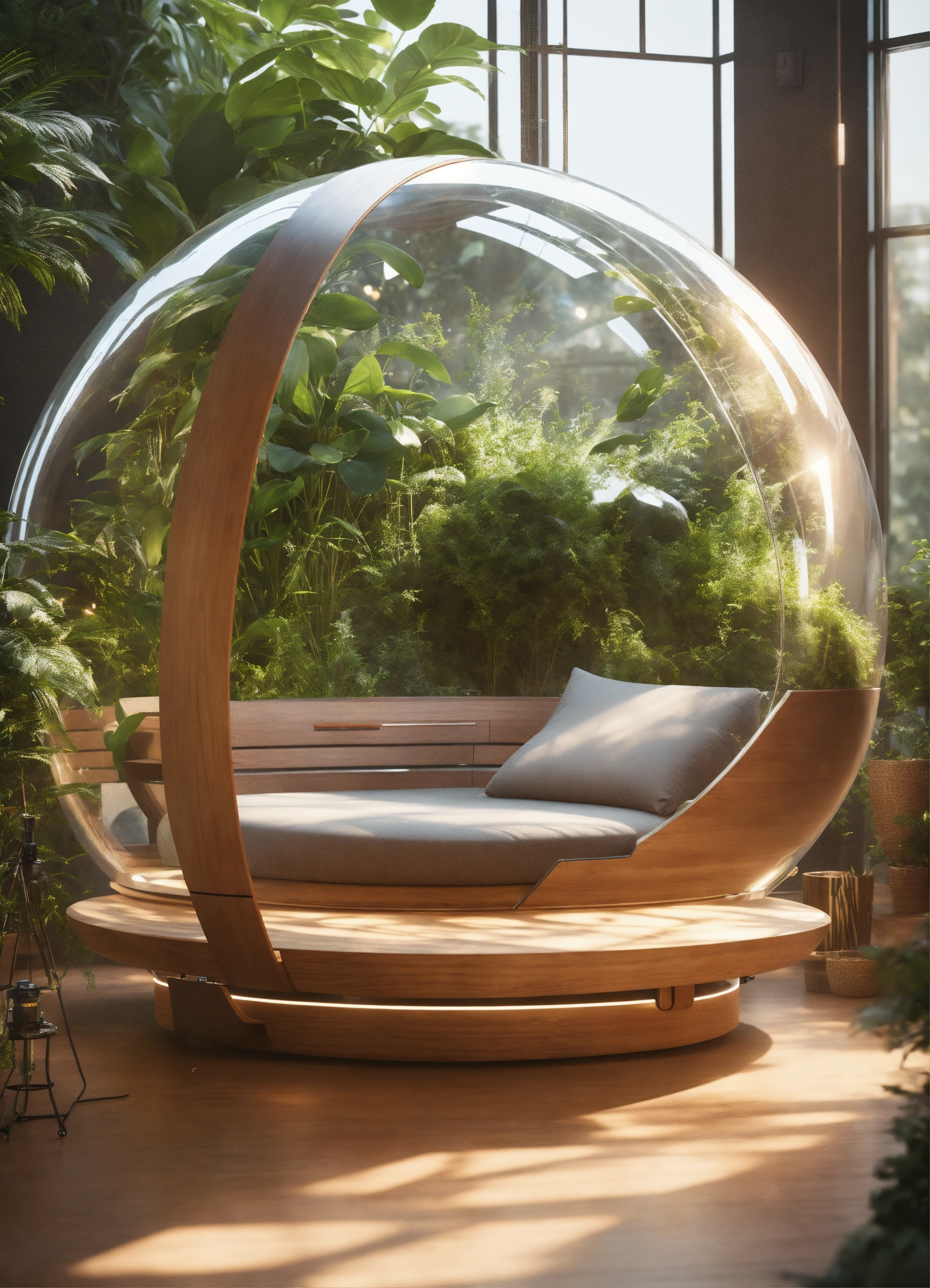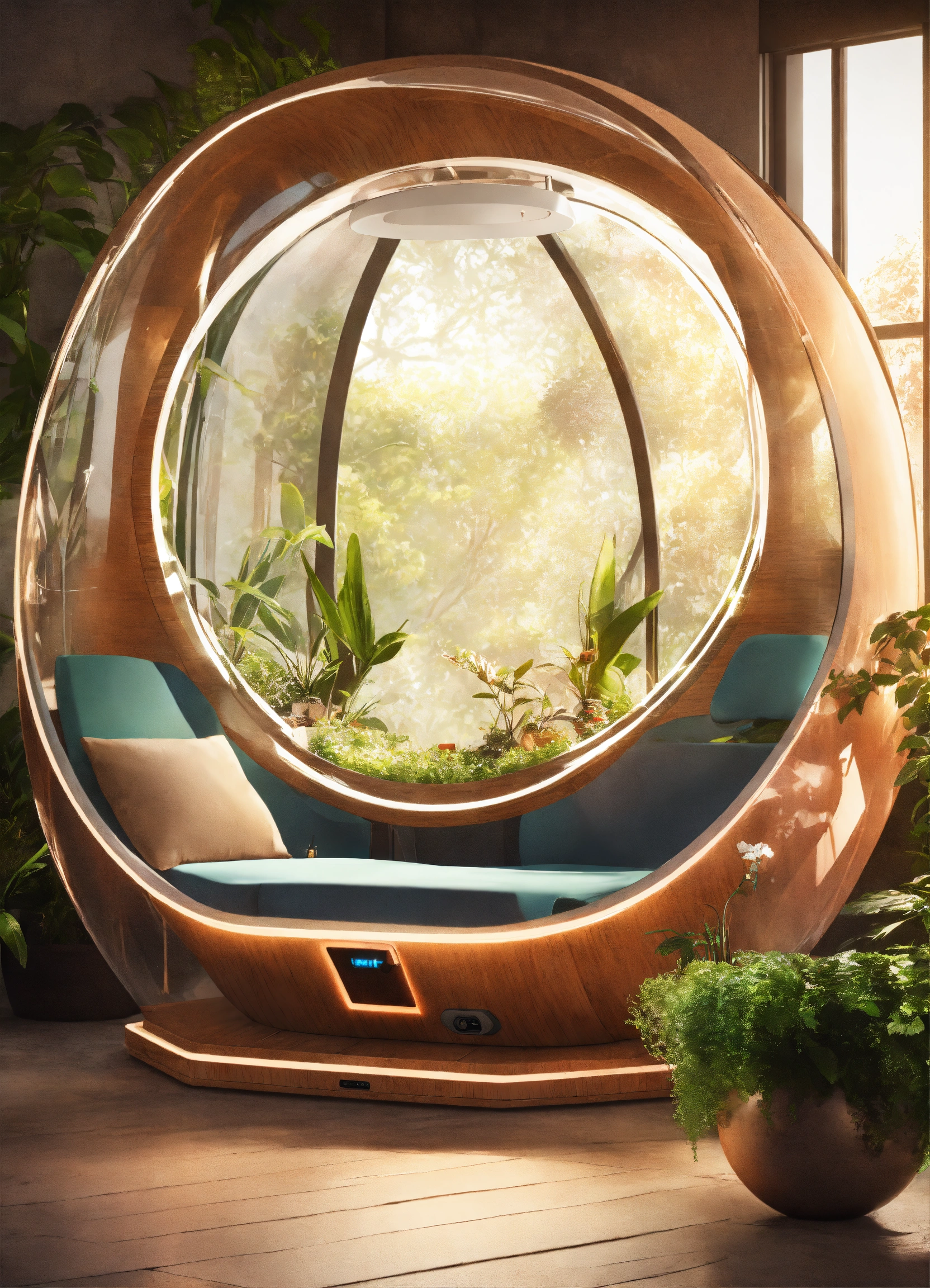 Futuristic sci-fi relax pod, flat design, product-view, editorial photography, transparent orb, product photography, natural lighting, plants, natural daytime lighting, zbrush, 8k, natural wooden environment