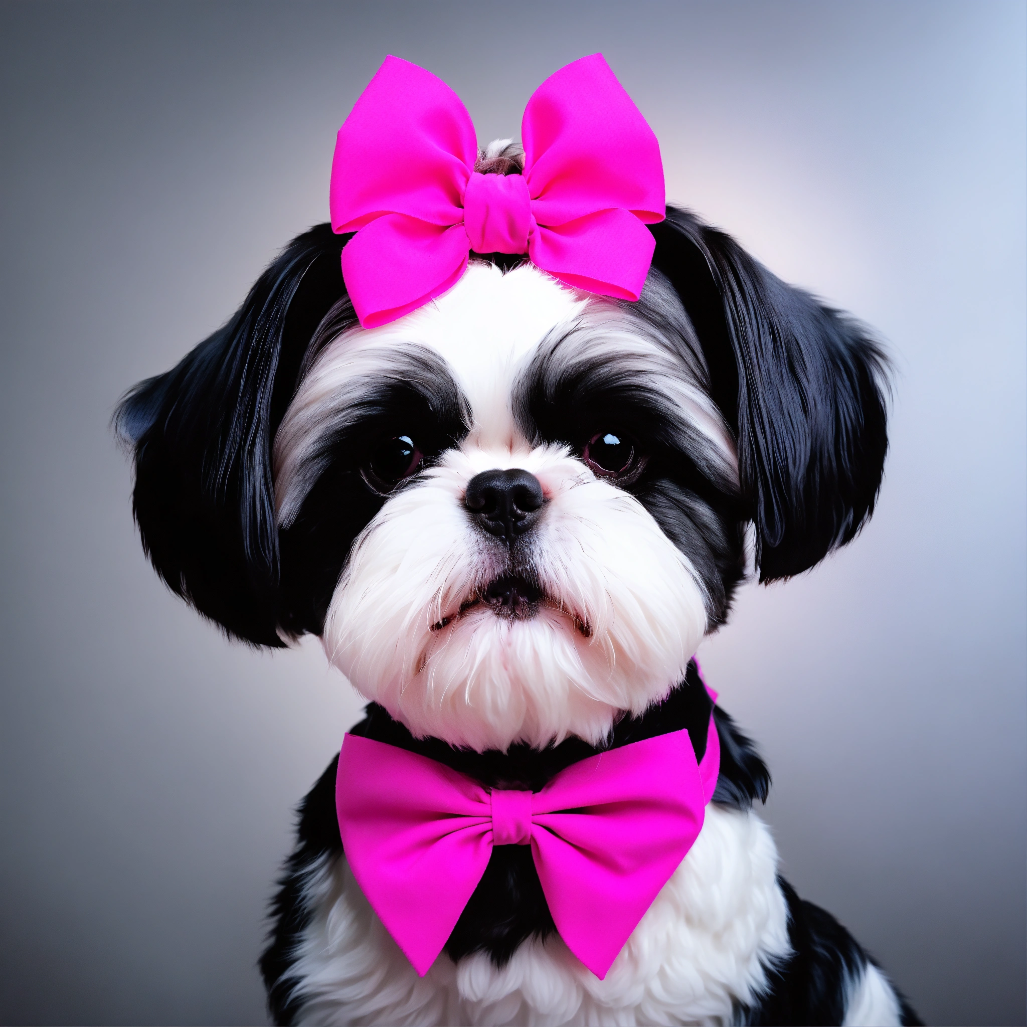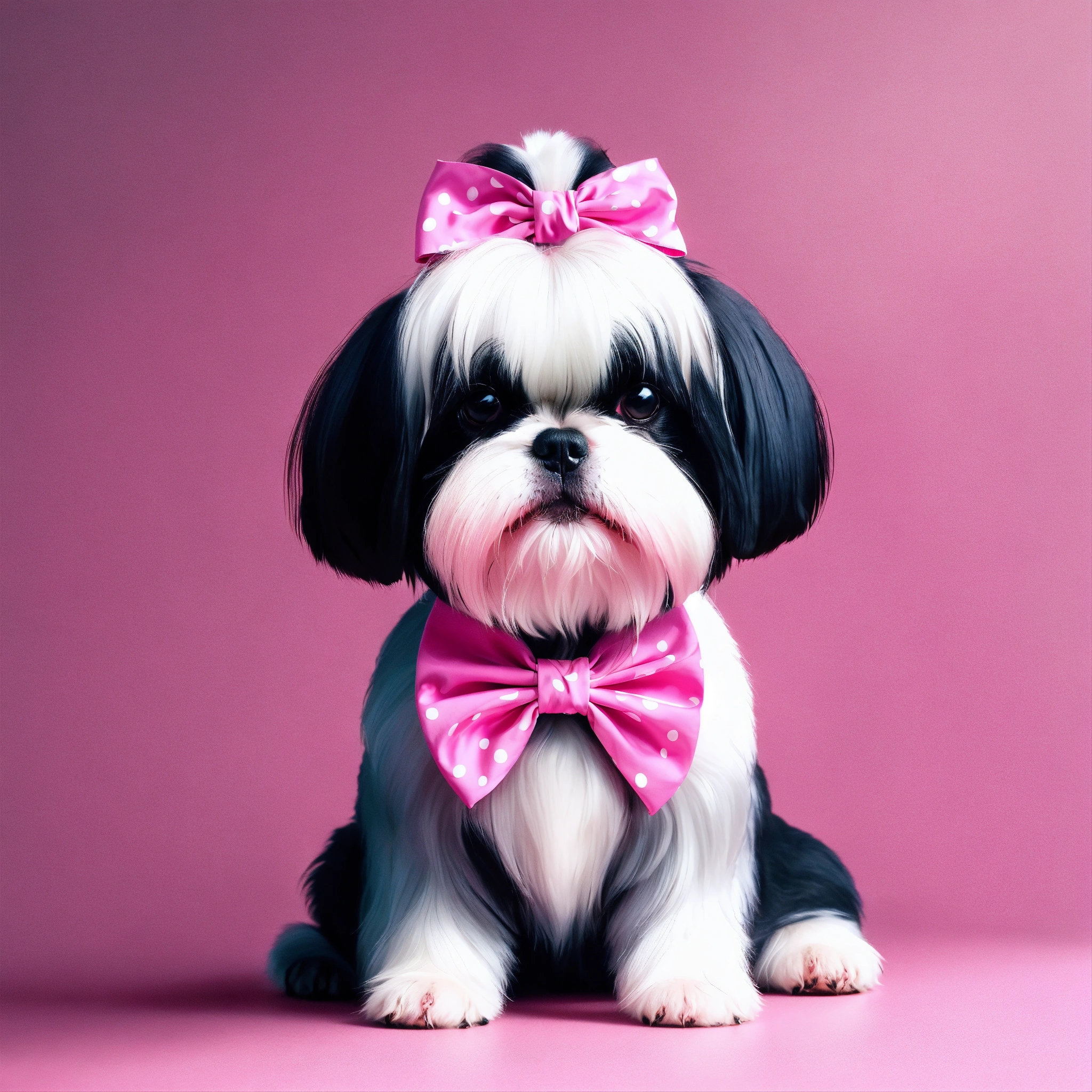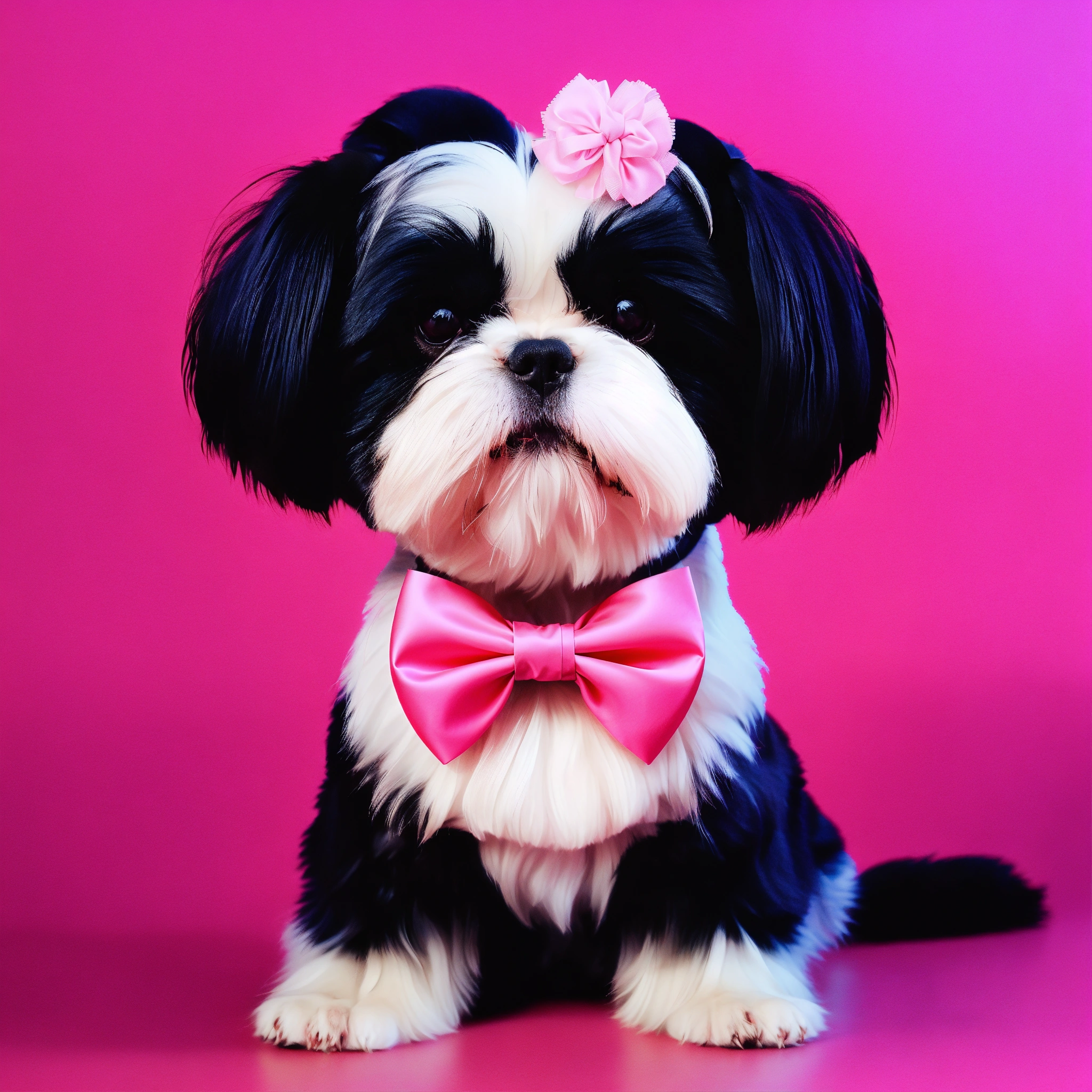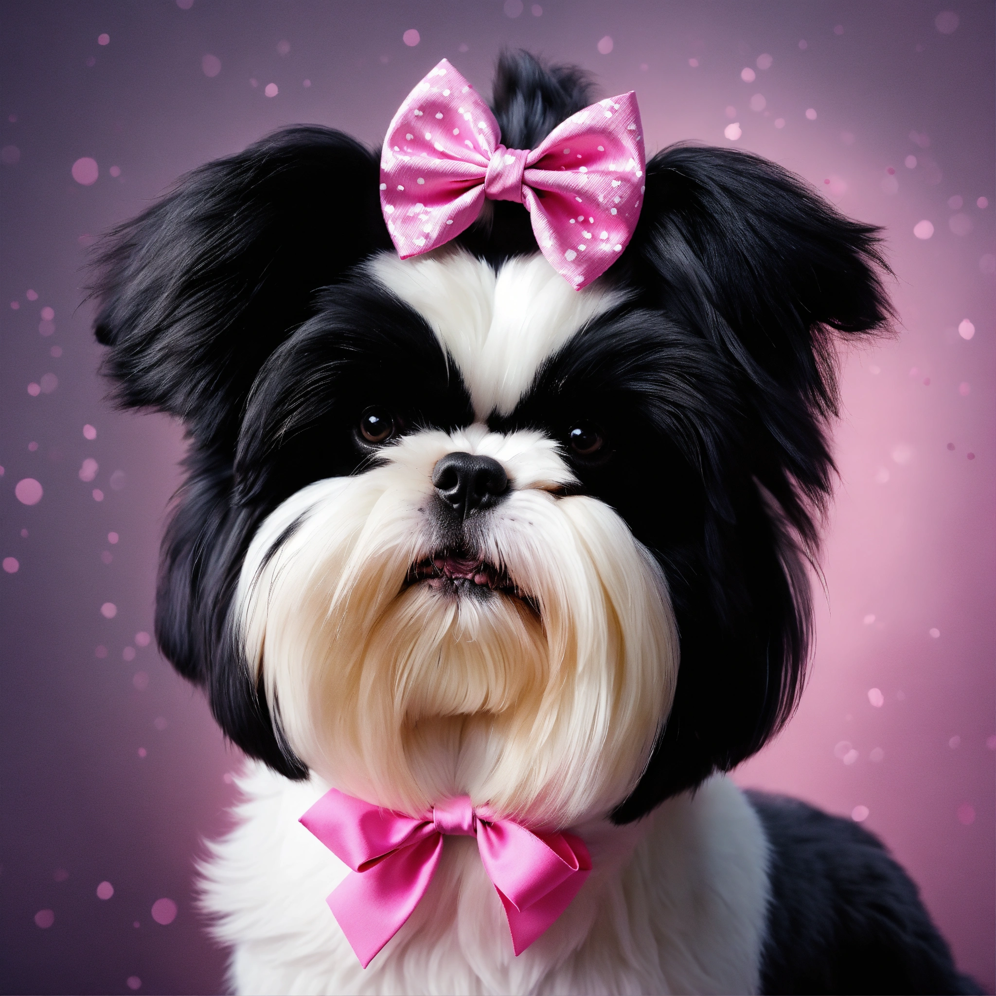 Black and white shi tzu dog with hair in top knot with pink bow on head. tiny pink paw floating in background super cute, studio lighting, digital art, 3d art, cartoon