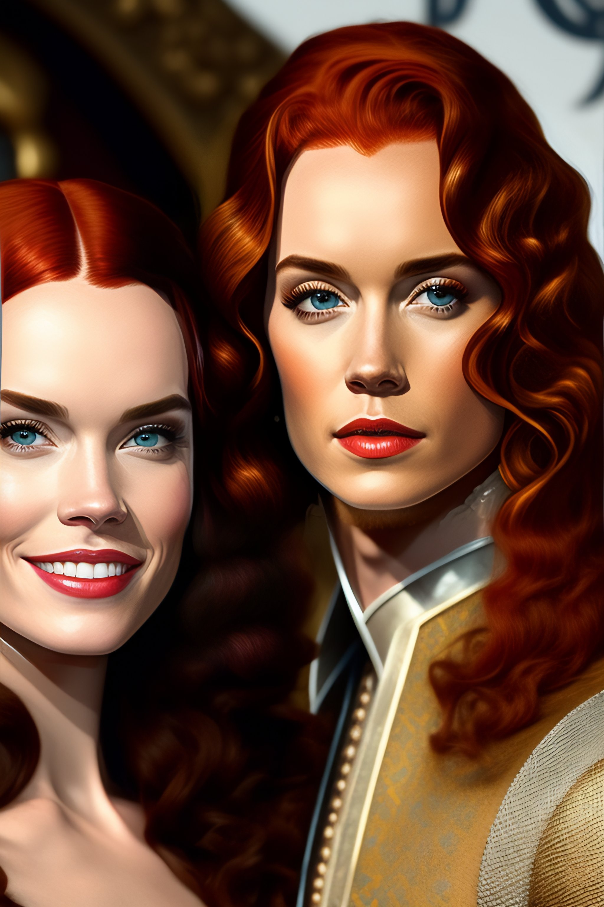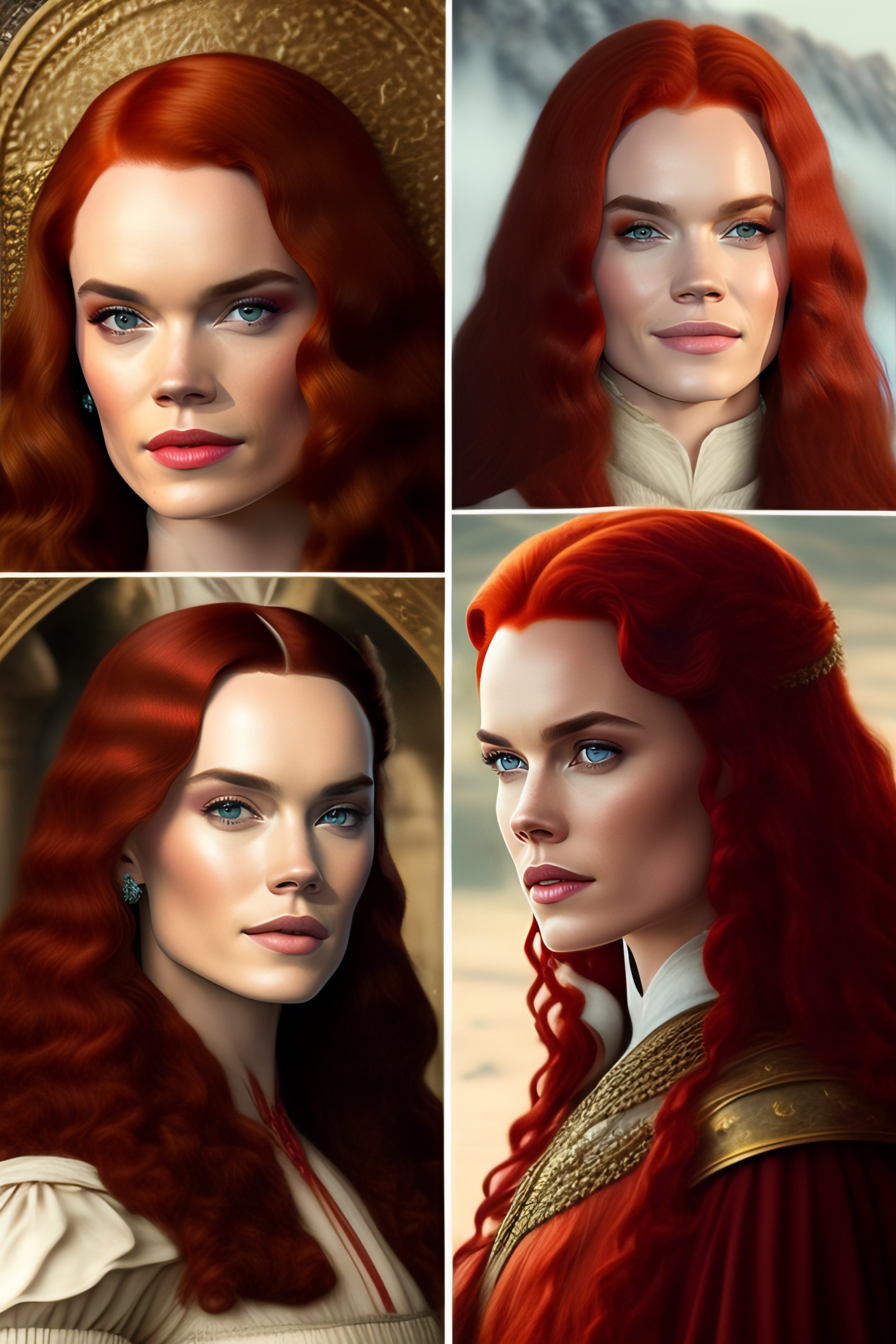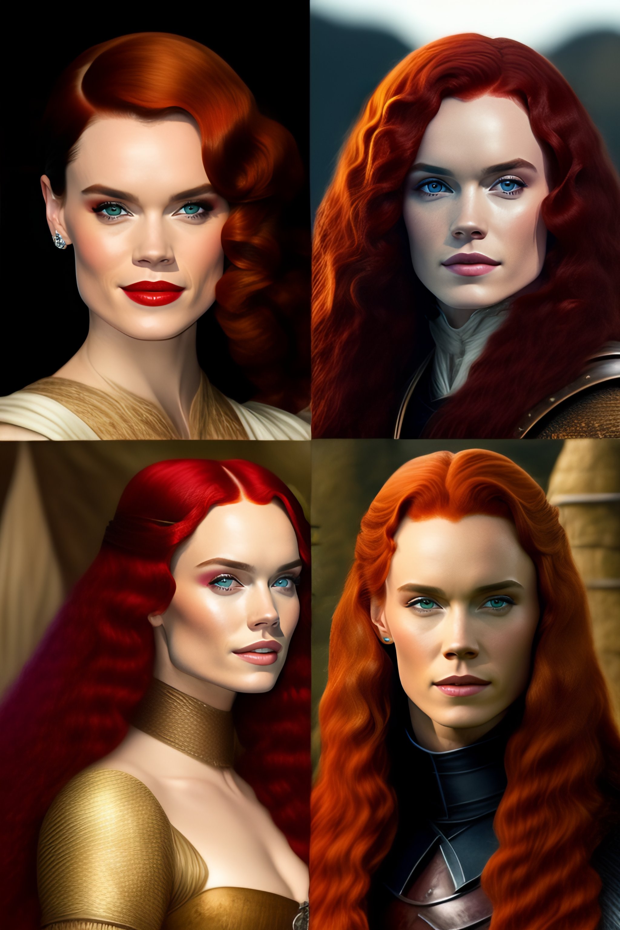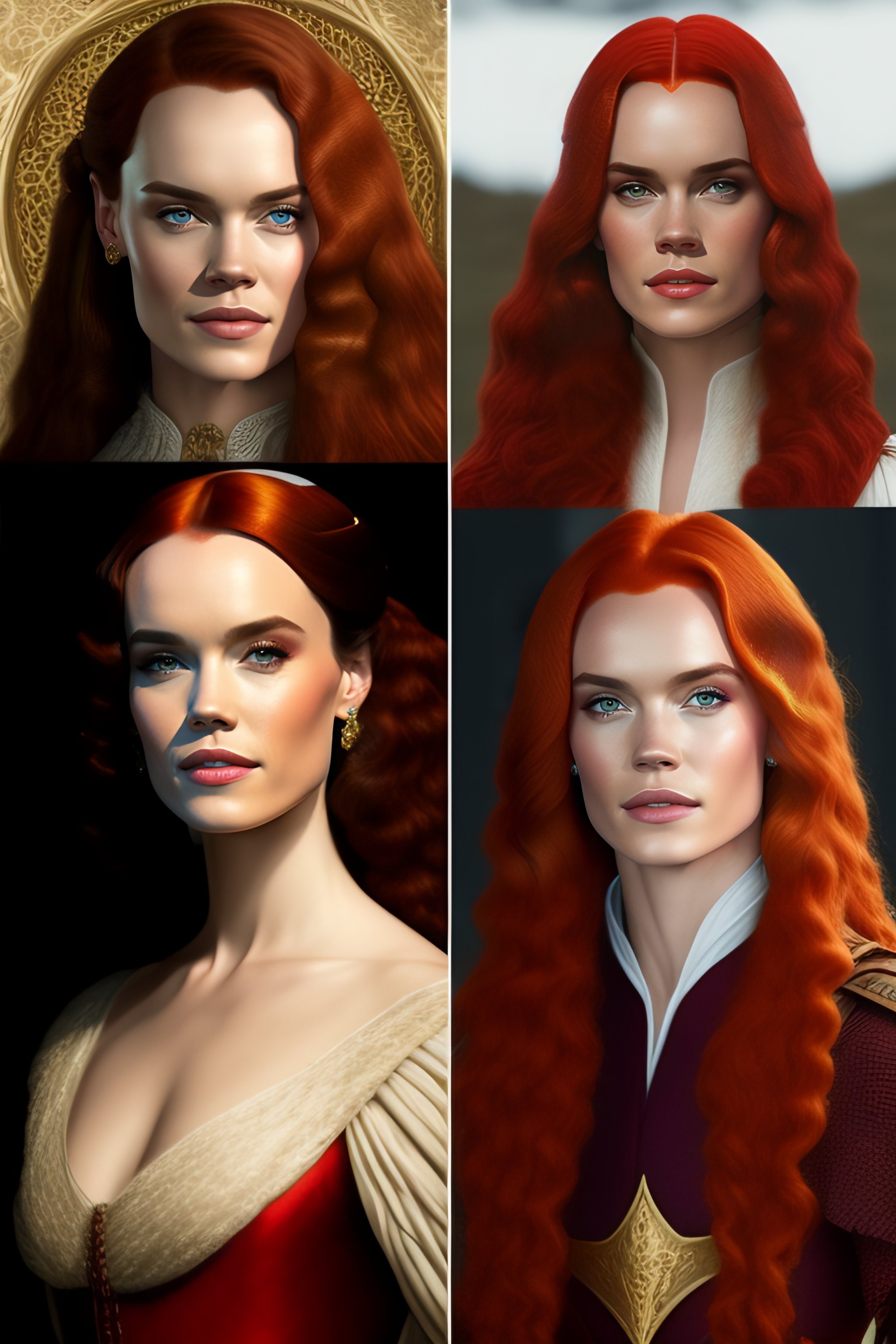 Tom hiddleston and daisy ridley with long red hair in medieval style
