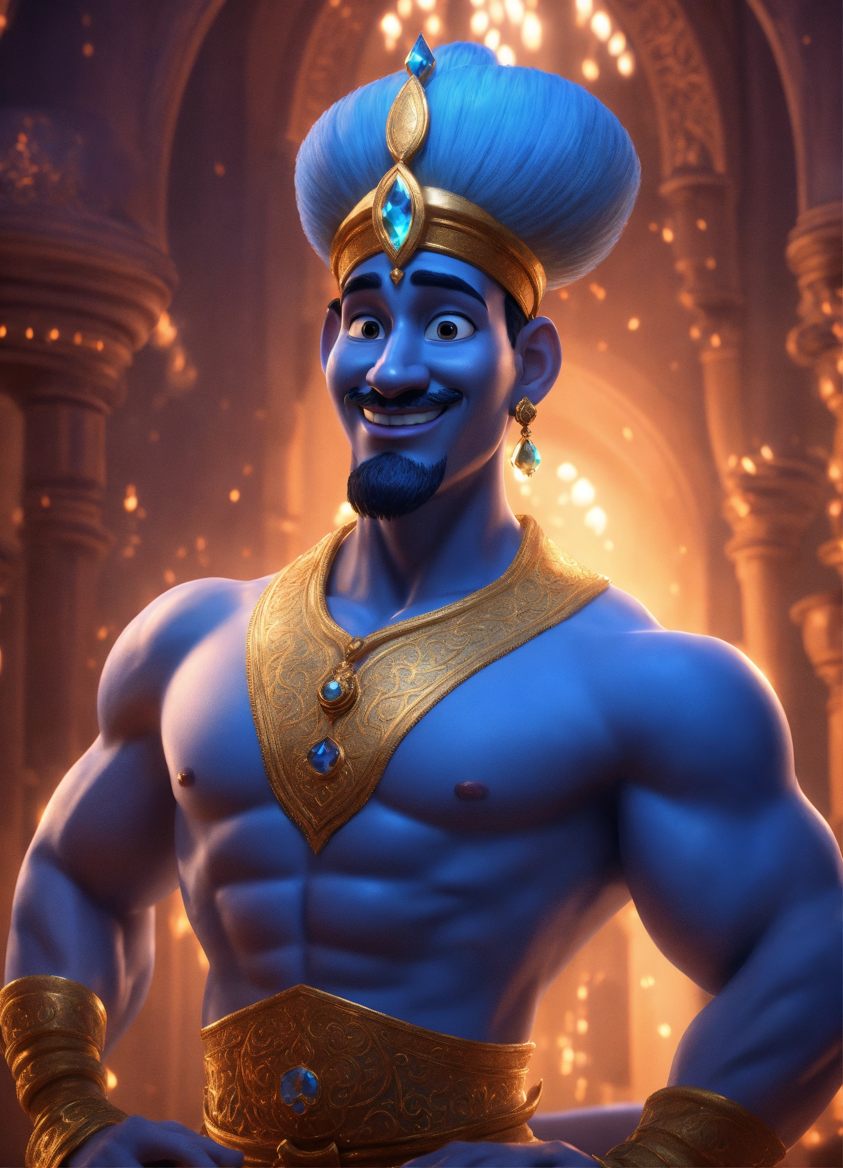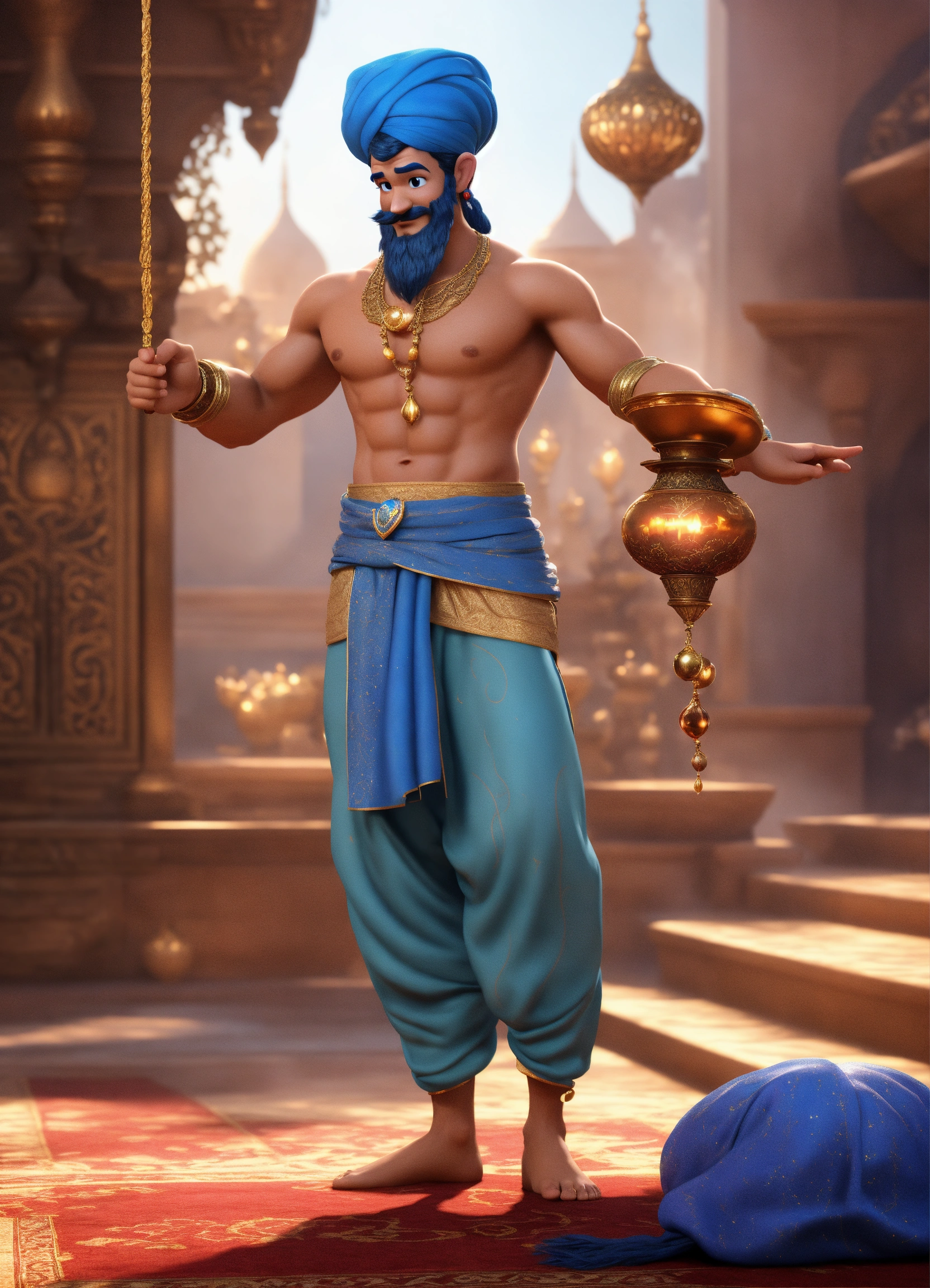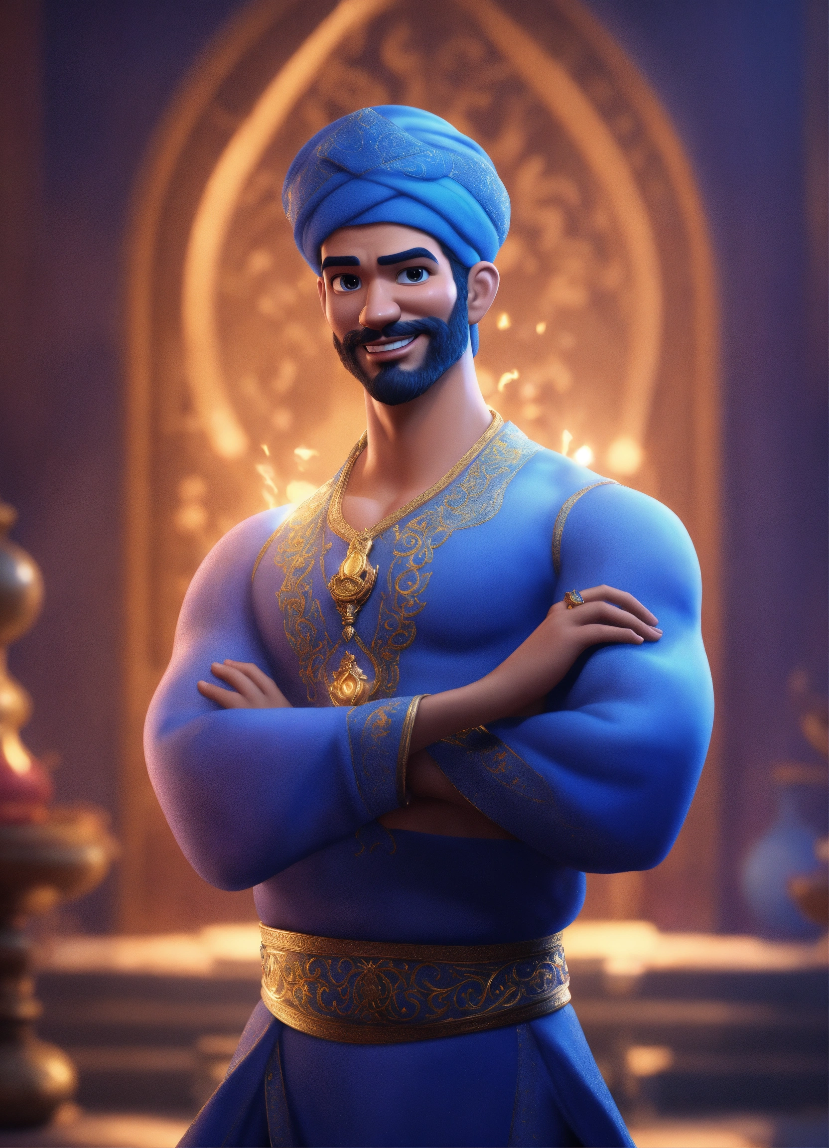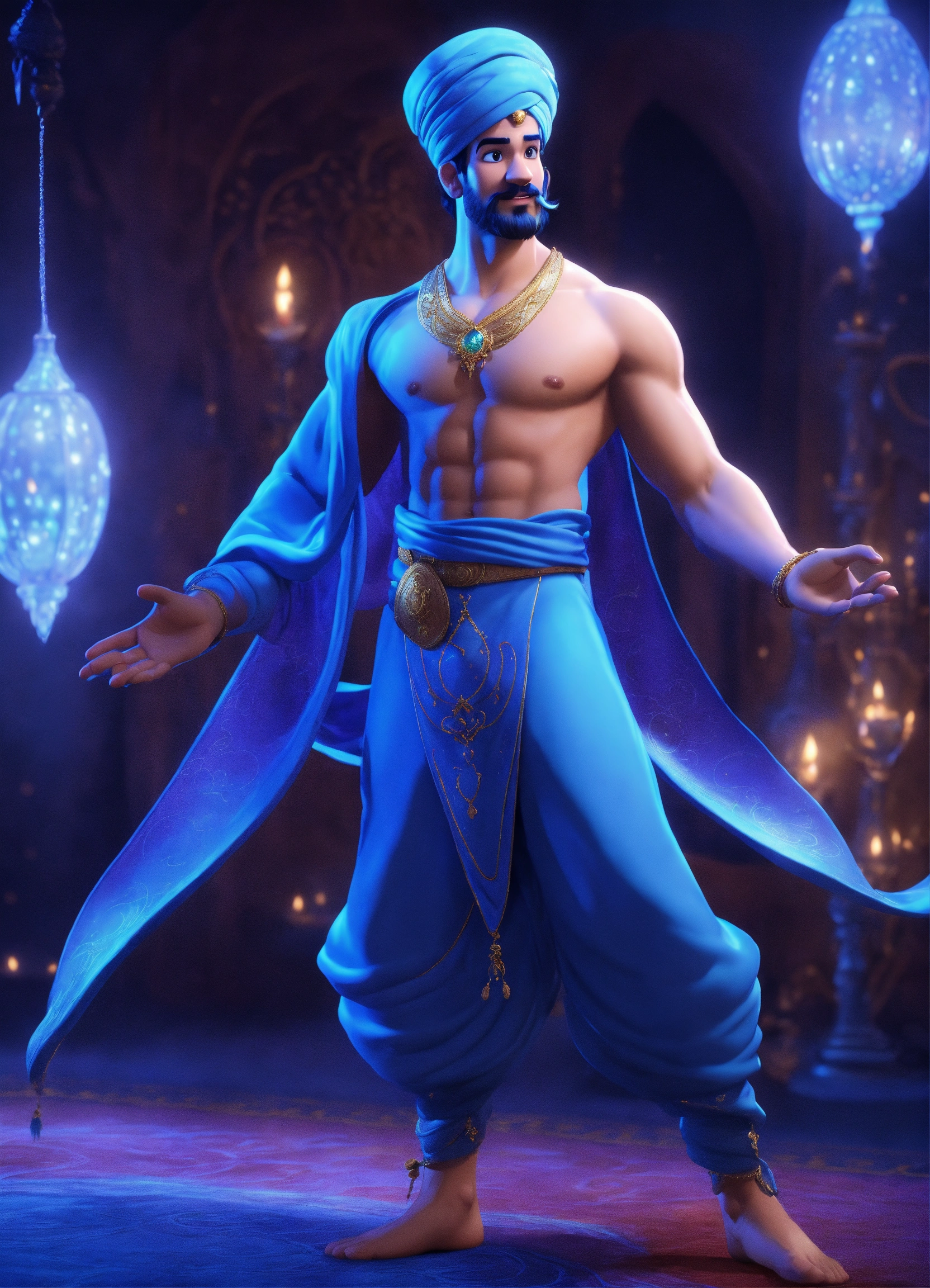 Create a 3d rendering of a magical blue arabian male genie inspired by the disney animation style. the genie must have blue skin, a playful but wise personality, and the ability to float or fly. place your character in the atmosphere of arabian nights and aladdin. the image must be in high resolution format. dynamic pose from the waist up, the genie casts a spell with his hands, below the waist he is like smoke (pixar art style)++ highly detailed digital painting, art stations, concept art, soft focus, hard focus, illustrations. cinematic, visual effects, hdr, unreal engine 5, ray tracing, soft light, 8k, high detail, sparkling backlighting, luxury gem, game art, 3d, cartoon, colorful, magical, mysterious