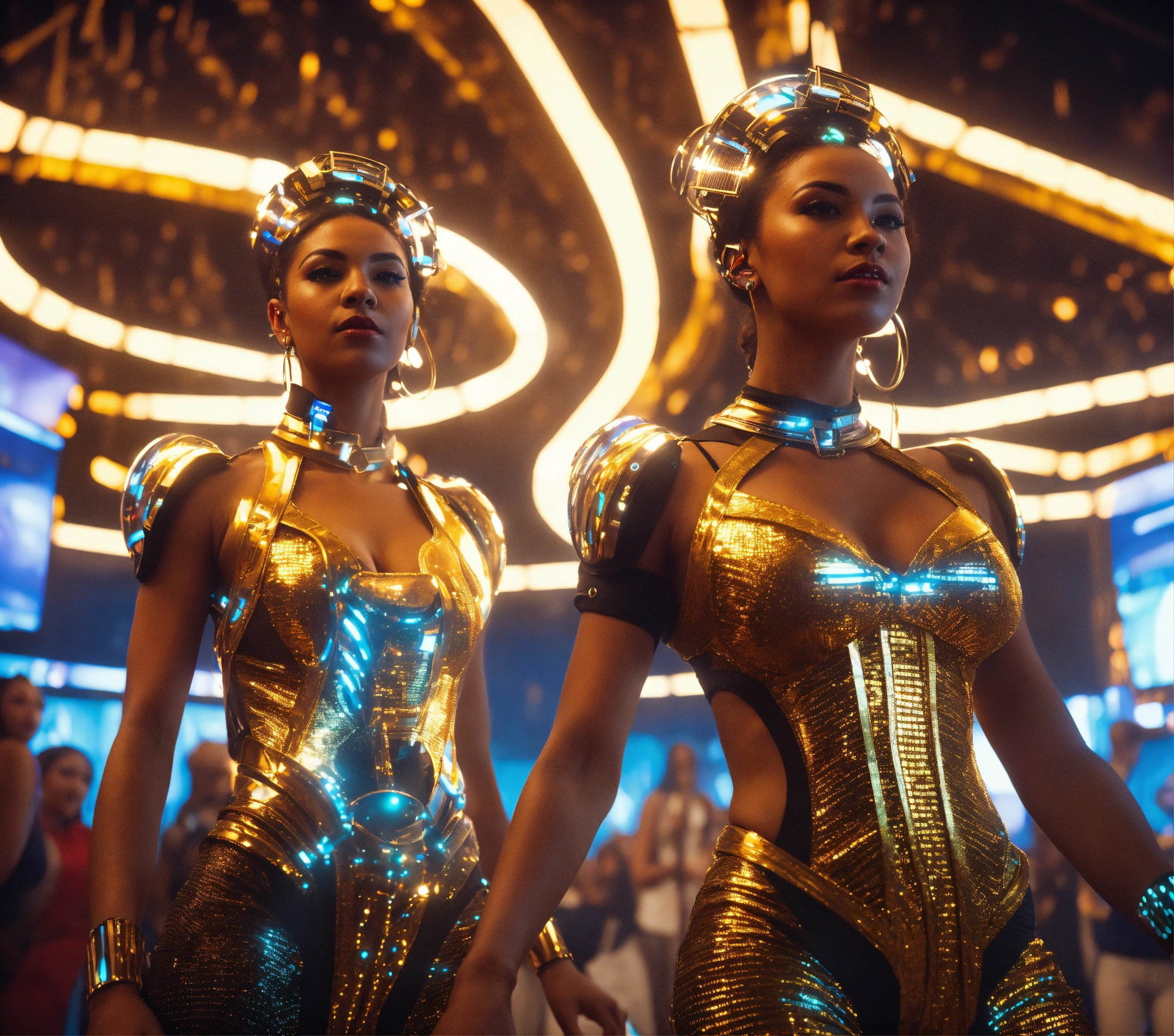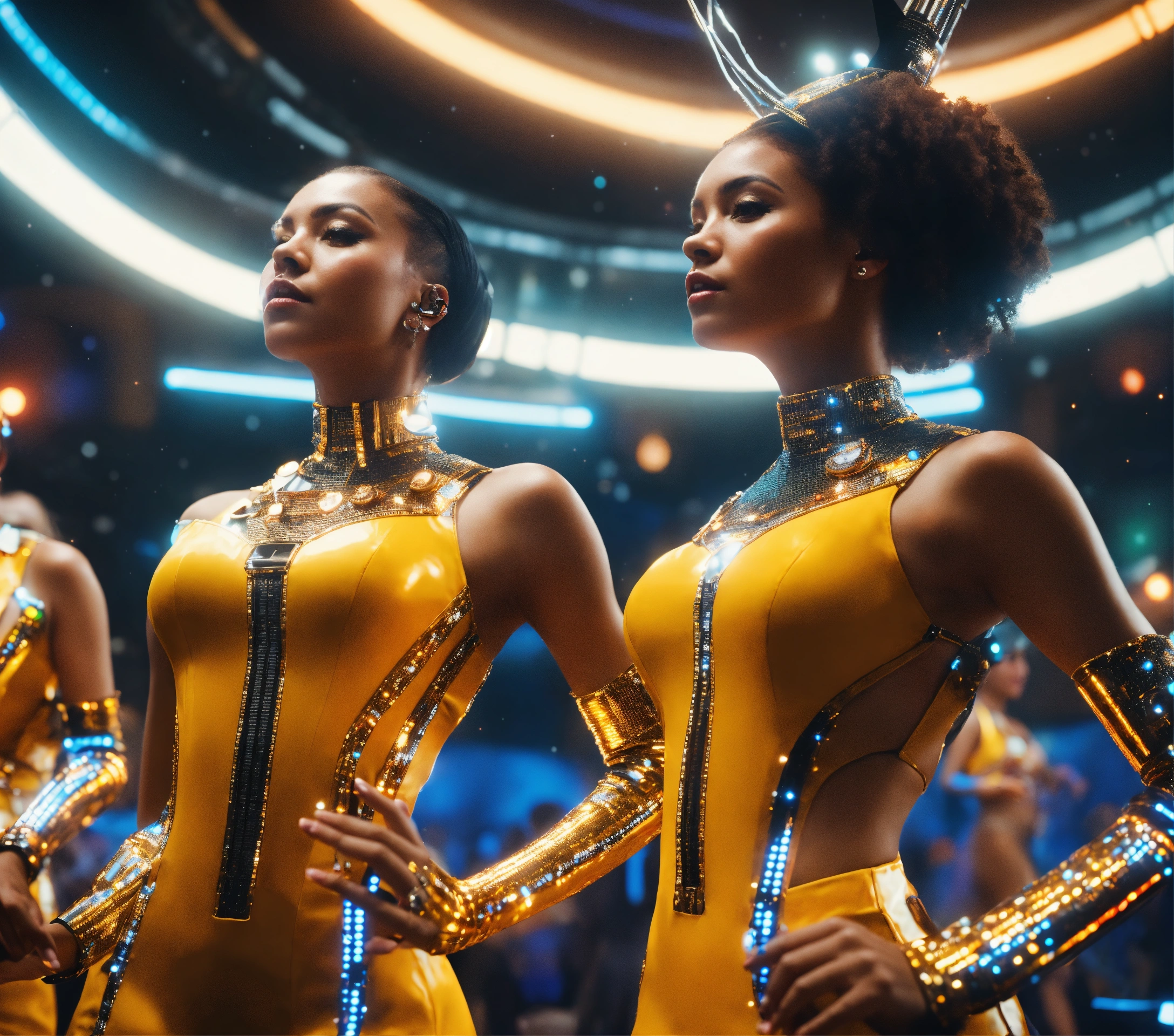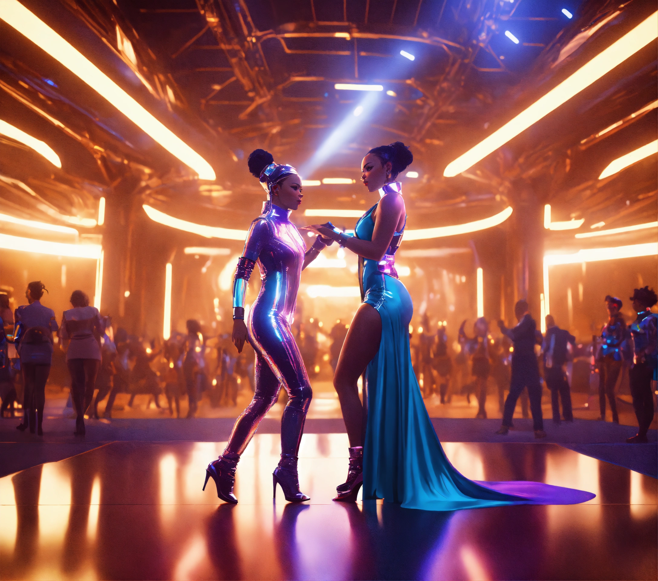 2 beautiful women in funky futuristic royal attire dance to music at a packed jazz concert on a spaceport, realistic, futuristic, sci fi, 8k, unreal engine, analog controls