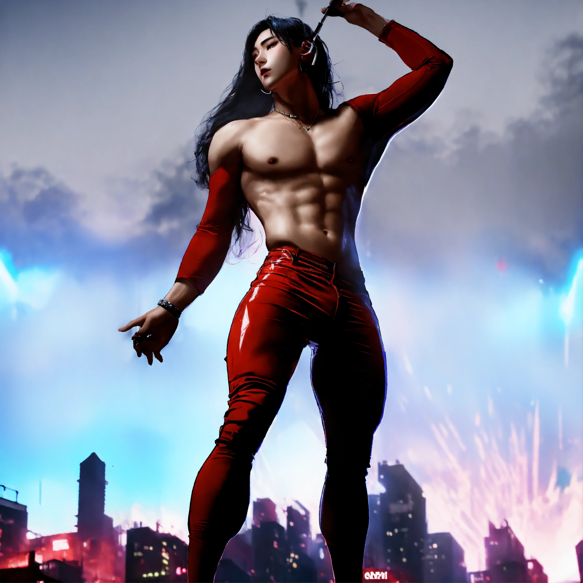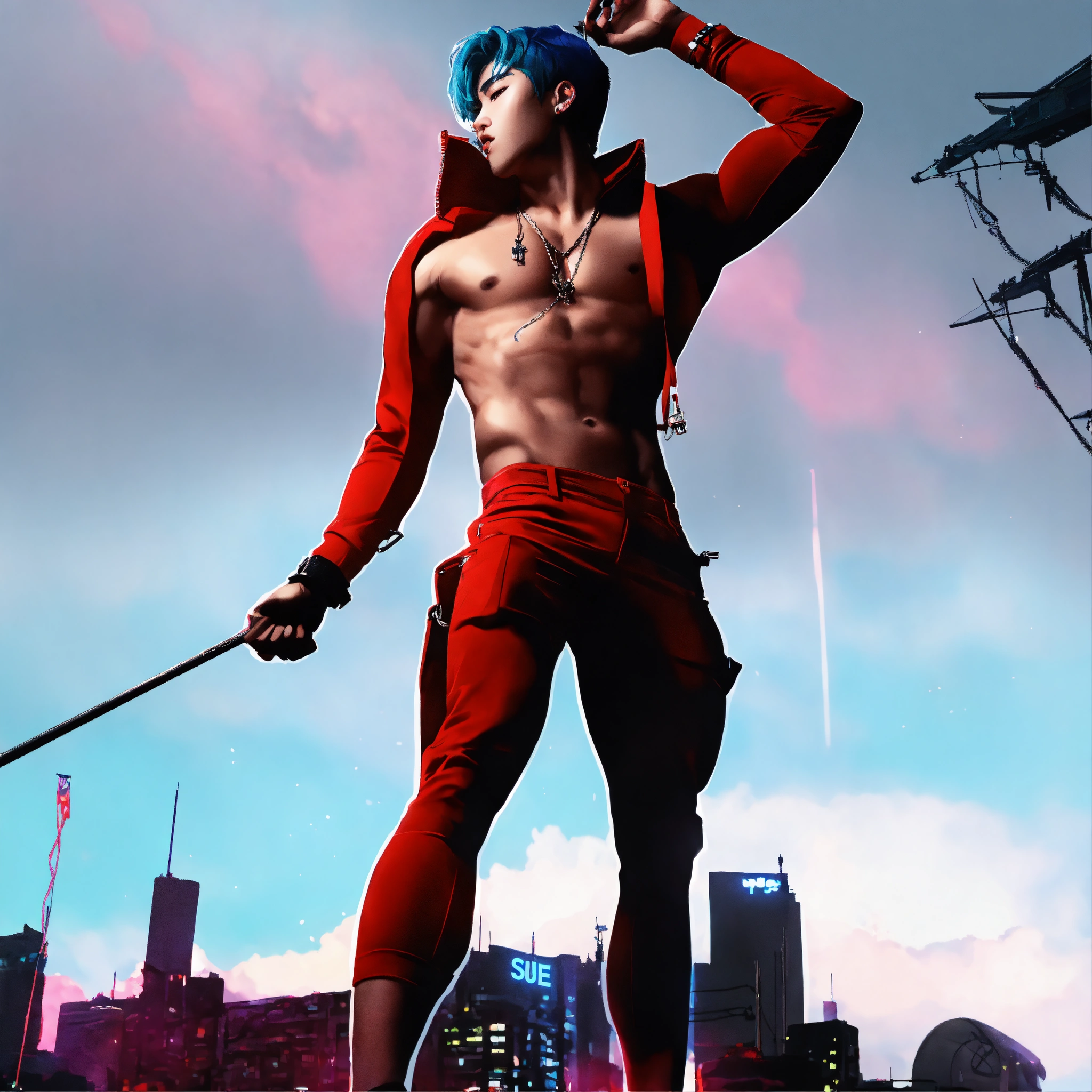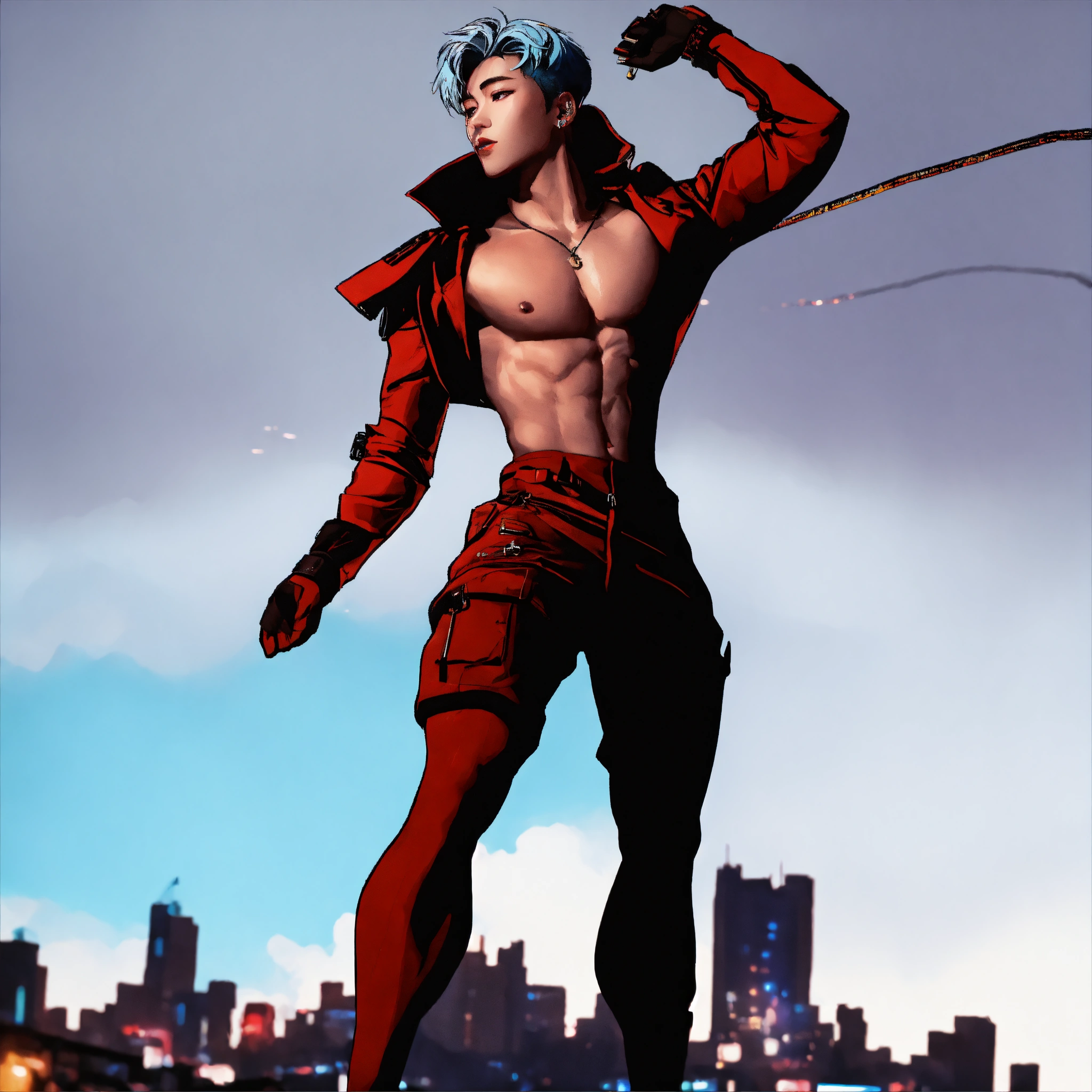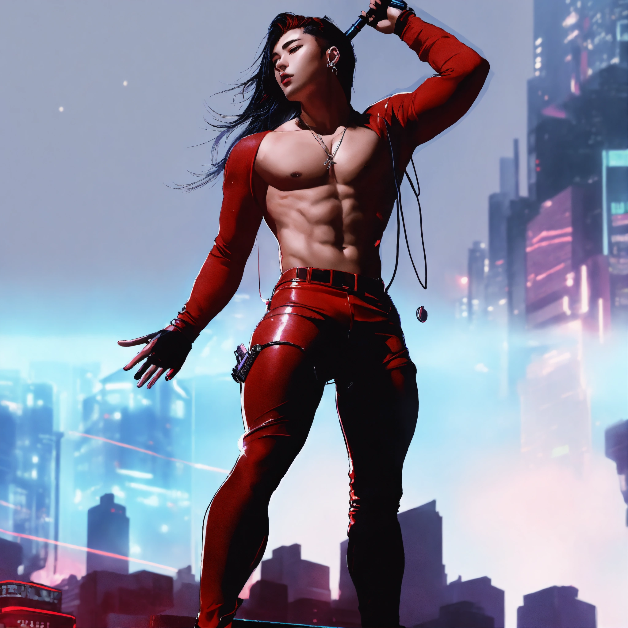 Pin-up poster of fit south korean pop idol wonho wearing a blank red t-shirt in a cyberpunk cityscape, dark fantasy steamy atmosphere, dramatic lighting, colorful neon