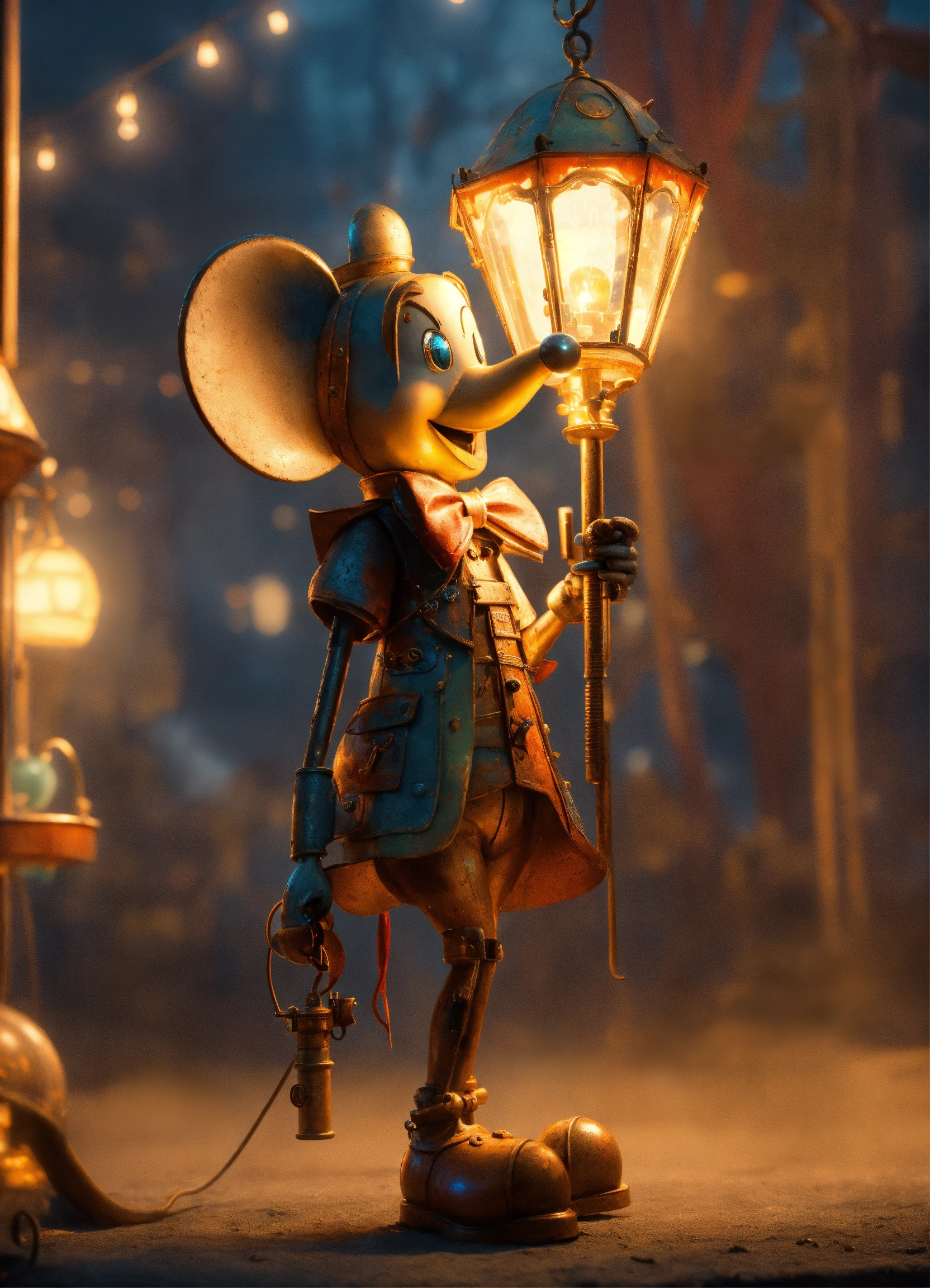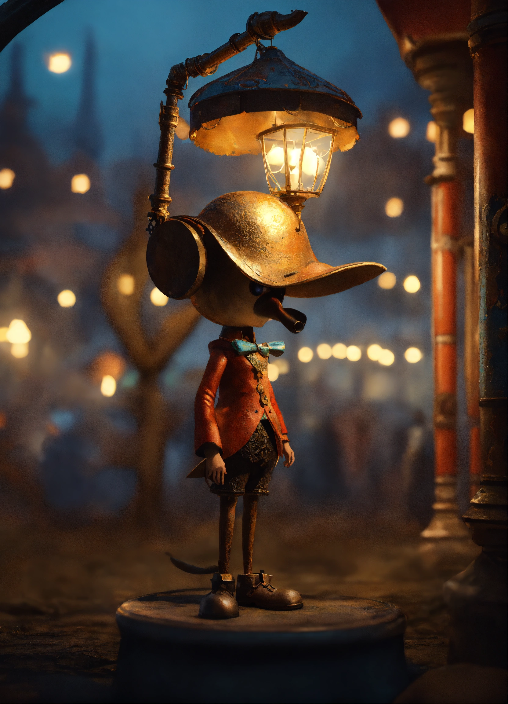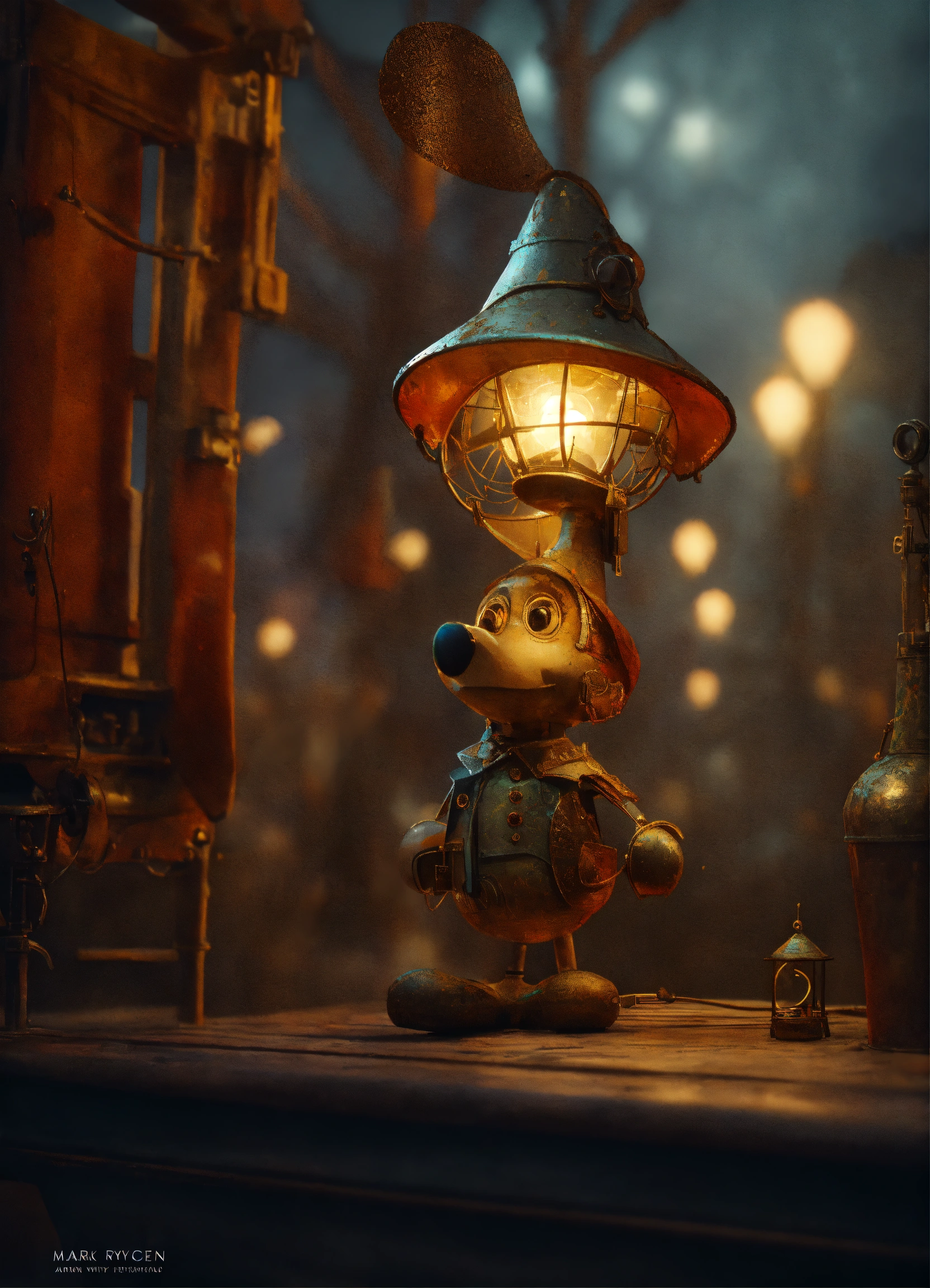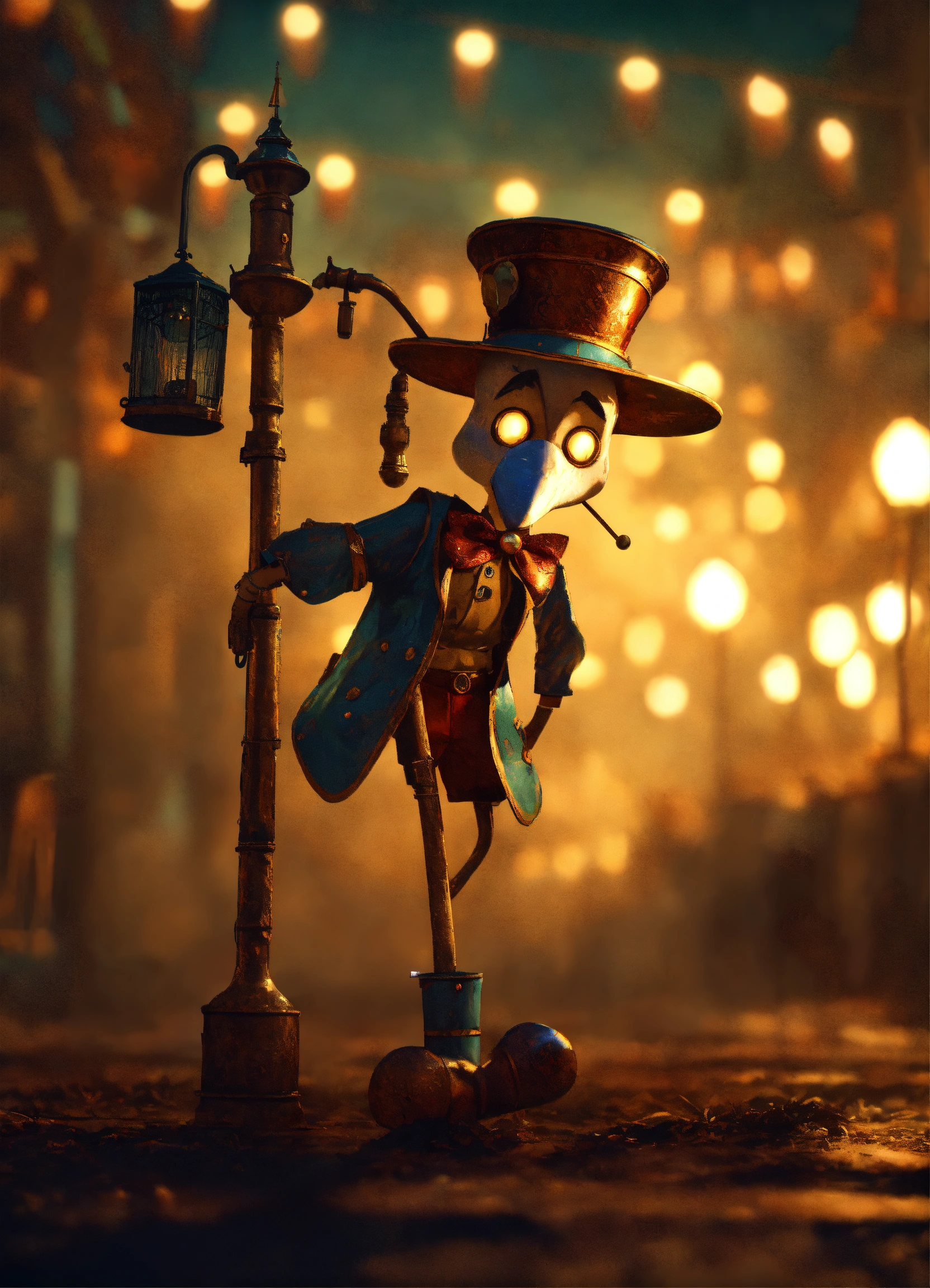 Disney pinocchio whit a long nose made of rusted metal in a birdcase, vintage circus carnival, foggy weather, night light, intricate, sharf focus, concept art, artstation, fantasy art, octane render, cinematic lighting, otherworldy, by mark ryden