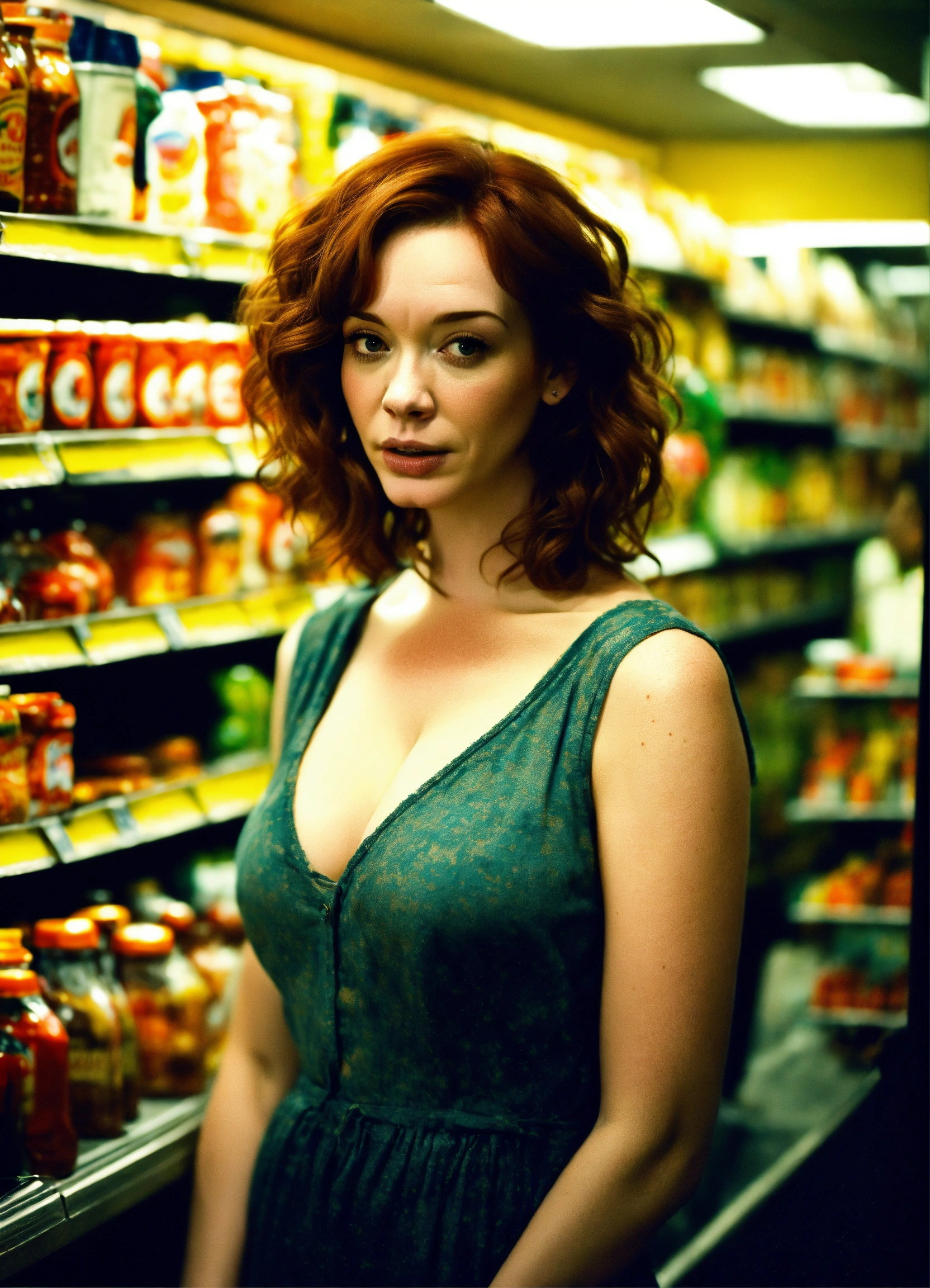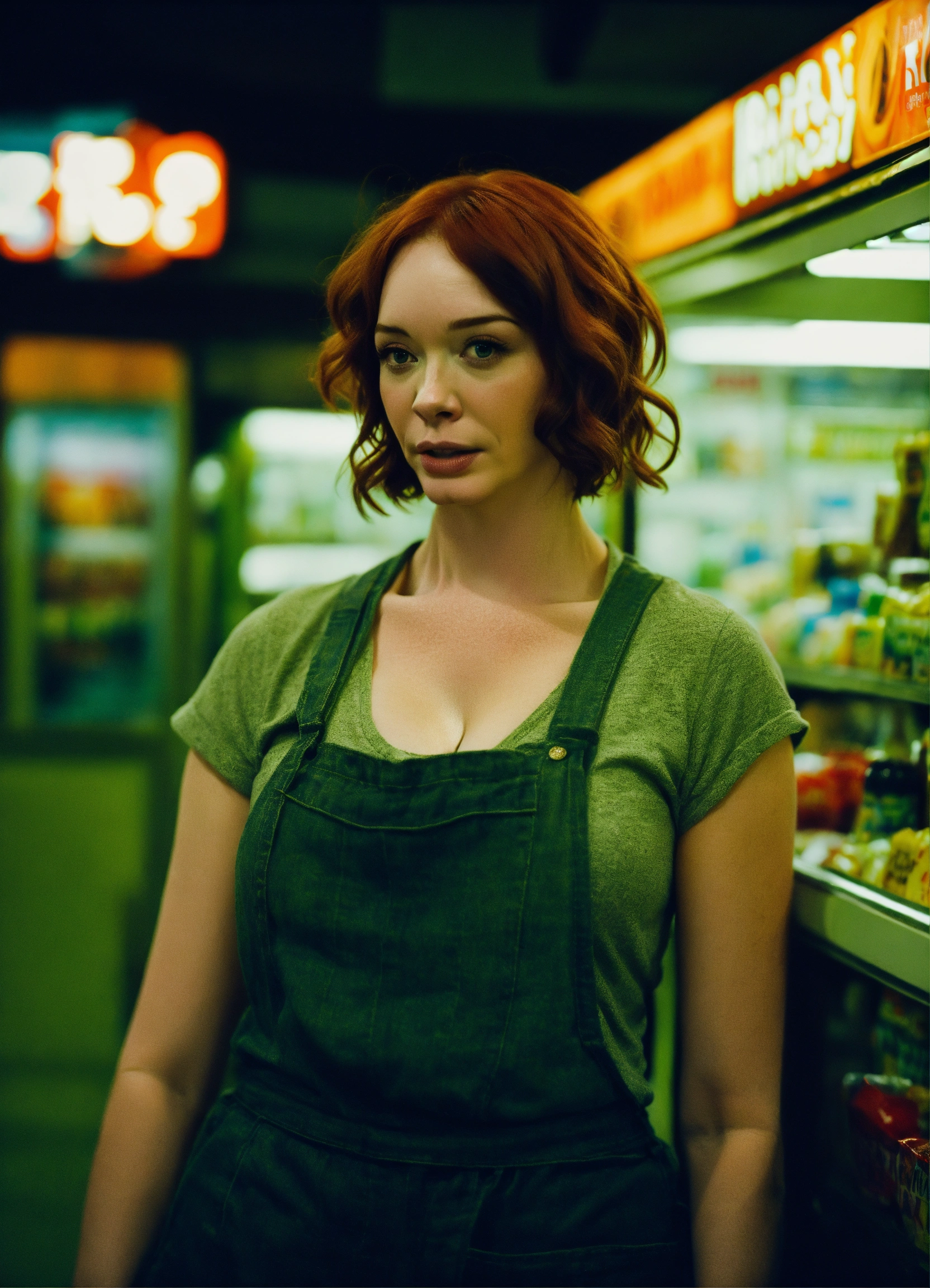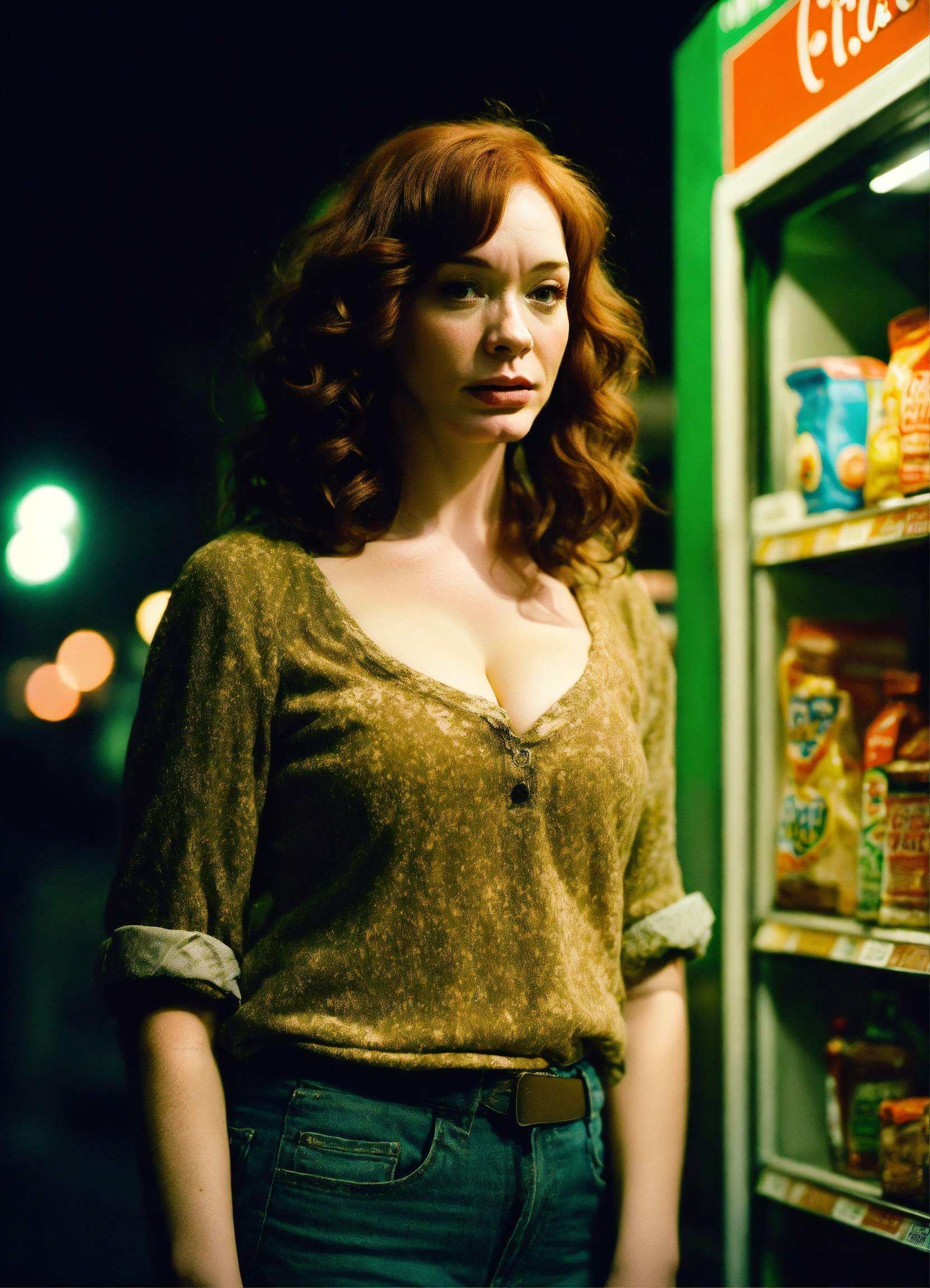 Candid photo of a young brunette christina hendricks taken at a convenience store during the night, low quality image, exhibiting a grainy texture, jpg artifacts, film grain, gritty, raw aesthetic
