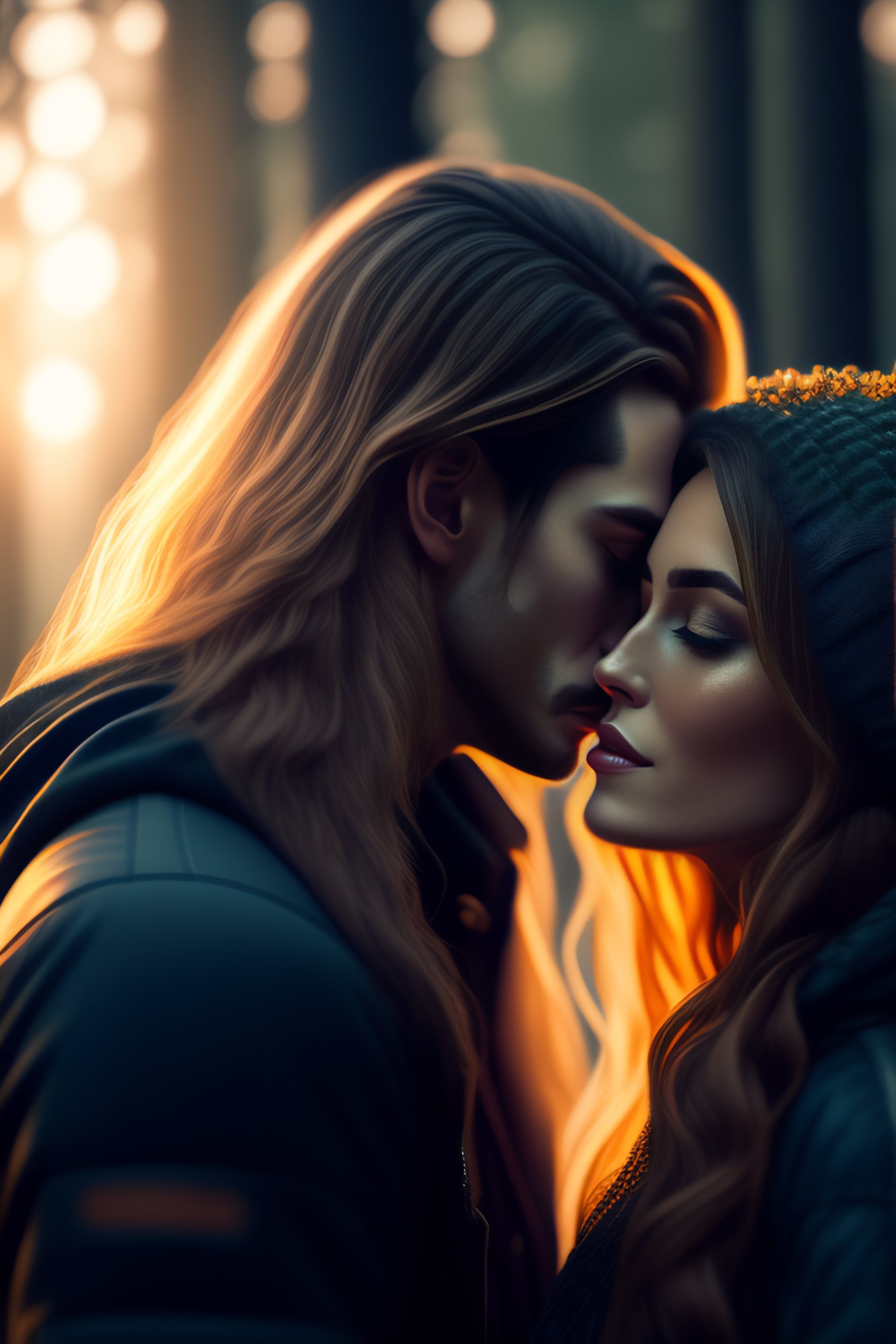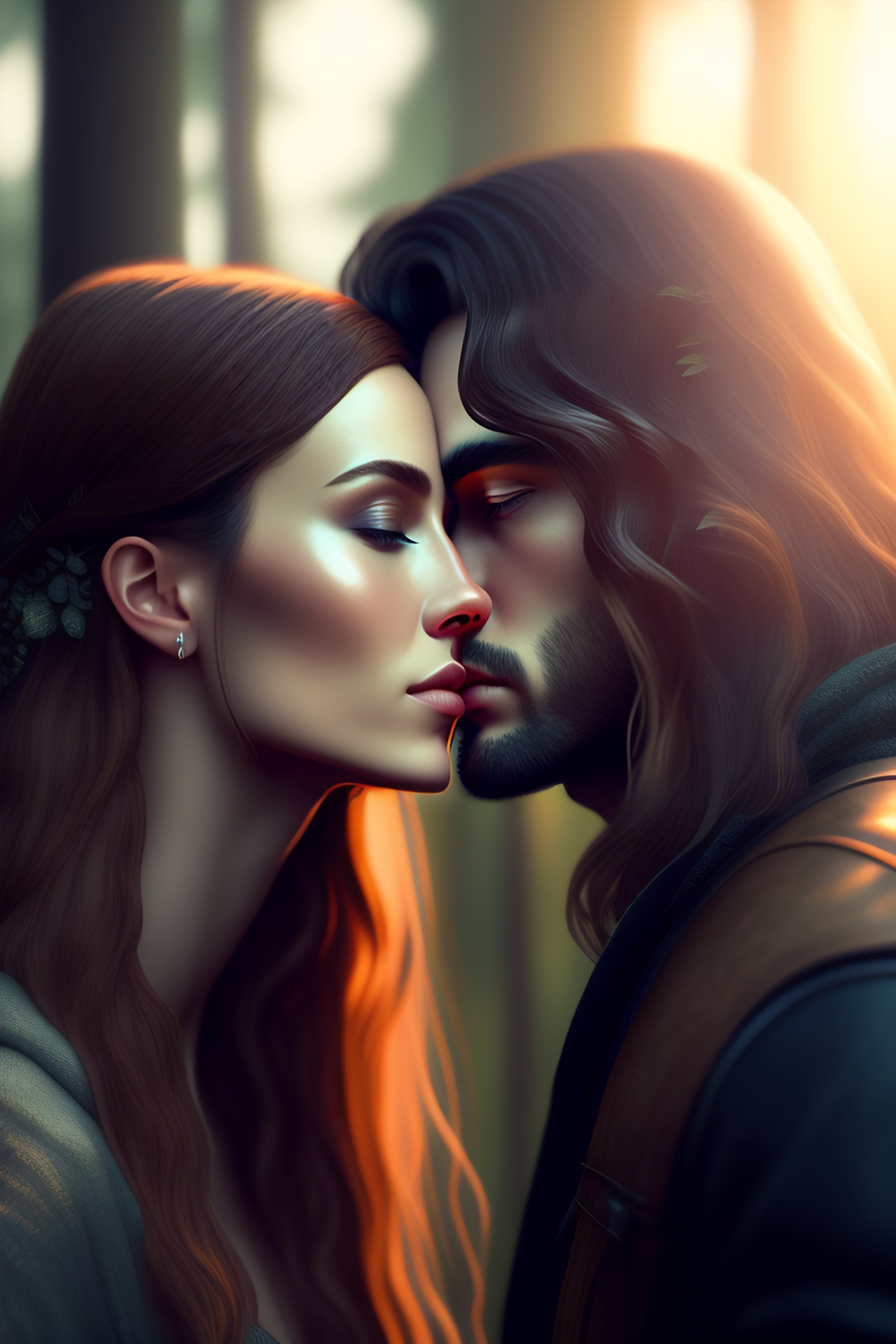 Couple kiss long hair highly detailed, digital painting, atmospheric lighting, octane render, unreal engine, professional forest growth is worth blond