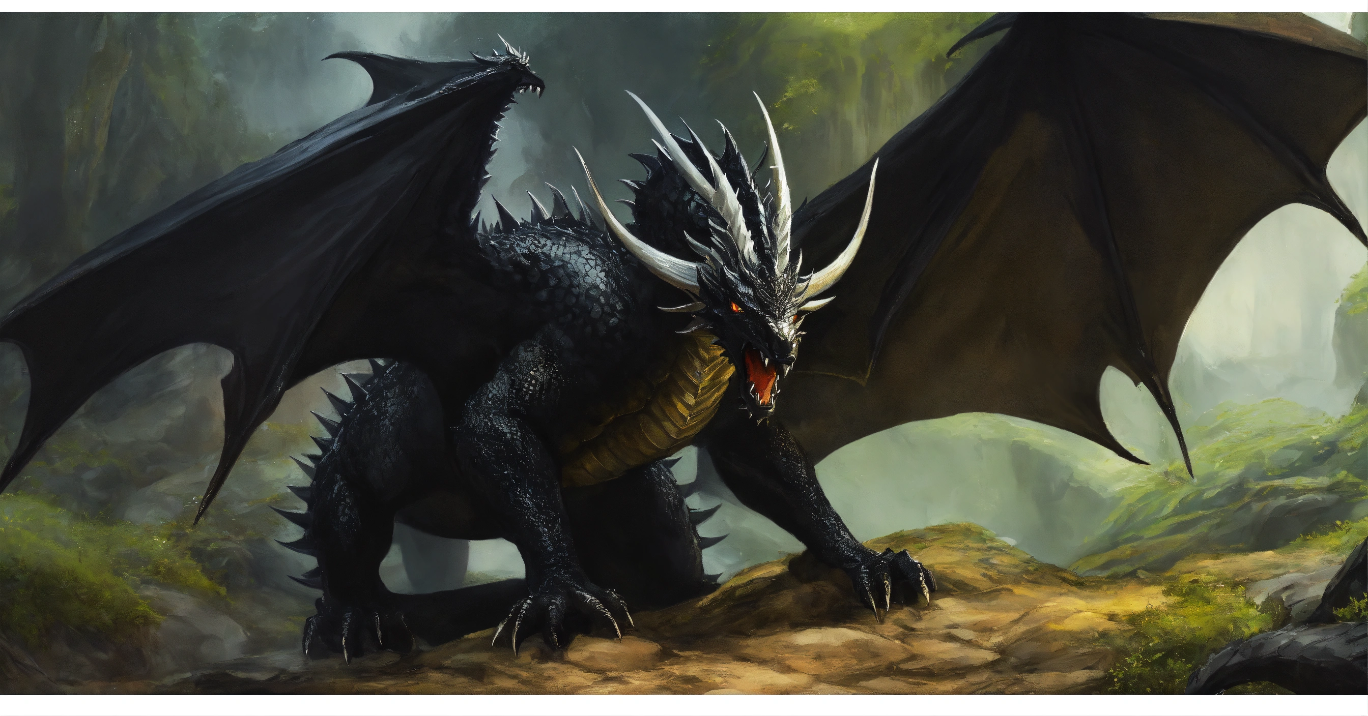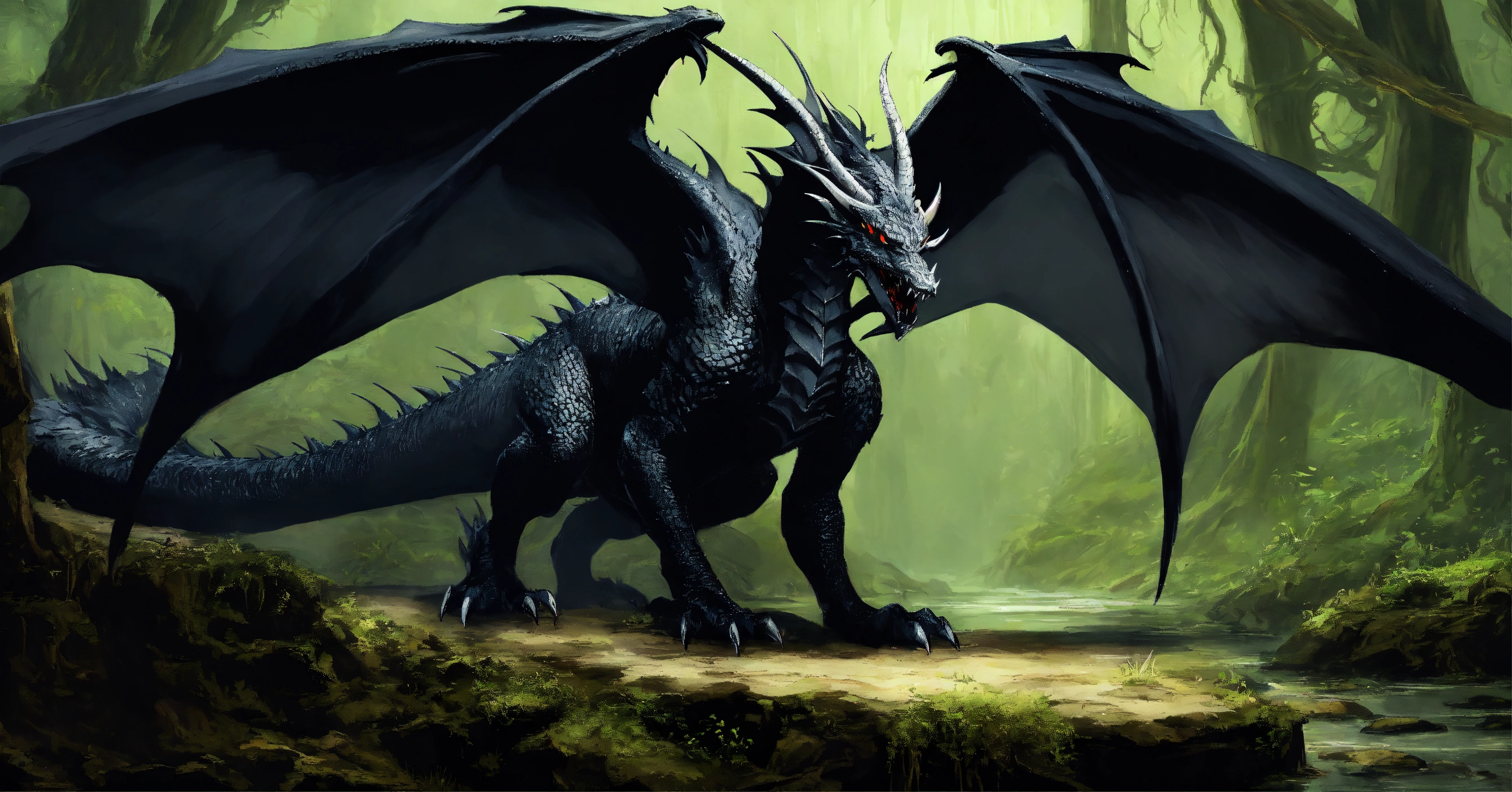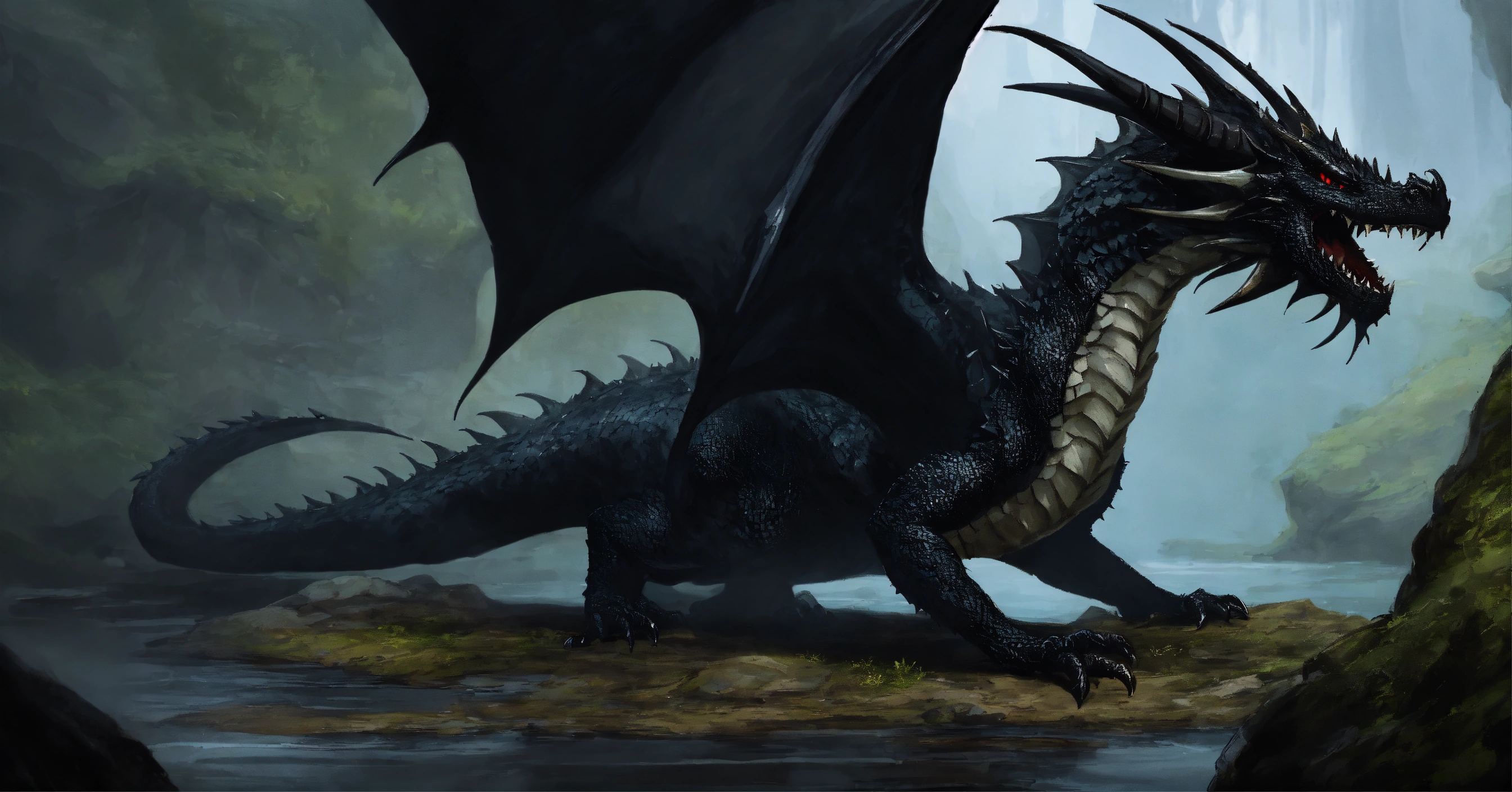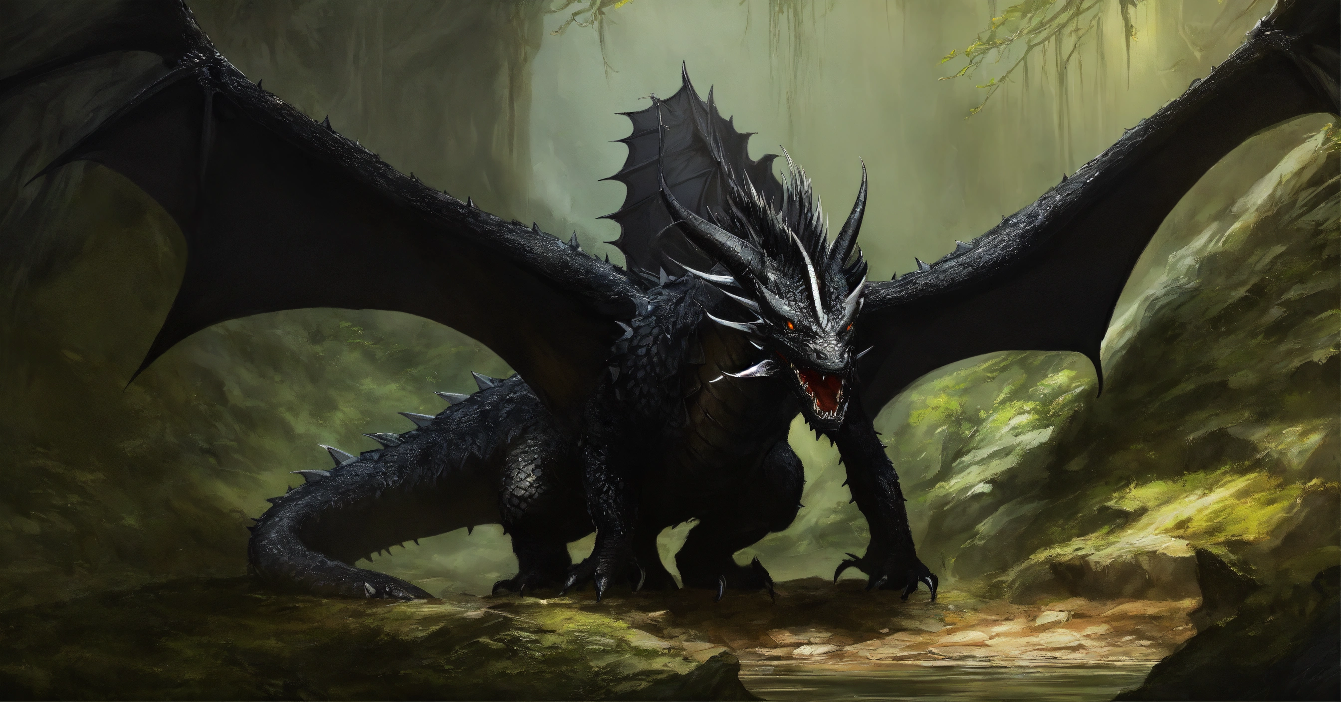 Fine art, delicate detail, menacing, black dragon. hiding in a swampy damp cave lair. his skin is smooth and matte black, with horns that are bone white that curve forward around the head and spikey arms. his wings are long and elegant providing impressive strength, in the style of dungeons and dragons monster manual, graphic novel art