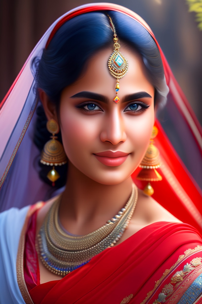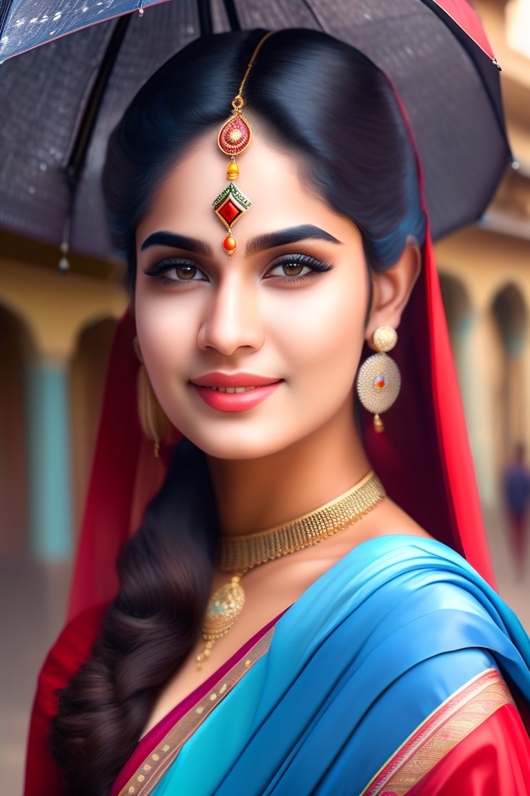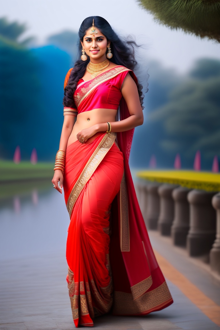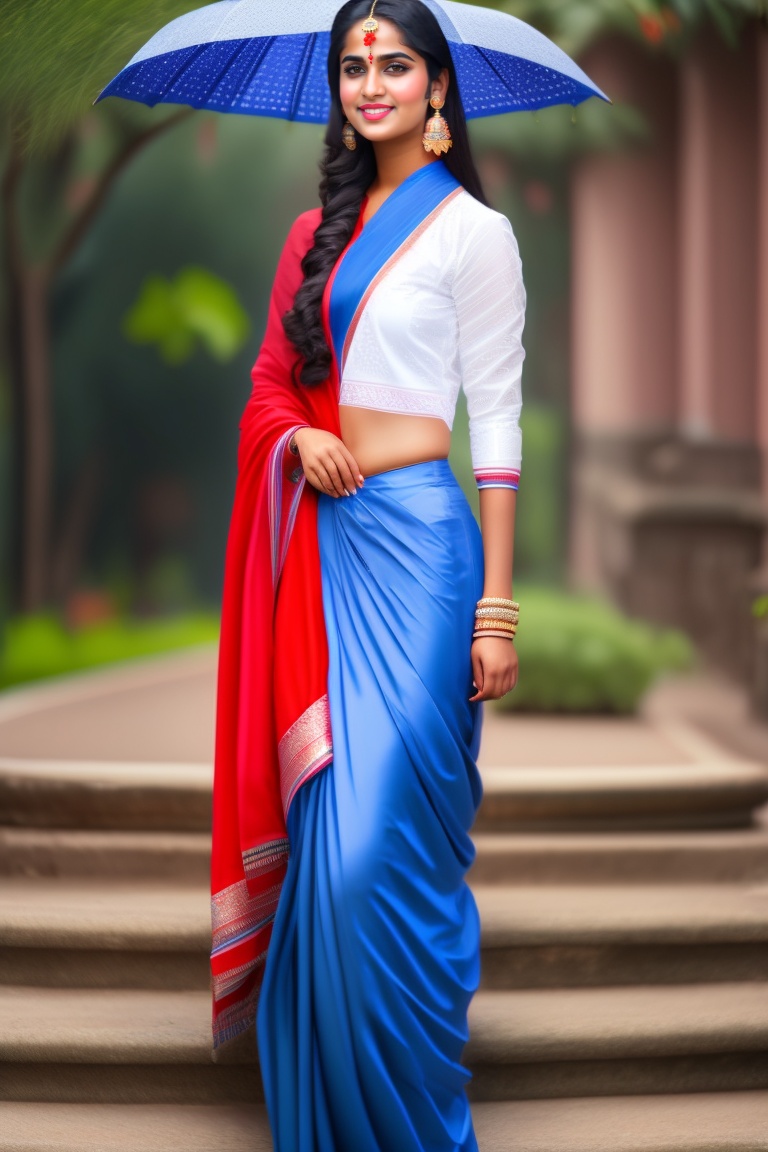 Intirgate desi college girl, full body photo graph, white skin, serene blue eyes, red saree, background rain season view, photoshoot, potrait