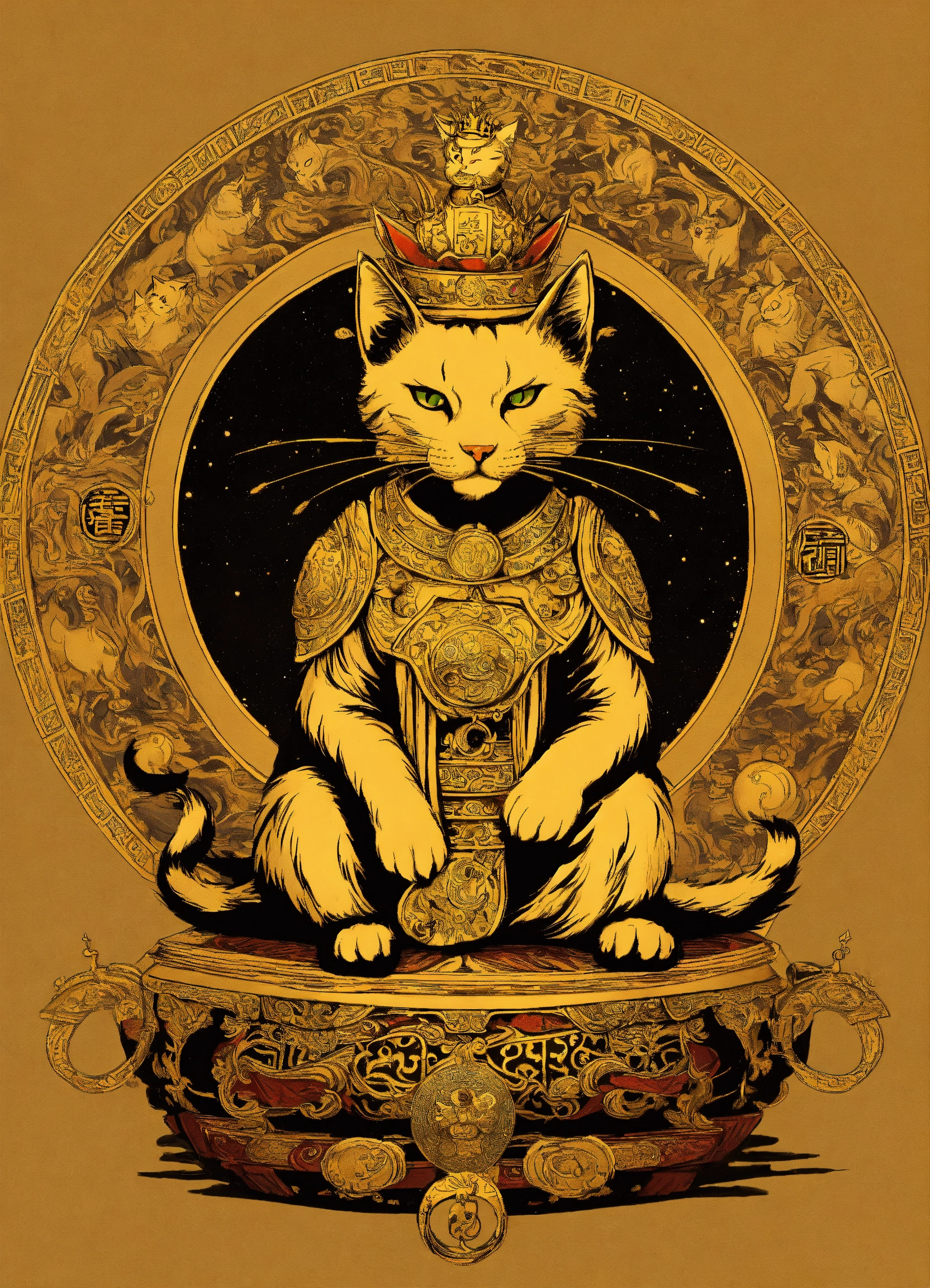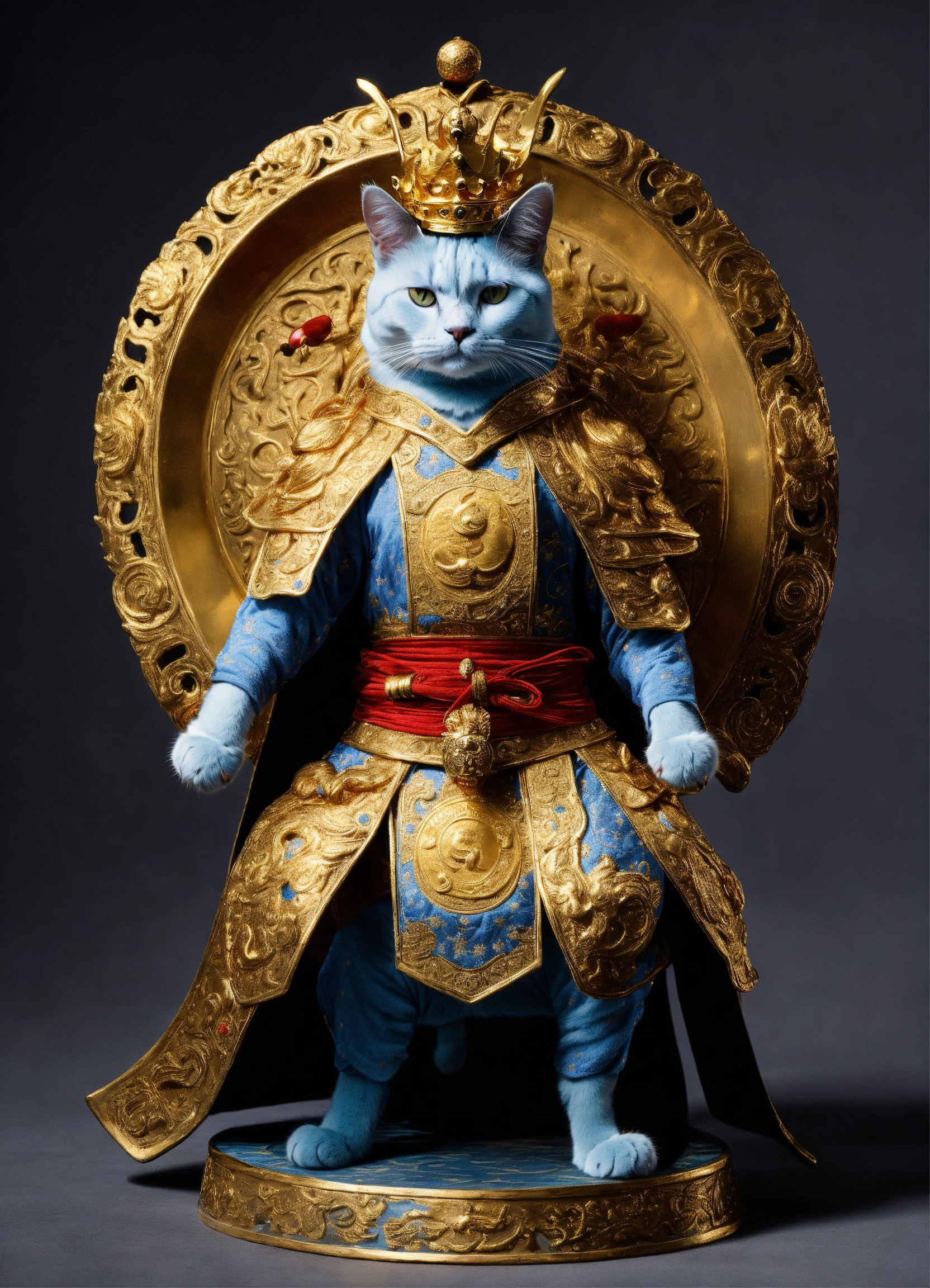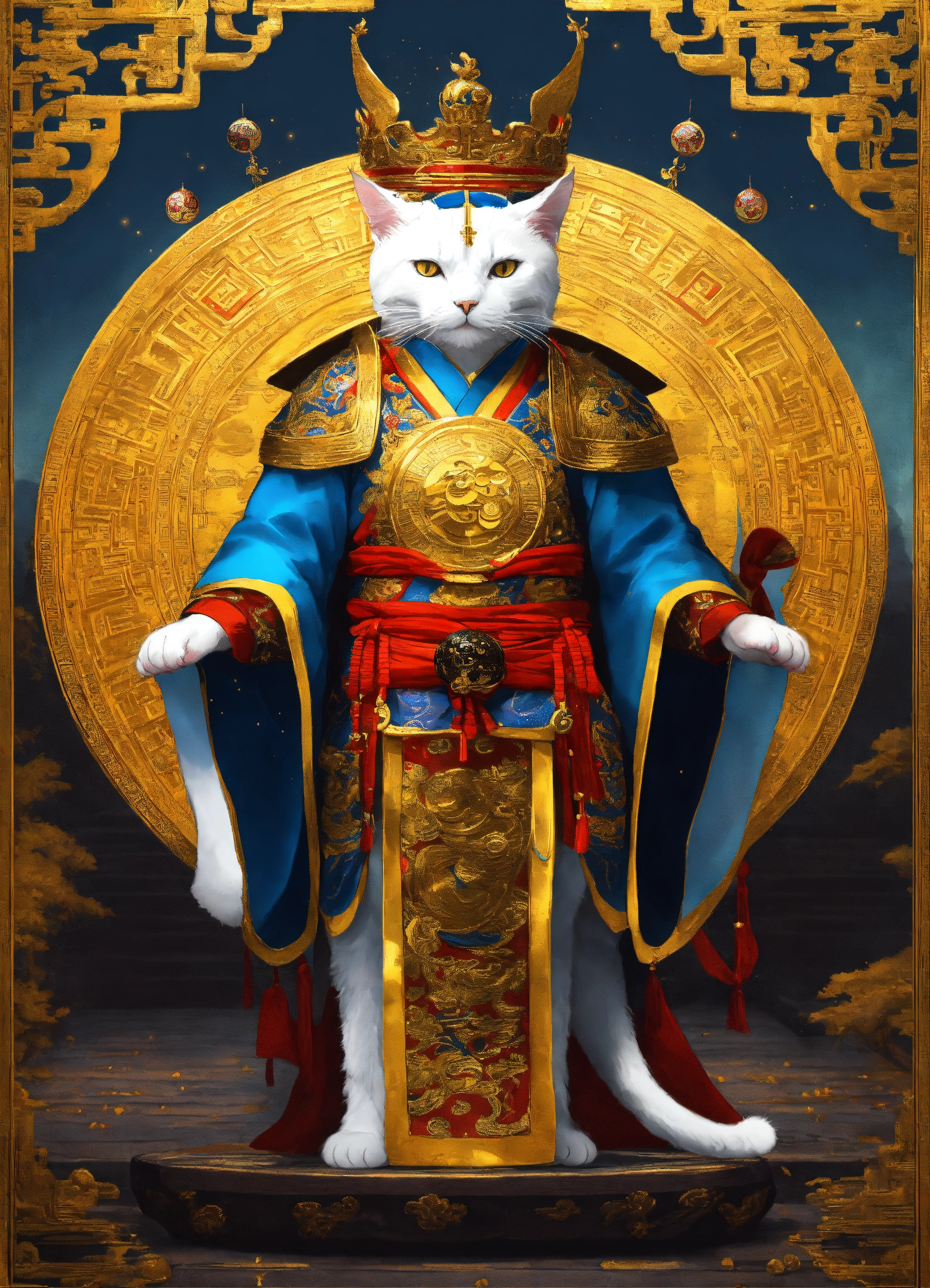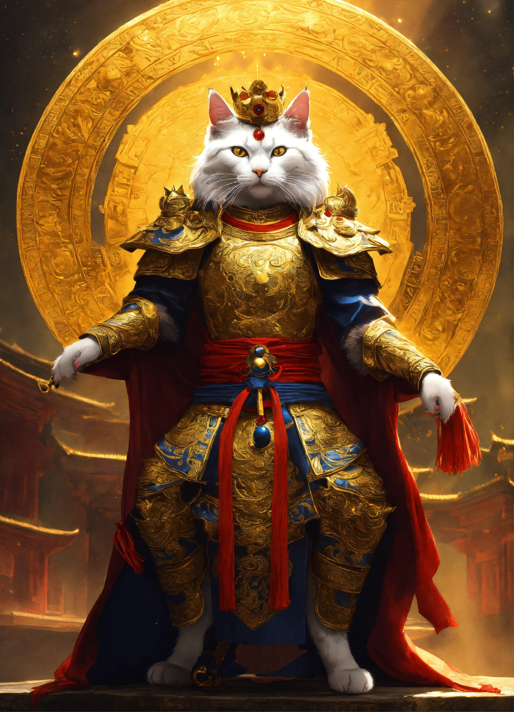 A cat like human with two legs, portraying yang jian, wearing a golden crown and holding the universe ring, exuding imposing martial prowess. in the martial glory of this yang jian cat, crowned with a golden headdress and wielding the universe ring, it stands as a paragon of power and might.