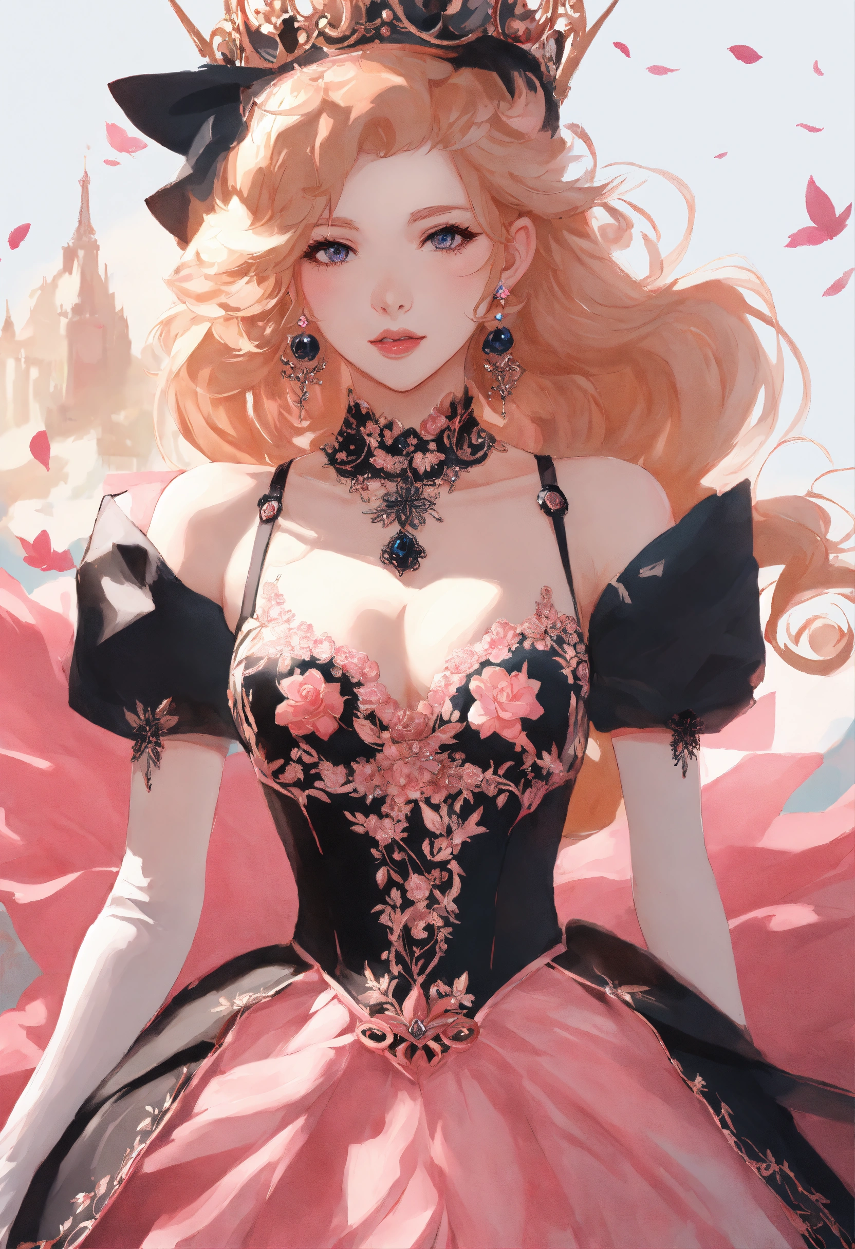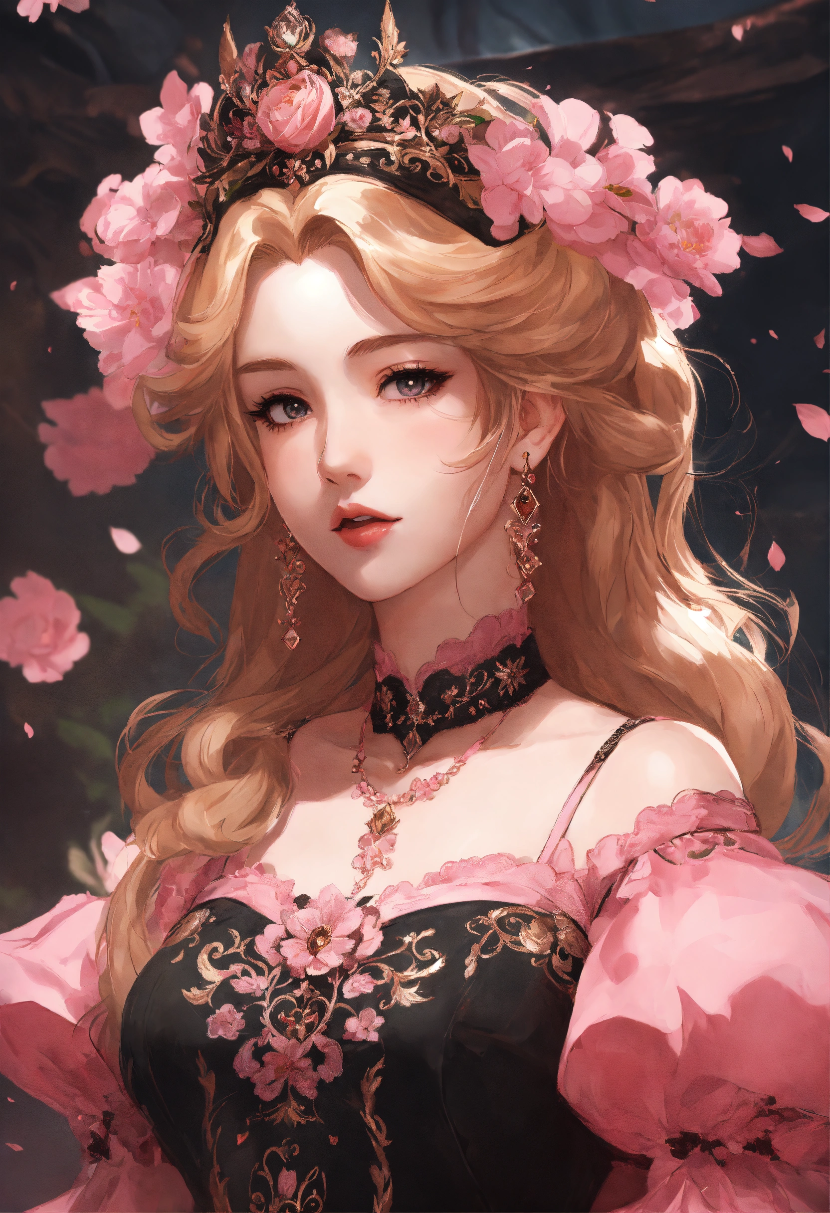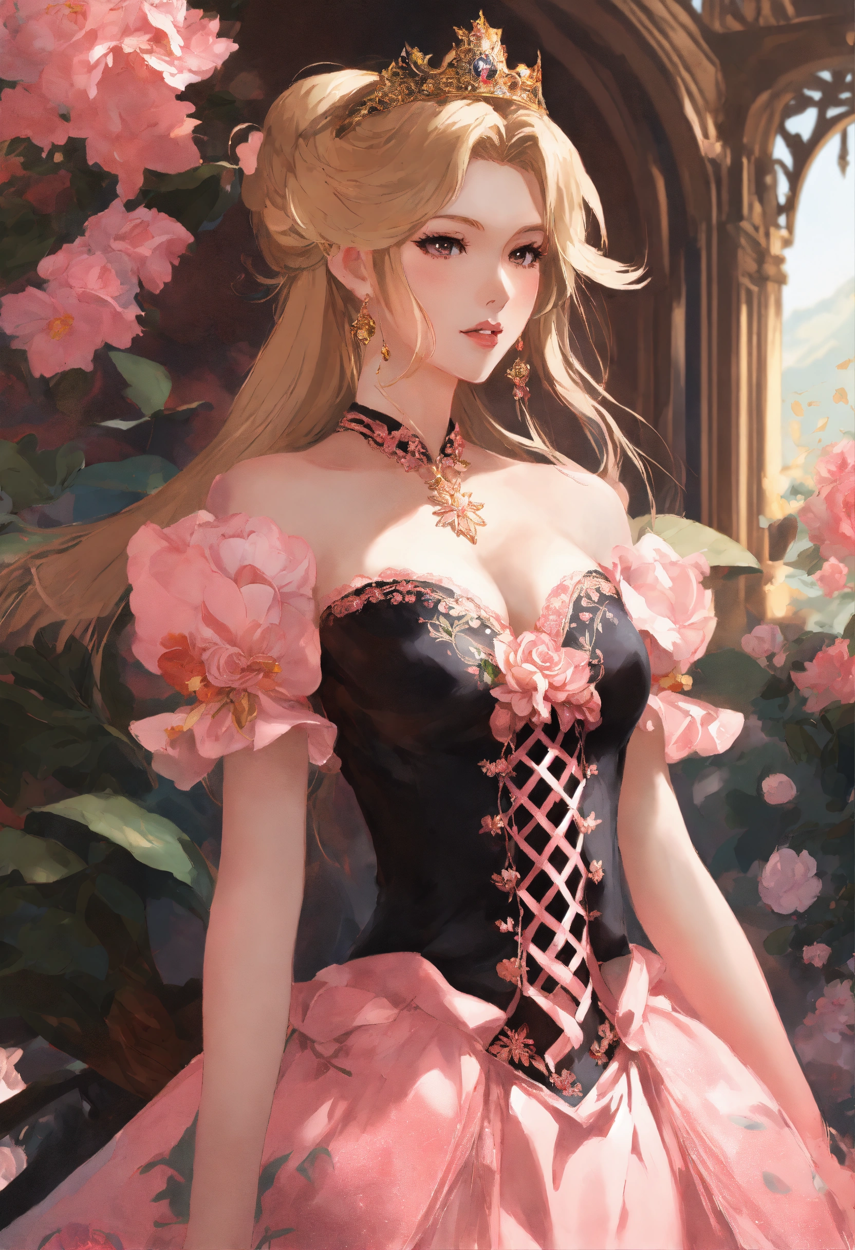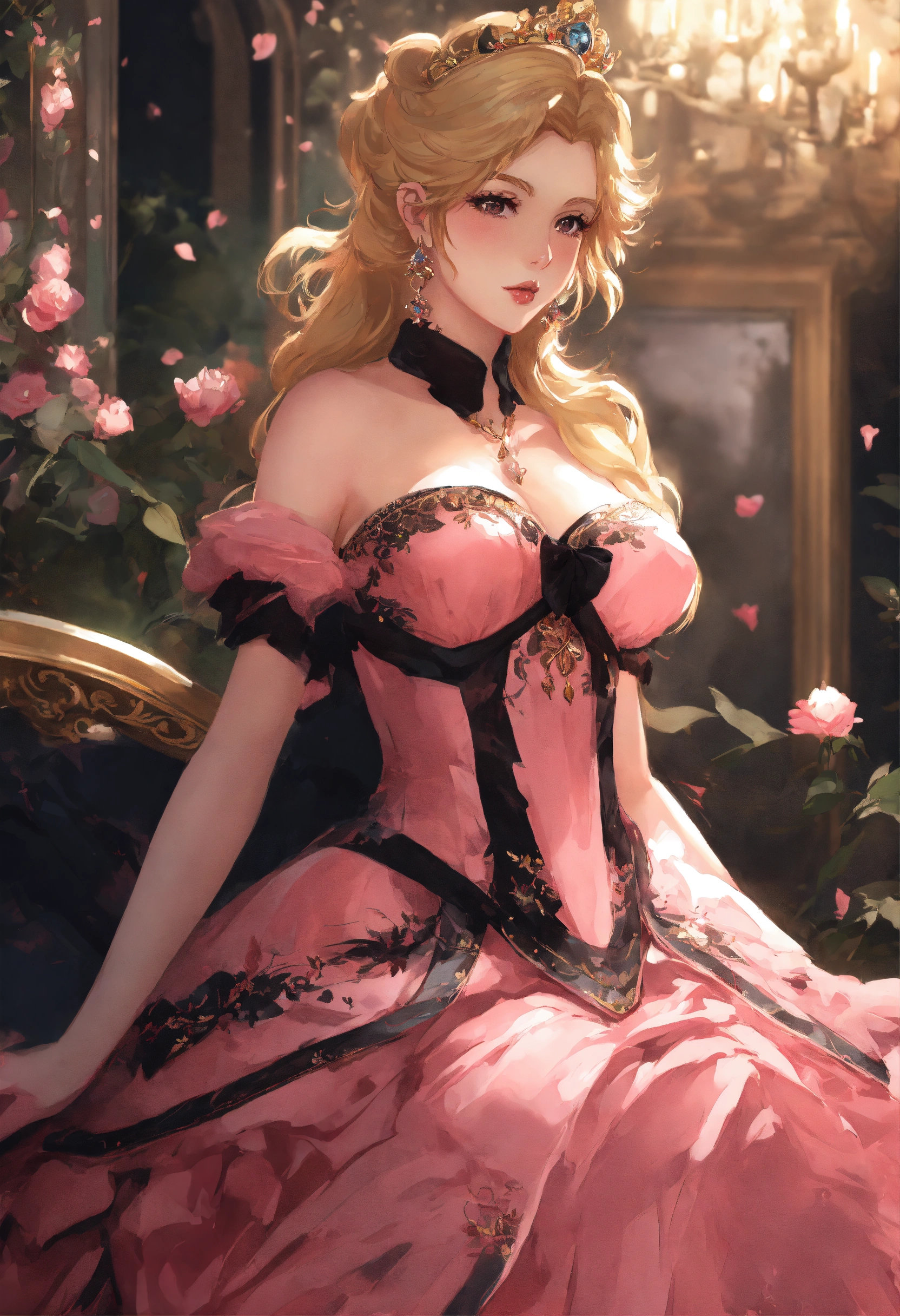 Anime artwork of princess peach in a detailed intricate pink and black dress