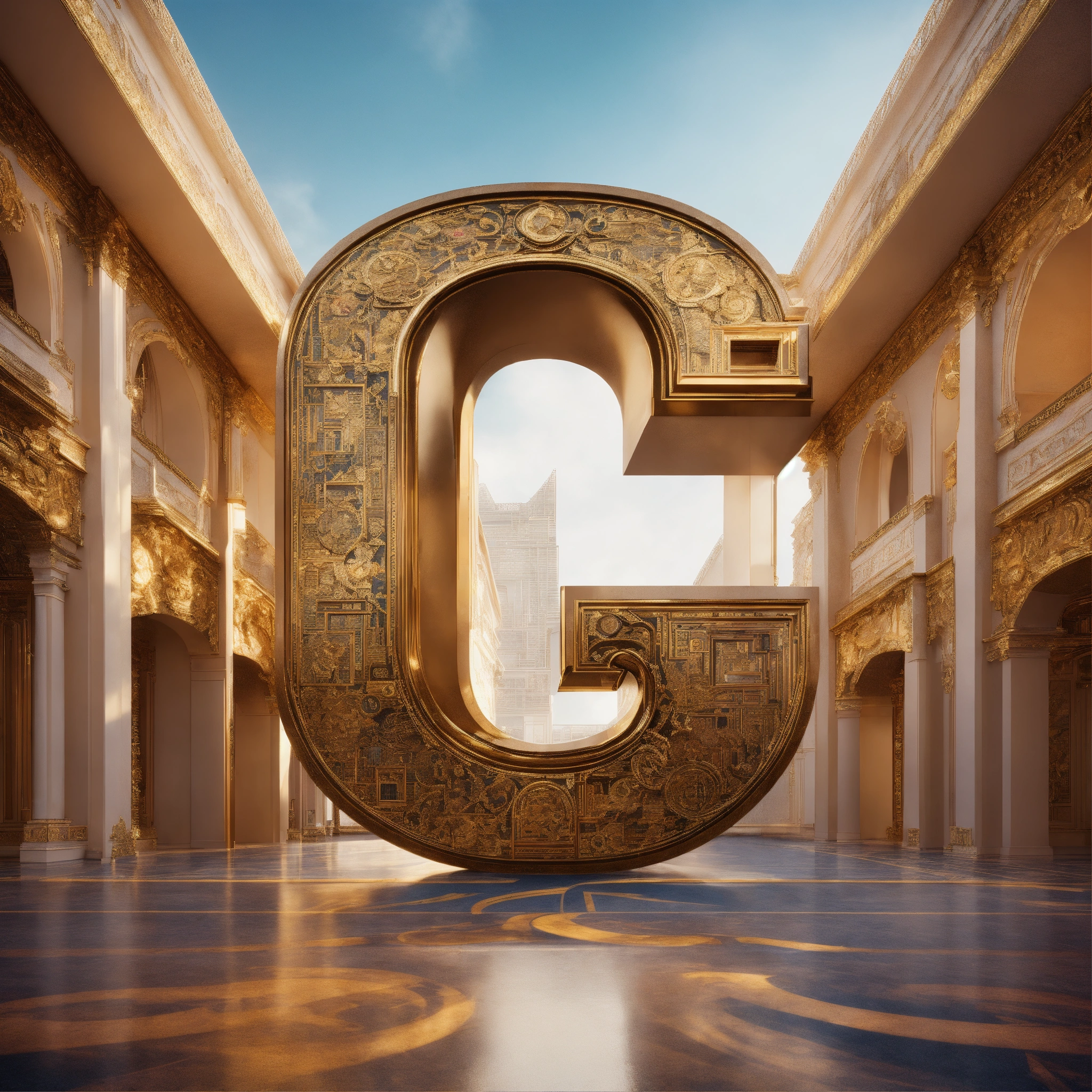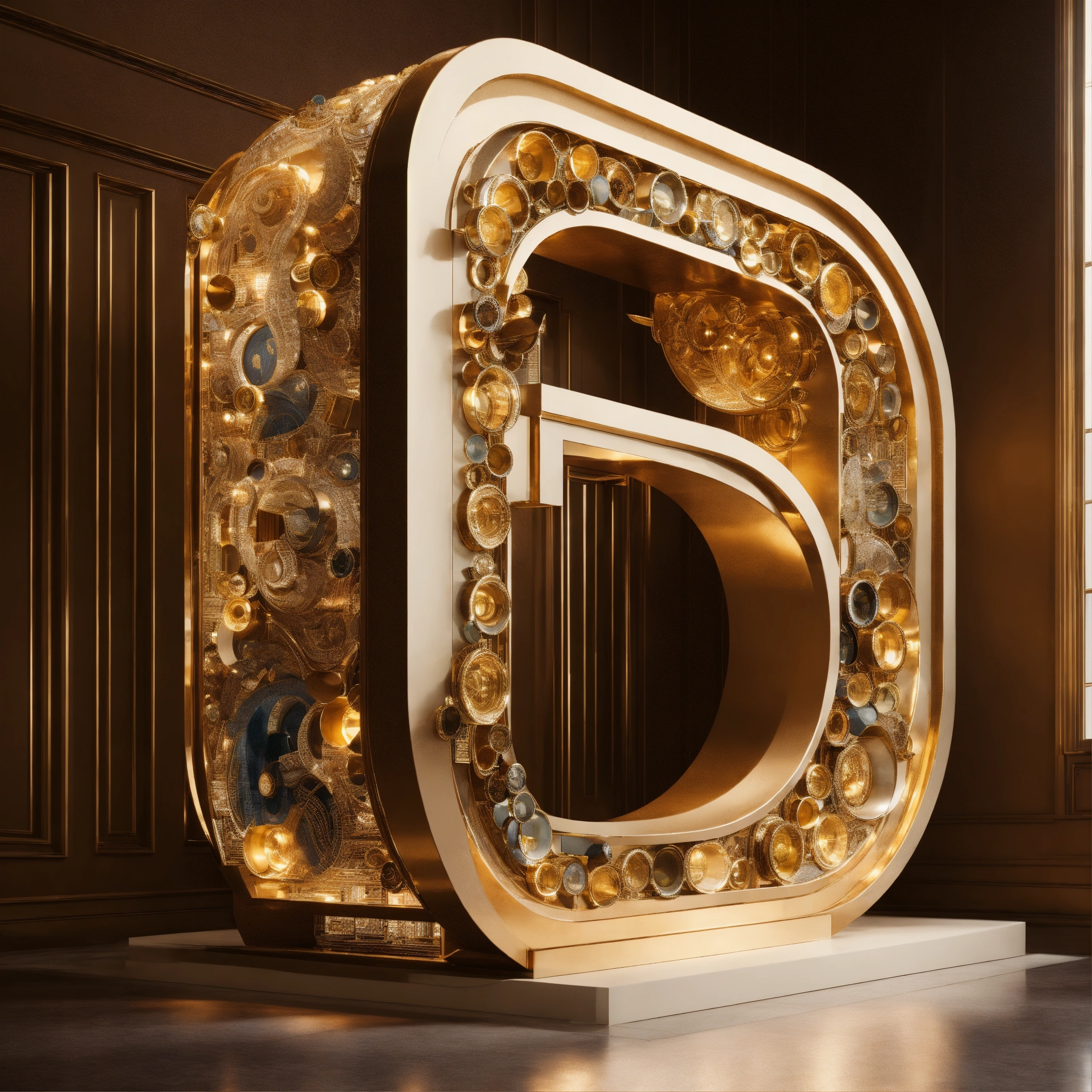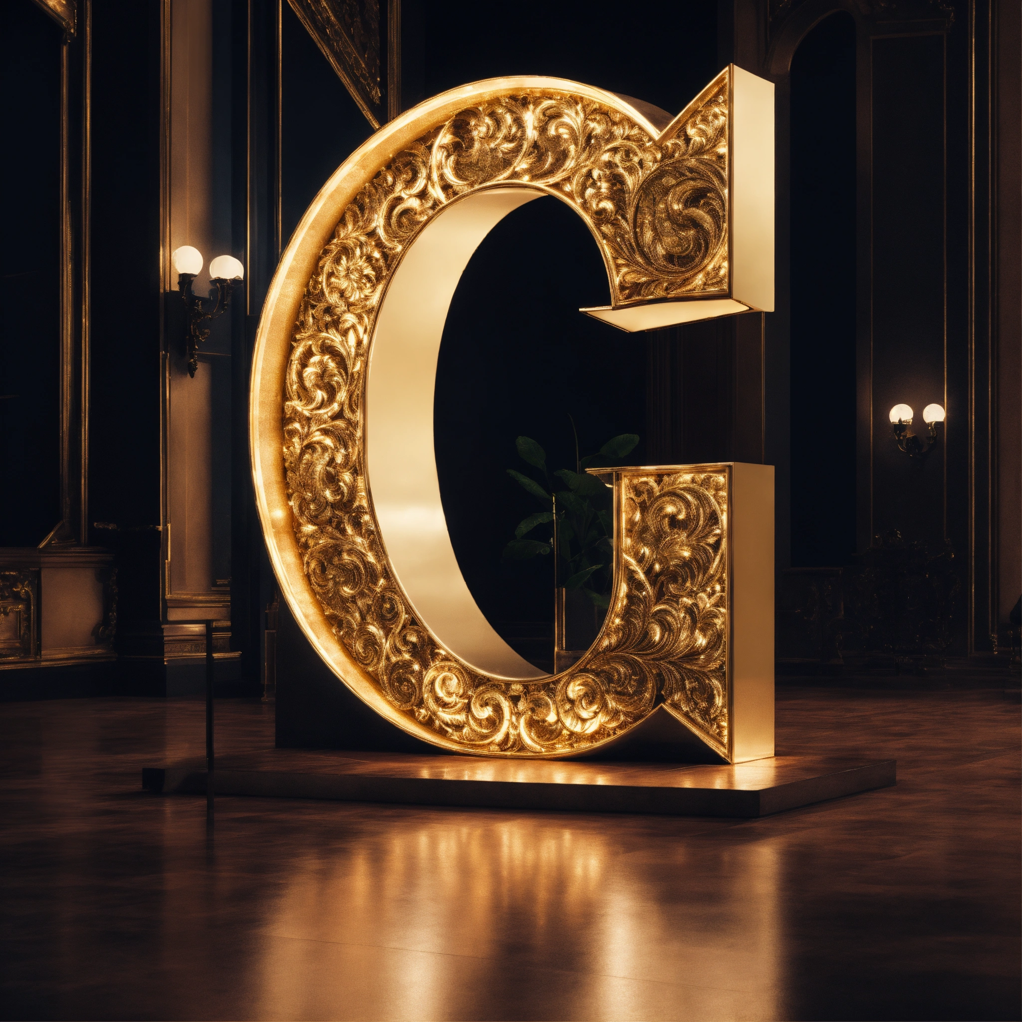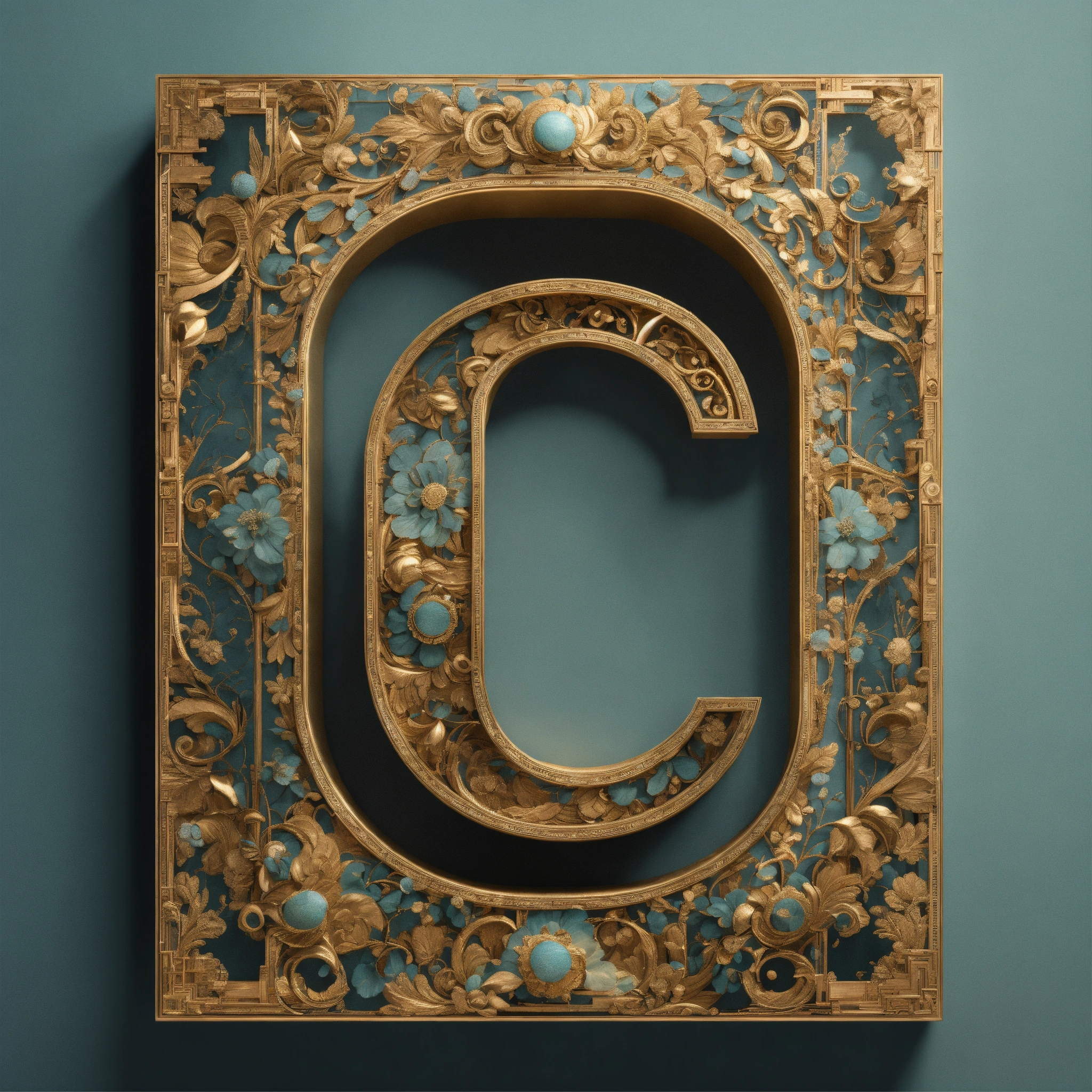 Letter c in a richly decorated complex structure. the letter c has high detail and elegant style. the design creates an atmosphere of tech, modernity, and wealth. like an art installation in a luxury mansion