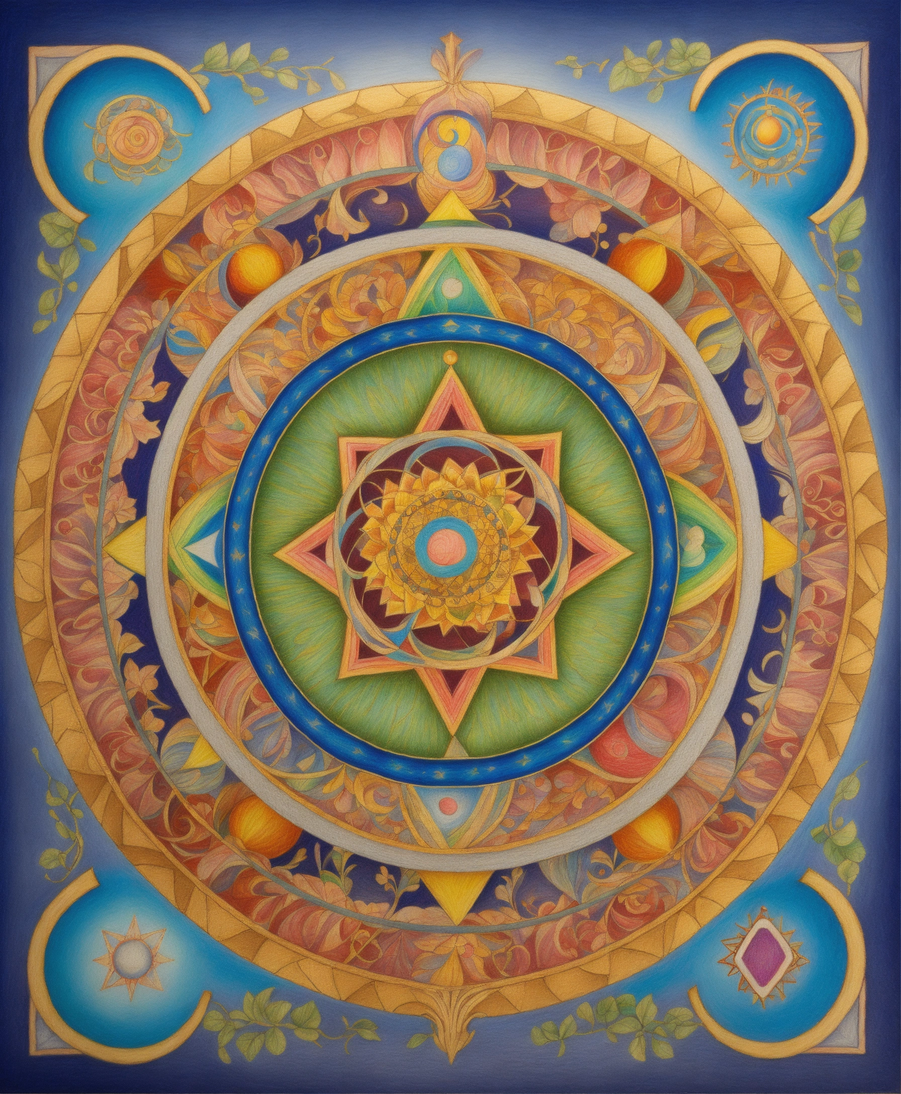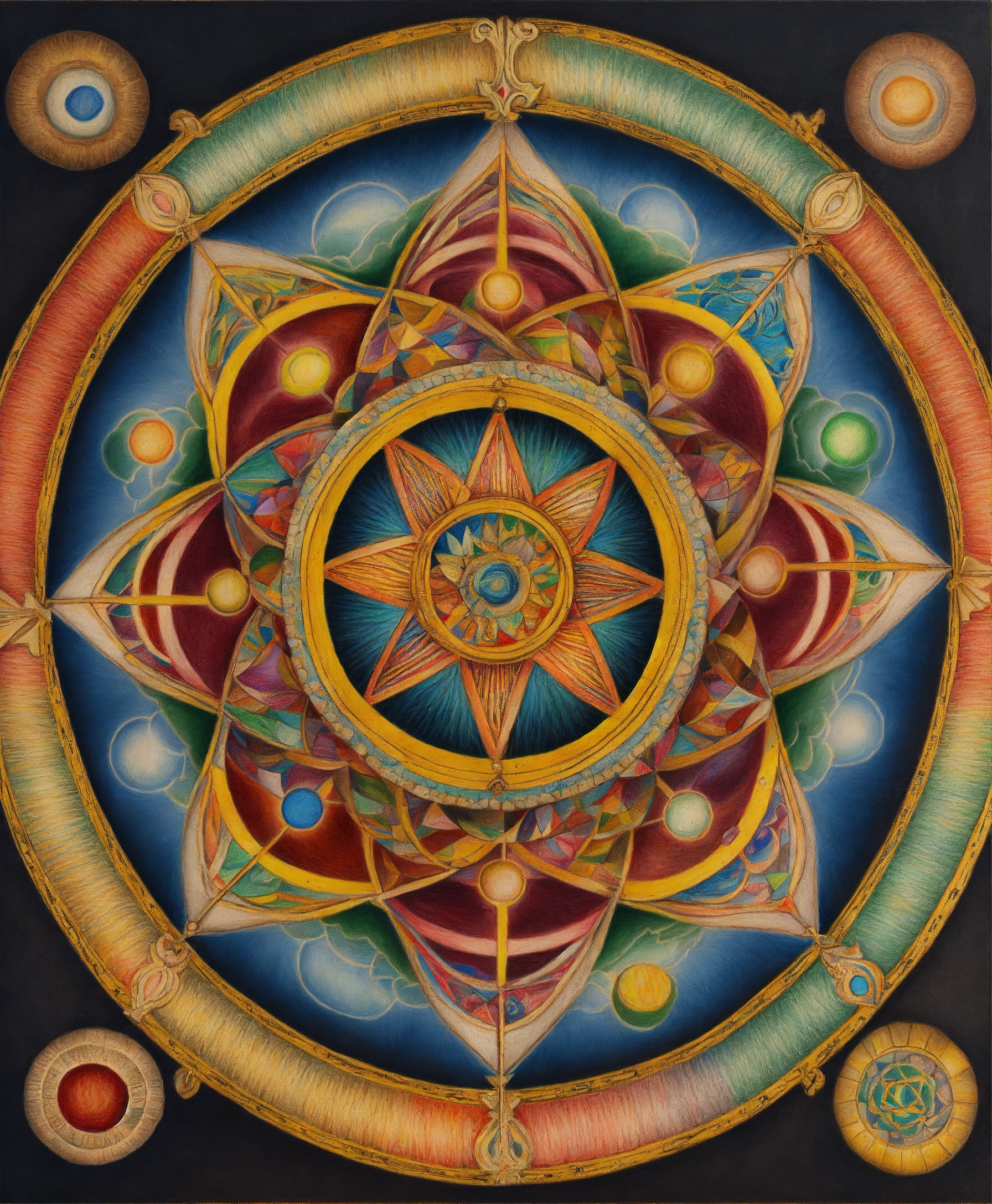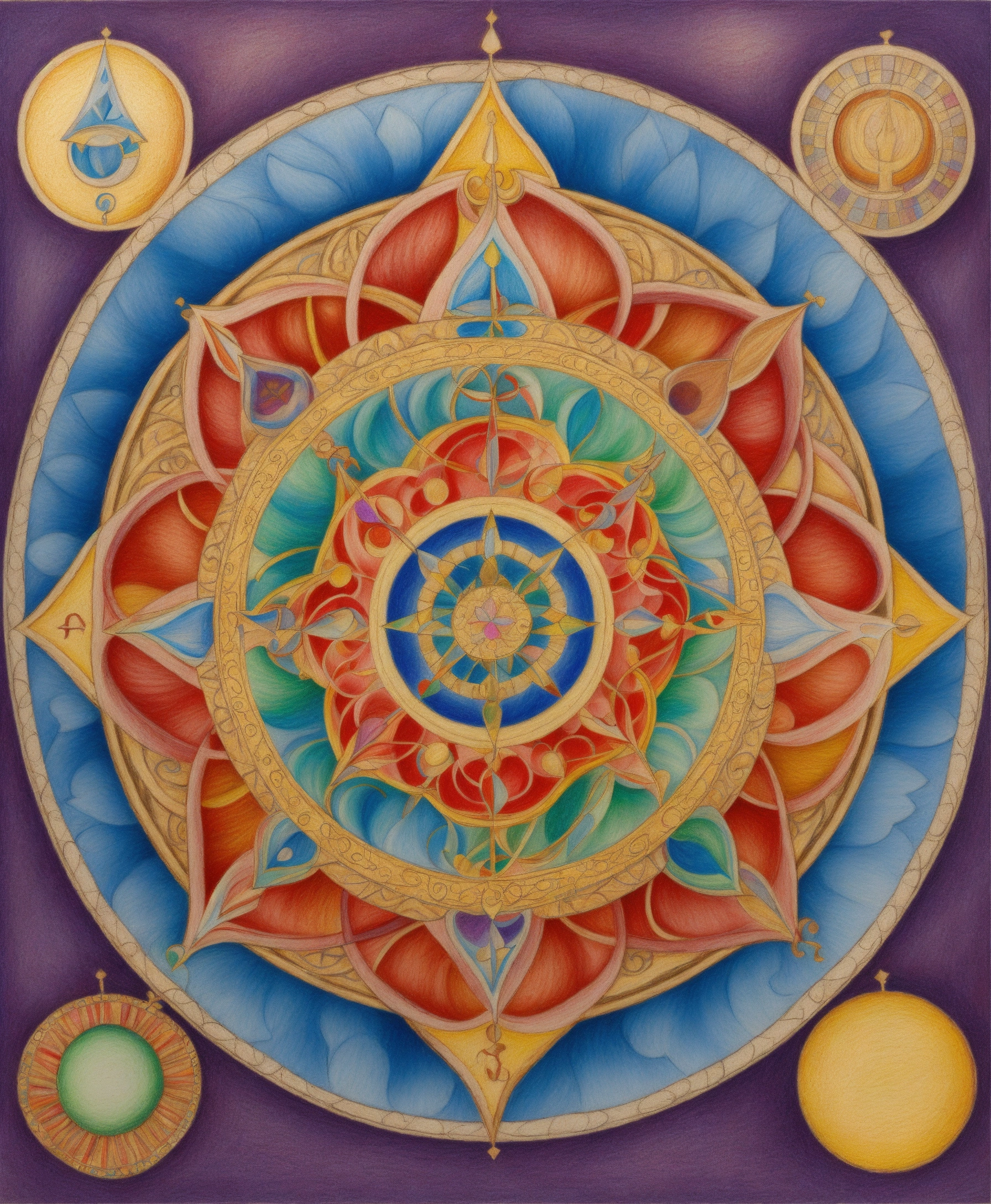 Colored pencil drawing of an alchemical multicolored symbol with 12 golden helices and a small mandala