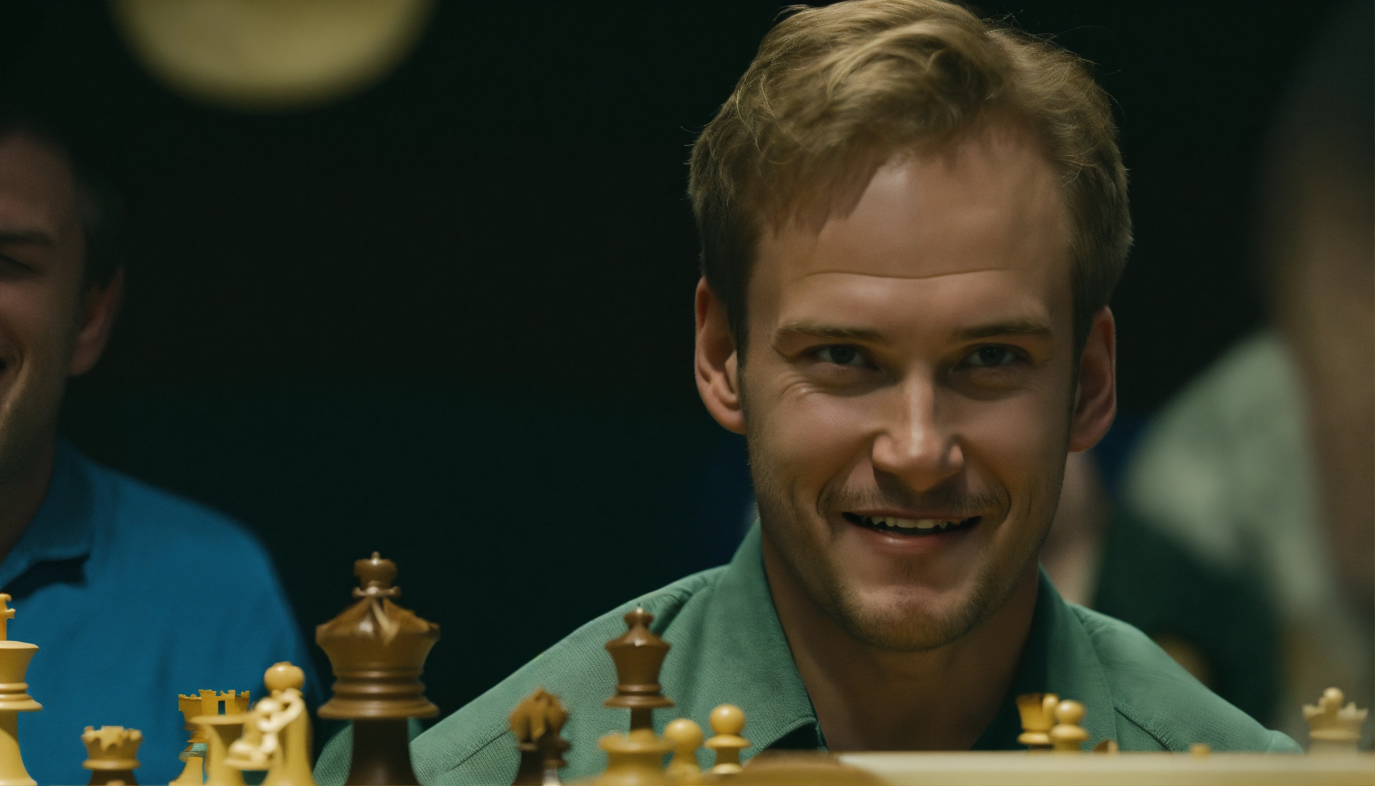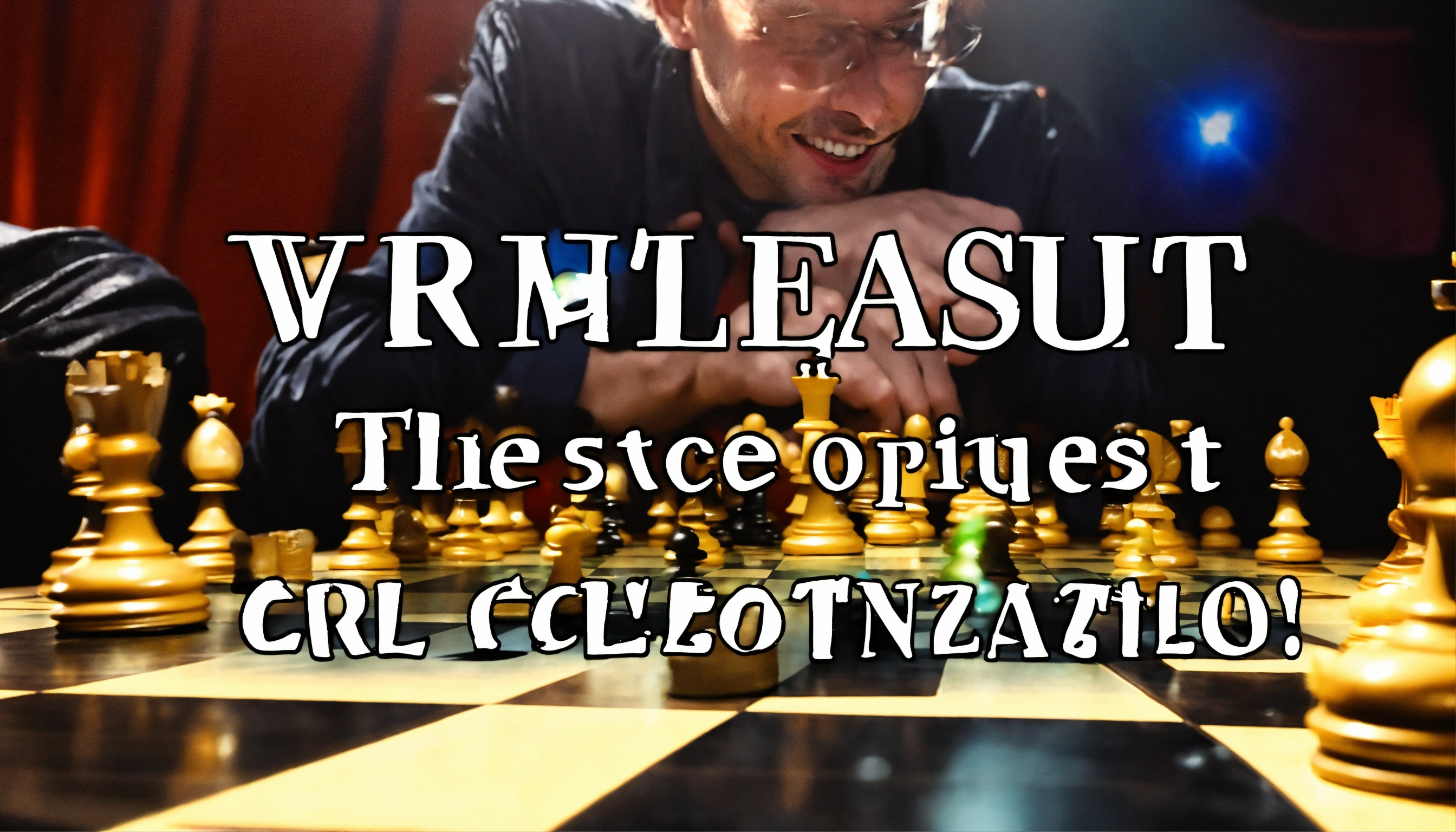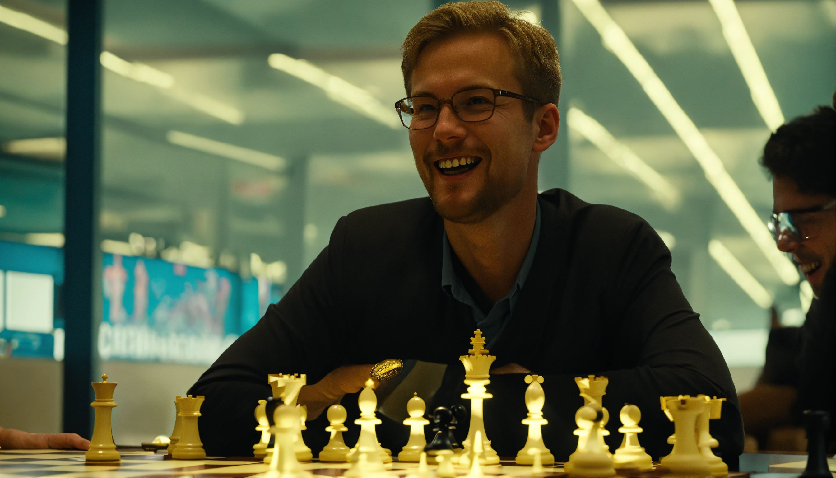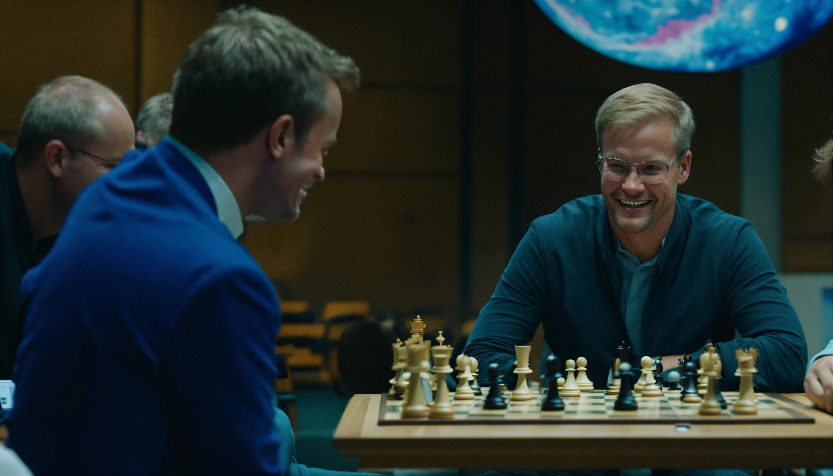Carl magnusson with grin makes a unleashes a masterful tactic in a celestial chess tournament, opponent is terrified