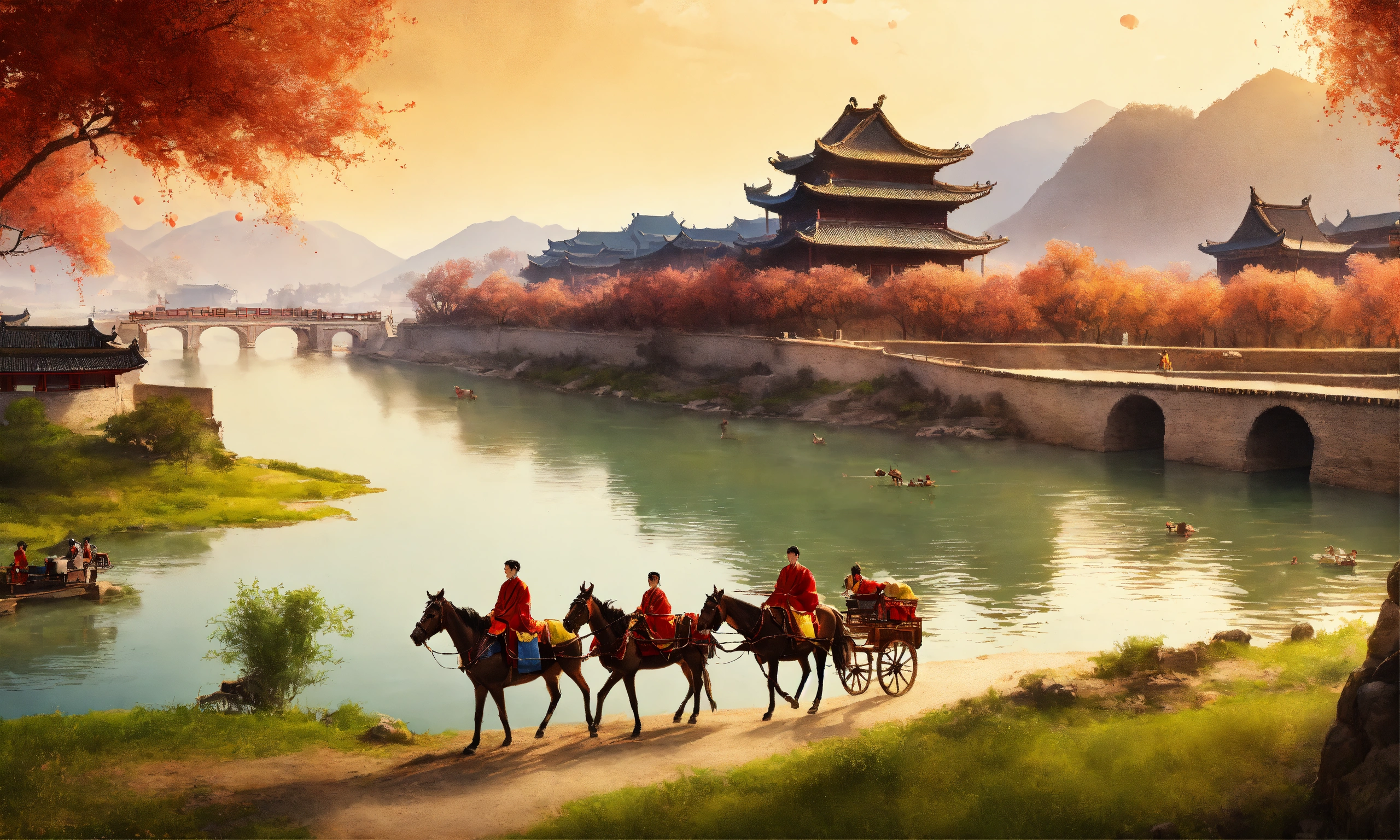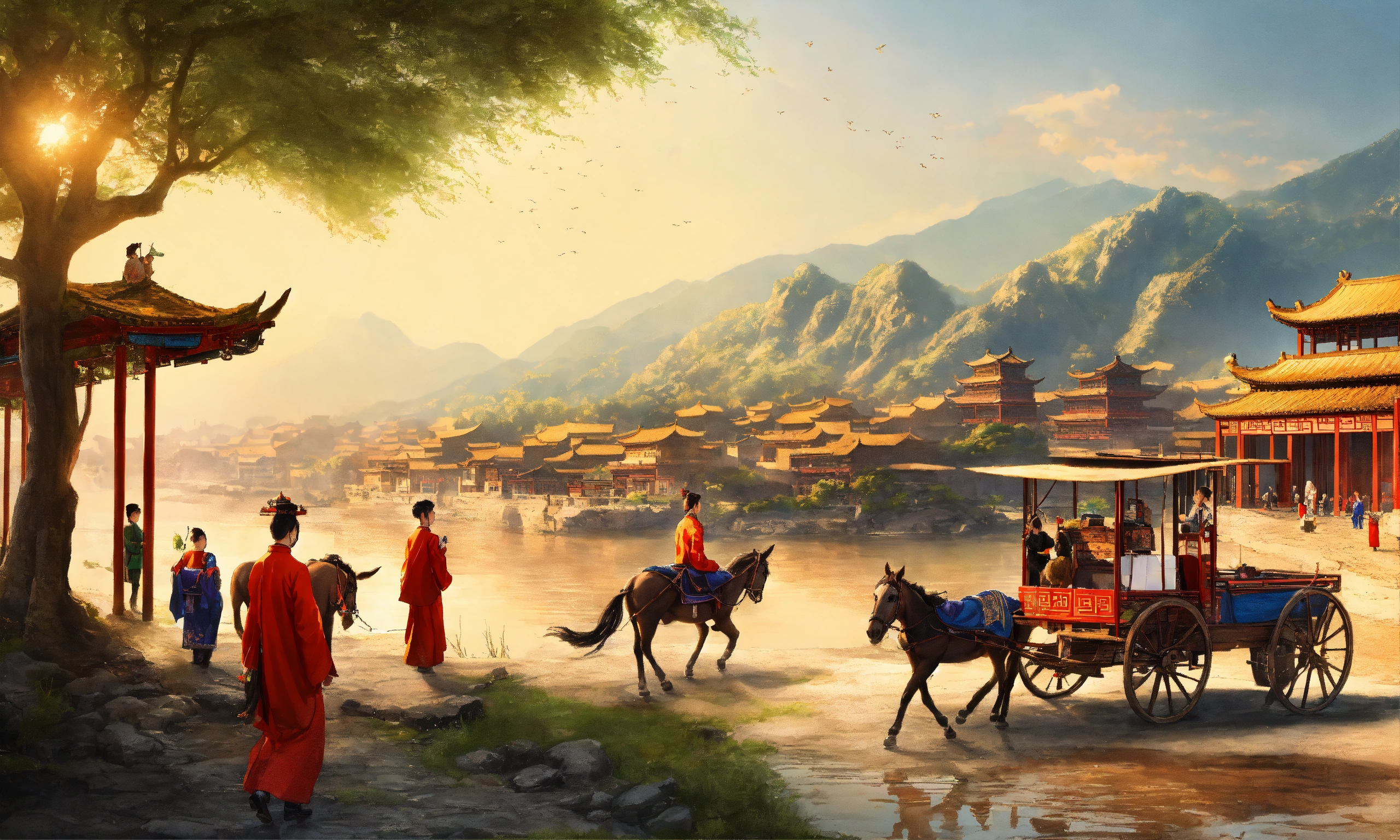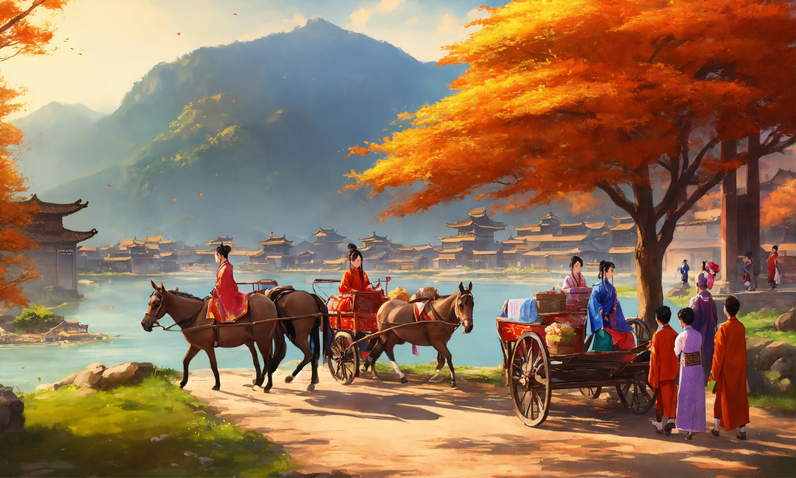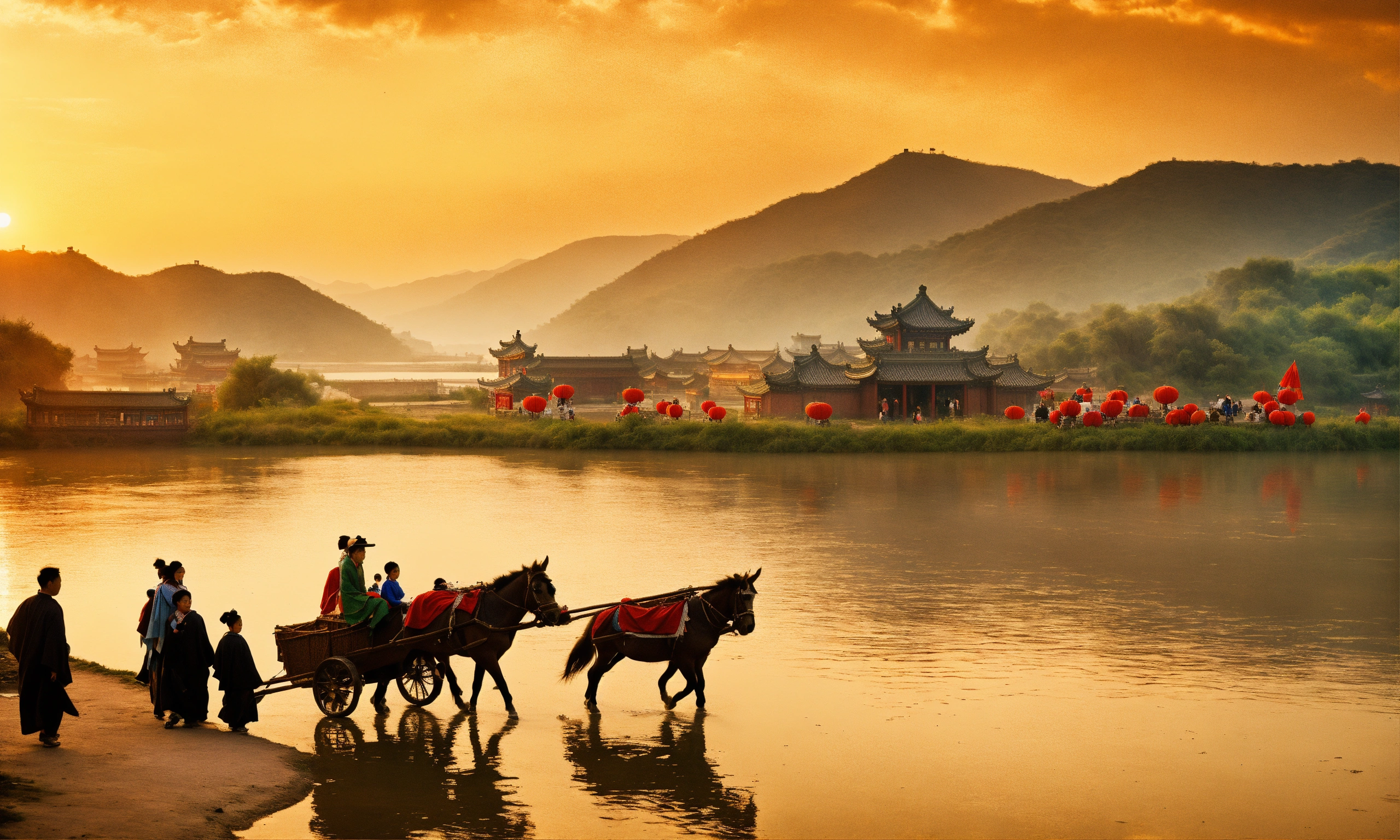 People in traditional chinese cloth leaving the historical chinese city with children, carts, horses, donkeys with beautiful landcape with river on the background
