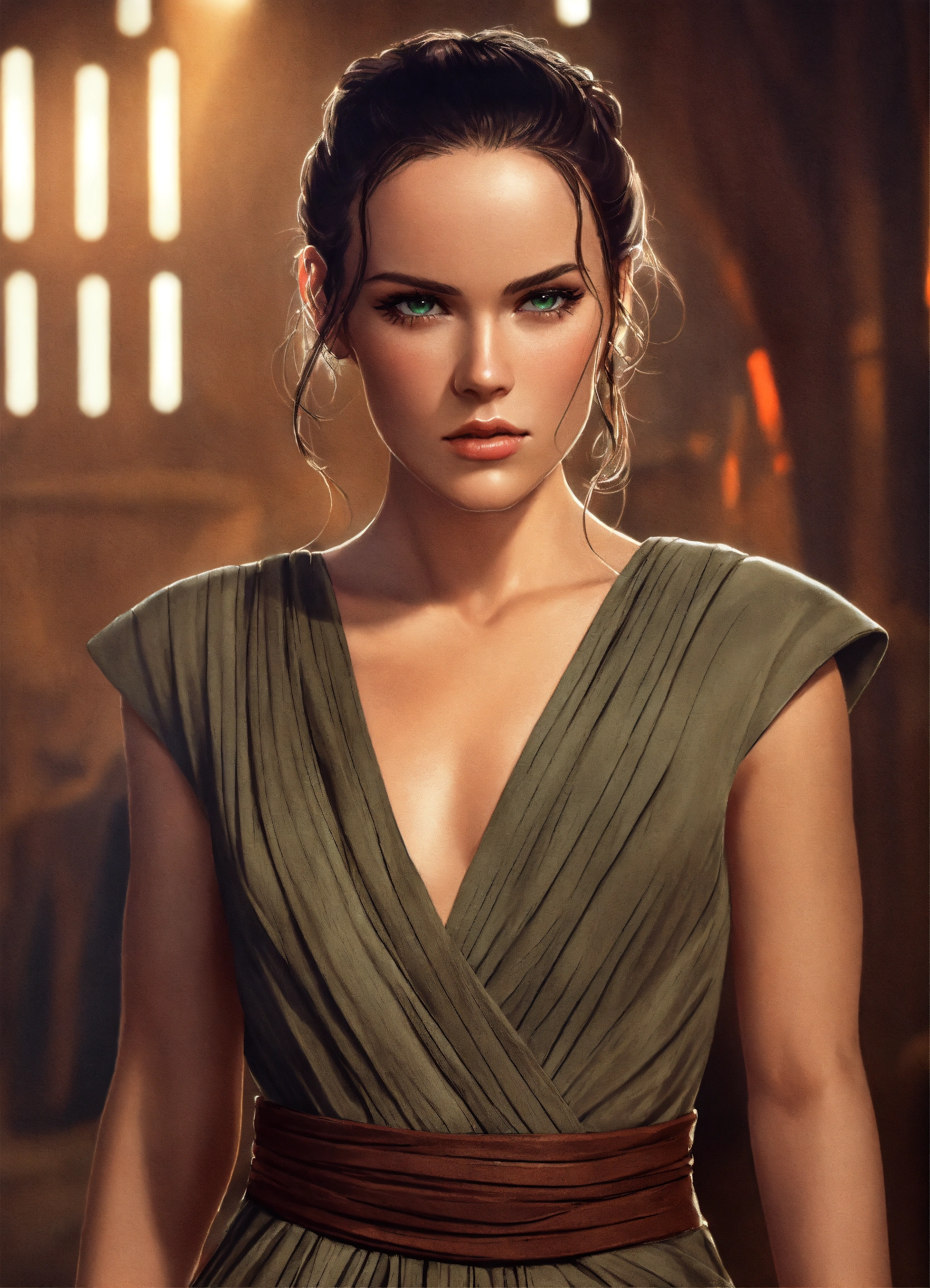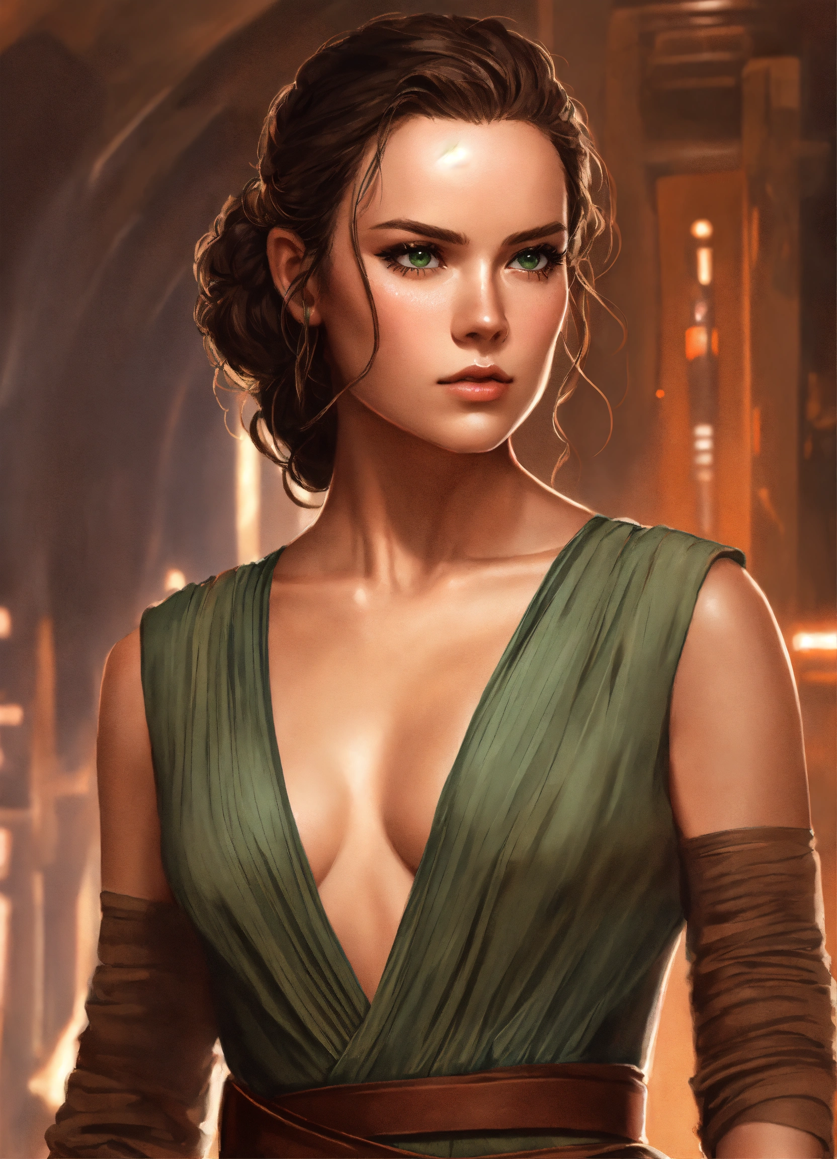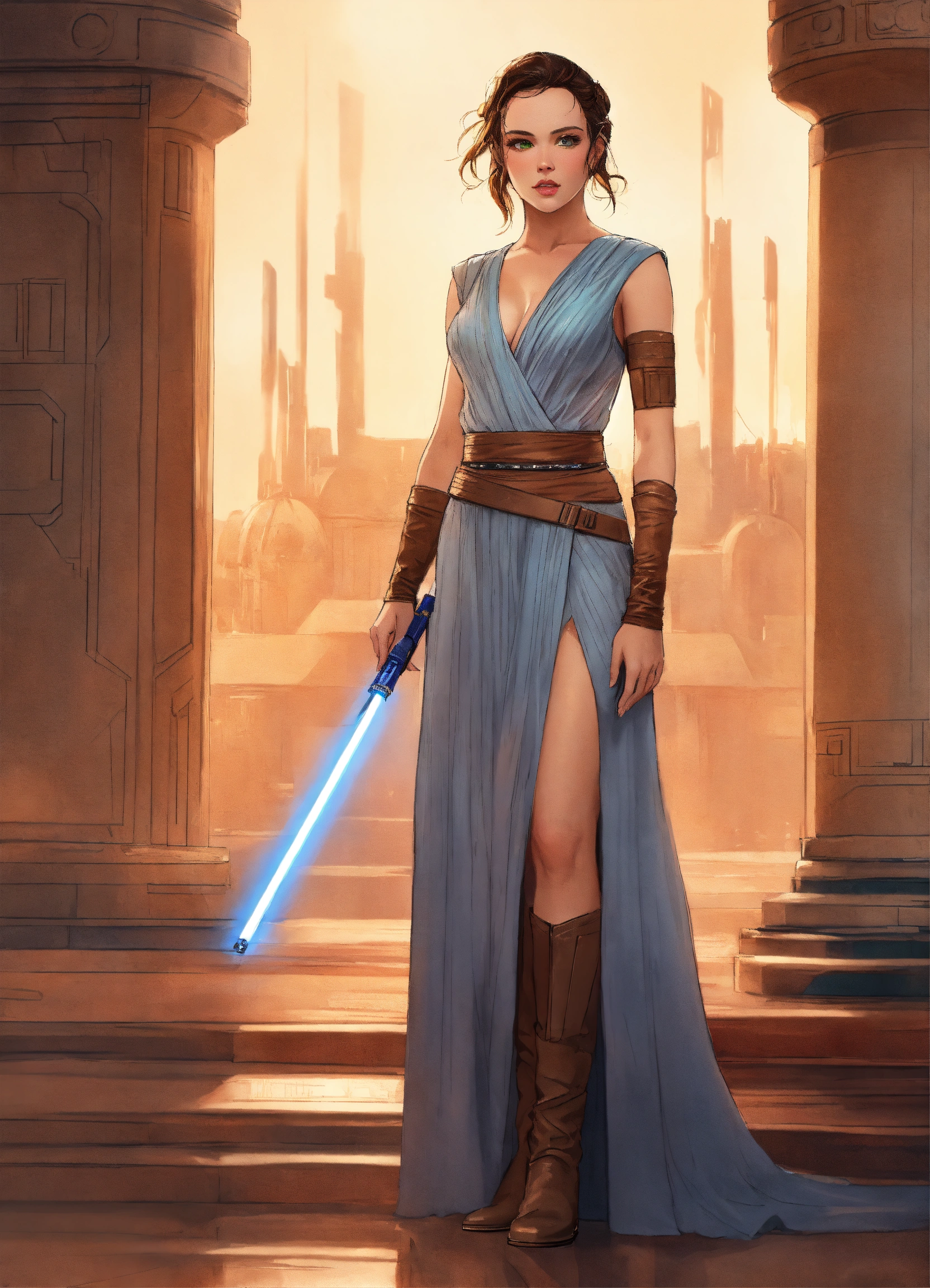 Concept art of rey skywalker in a form-fitting plunge-cut outfit, daisy ridley, maria lucia honan dress, light brown loose hair, green eyes, long floor length dress, long light brown hair, star wars, sabine rich, artgerm, j scott campbell, artgerm, jedi outfit, full body, detailed, hyper realistic, intricate, beautiful, low cut neckline, fitted, tight dress, perfect body, full body, maria lucia honan dress, belt, high leg slit dress, knee high brown boots, jedi, star wars, pleated fabric, daisy ridley, jedi robe, smooth light skin, round face, slim nose, long black eyelashes, perfect detailed face, realistic, cinematic, periwinkle blue and navy chiffon fabric dress