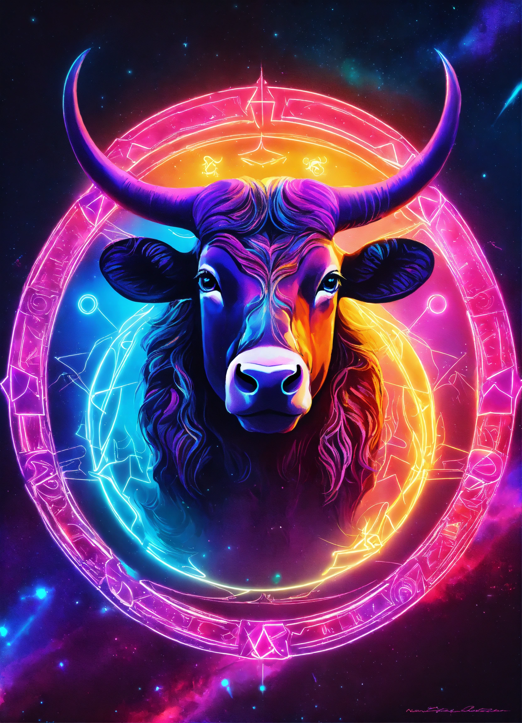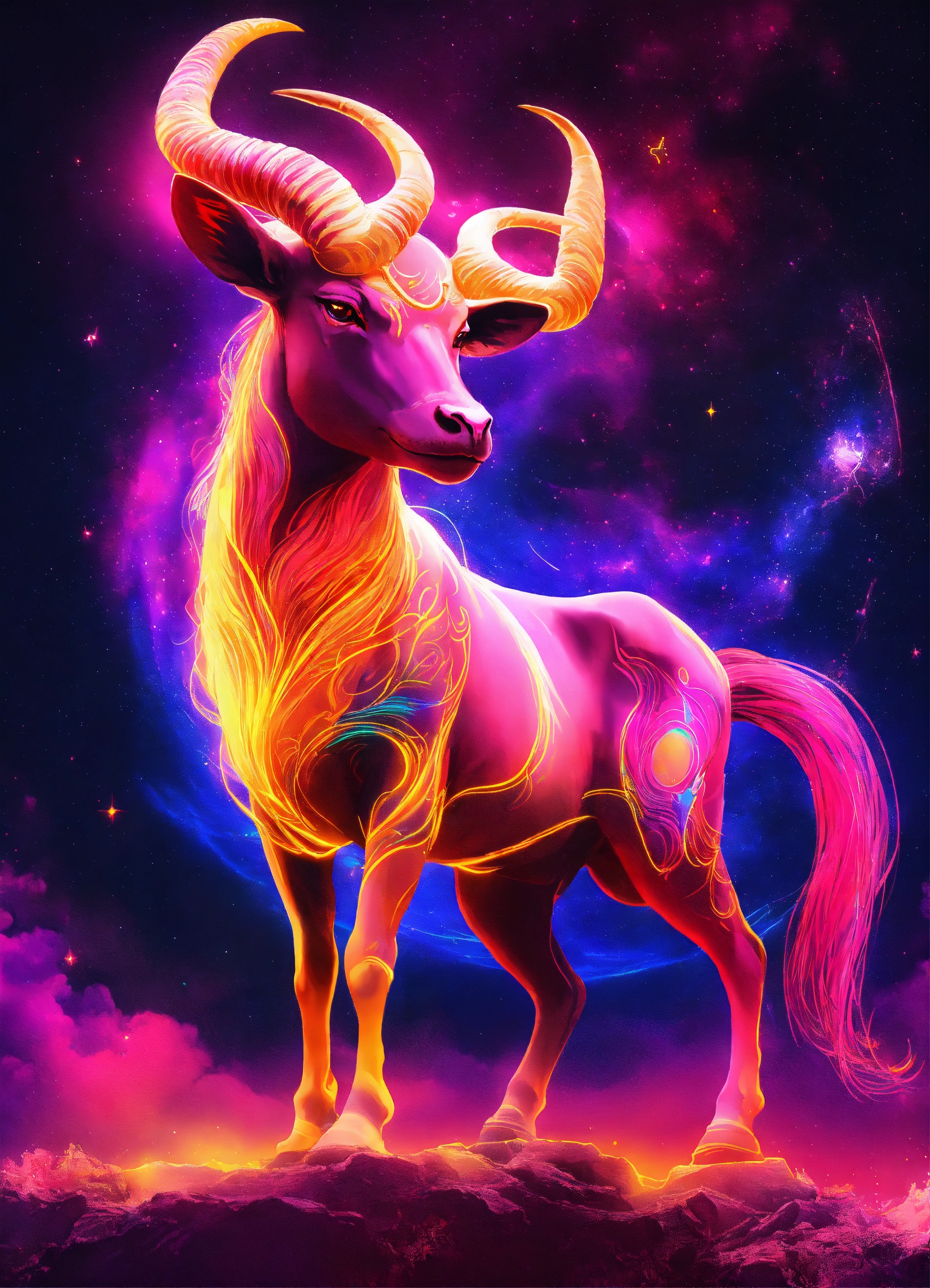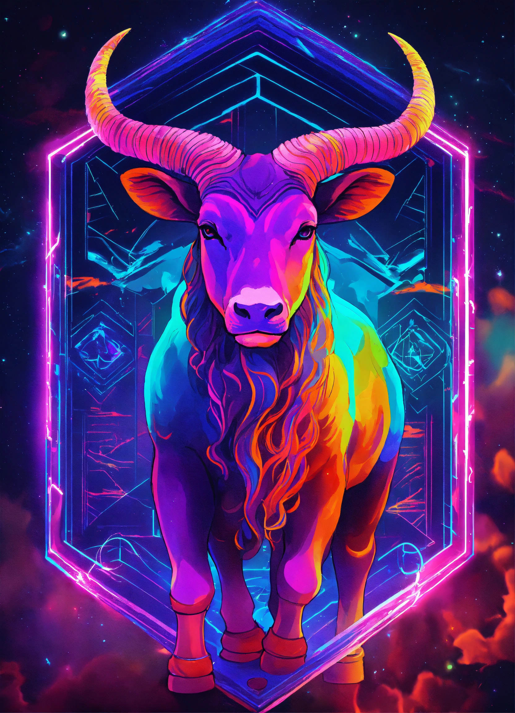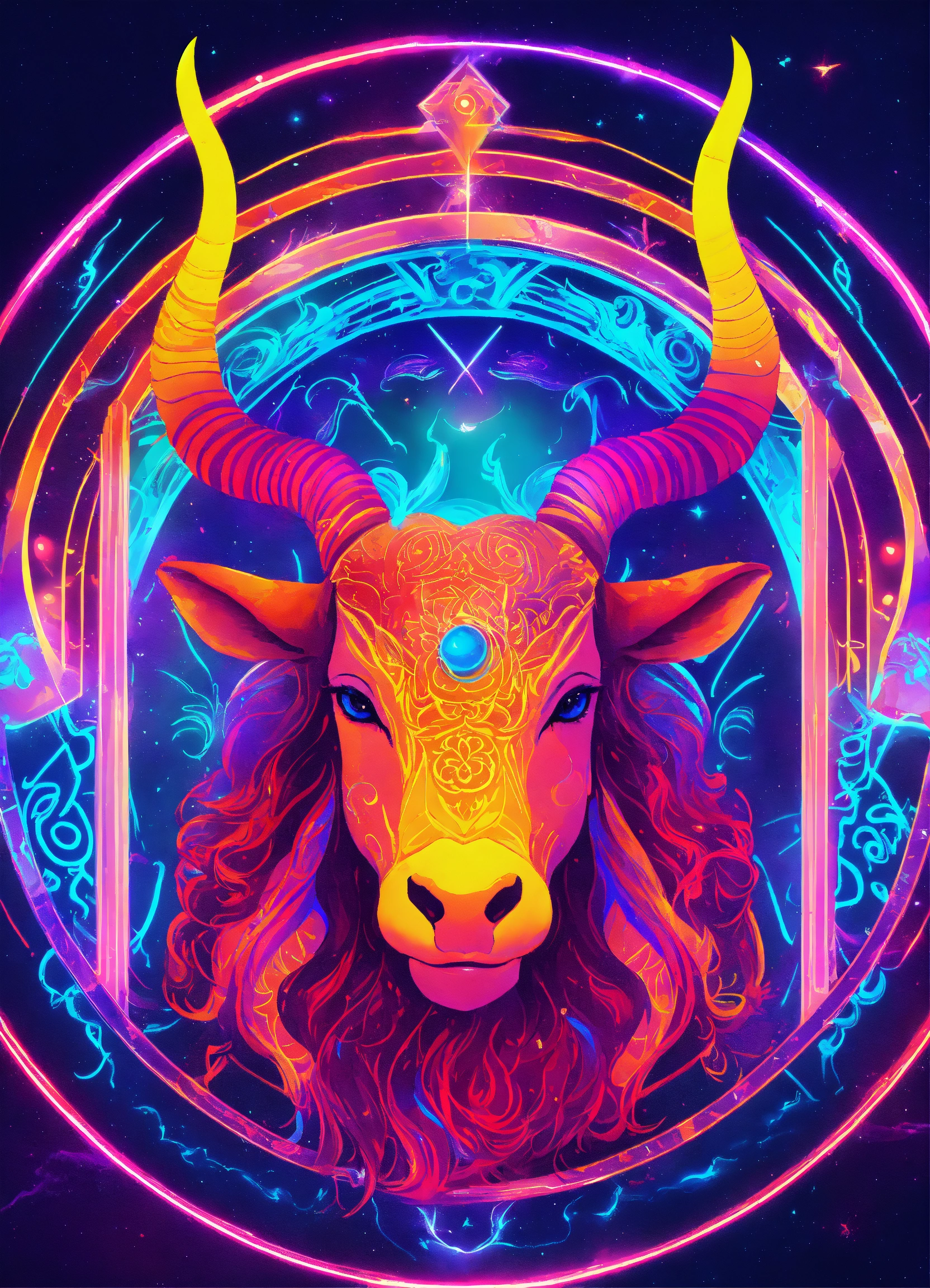 Create a captivating digital art piece that incorporates the capricorn and taurus zodiac signs using vibrant neon colors. blend the traits and symbolism of capricorn, representing ambition and discipline, with those of taurus, symbolizing determination and stability. use a dynamic composition and a palette of electrifying neon hues to bring these celestial energies to life, making the artwork visually striking and captivatin