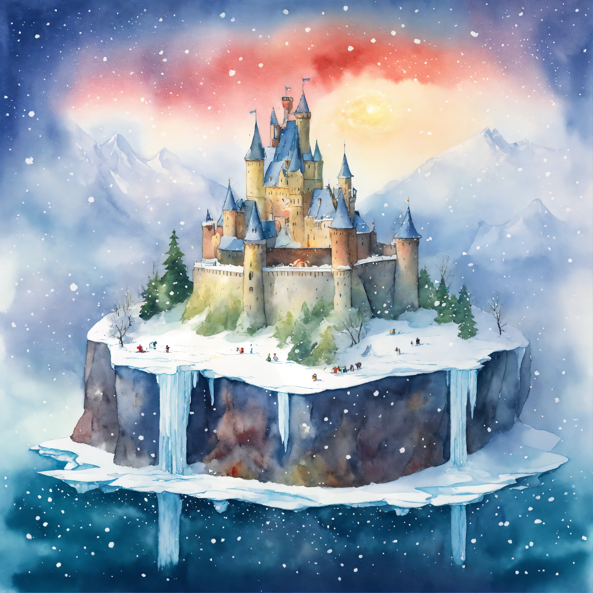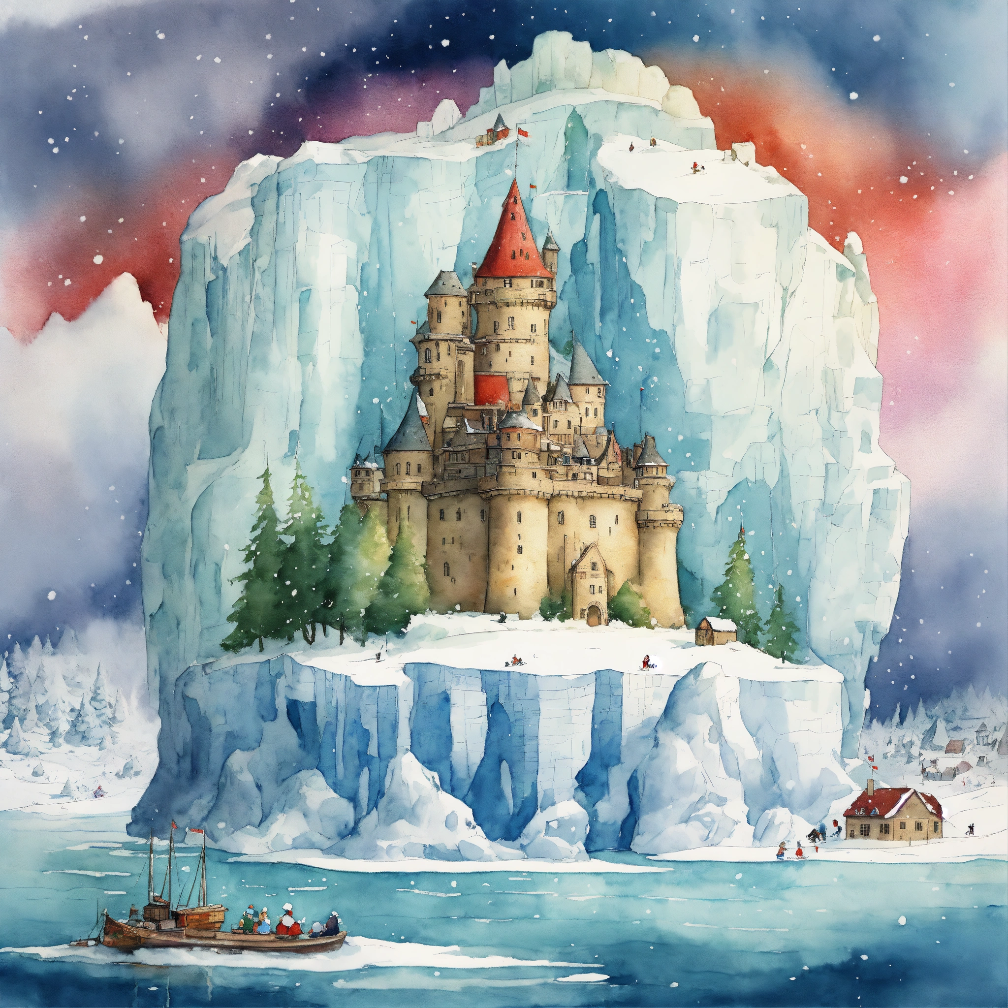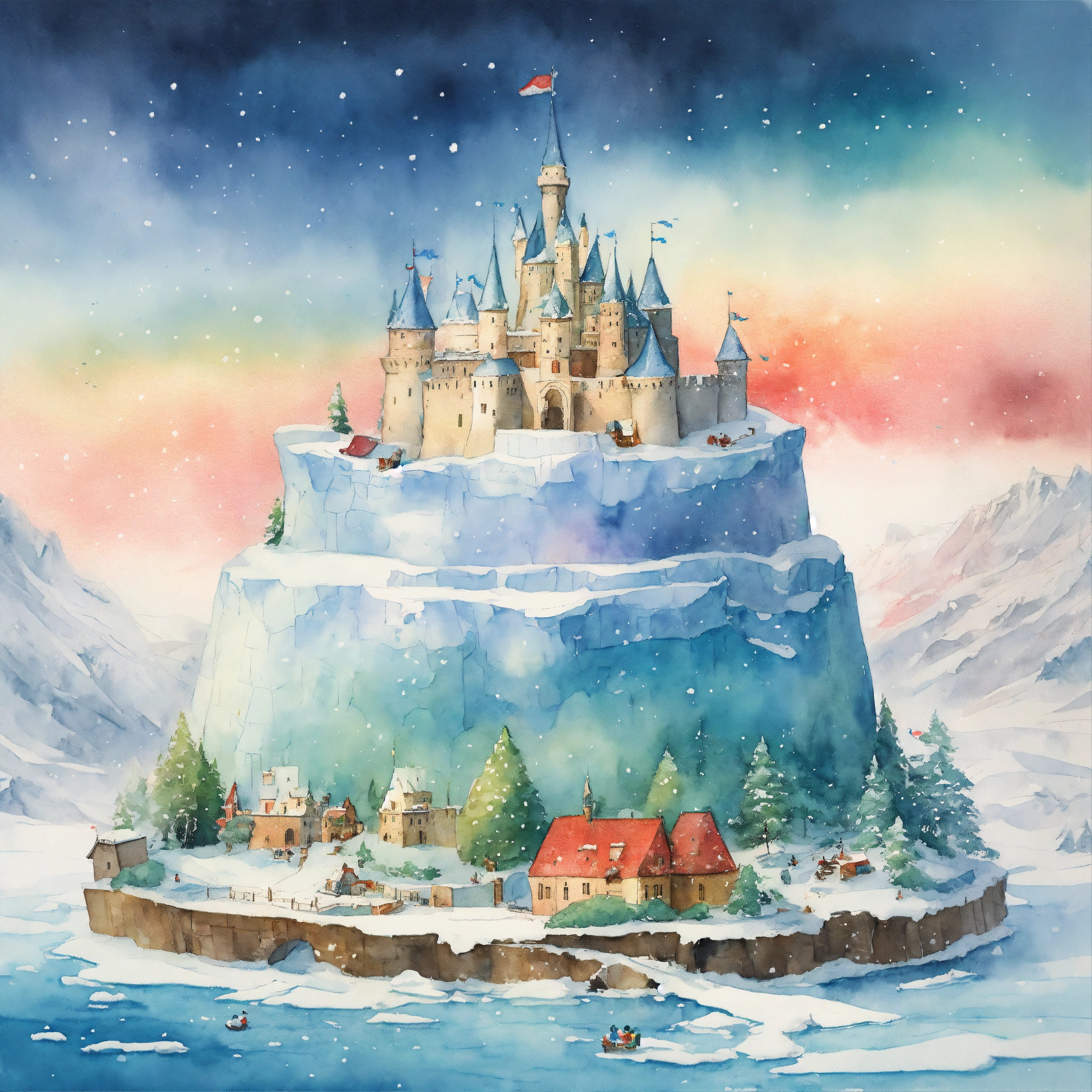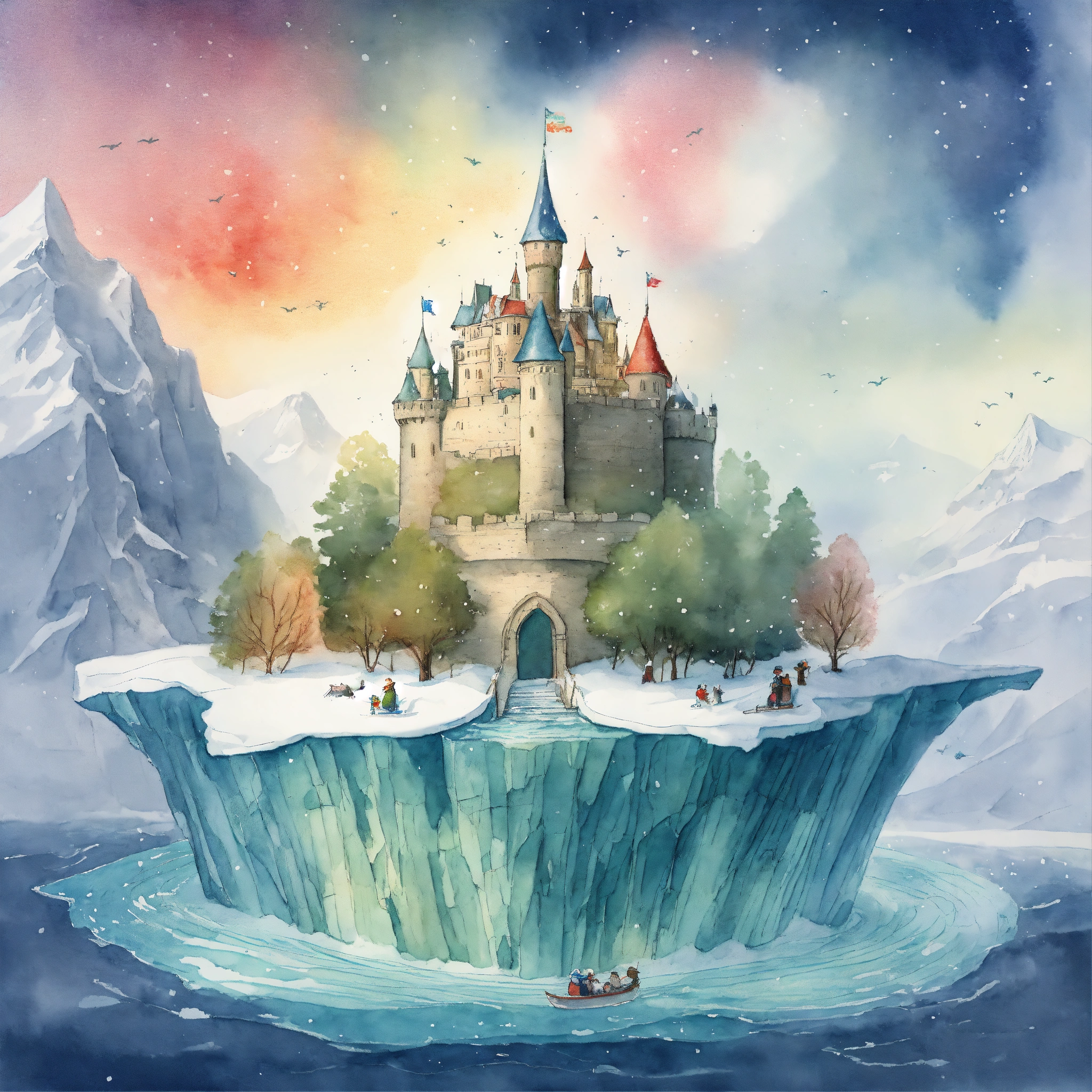 A detailed illustration of a castle on an floating iceberg in a snow storm 360 degrees. the castle iceberg is divided into four sections snow, forest, north pole, kids story book style, colourful colors, watercolor painting, kids storybook by beatrix potter