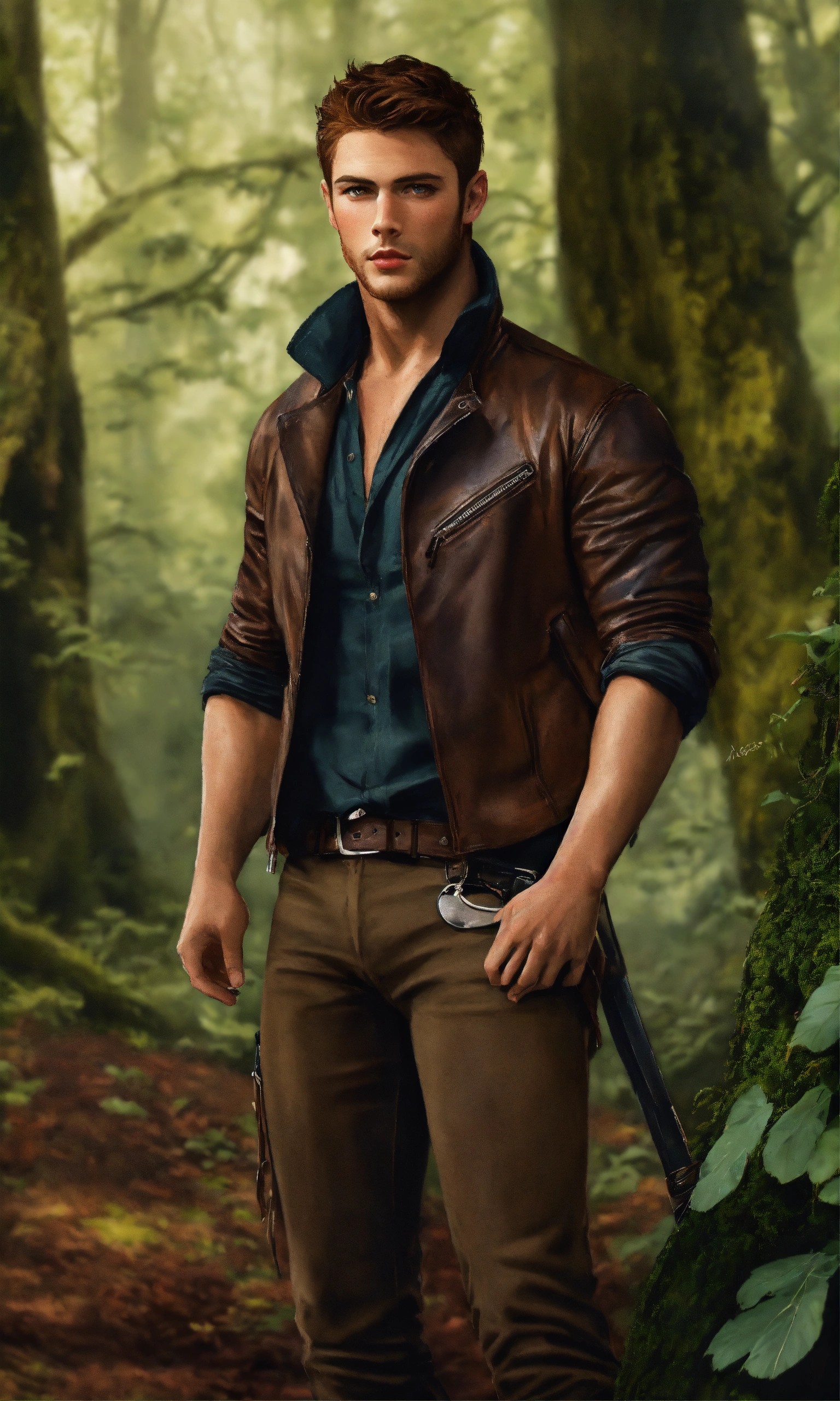 Concept art of handsome period man, poldark, poldark, megan fox, jamie fraser, outlander, period man in forest farm, short ginger red hair, very tan skin, hazel green eyes, jenson ackles, jenson ackles, realistic illustration, sabine rich, artgerm, j scott campbell, perfect body, sharp facial features, slim nose, black eyelashes, perfect full lips, sharp jawline, sharp high cheekbones, dark brown weathered leather jacket, perfect detailed face, cinematic, full body, full body outfit view, flower forest cottage background, full body, fitted black weathered pants, tight fitted knee high boots, detailed, realistic illustration, colonial american, casual, dean winchester, short straight hair, dean winchester, short buzz cut hair, black fitted shirt, dean winchester's leather jacket, hyper realistic, dark weathered clothes, dark fabric, dark, dean winchester, jenson ackles face, buzz cut, straight hair, period man, straight hair, dean winchester, black pants