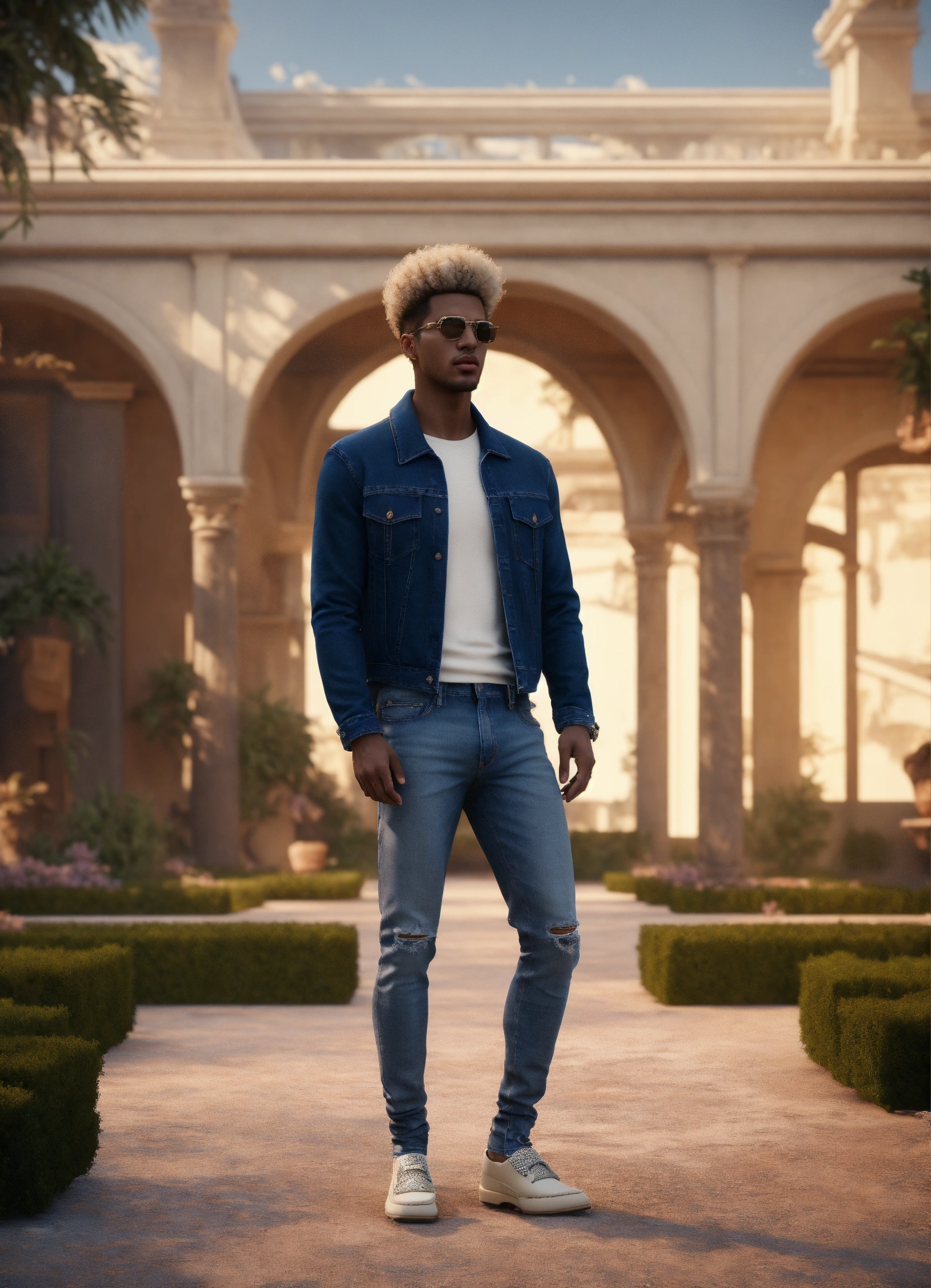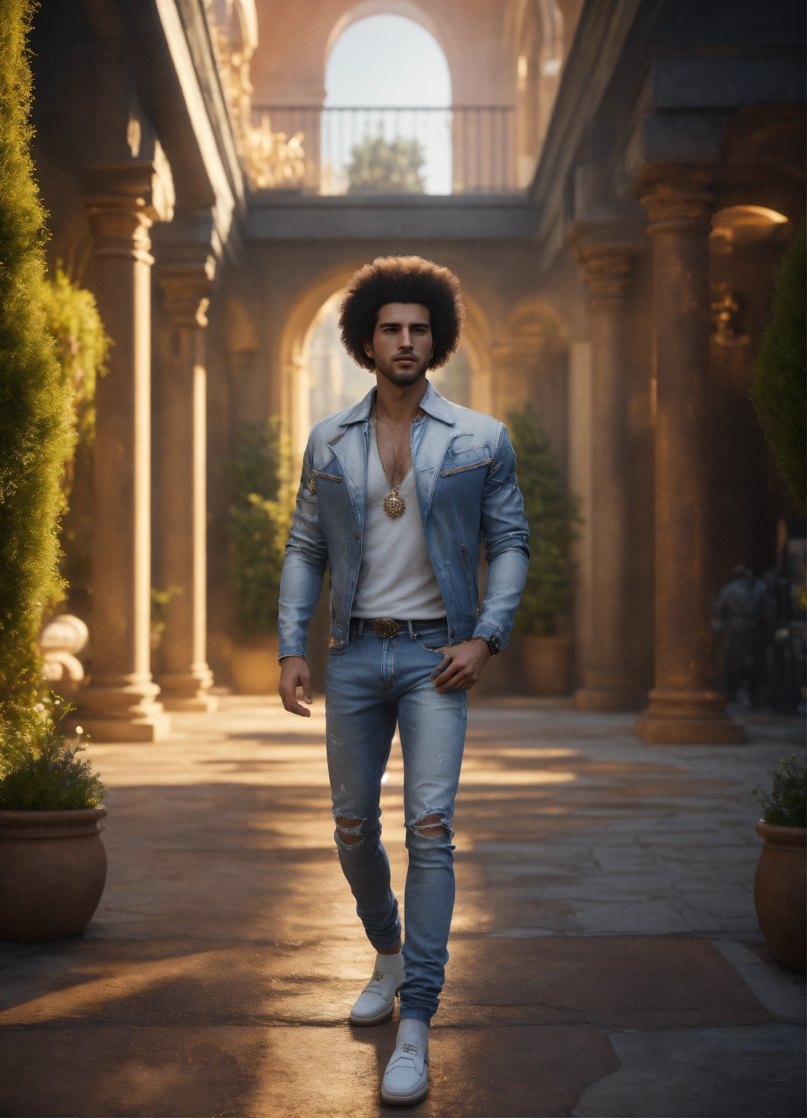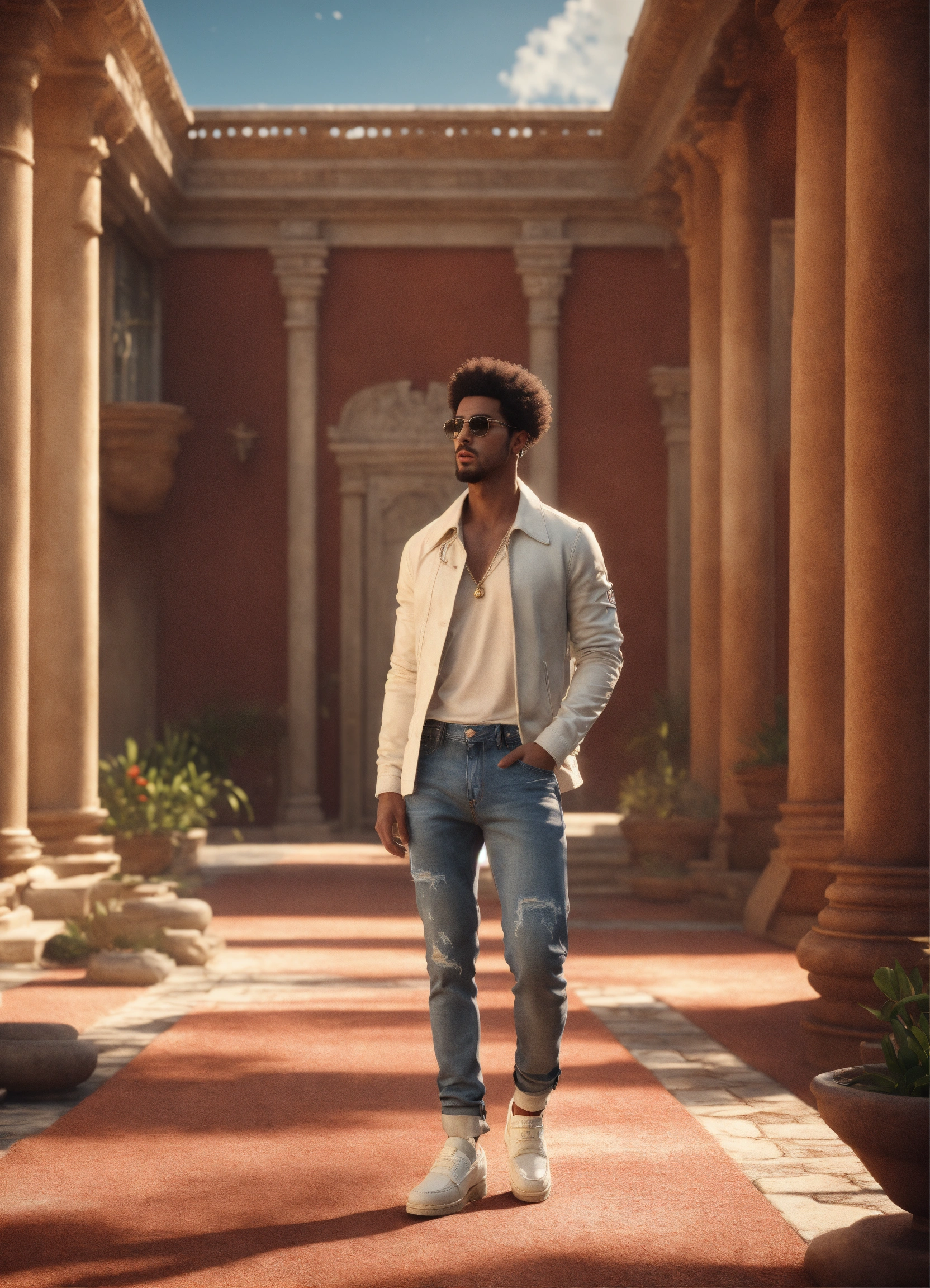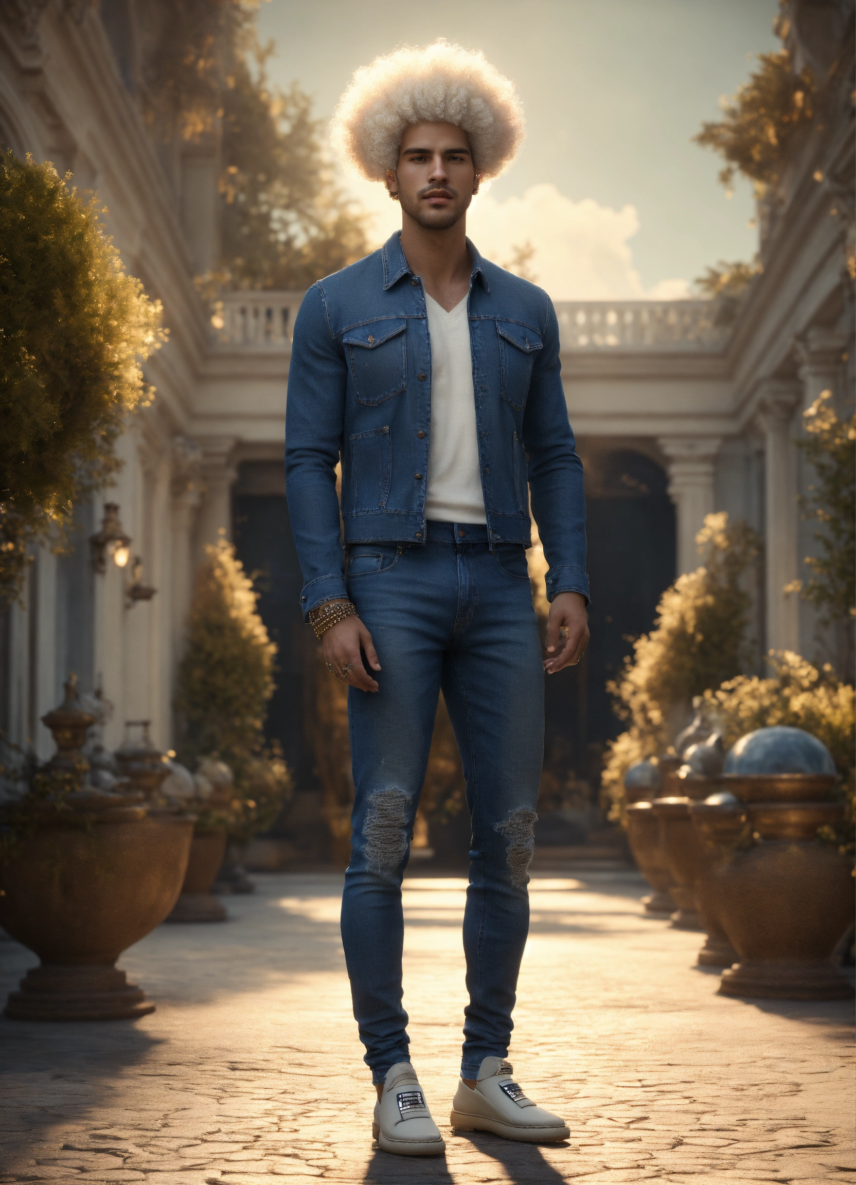 Handsome 27-year-old male. with a white short, afro. tall build, dressed in haute couture jeans and loafers, misischievous demeanor, standing in extravagant courtyard, on alien planet, early afternoon, cinematic style, high detail, realistic physics, photorealistic, unreal engine, hdr, 8k