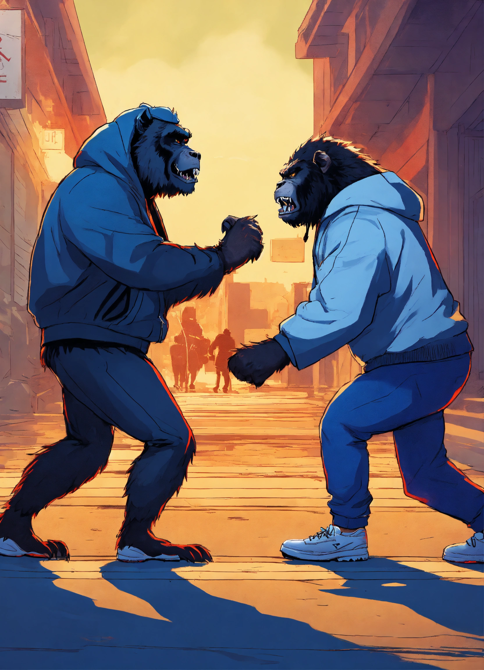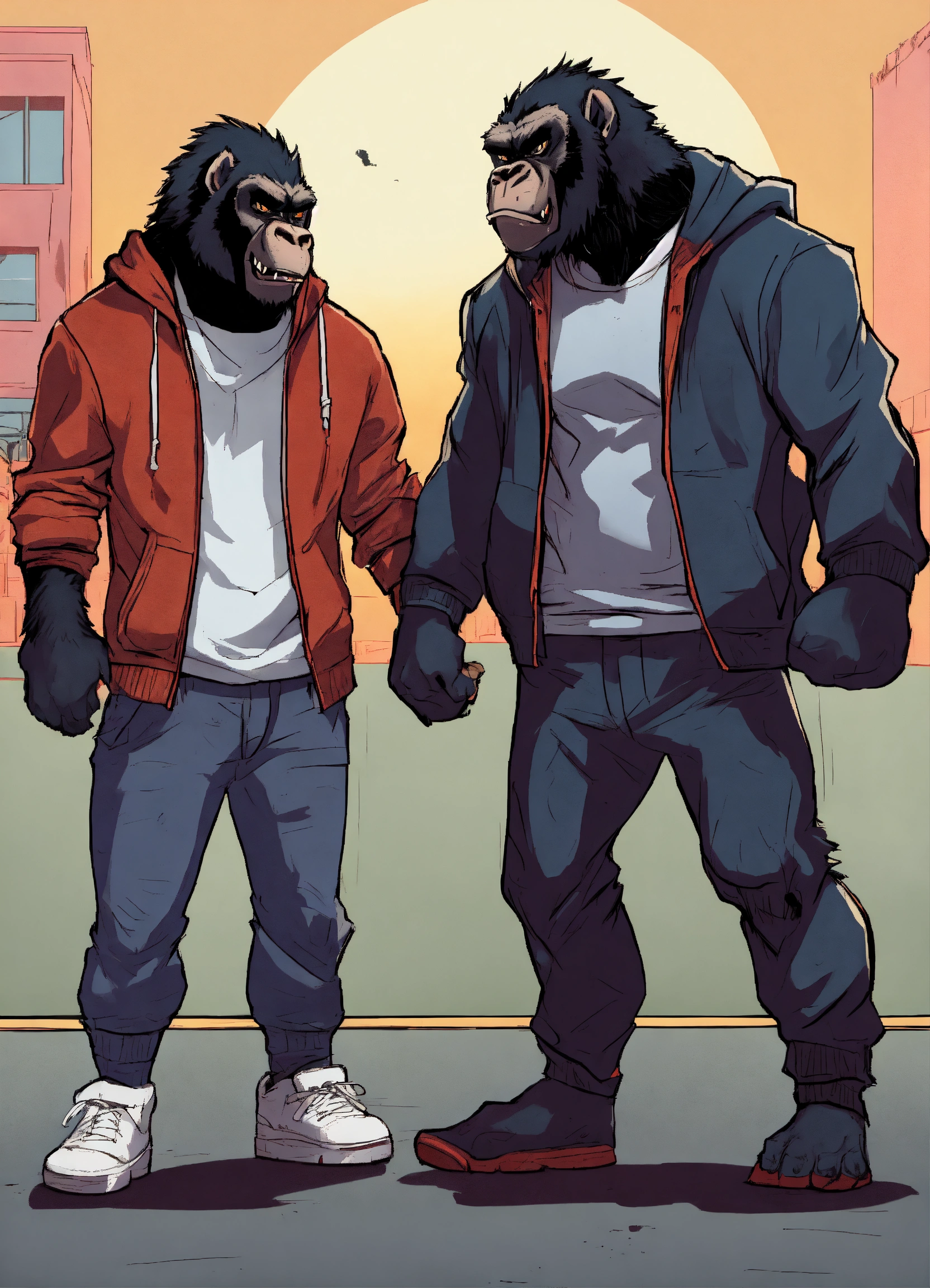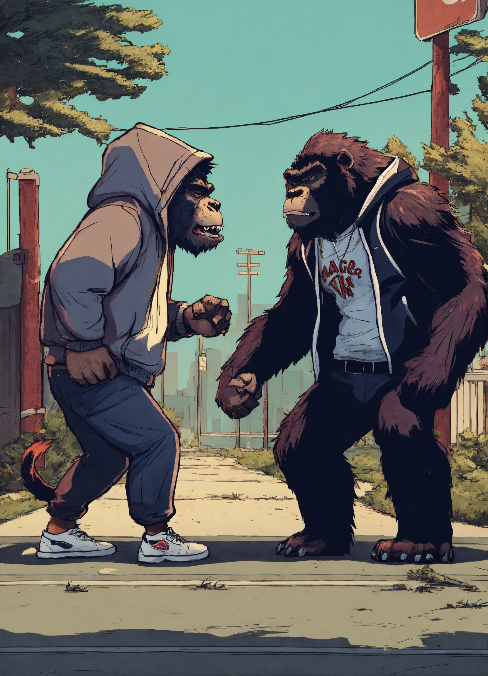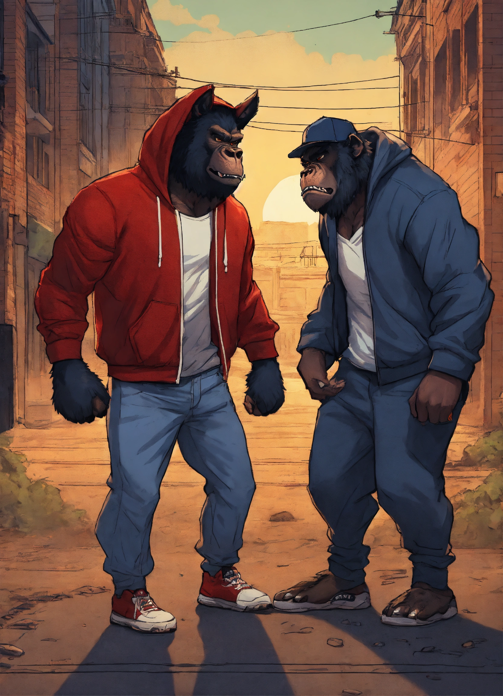 Gangster werewolf and gangster gorilla wearing hoodies and baseball caps mad arguing walking away from each other