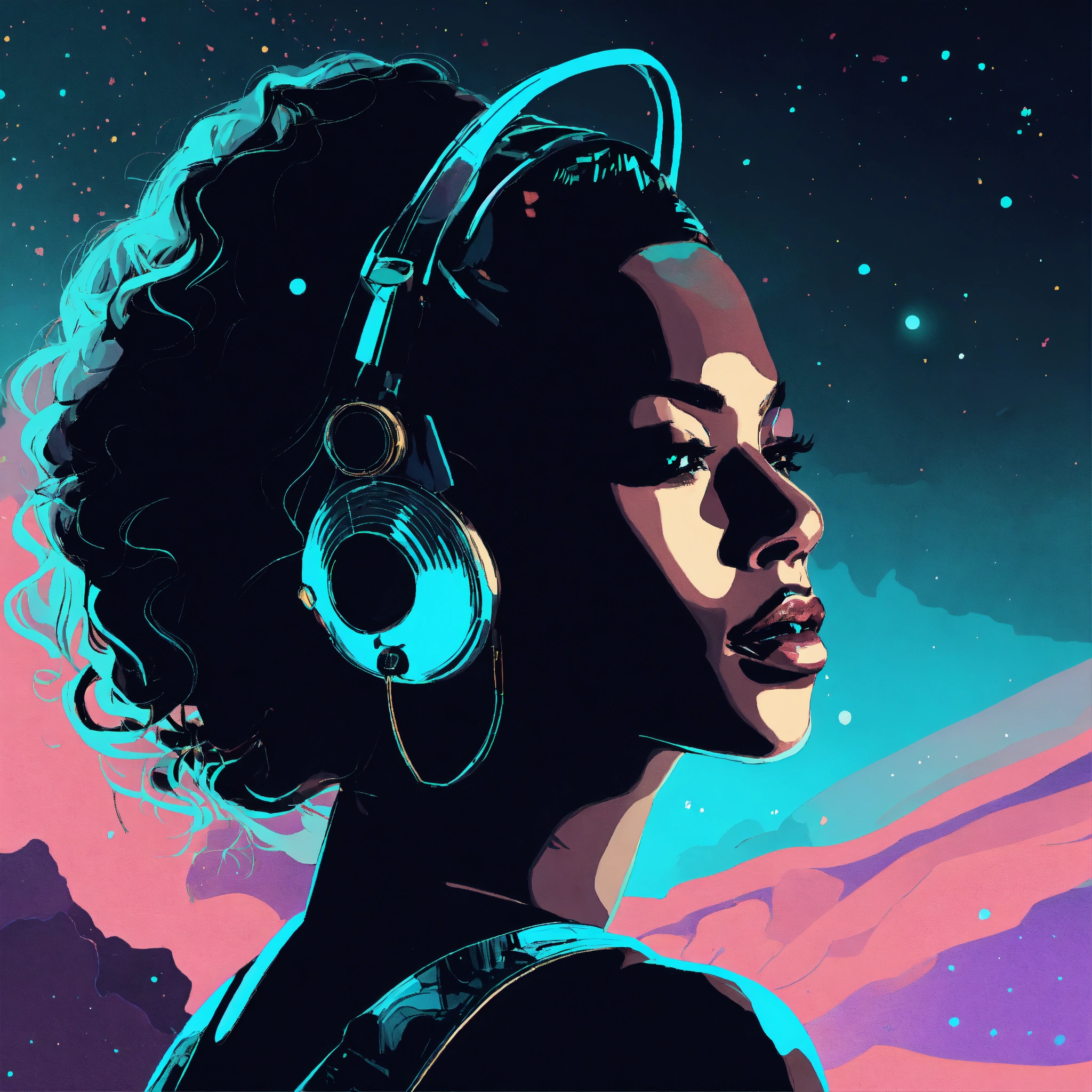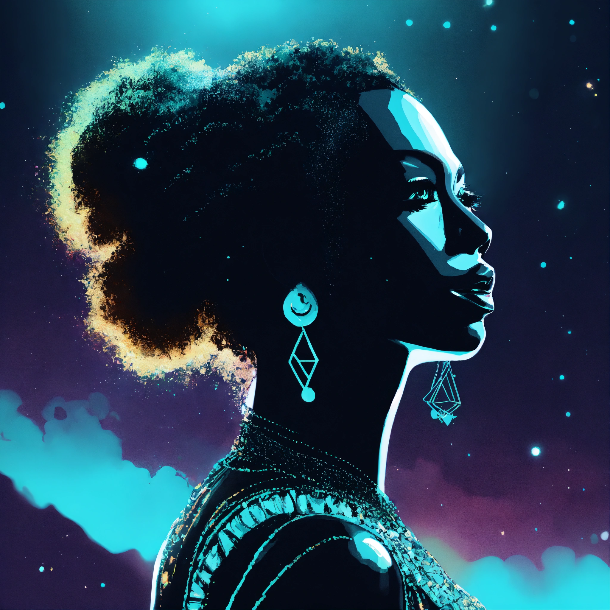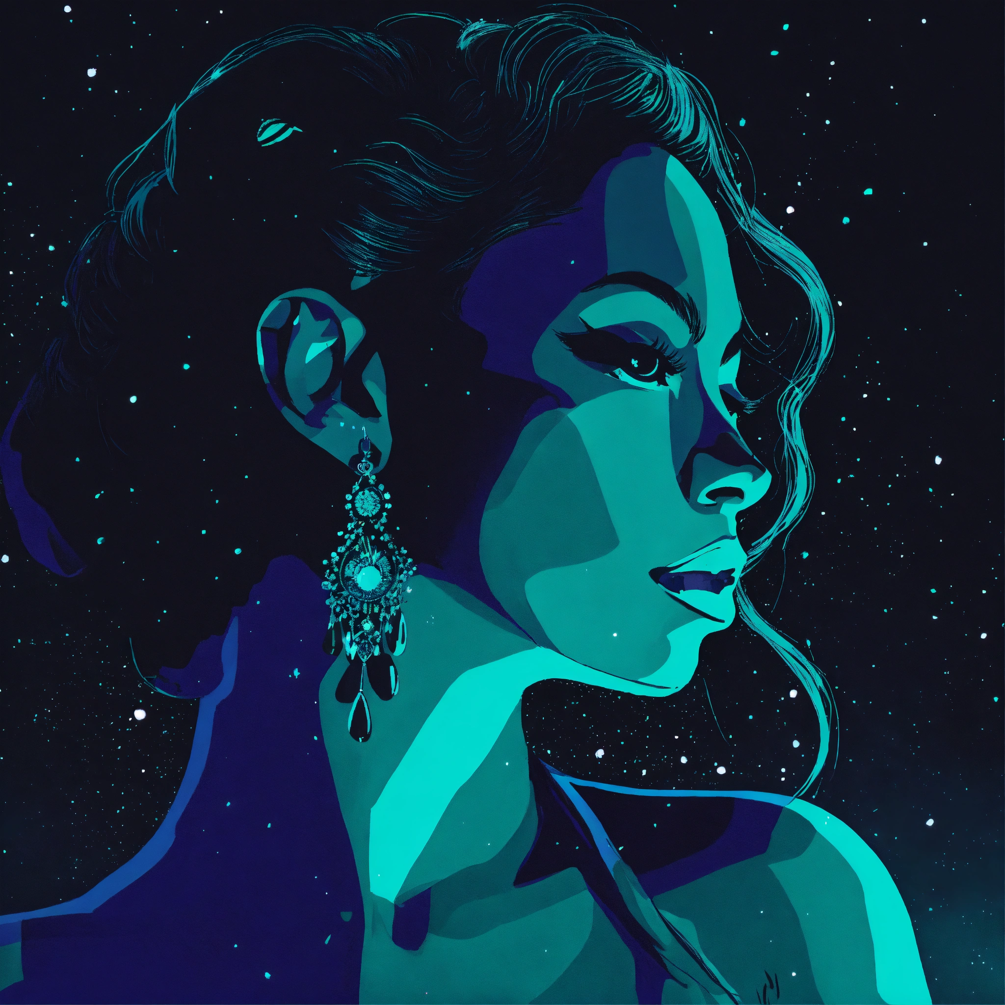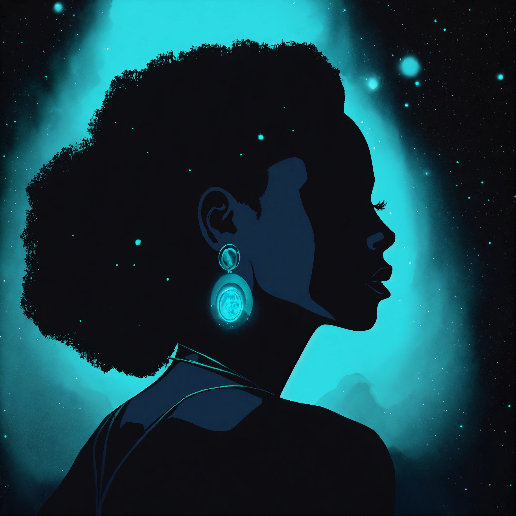 Beyonce, illustration, 2d, deep space dark black and aqua flat background, flat image, mysterious aura, face, side view, dark silhouette