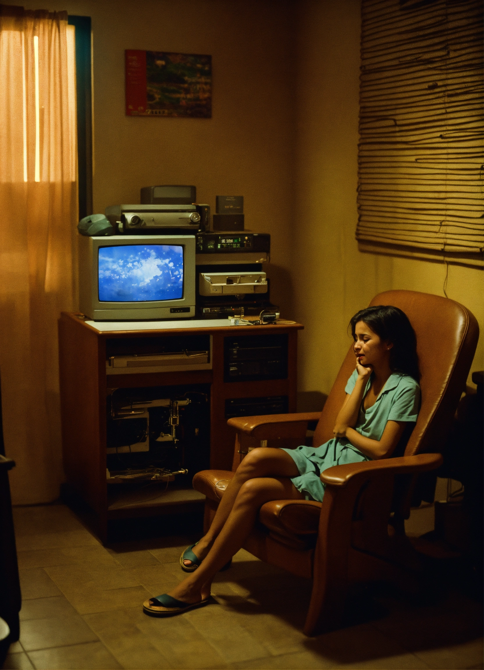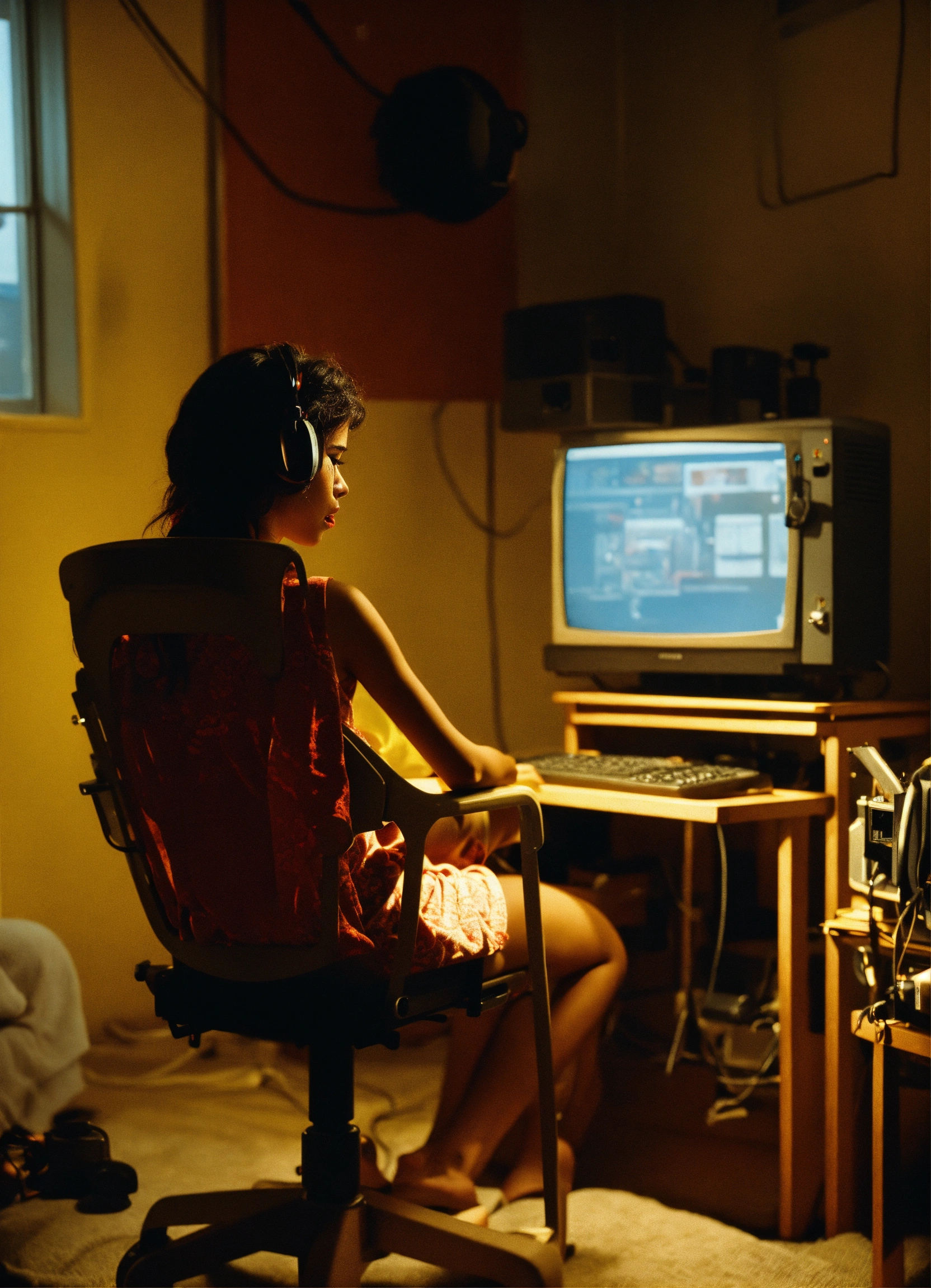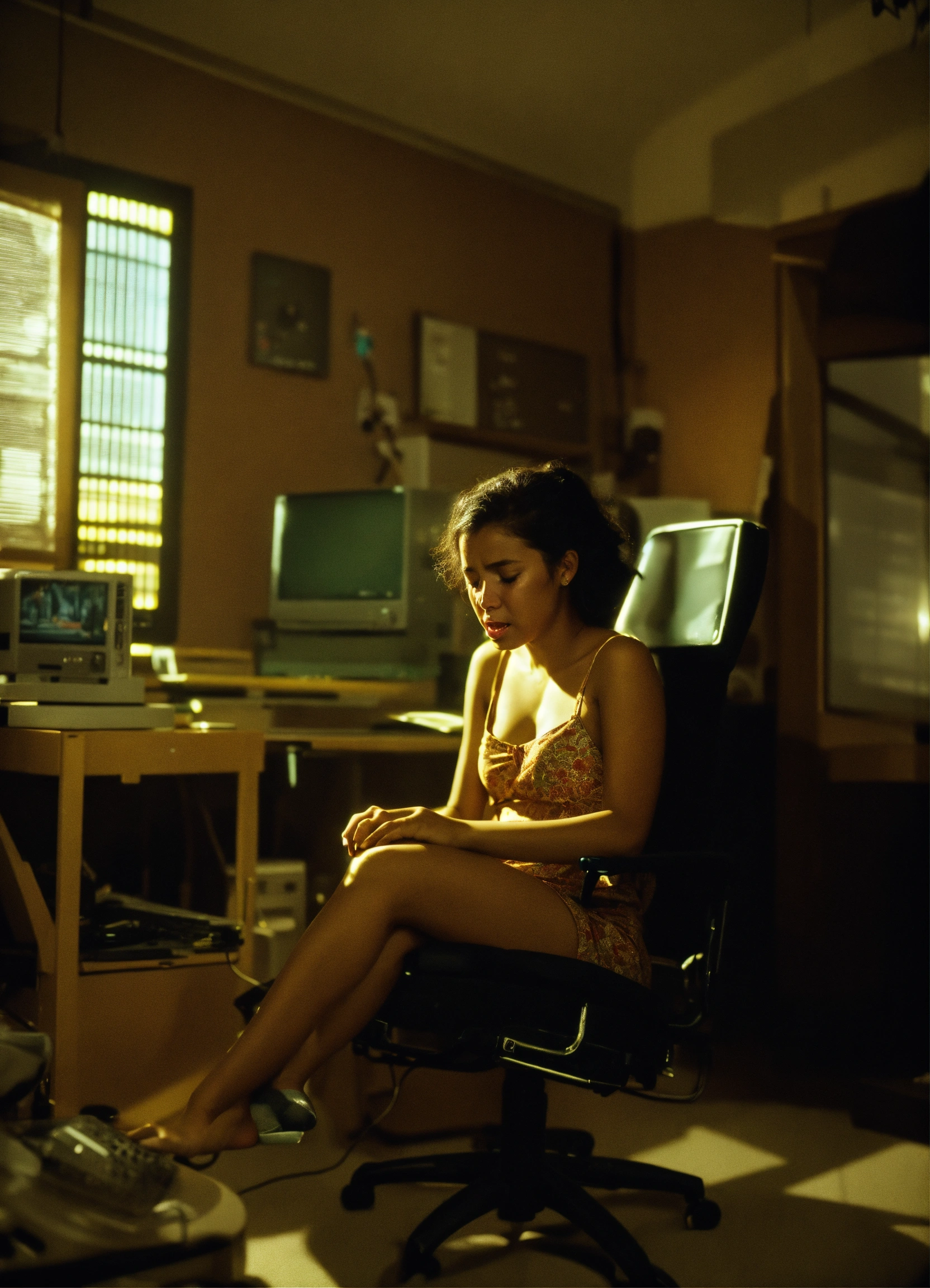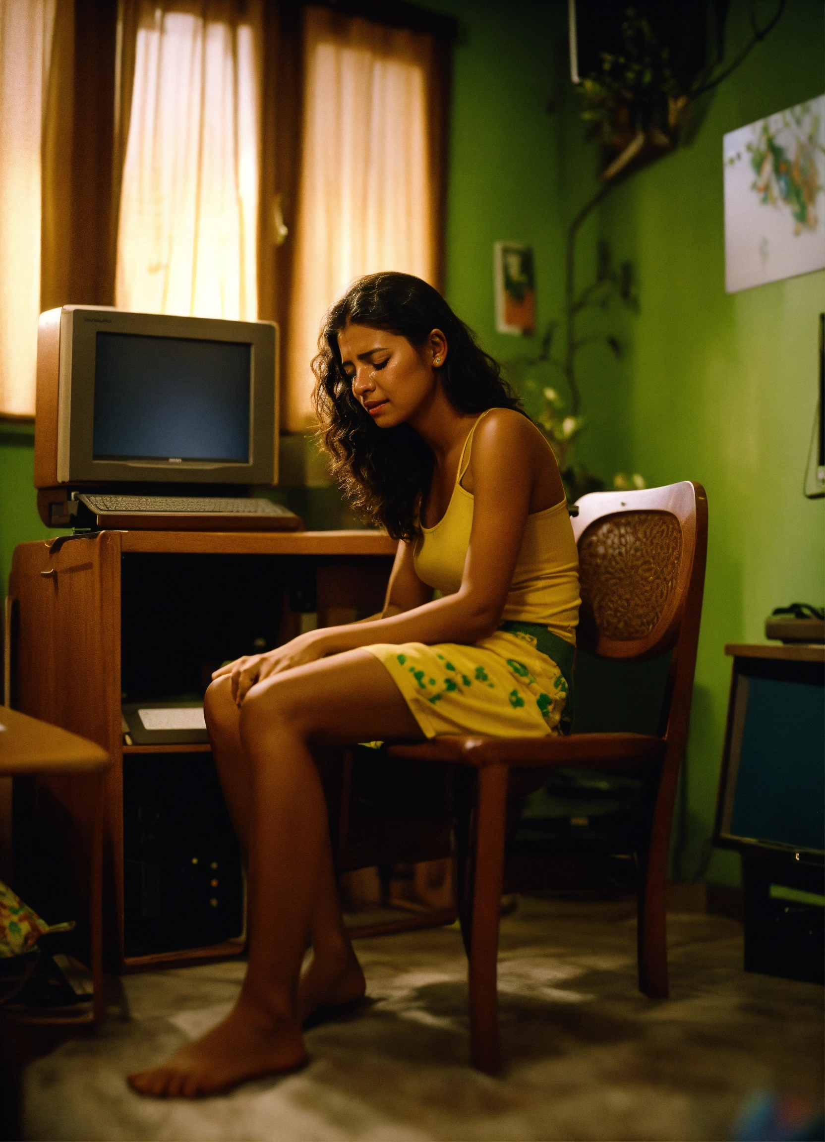 A brazilian girl sitting in a chair in front of a brazilian computer in the communal apartment, crying, 8k, ultra realistic, details anatomy, cinematic lighting, photographic, eastman kodak color negative film 5251 50t shot on panavision super ps . no arms