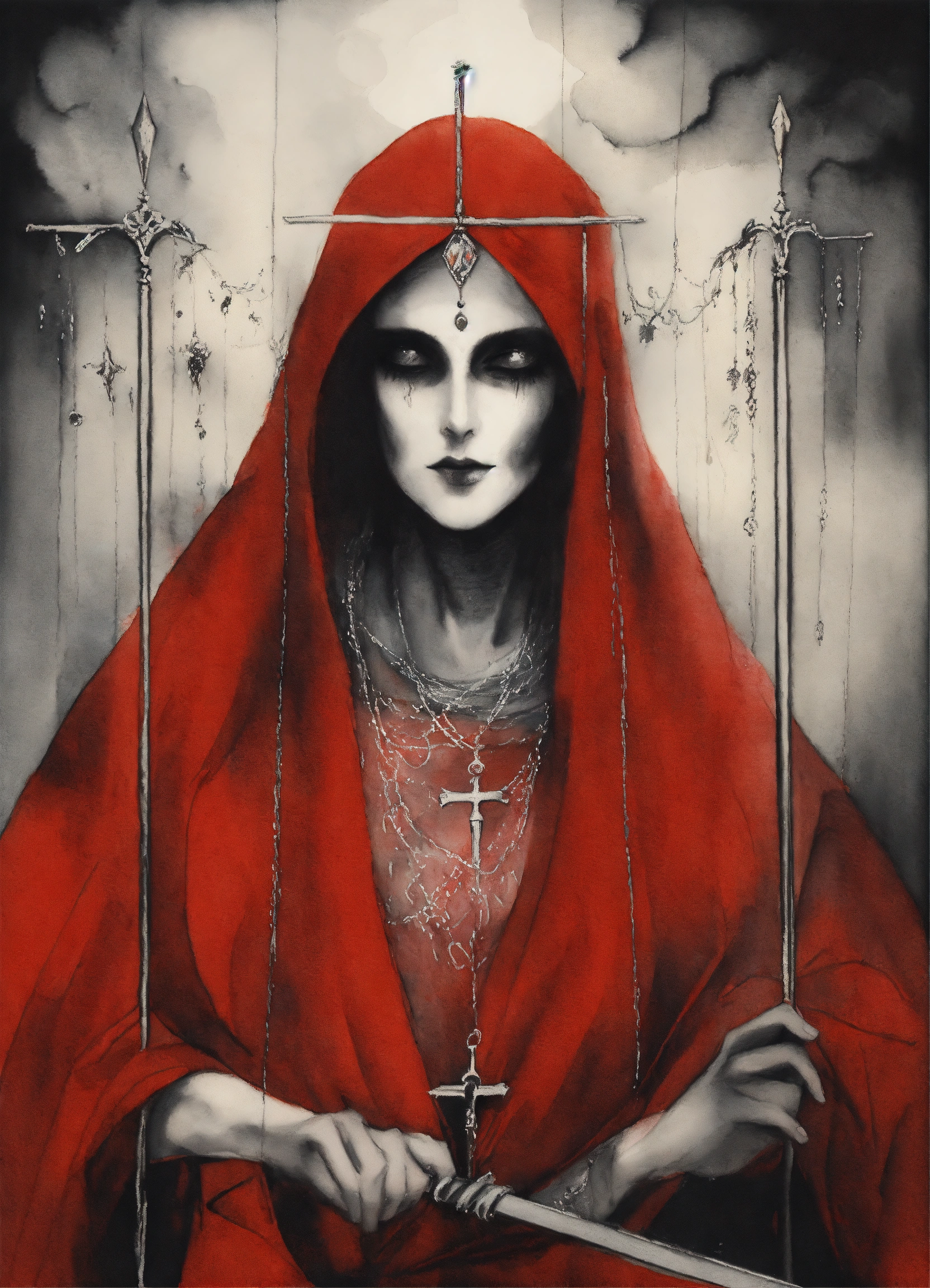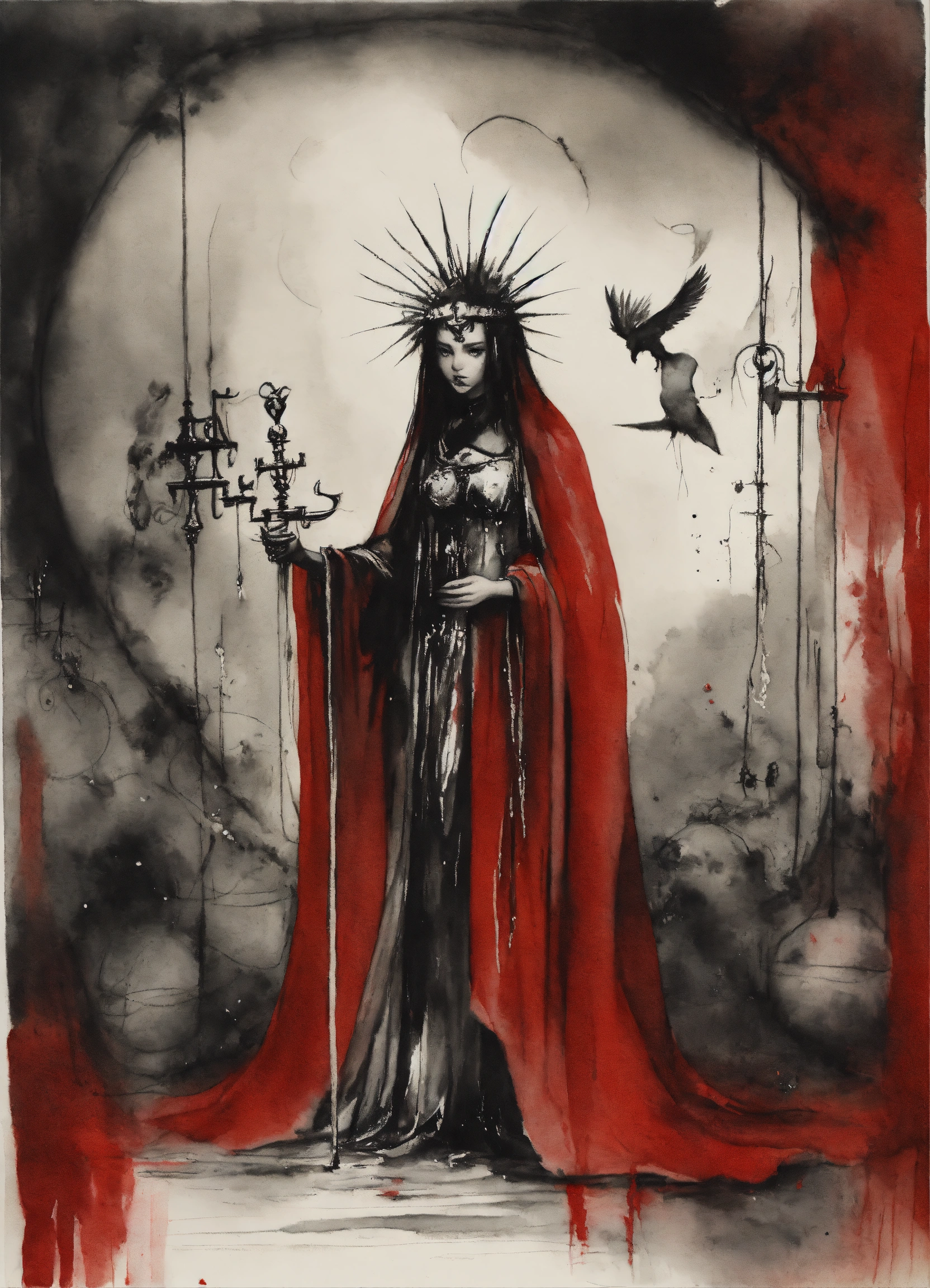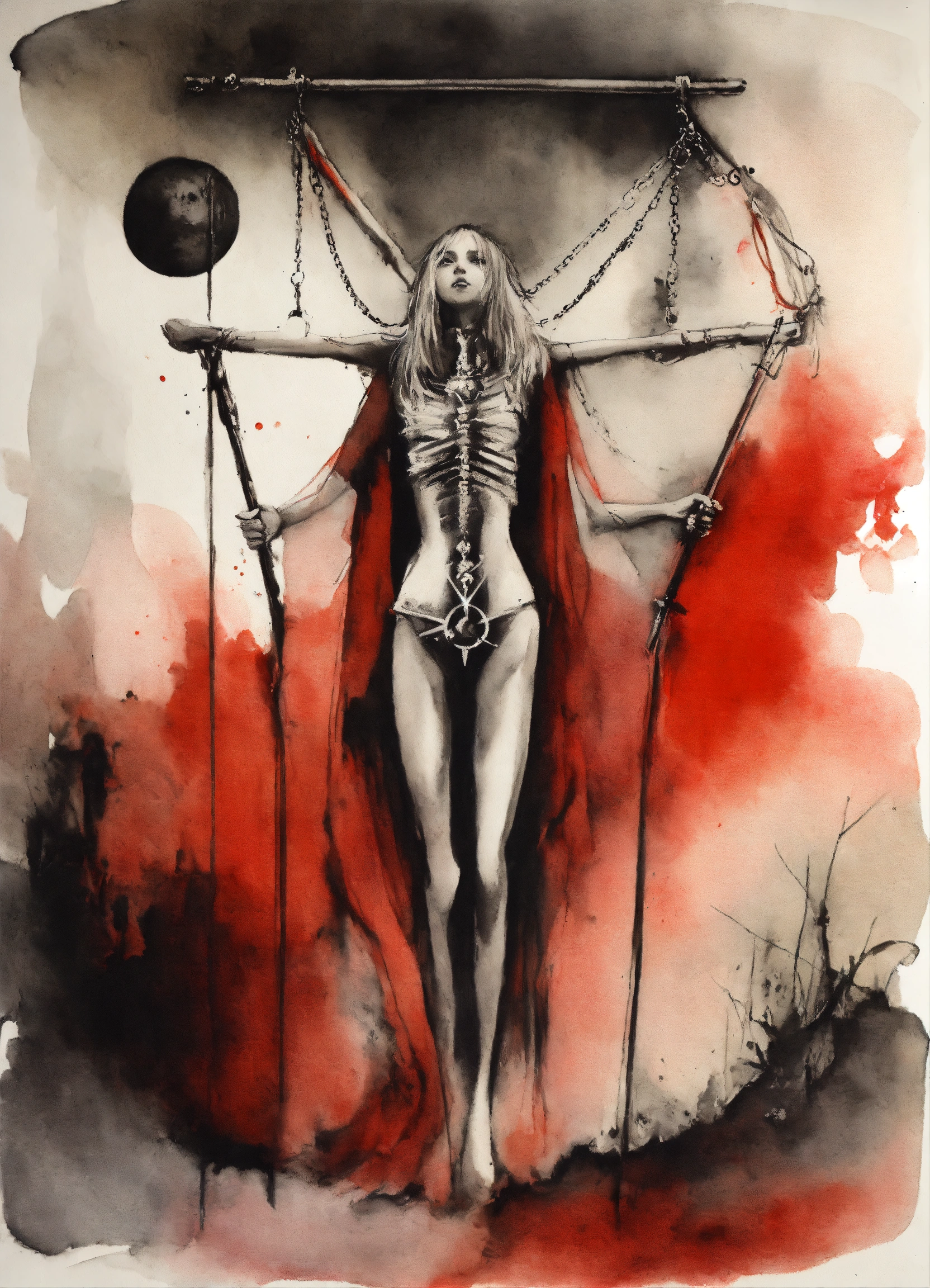 Stephen gammell style, dessin, aquarelle, aquarelles, noir et blanc et rouge, de marais, de sombres créatures, dégoulinant, representation of the justice card, in the tarot deck