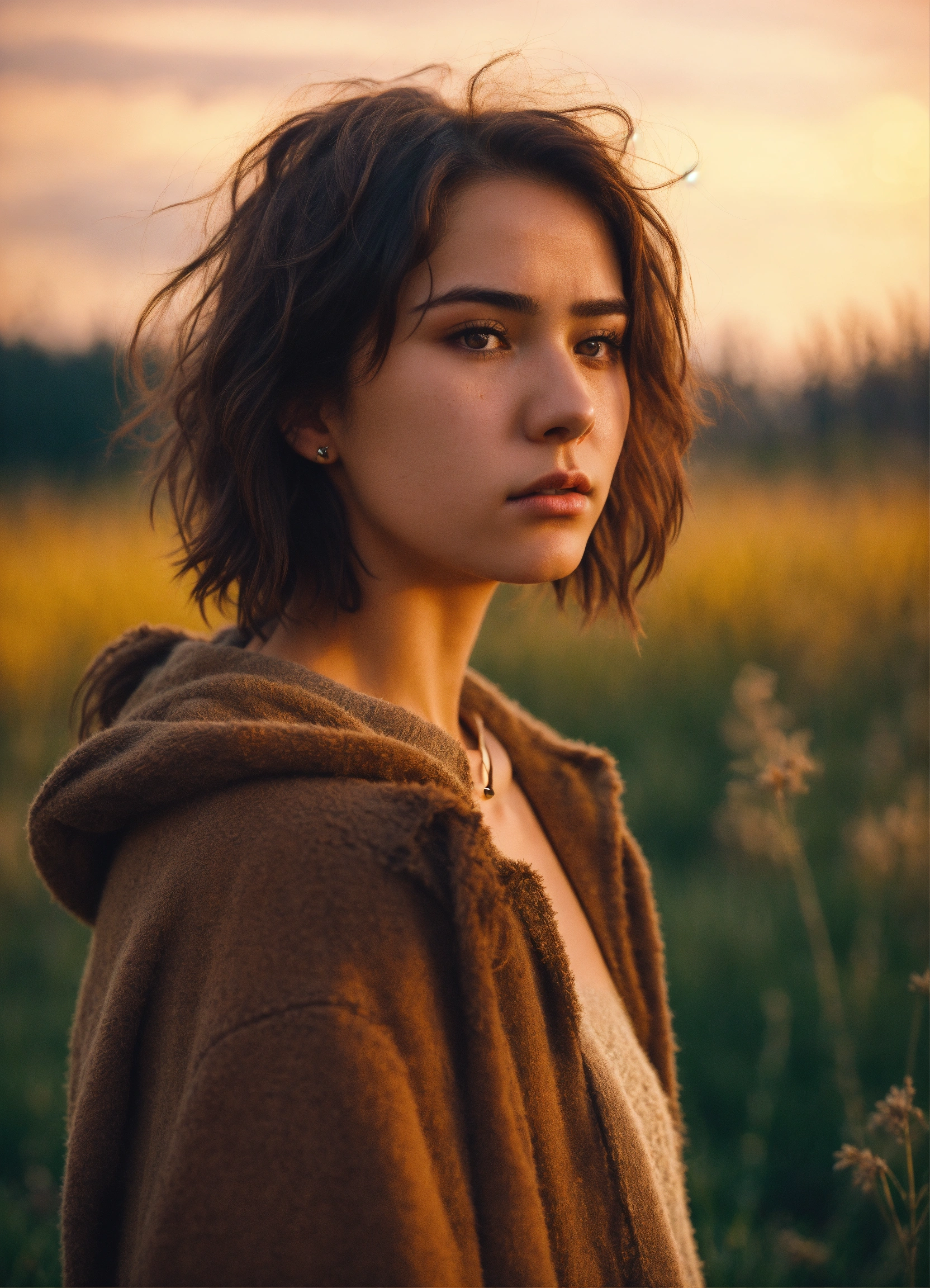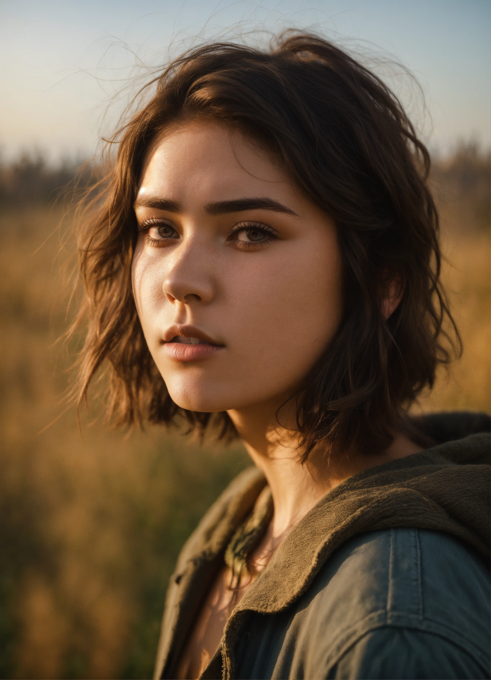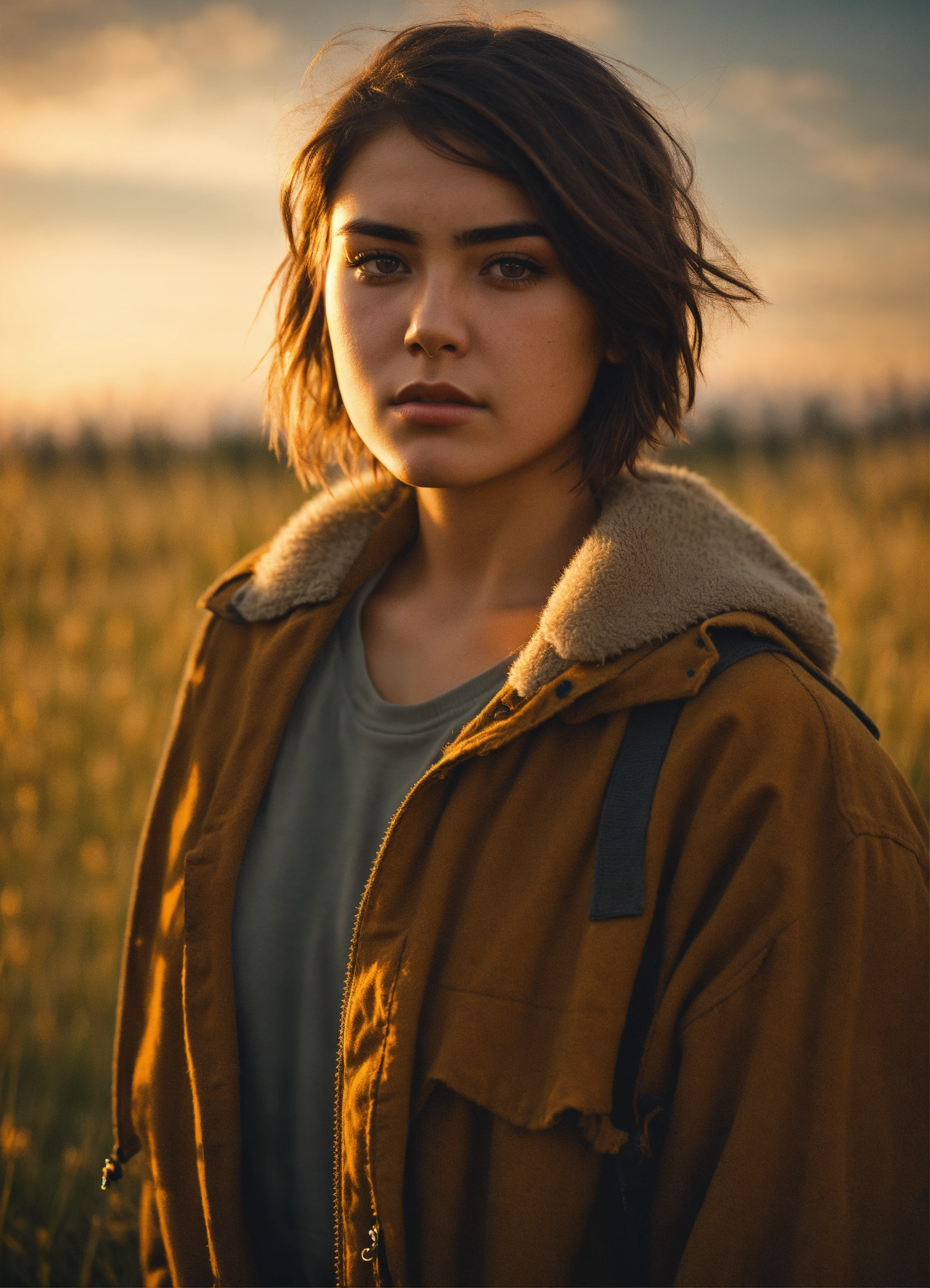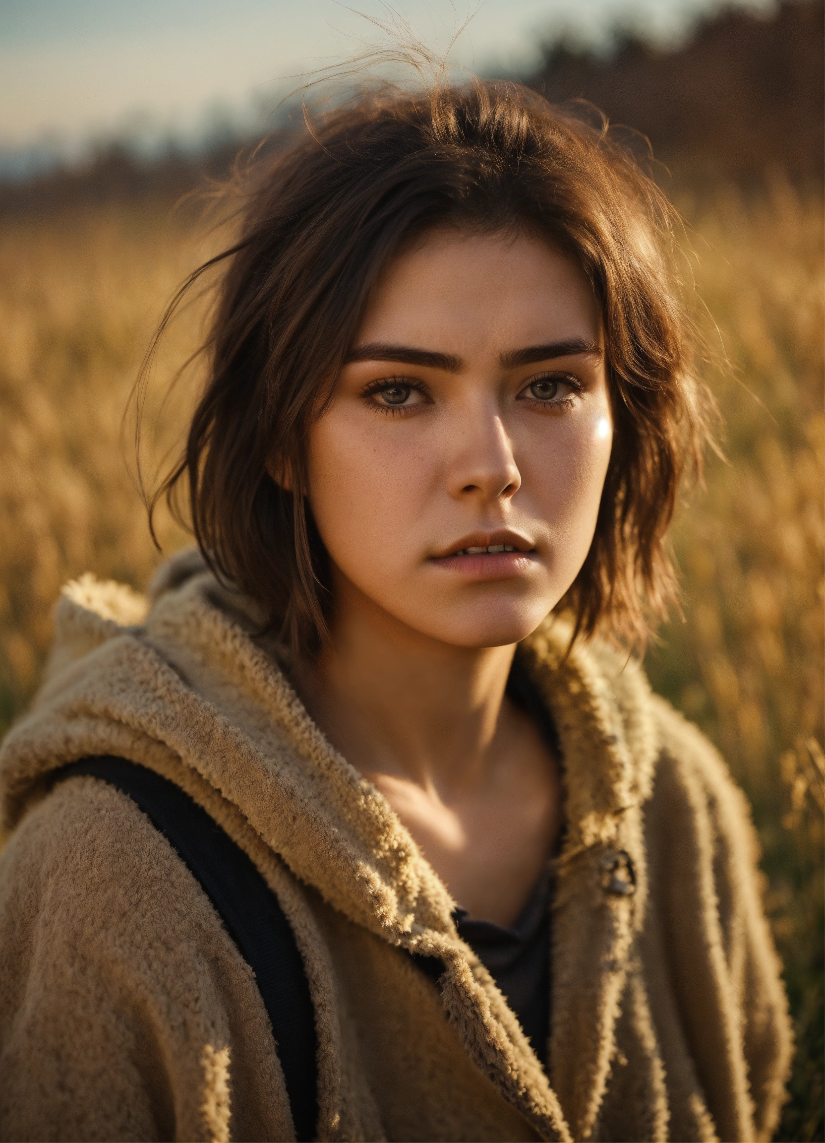 An ultra detailed photo of a sad 22 years old brunette girl, with mid-short loose hair, brown eyes, natural beauty, sad expression, rounded face, warm skin tone, strong body, wearing post-apocalyptic warm clothes, in a sunny meadow, no jewelry, no makeup, dramatic illumination, 4k.