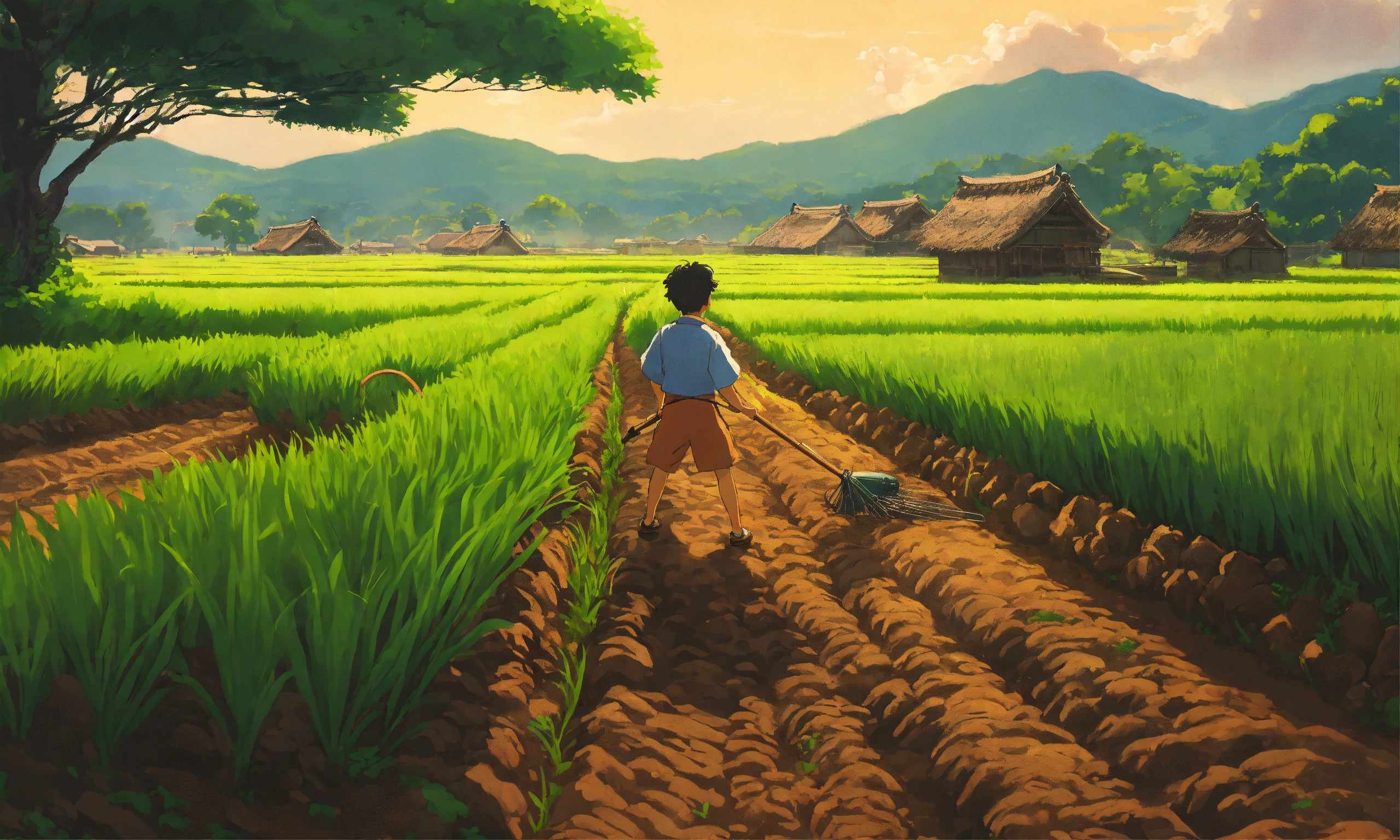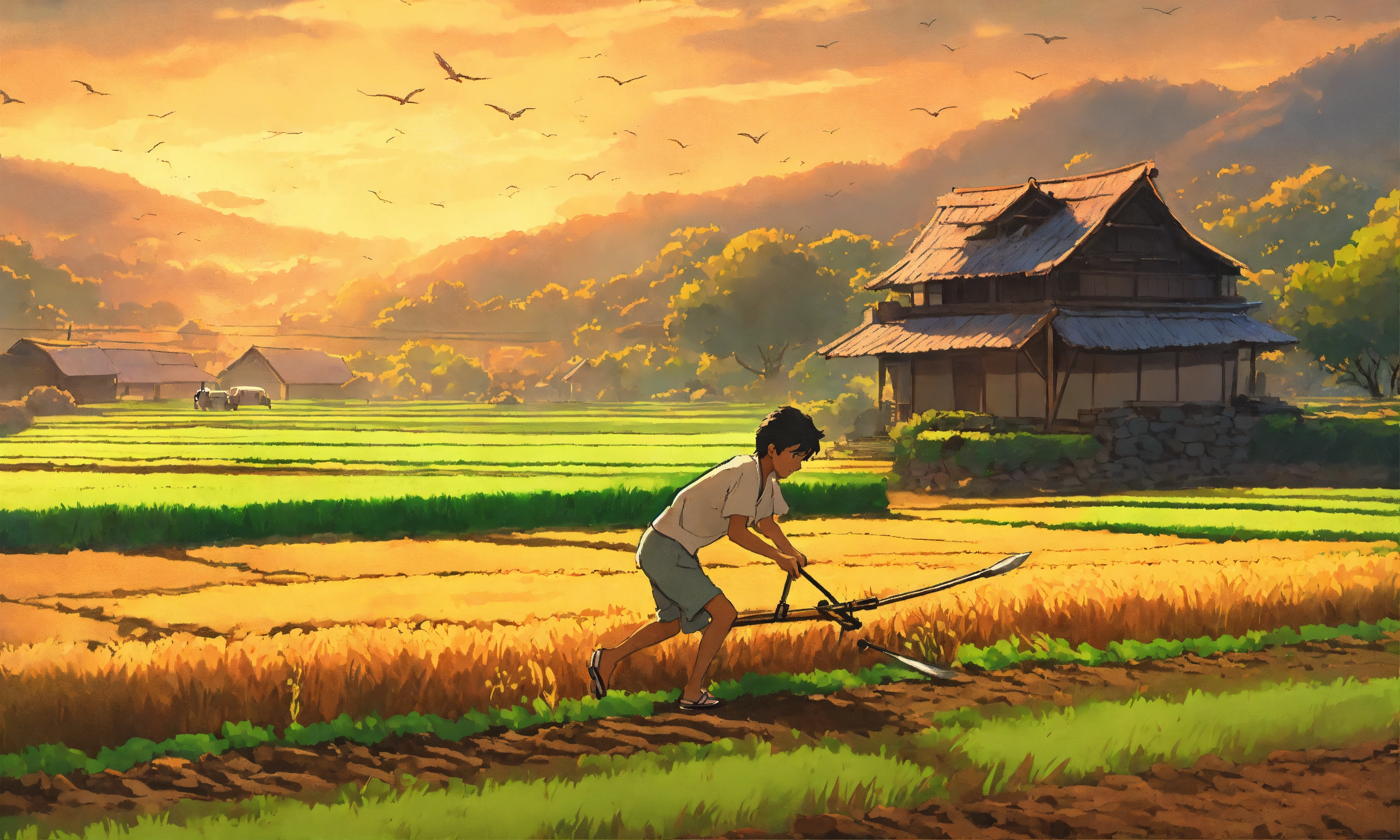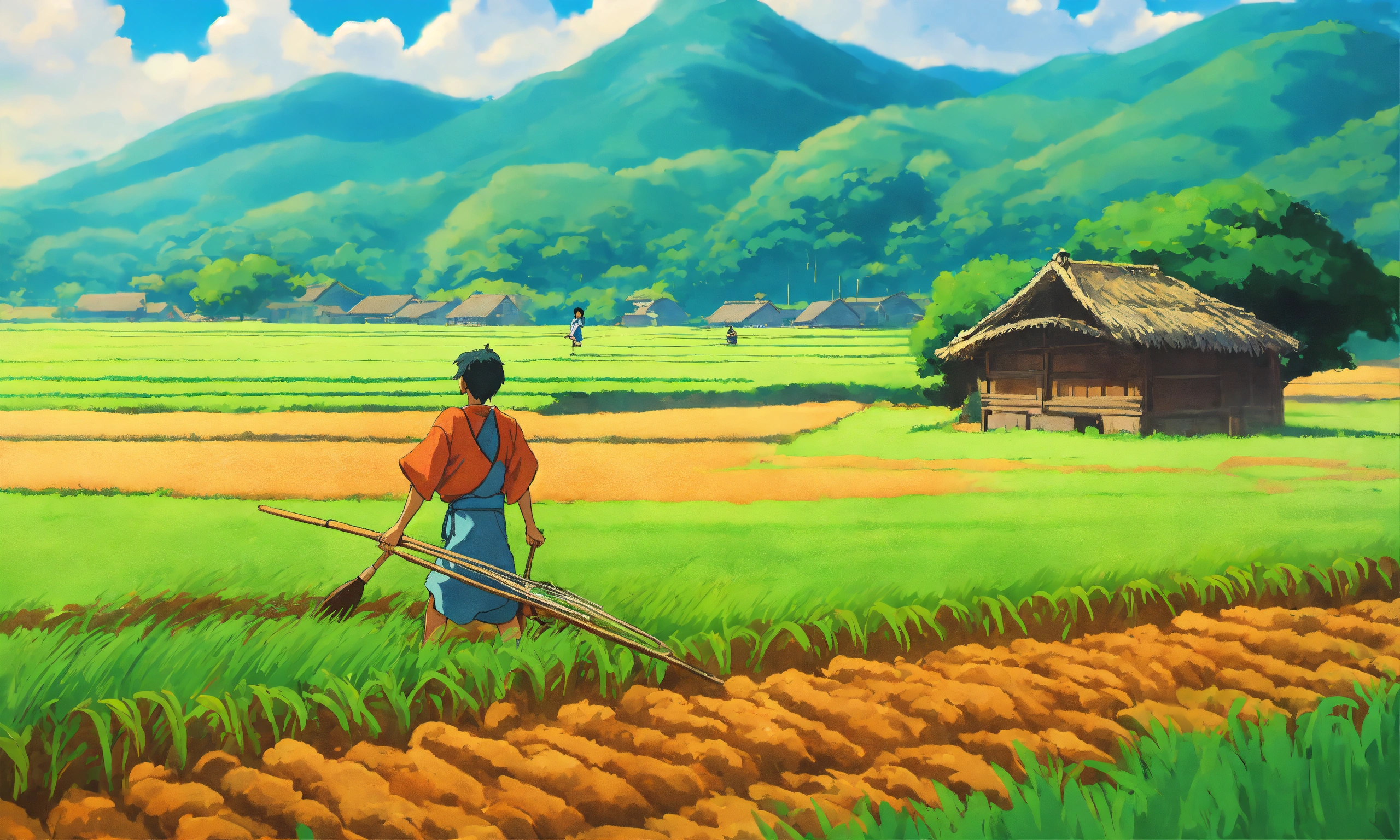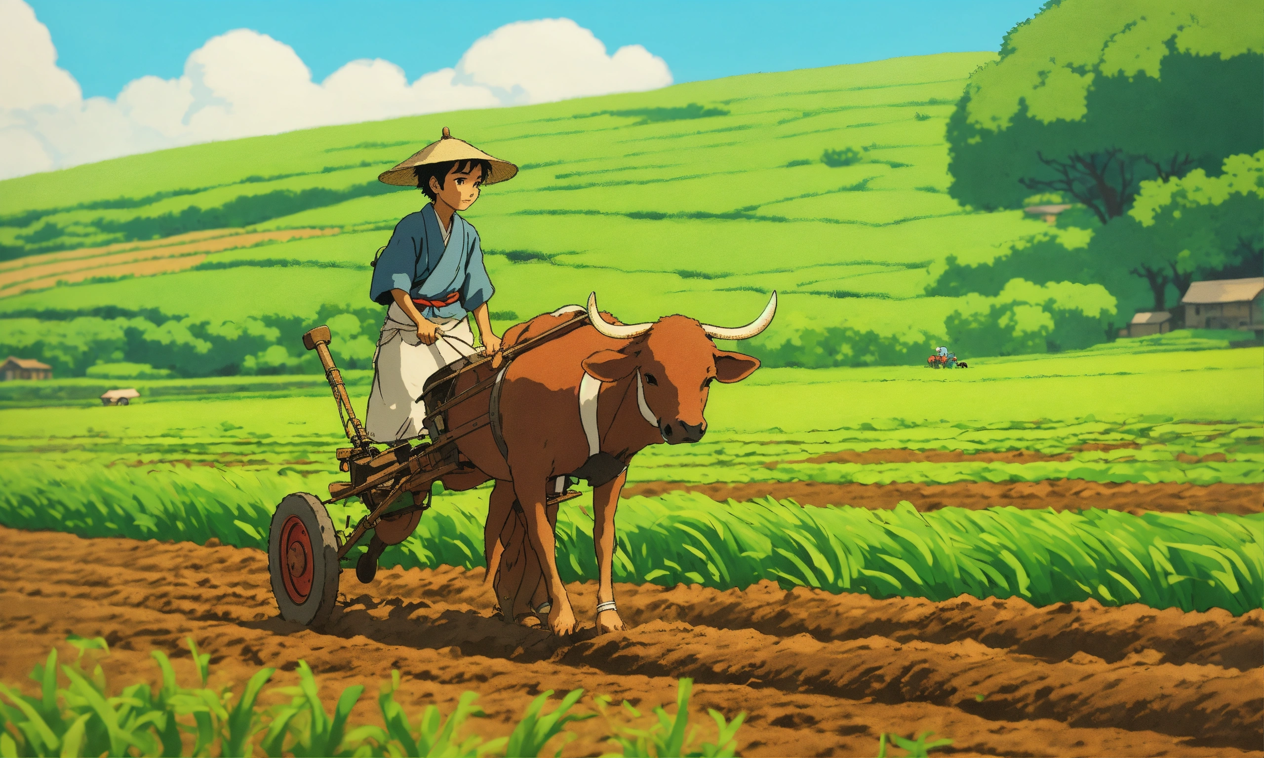 Japanese miyazaki hayao style art an indian boy ploughing field in a village