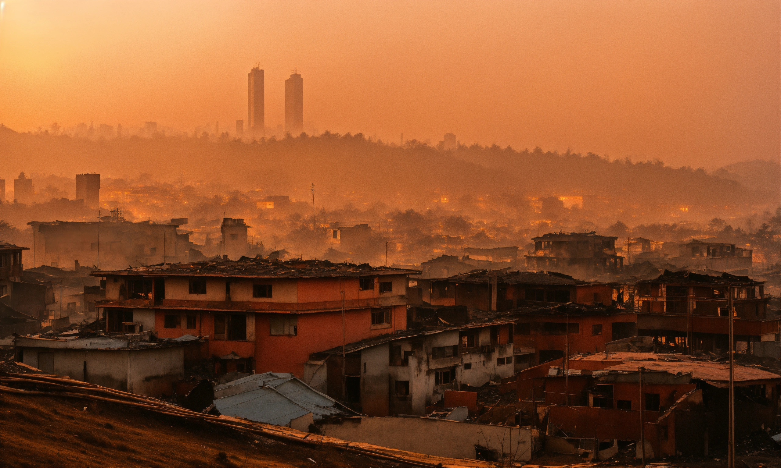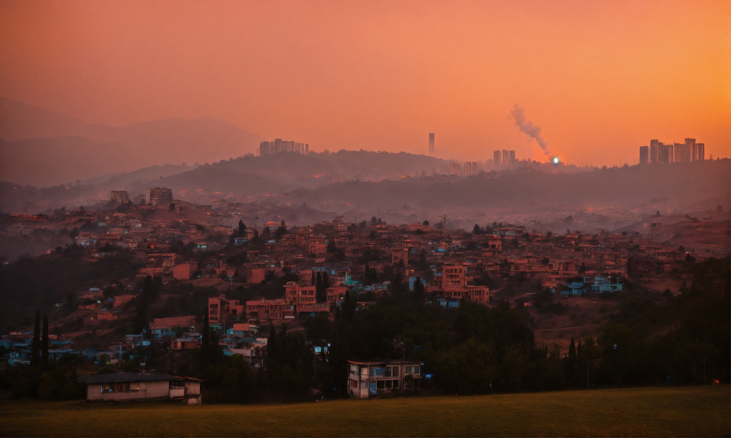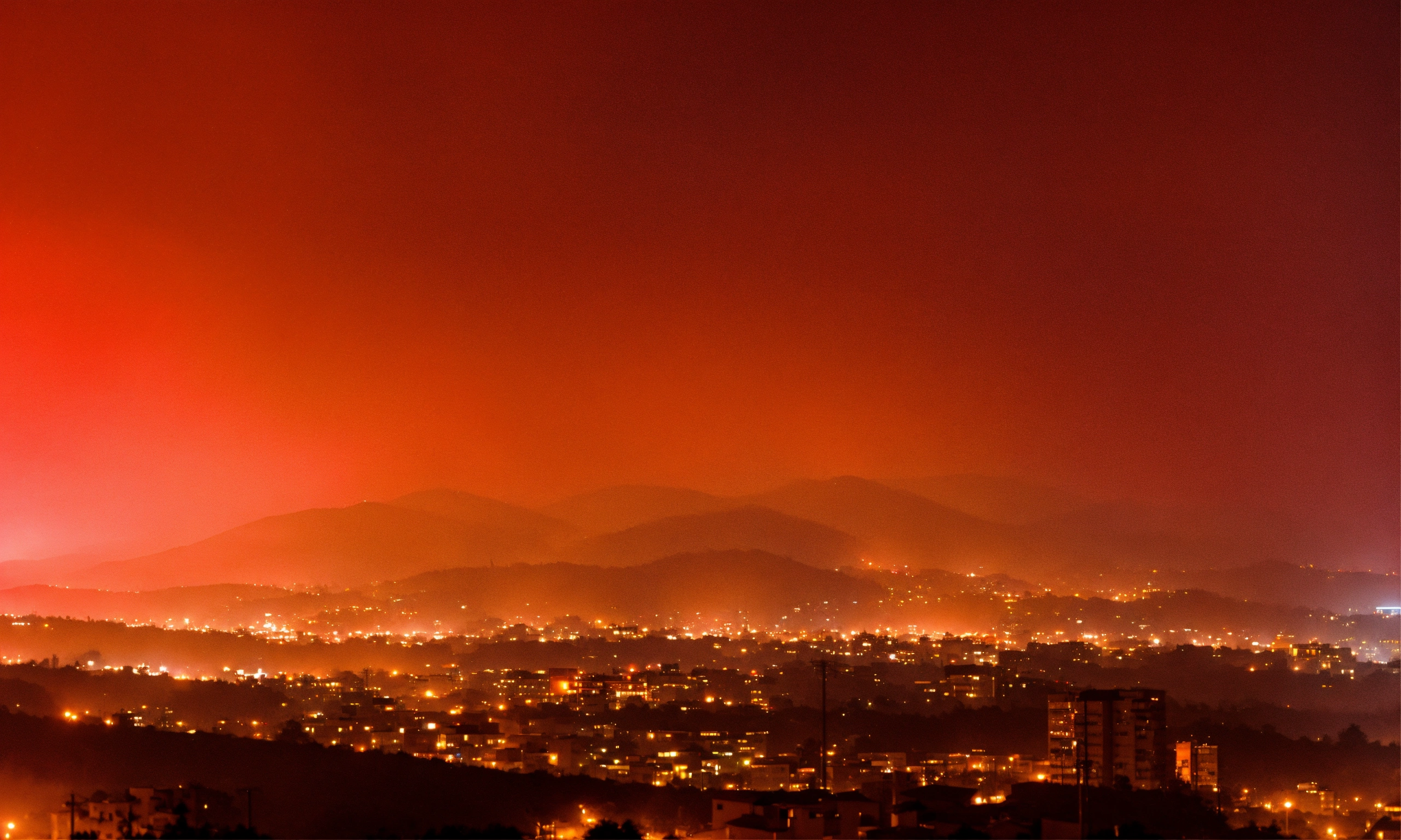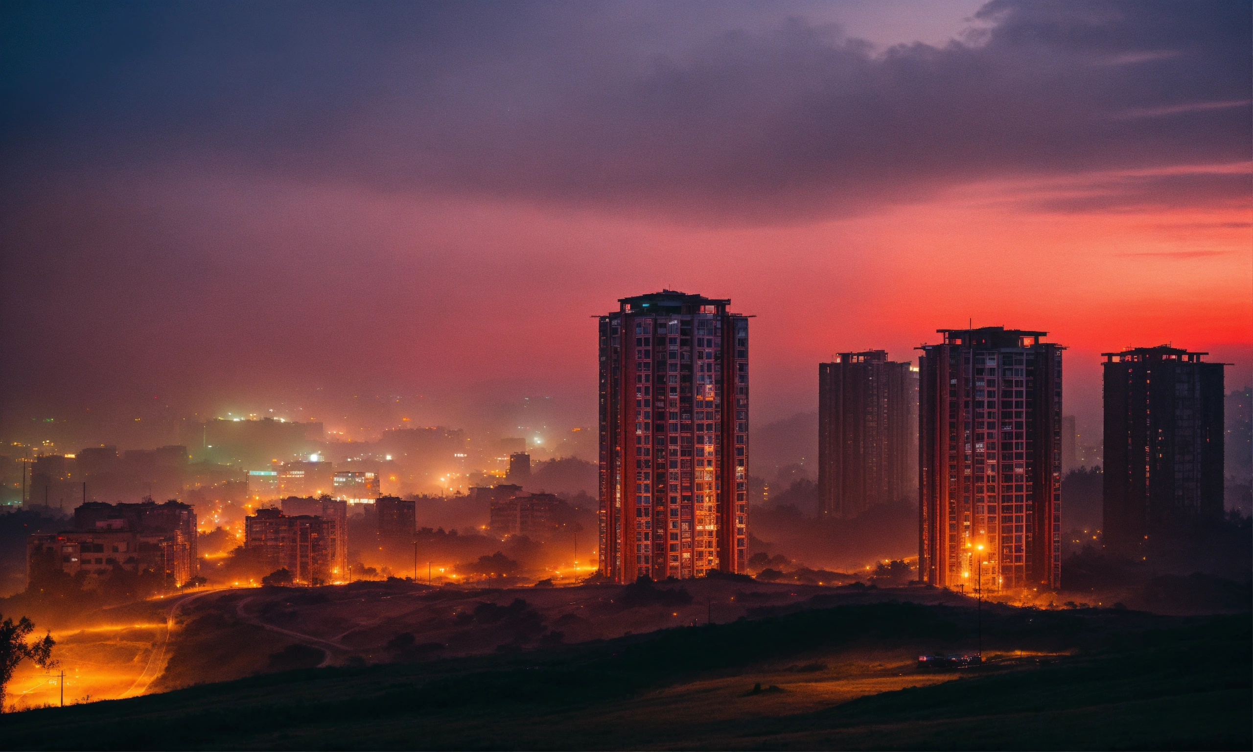 A close up view of the night city buildings in red smog at sunset, the view is from the side of a road in the nearby hills, some of the buildings are damaged or burned