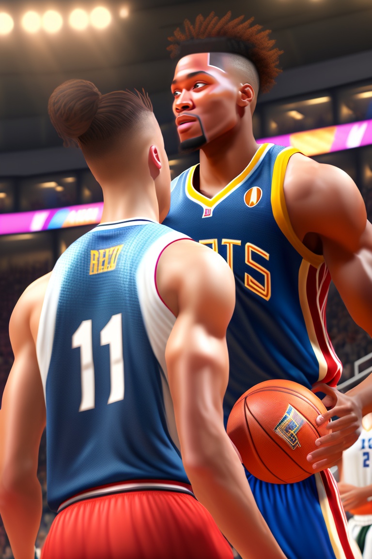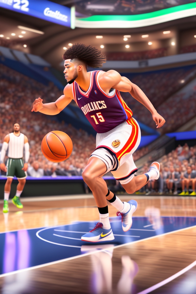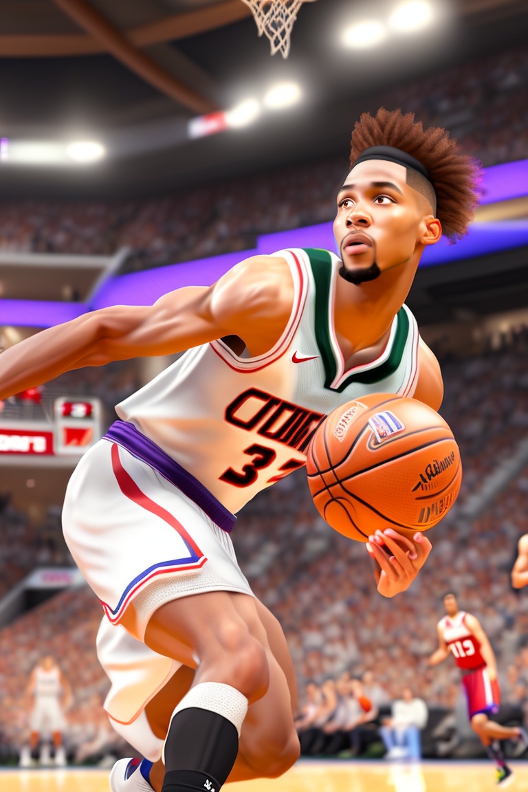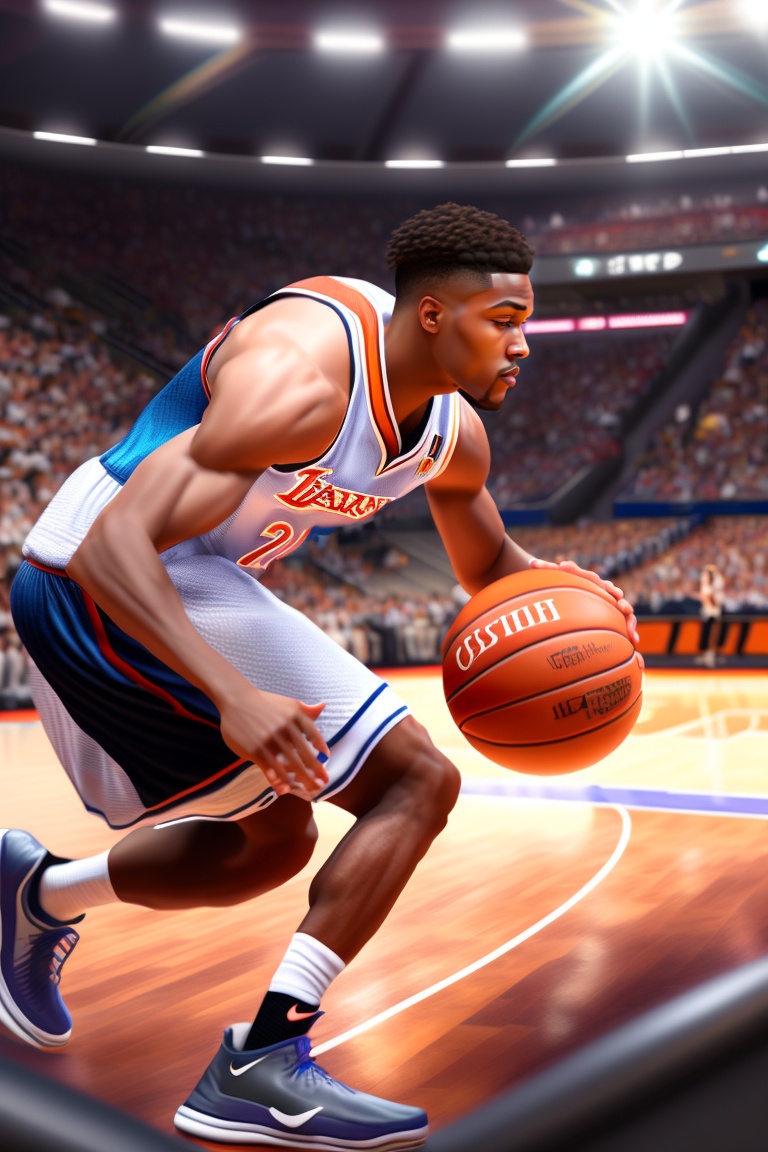 Produce a hyper-realistic image of a basketball game in progress. capture the intensity of the players' expressions, the texture of the basketball, and the dynamic lighting of the indoor court. showcase the action as players dribble, pass, and attempt to score while the crowd's excitement fills the atmosphere. ensure that the details are so lifelike that the viewers feel like they're courtside, experiencing the game in real-time.
