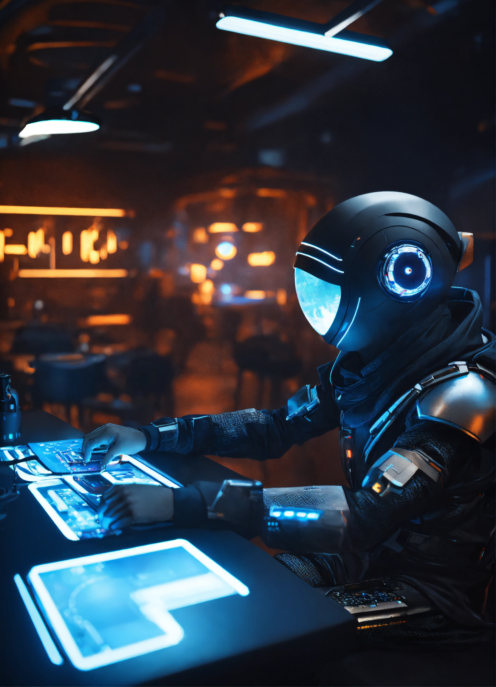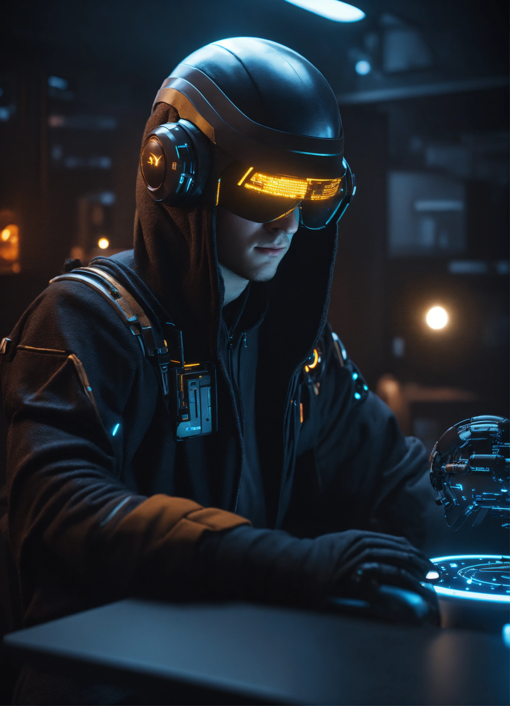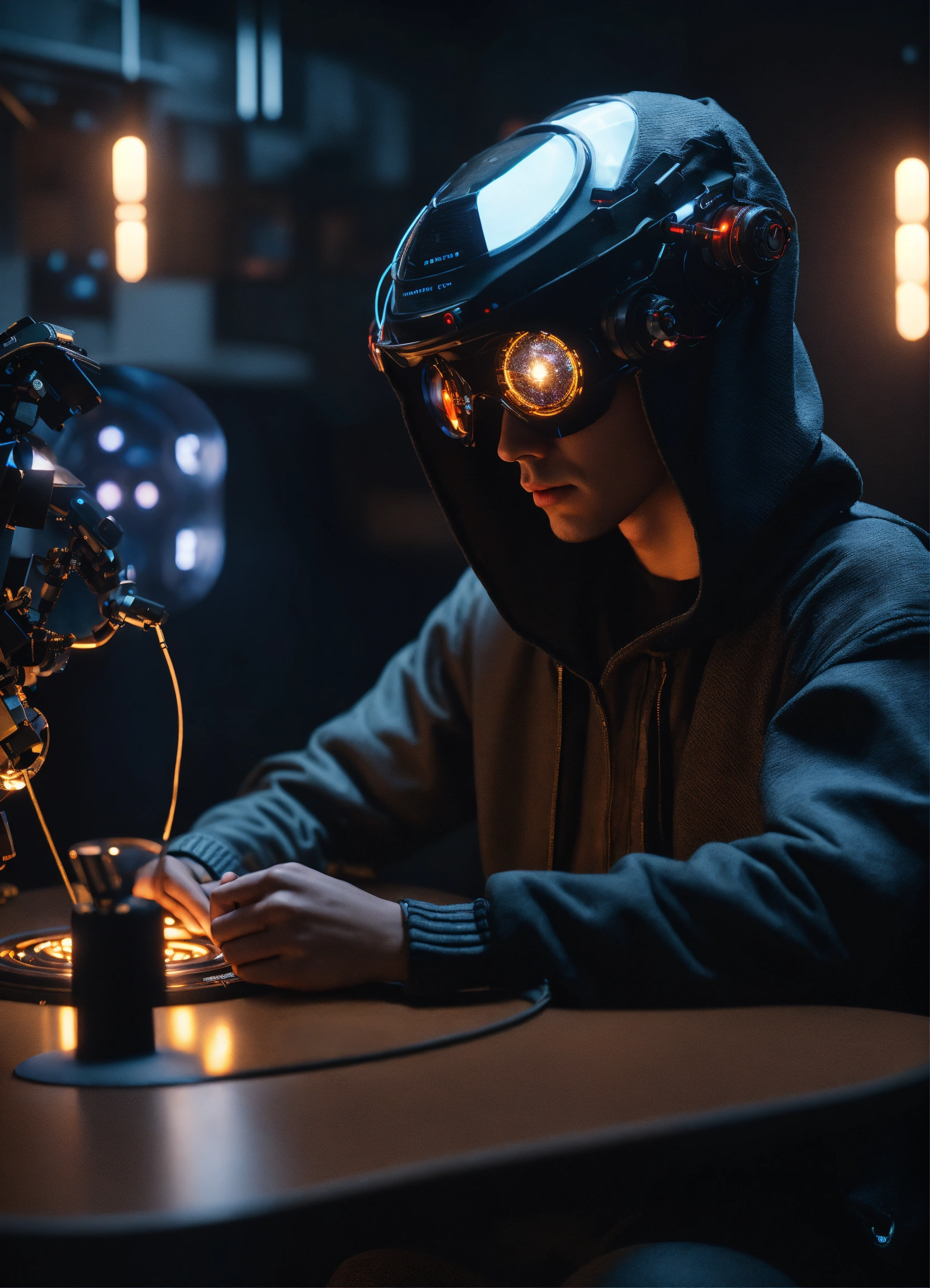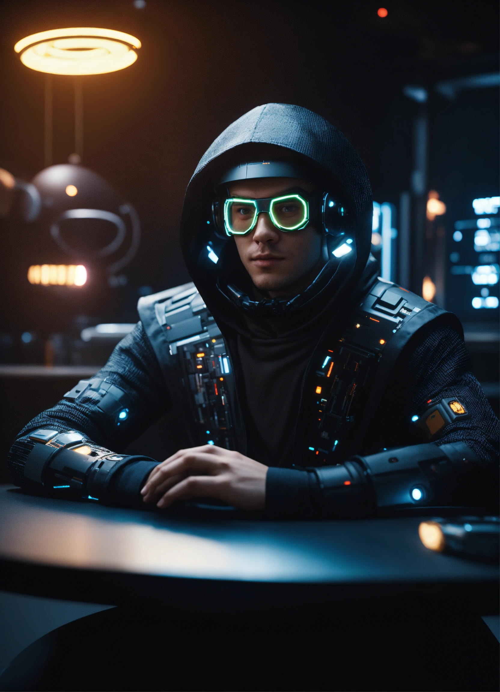 Nerdy 25 year old male cyborg hacker wearing futuristic clothing, hi-tech digital visors, hooded cloak, sitting at a round dining table examining a black robotic orb on a dark space craft. 8k, realistic. unreal engine, pixar