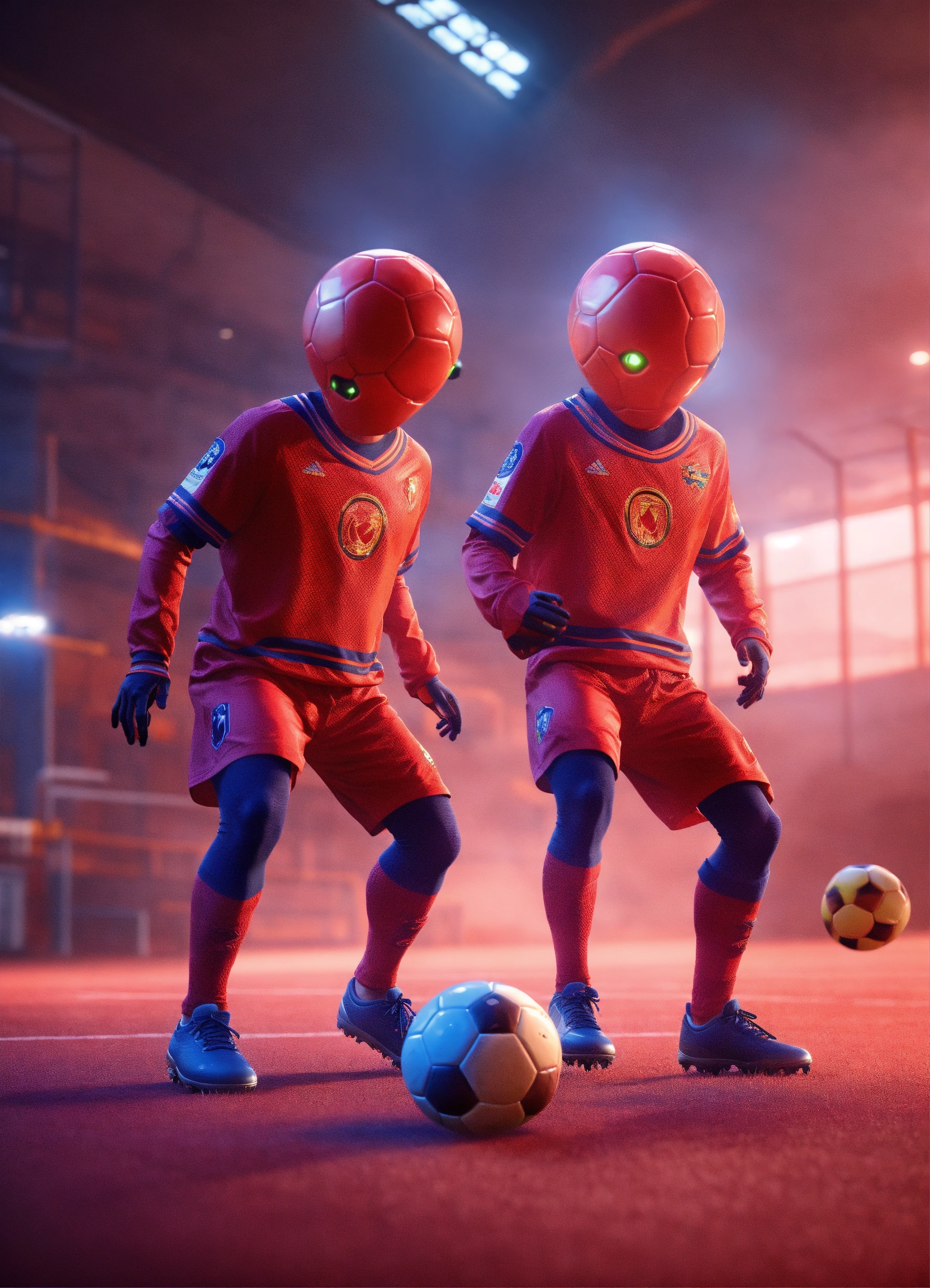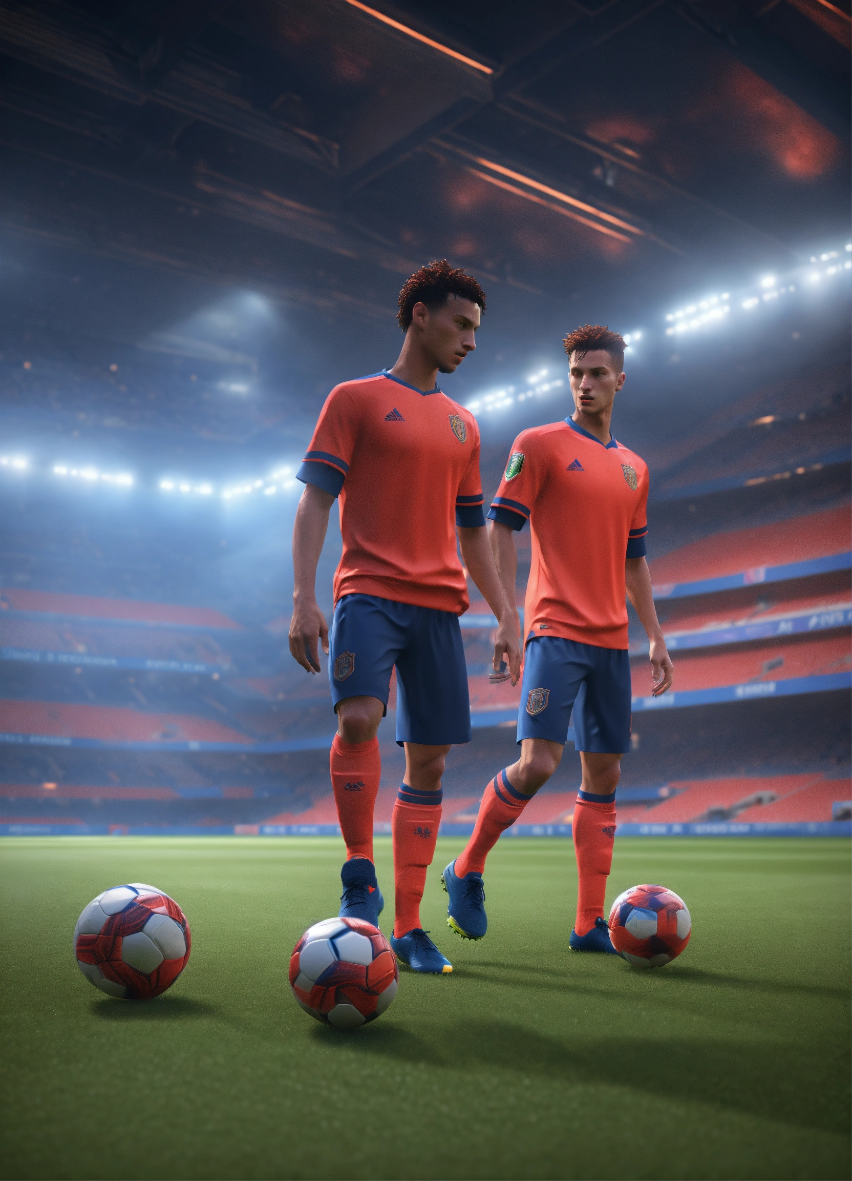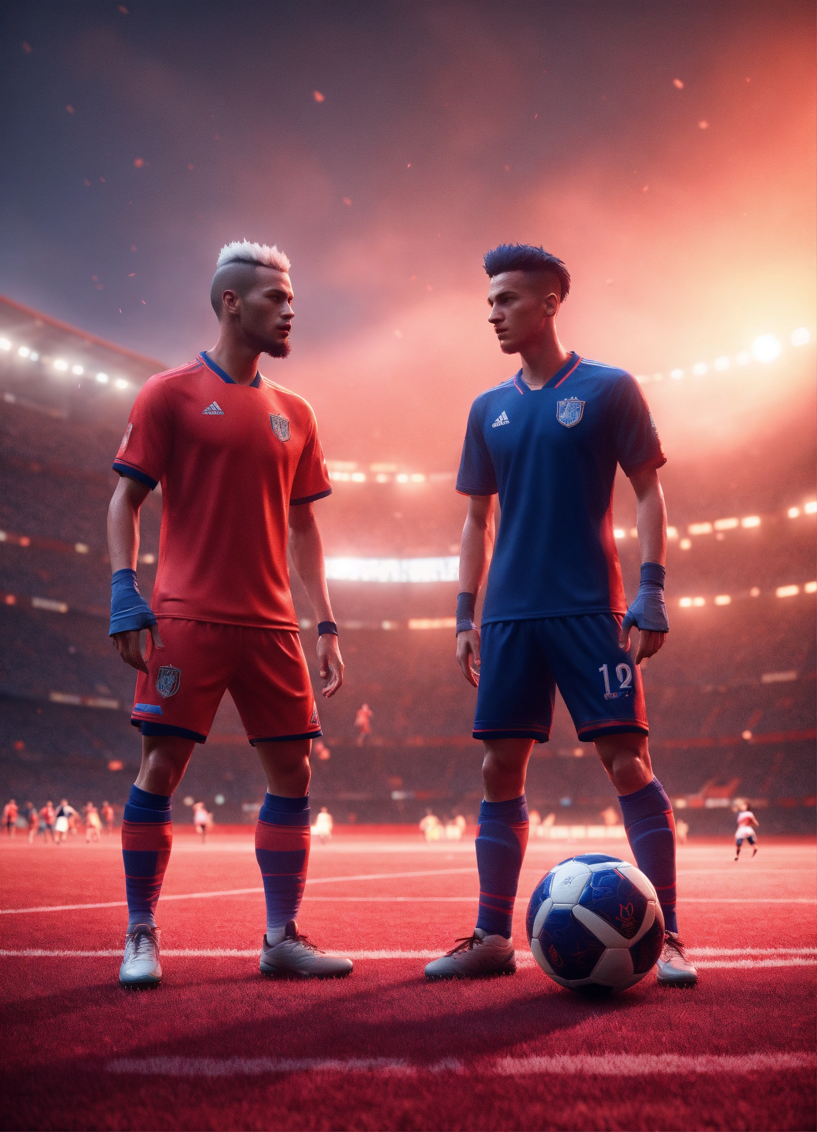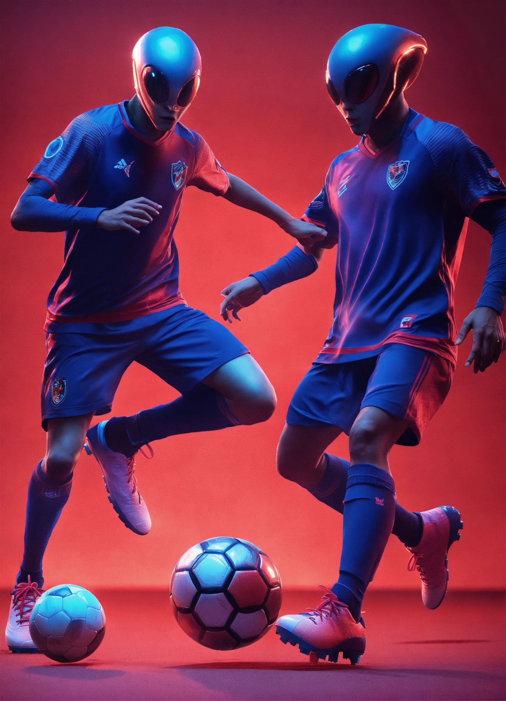 Two alien soccer players are playing a game of soccer, in the style of videogame, light red and light navy, hyperrealist, unreal engine --ar 12885 --s 50 --style raw