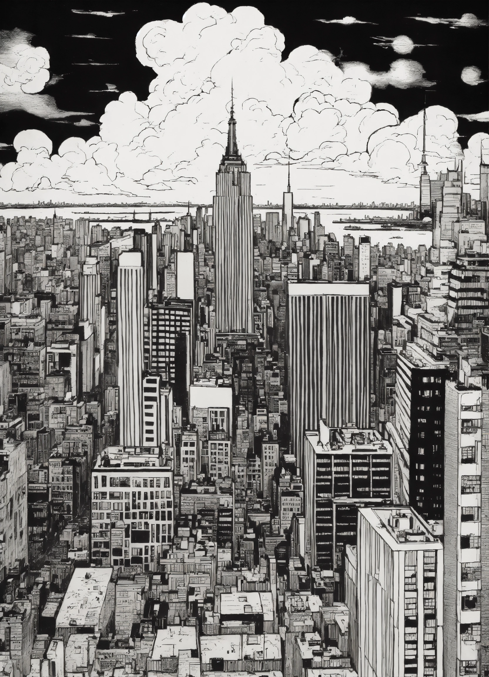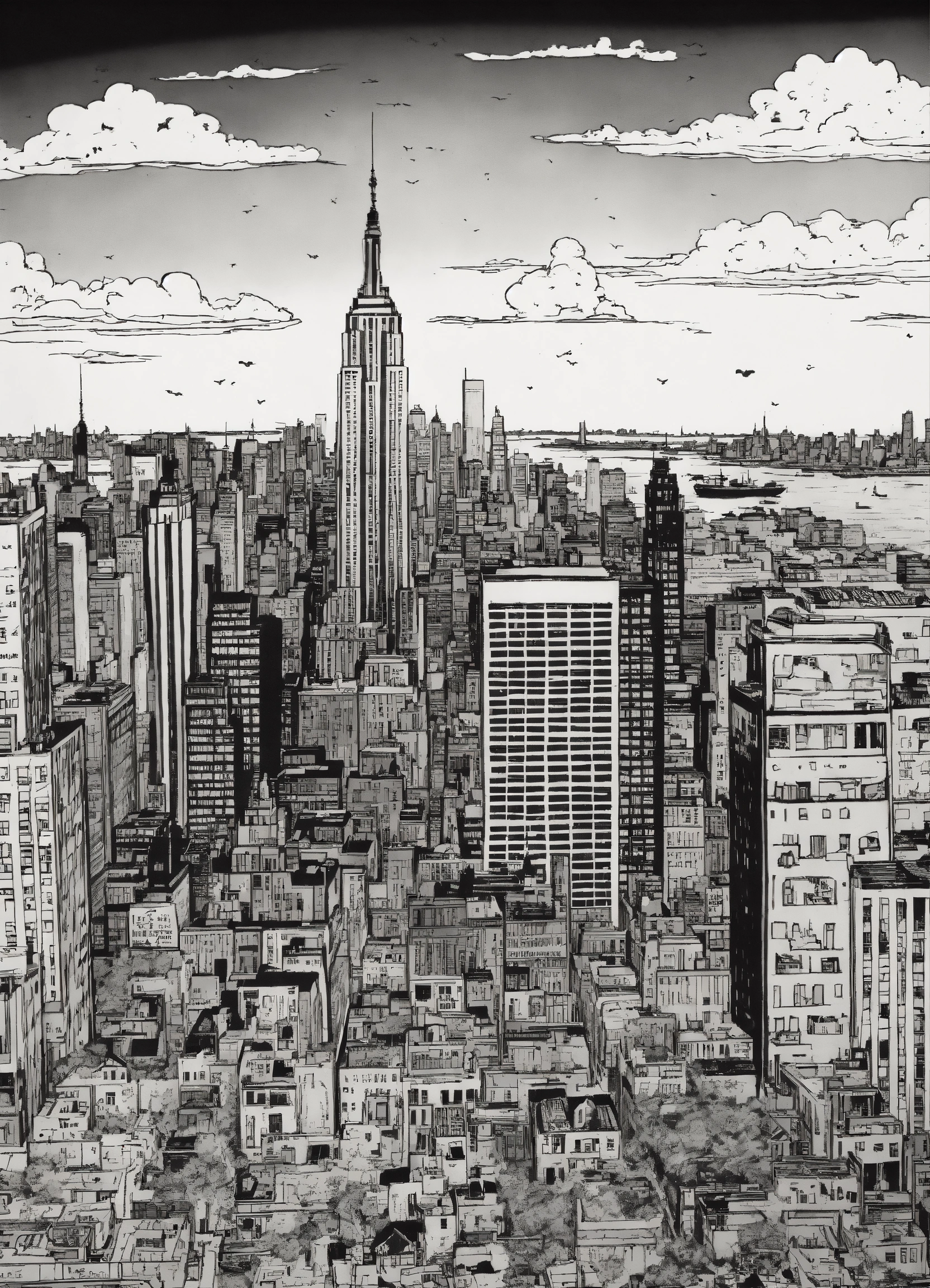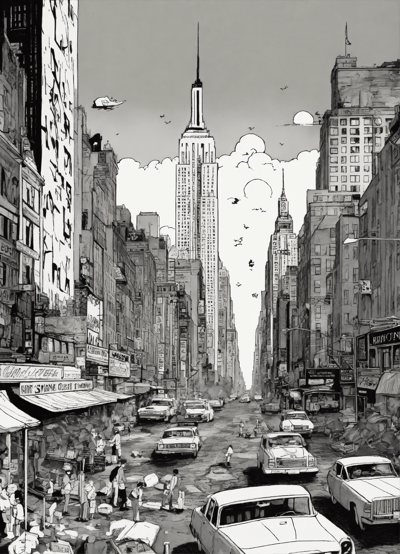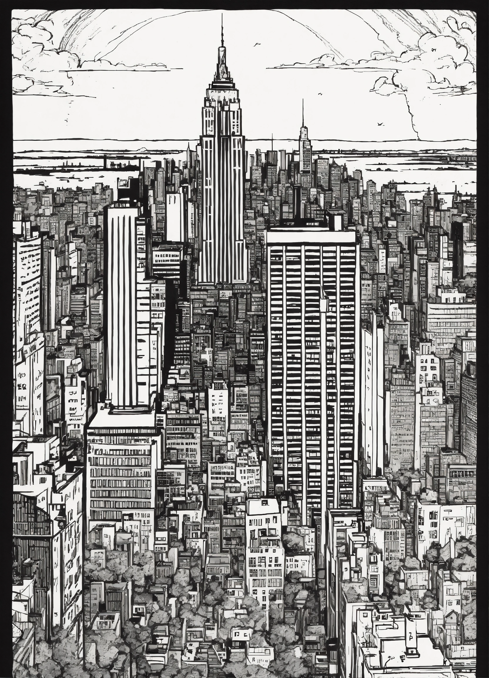 Chaotic stunning new york city, skyline, illustrated by hergé, style of tin tin comics, pen and ink. vintage 90's anime style, black and white.