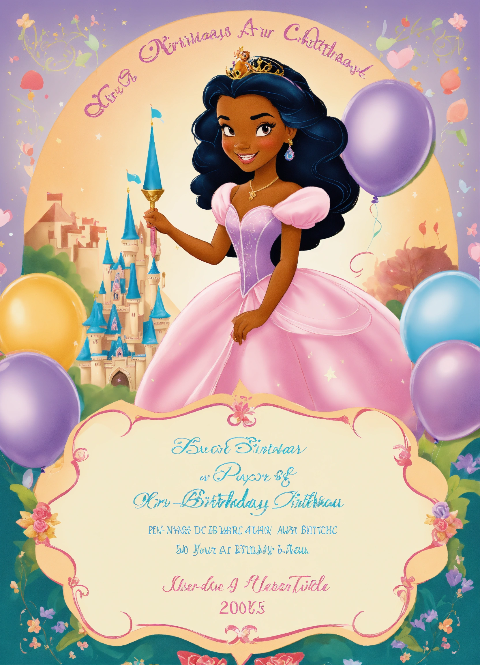"design a birthday party invitation concept for a 5-6-year-old inspired by a beautiful african american disney pixar princesses. the theme, 'enchanted disney princess birthday adventure, ' should revolve around a specific disney princess character, enchanted magical fairytale using a soft pastel color palette and featuring fairy tale elements like castles, magical wands, and animal sidekicks. blank template. the design should be age-appropriate and exude a sense of wonder and magic. incorporate playful fonts and illustrations, including the chosen disney princess, a castle, balloons, and friendly animals. please create a captivating and delightful design that captures the essence of a fairy tale adventure