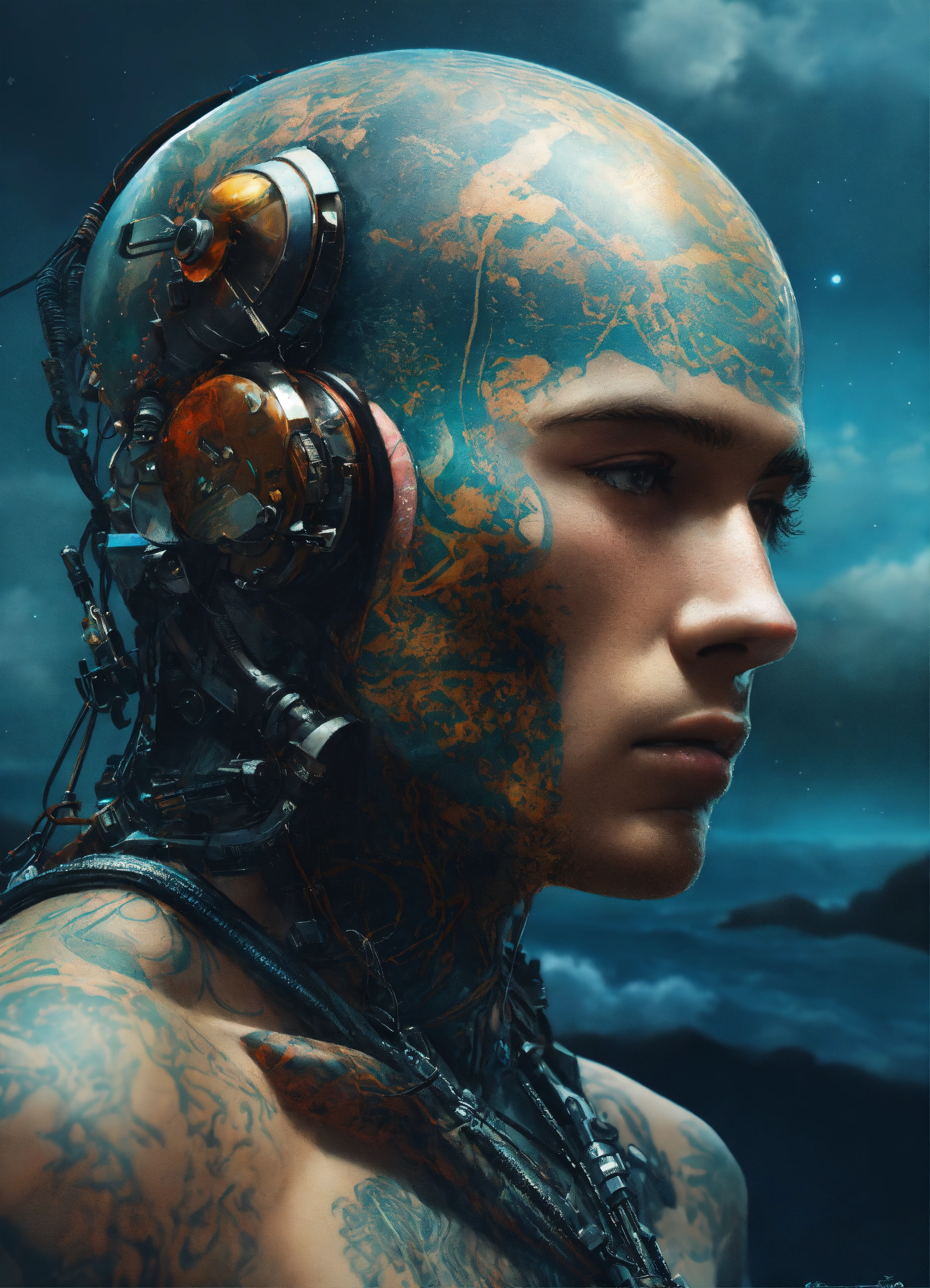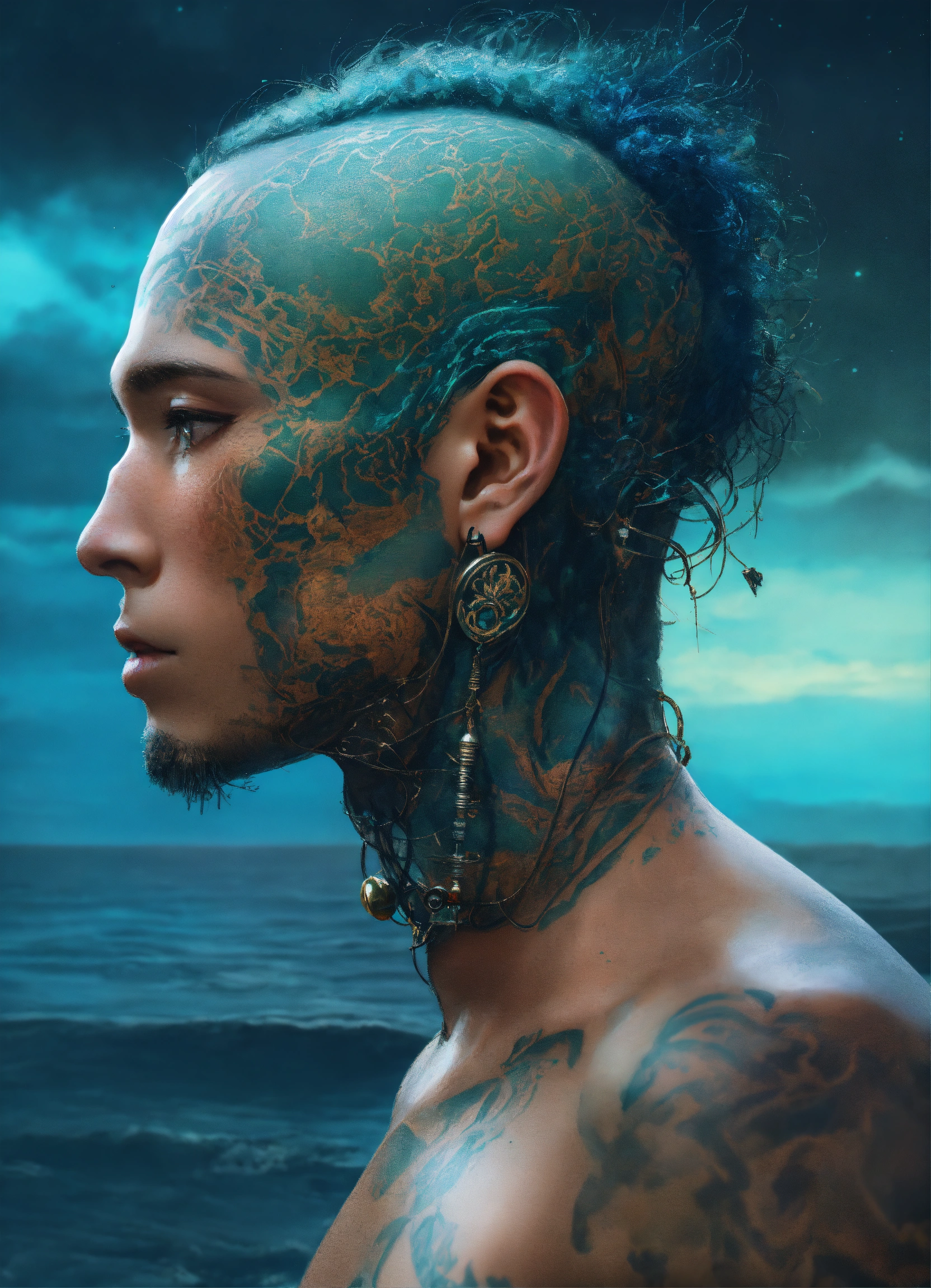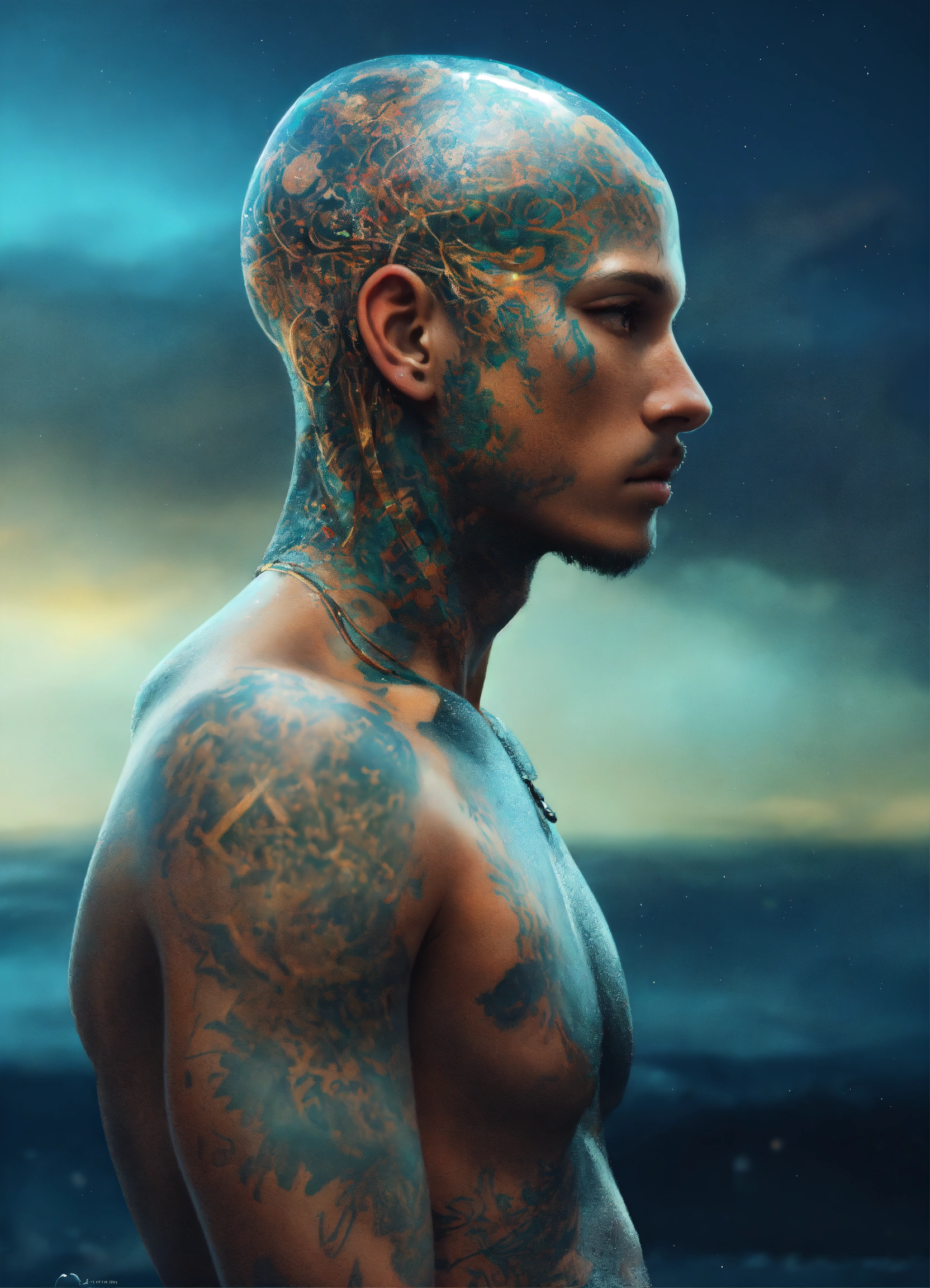 Professional portrait of an extraterrestrial race, tattooed man, large head, shape of the head with 3d bone protrusions under the skin on the head, normal face, full-body side view, sea and clouds in the background, sea is ocean blue, the male has a natural color, abstract beauty, approaching perfection, delicate face, dynamic, moonlight, very detailed, digital painting, artstation, concept art, smooth, sharp focus, illustration, art by carne griffiths and wadim kashin.