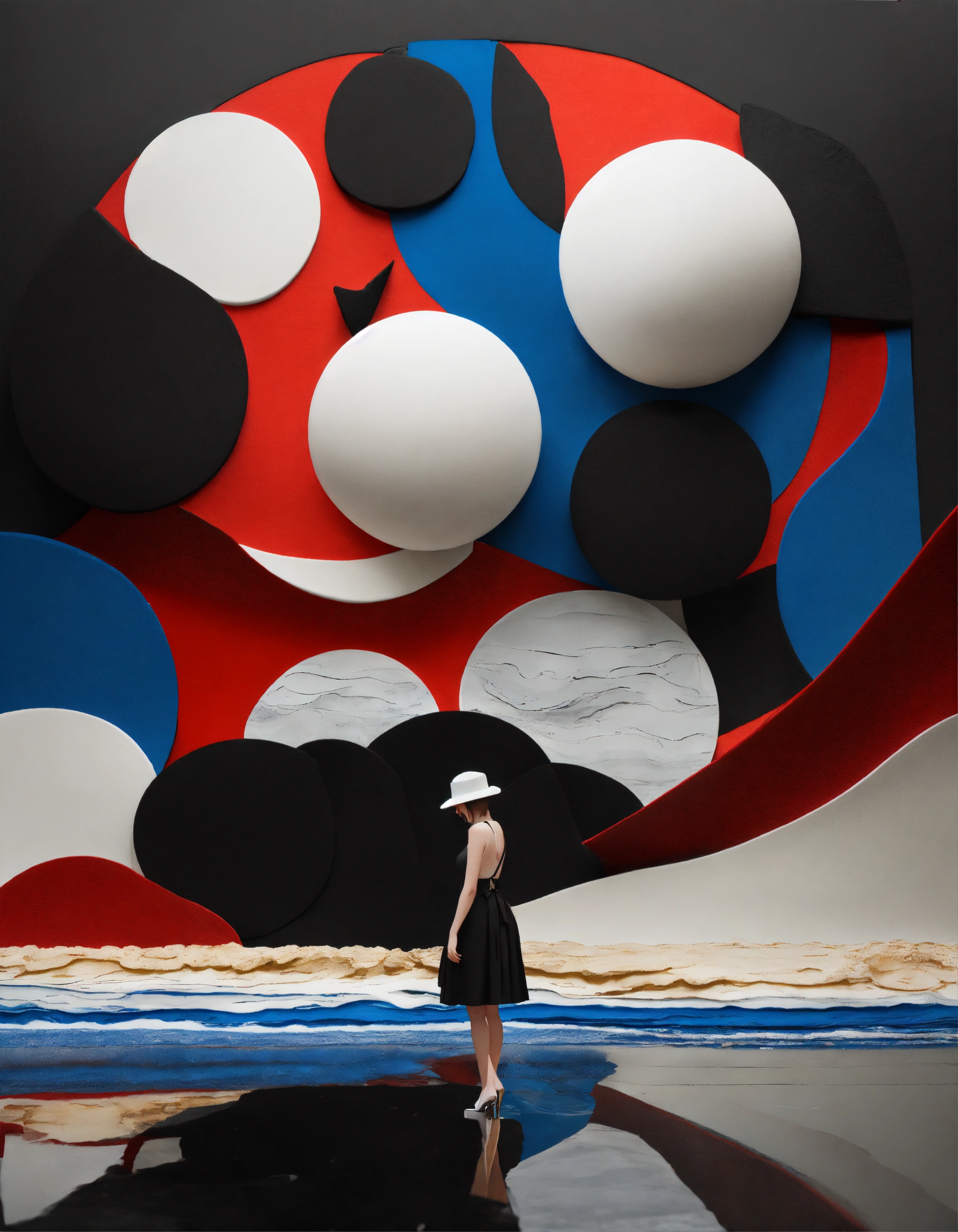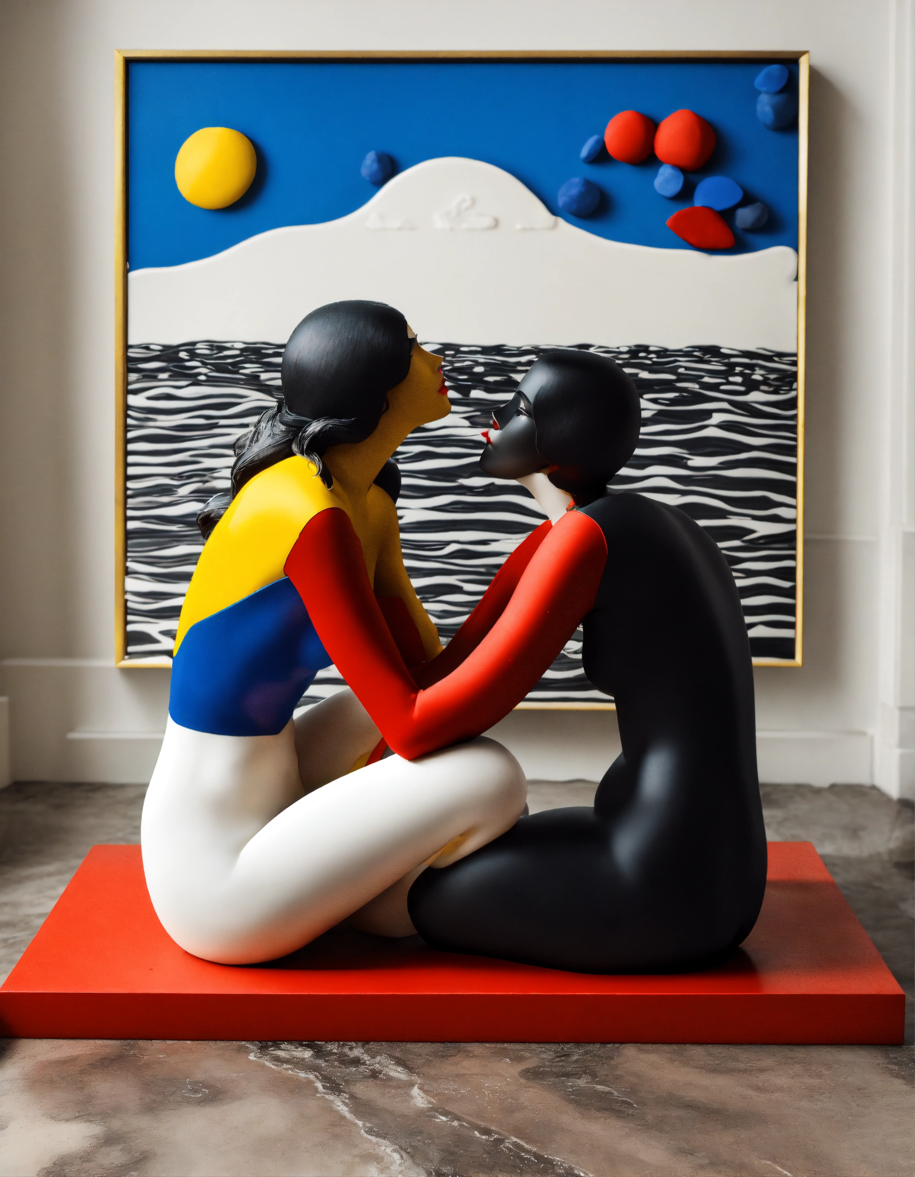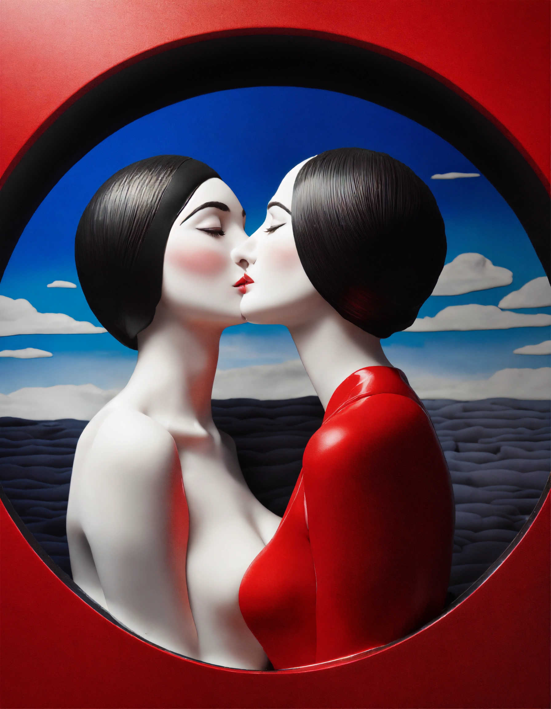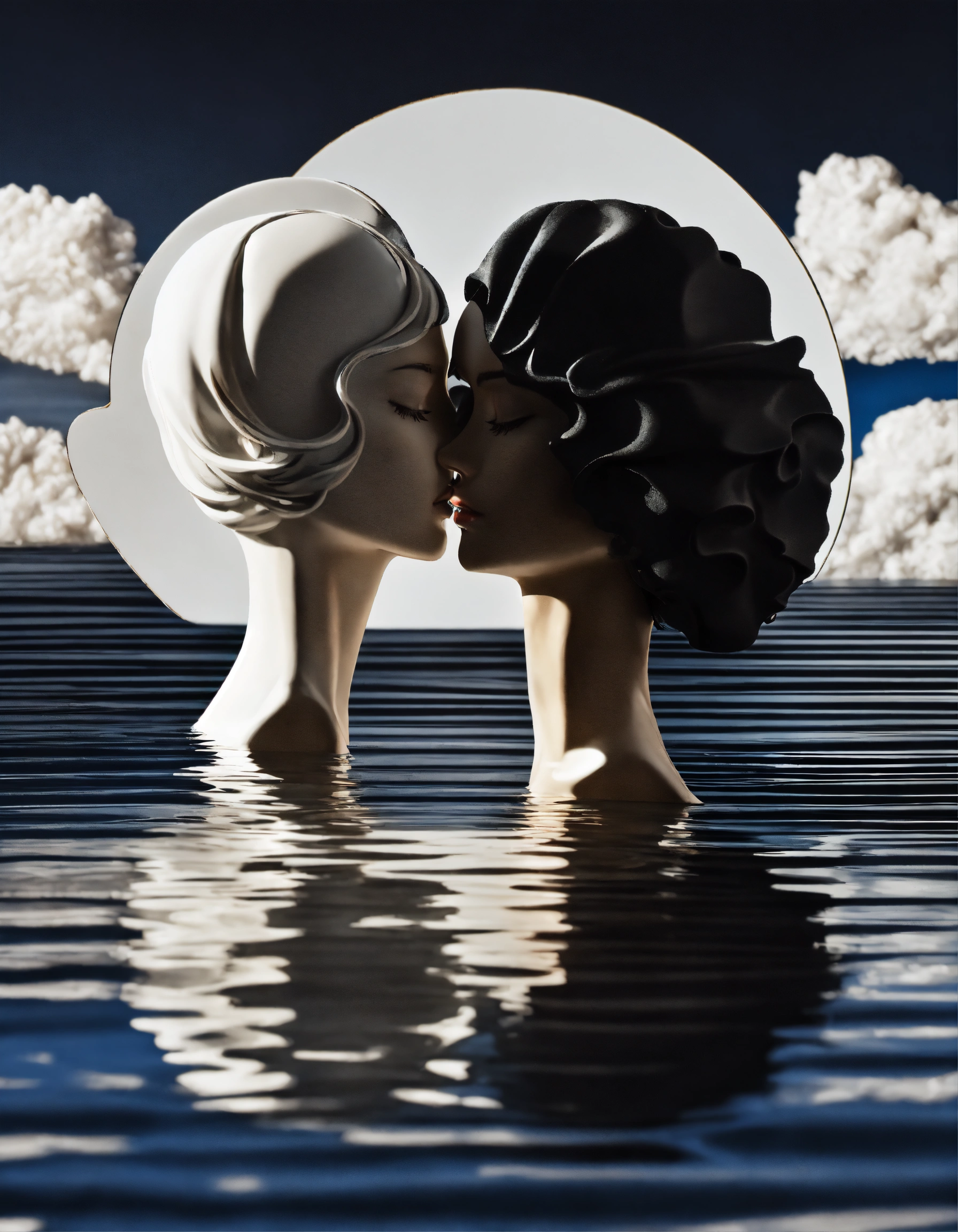 Black and white and primary colors, 3d modeling clay abstract seascape, women kiss photography, immersive inspired art- deco seascape, mirror, rené magritte inspiration.